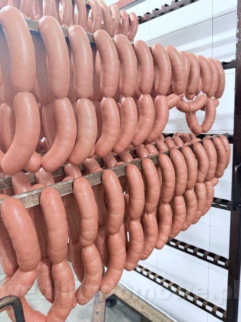 Przedstawione na zdjęciu parówki ukazują efekt uwędzenia w klasycznej wędzarni z bezpośrednim paleniskiem, co pokazuje możliwości tego typu urządzenia.