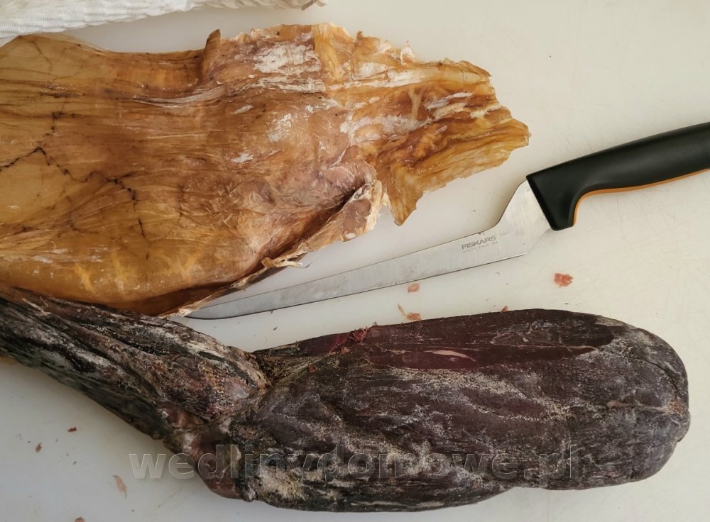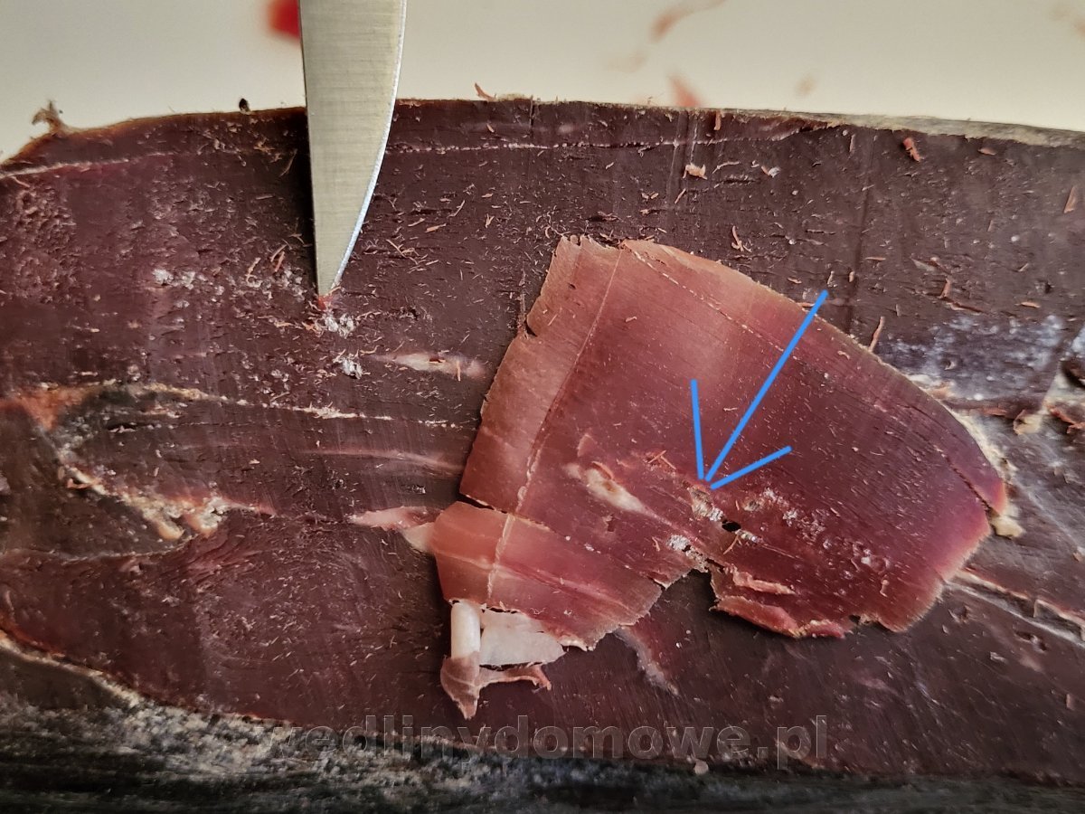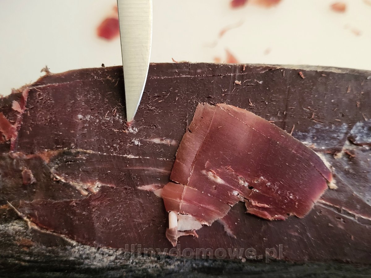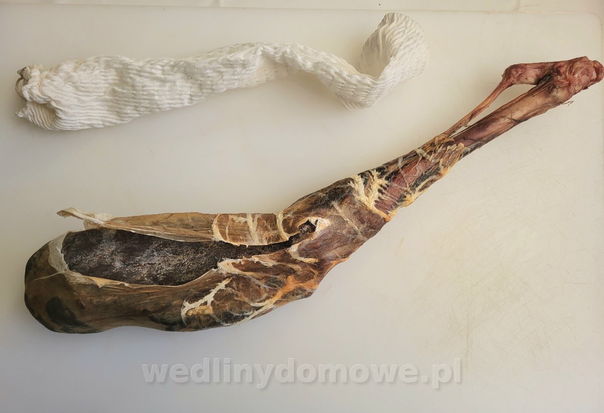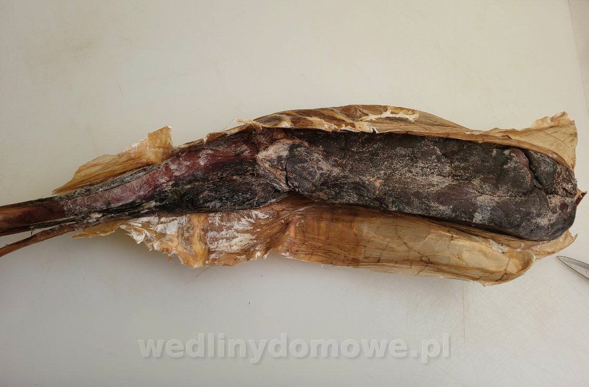 Dojrzewanie udźca z sarny Czas trwania: Grudzień 2023 – Styczeń 2026 Metoda: Autorska technika hybrydowa (Szczepionka bakterii / Komora / Próżnia) 1. Początek i świadomy wybór (Przełom 2023/2024) post nr 1035 Proces rozpocząłem od precyzyjnego zapeklowania i zaszczepienia surowca wieloskładnikową kulturą bakterii. Zrobiłem to z pełną świadomością, że w przeciwieństwie do fermentacji naturalnej – gdzie proces opiera się niemal wyłącznie na pracy dwóch podstawowych rodzajów enzymów tkankowych mięsa oraz oparty na glikogenie zawartym w surowcu– tutaj wprowadziłem celową mikroflorę z dodatkami. Wielokrotnie wspominałem w moich wypowiedziach na forum, jak kluczowe jest to działanie już na samym początku procesu w wędlinach dojrzewających całomięśniowych. Takie wprowadzenie bakterii zupełnie inaczej kształtuje cały proces dojrzewania, oddając nam kontrolę, której nie ma przy metodach tradycyjnych. Dzięki szczepom Staphylococcus, Lactobacillus i Pediococcus postawiłem na wielotorową przebudowę struktury mięsa: stabilizację barwy, fermentację dziczyzny oraz skuteczną ochronę przed niepożądanymi patogenami. 2. Kwiecień 2024 r. post nr 1119 Sarnina jest wyjątkowo chuda, więc już po kilku miesiącach zauważyłem odpowiednią utratę masy. Aby nie dopuścić do powstania twardej otoczki, która „zamknęłaby wodę” w środku, przeniosłem łopatkę do próżni – vacuum. W ten sposób wyrównałem wilgotność w całym kawałku, tworząc bakteriom i enzymom idealne warunki do dalszej pracy głęboko wewnątrz mięśnia. 3. Lipiec 2024 r. Ocena w gronie przyjaciół – post nr 1239 W lipcu 2024, podczas pierwszej degustacji z przyjaciółmi, stwierdziliśmy, że mięso jest bezpieczne, ale smak wciąż jest zbyt „młody”. Wiedziałem, że potencjał tam jest, ale brakuje mu jeszcze szlachetności. Zdecydowałem się na długofalowe dojrzewanie w próżni, które trwało aż 17 miesięcy. To była czysta biochemia pod pewną moją kontrolą. Praktyki tej nabyłem przy produkcji wielu wędlin dojrzewających, które początkowo nie miały pełnego smaku, a dopiero po okresie „właściwego dojrzewania" – właśnie w próżni – uzyskiwały swoją pełnię. W chudej dziczyźnie sytuacja jest inna: tutaj nie ma nośnika smaku w postaci tłuszczu, więc smak musi zostać zbudowany od podstaw i „przeniesiony” przez bakterie i enzymy. Pozwoliłem im systematycznie rozkładać białka, wiedząc, że tylko czas wyciągnie z tej sarniny to, co najlepsze. 4.Grudzień 2025/Styczeń 2026 r. Finałowy szlif. Post nr 1770 W grudniu 2025 po wyjęciu nogi z vaccum włożyłem udziec w jelita wołowe i siatkę qunett, po czym umieściłem ją w komorze na 3 tygodnie. Po zdjęciu osłonek i końcowej degustacji, zastosowałem jeszcze jeden ważny zabieg: zostawiłem nogę w komorze na dodatkowe 2-3 dni bez żadnego okrycia (osłonki). Chciałem kontrolowanie obsuszyć warstwę zewnętrzną, żeby idealnie „zamknąć” produkt przed ostatecznym pakowaniem. 5. Przypieczętowanie jakości w myśl zasady największych mistrzów „Sól konserwuje ale to Tyrozyna smakuje” Po zdjęciu osłonek i po ukrojeniu kilku plasterków, zobaczyłem to, na co czekałem, a czego nie znałem z własnej autopsji: wyraźne, białe grudki, czyli kryształki tyrozyny. Dla mnie to twardy dowód, że proces proteolizy przebiegł perfekcyjnie. To znak, że bakterie, enzymy i czas wykonały swoje zadanie, rozkładając białka na aminokwasy proste. Moja satysfakcja Ten sukces to dla mnie dowód, że łącząc pasję i wiedzę ze zdobyczami techniki XXI wieku, można osiągnąć rzeczy, które w naszych naturalnych warunkach środowiskowych w Polsce byłyby niezwykle trudne, a wręcz niemożliwe. Nasz klimat jest strasznie zróżnicowany i niestabilny – przy fermentacji naturalnej, opartej tylko na dwóch enzymach i glikogenie, ryzyko zepsucia mięsa lub ataku niepożądanych patogenów jest zbyt duże. Dzięki świadomemu użyciu szczepionki i kontroli procesu w próżni, stworzyłem coś niespotykanego w masarstwie. Te chrupiące „diamenty smaku” w sarninie to dla mnie pieczęć mojej wiedzy i kunsztu, którą docenią tylko nieliczni najwięksi koneserzy smaków wędlin dojrzewających na świecie. Przebieg procesu można zobaczyć w poszczególnych postach zgodnie w powyższym opisem. - Dzisiaj