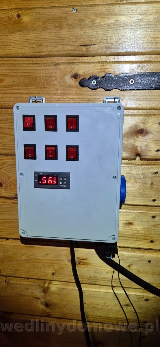 Mała modernizacja. Nie polecam montować sterowania na stałe w daszku. Nie popełniajcie tego błędu. Oprócz tego wymieniłem grzałkę z 2kw na 2,7kw. Przy teście bez wsadu 90 stopni w 10min. Regulator daje radę, przy histerezie 0,5 stopnia i nastawię na 85 stopni, skacze od 82 do 88. Jest ok. -