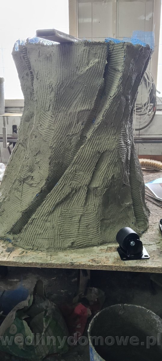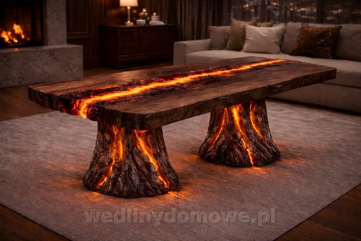 A na stole nowy projekt. Stół do salonu. 340 cm dł i 100 szeroki. Nogi podświetlone jako konary drzewa. Mentalnie przygotowuje się do projektu drugi miesiąc. Stół może ważyć z 400 + kg. Wizualizacja.
