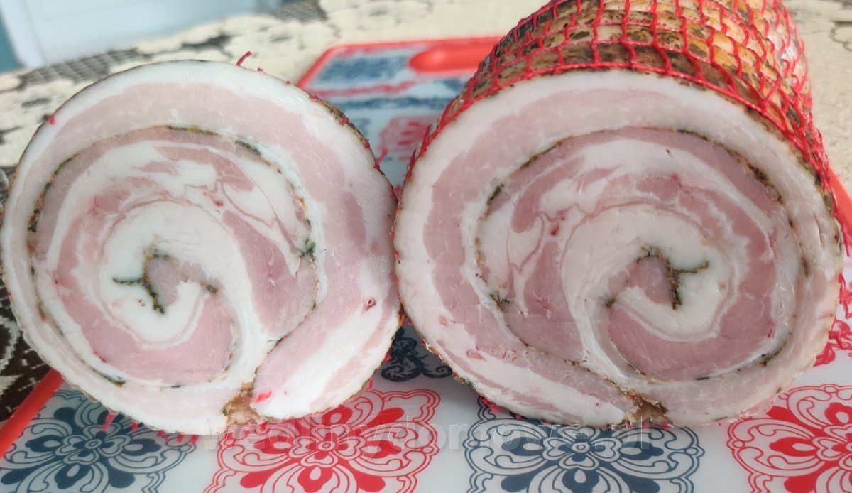 Miałem nadwyżkę boczku 1.5kg, zapeklowałem próżniowo. W lodówce przebywał 10 dni. Po wyjęciu z lodówki obsypałem przyprawami, zrolowałem, zawinąłem w folię celulozową, nałożyłem siatkę i od razu poszedł do parzenia bez wędzenia. Woda 80°C. Boczek do temperatury 75°C w środku. Do tej pory próżniowo peklowałem tylko polędwiczki. Ale po przeczytaniu działu o peklowanie w woreczkach próżniowych postanowiłem spróbować czegoś więcej niż peklowanie na mokro. Efekt końcowy, konsystencja i smak więcej niż Ok.😀