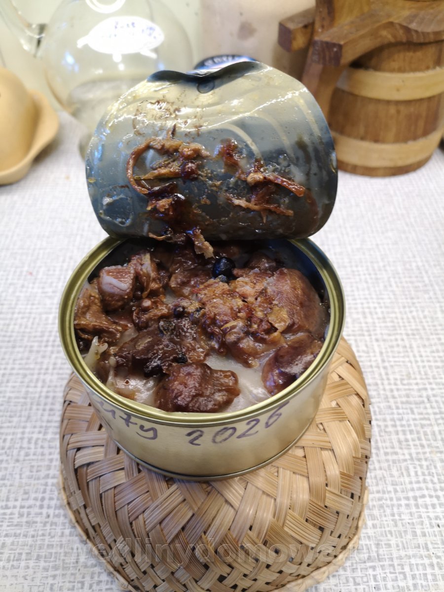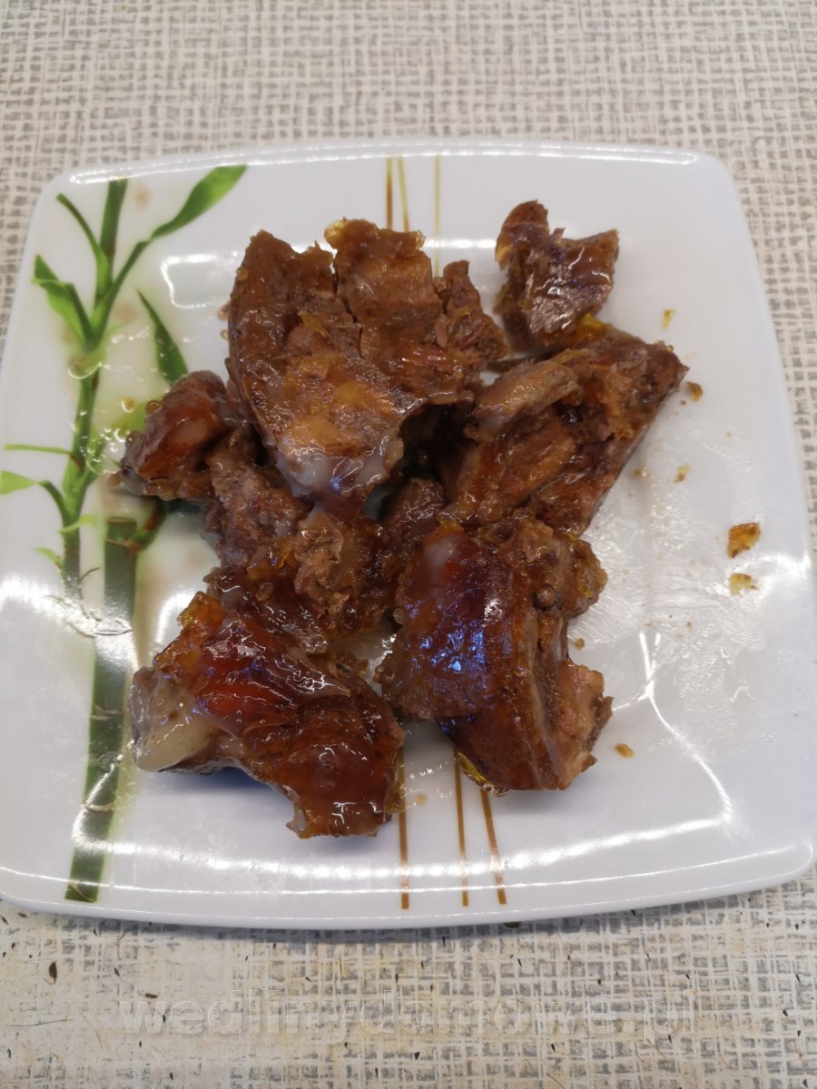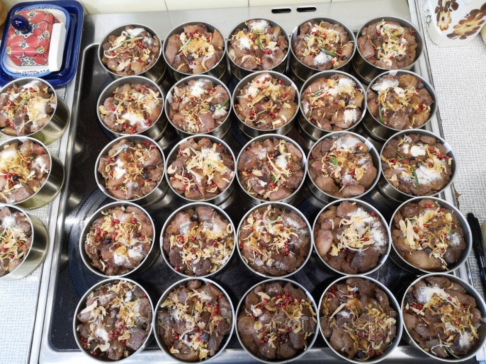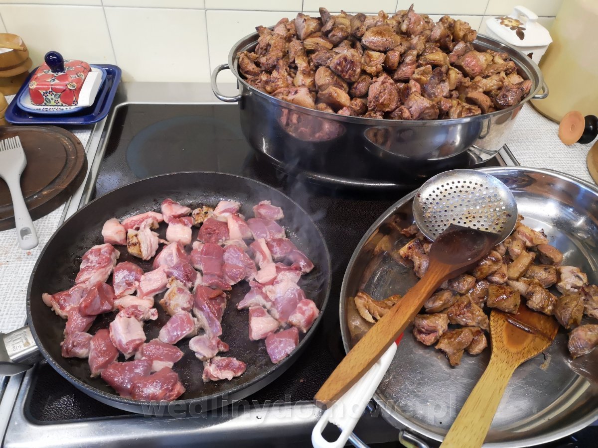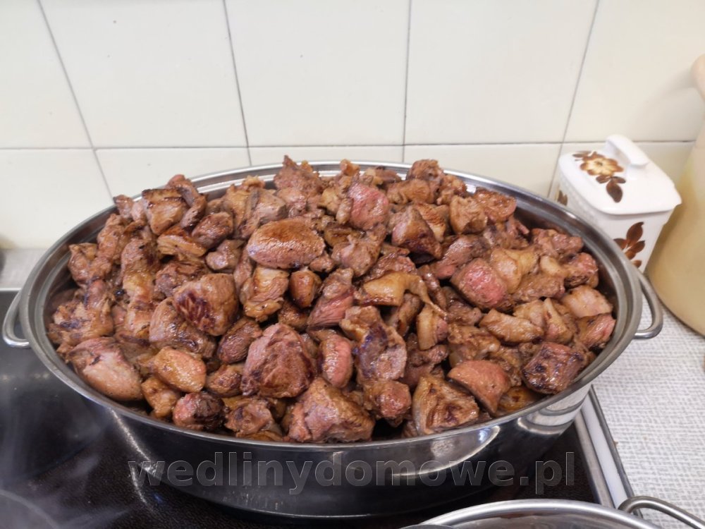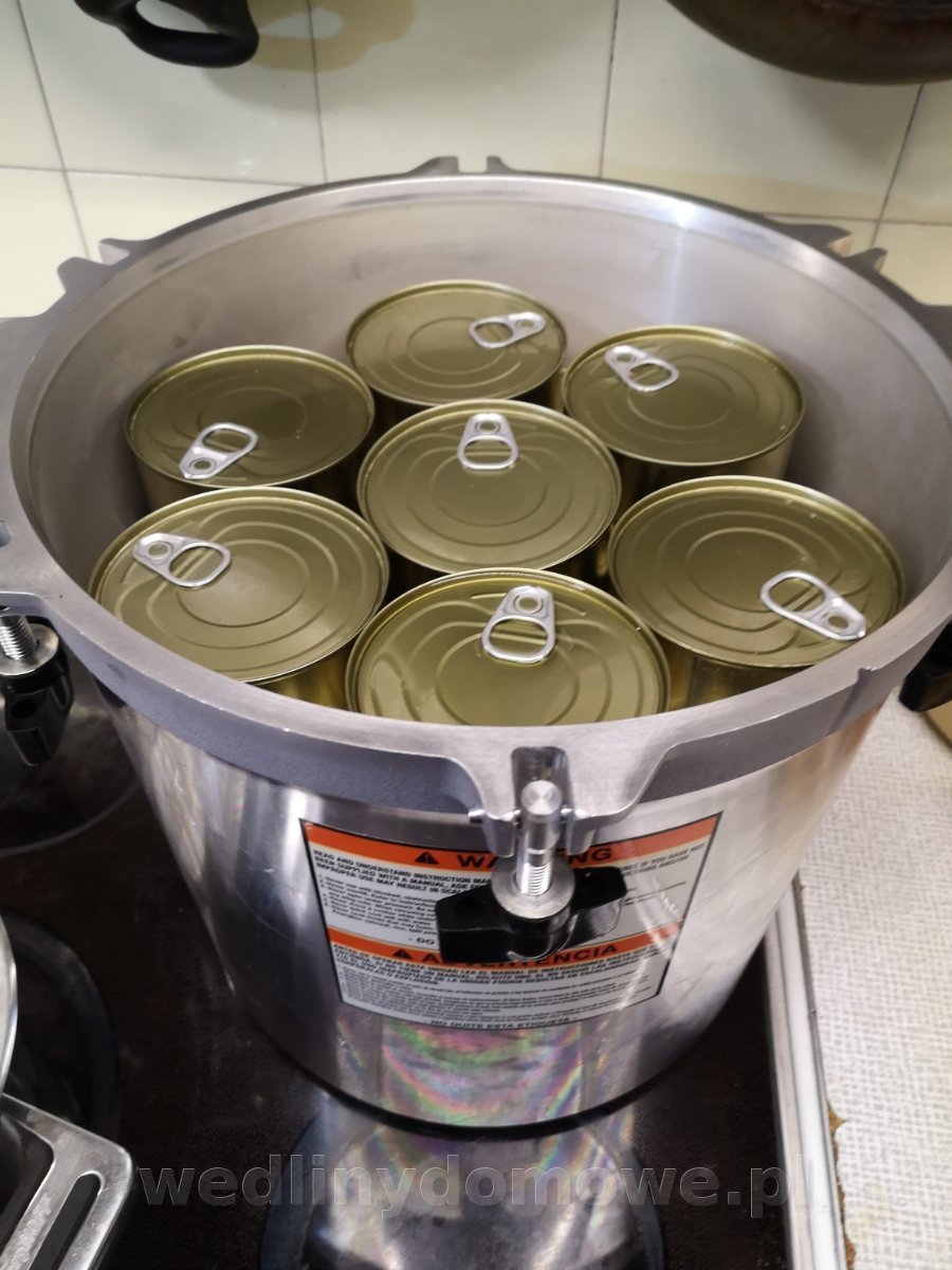 Konserwa z dzika - Gulasz podsmażany. Użyte mięsa - 10kg: łopatka, karkówka, gulaszowe z obróbki szynek, pachwina, boczek, brzuchate. Solone po podsmażeniu w ilości 11,4g/kg mięsa Przyprawy na jedną 300ml puszkę: liść laurowy - 0,5 pieprz czarny - 3 kulki pieprz czerwony - 5 kulek jałowiec - 1 kulka ziele ang. - 1 kulka czosnek granulowany cebula susz - 0,3% żelatyna - 1 łyżeczka (nie miałam skórek wp.) rozmaryn świeży - 3 igiełki sos spod mięsa Mięsa przed smażeniem: Mięso zostało obsmażone partiami: 35 puszek a'300ml: Sterylizacja na parze 60 min w 115 st.C.: (eksperymentuję z czasami sterylizacji) Puszka po otwarciu: Jest galaretka, zawartość