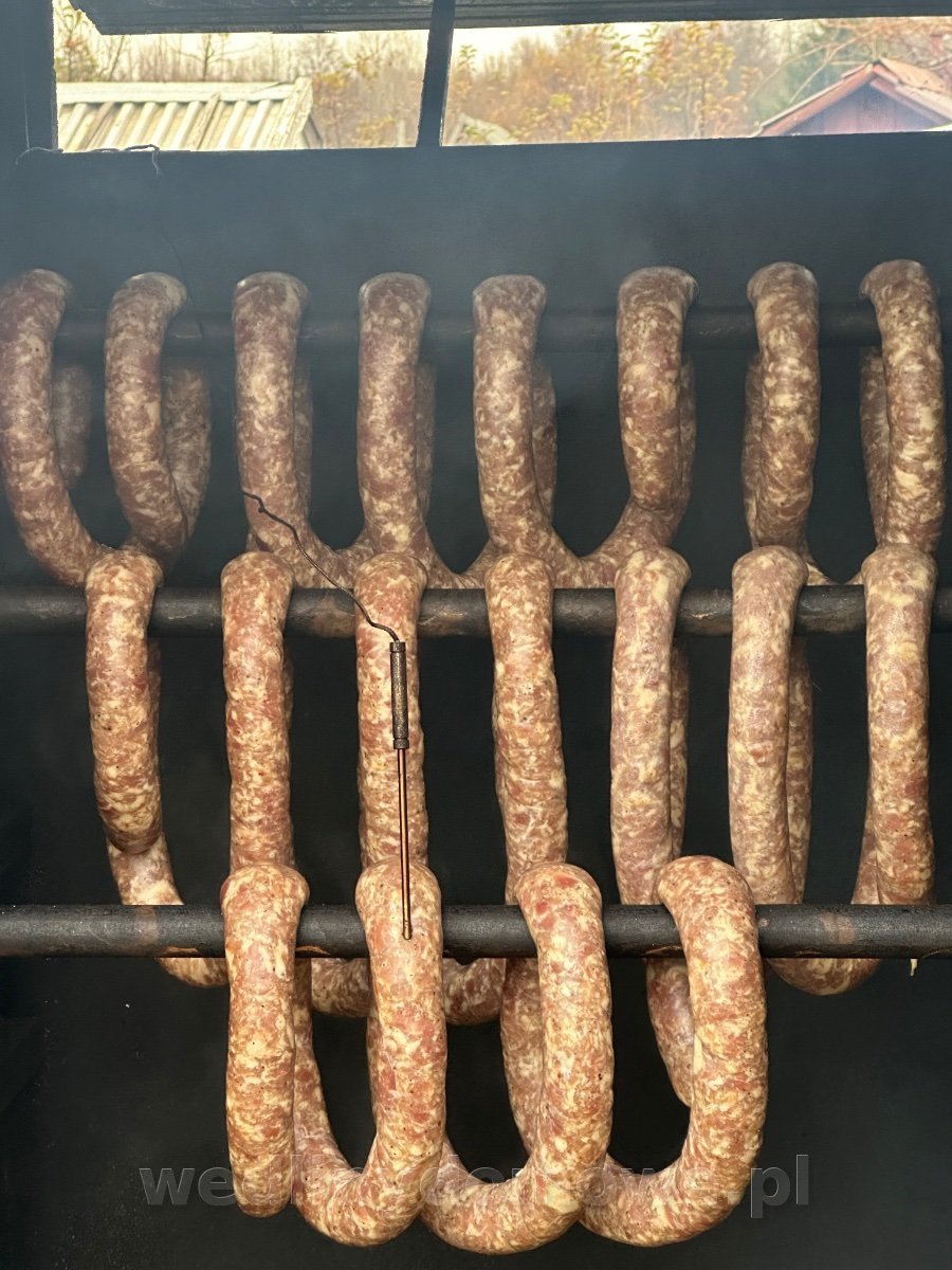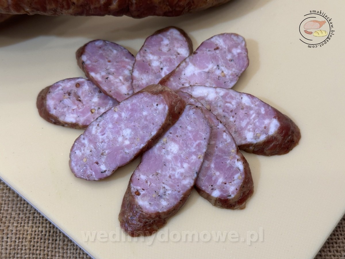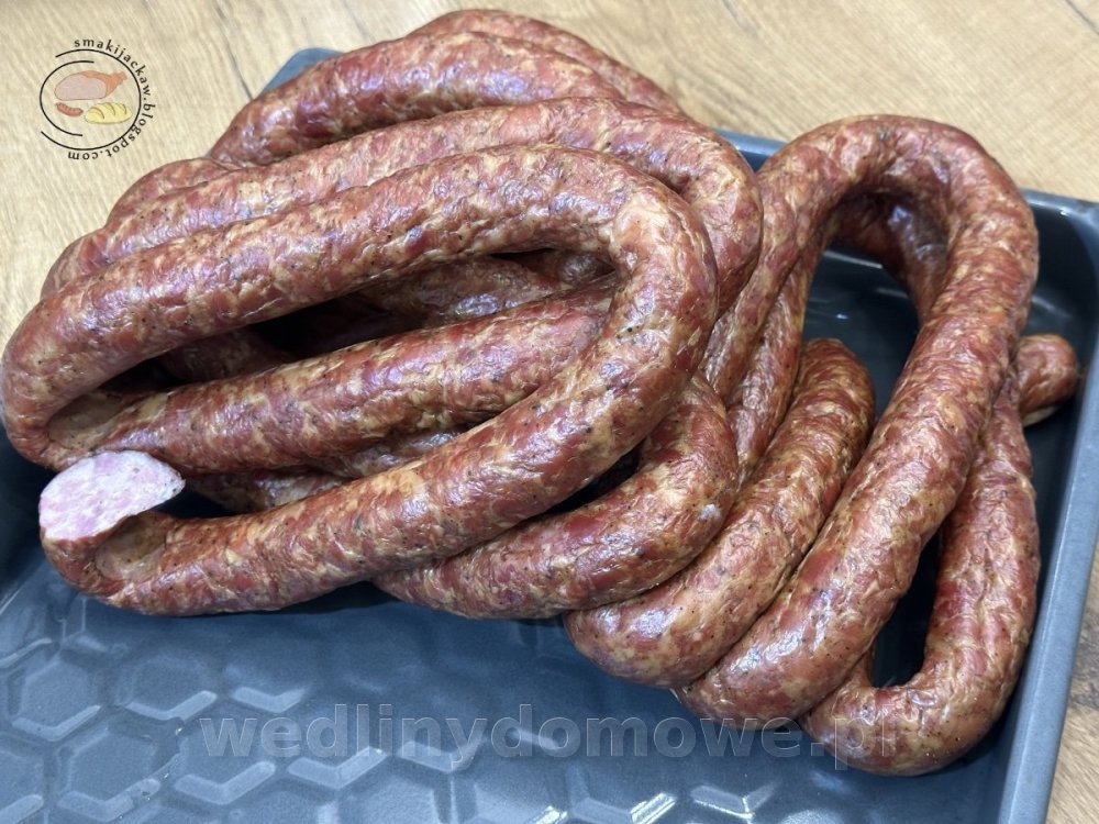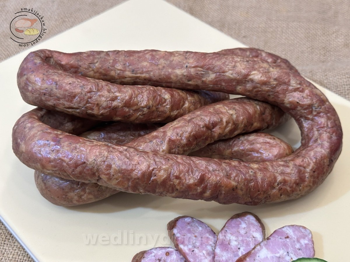 SUROWIEC I ROZDRABNIANIE Mielenie mięsa odbywało się na maszynce nr.8 -karkówka 2,5 kg / szarpak -boczek 2,5 kg / 10 mm -łopatka 2 kg / 8 mm PRZYPRAWY I MATERIAŁY POMOCNICZE -peklosól 14 g/kg -wywar z robienia galarety 14% w stosunku do ilości mięsa, wywar był solony do smaku podczas robienia galarety -pieprz czarny 3g/kg -pieprz ziołowy białowieski 3g/kg -gorczyca czarna i biała po 2g/kg -liść laurowy mielony 0,5g/kg -czosnek zgnieciony w prasce 6g/kg -jelita wieprzowe - drewno owocowe WYKONANIE Mięso kroimy w kostkę peklujemy i zostawiamy na 2 dni w lodówce temp 6 stopni, Po tym czasie mięso mielimy, podczas rozdrabniania dodajemy wszystkie przyprawy. Na koniec wlewamy wywar. Mieszamy tyle, aby mięso wchłonęło wywar i tyle masa mięsna nie musi się bardzo kleić. Napełniamy jelita średnio nie bardzo mocno/ściśle. Odwieszamy na kije wędzarnicze. Teraz rozgrzewamy wędzarnie aby pozbyć się wilgoci. W wędzarni musi być sucho i ciepło. Teraz osuszamy kiełbasę bez dymu za samym żarze - lub znikomej ilości dymu przy dużym ruchu powietrza. Osobiście osuszałem w 60 stopniach. Osuszanie trwało około 30 min do momentu, aż kiełbasa w dotyku była całkowicie sucha i ciepła. Po osuszaniu przystępujemy do wędzenia docelowego w dymie nie bardzo gęstym temp. wędzenia 50-60 stopni. Wędziłem do koloru jaki mnie zadowala trwało to około 2,5-3 godz. OBRÓBKA TERMICZNA NA KONIEC Kiełbaskę zrobiłem na dwa sposoby podpiekana w wędzarki i parzona tradycyjnie w garnku z wodą. Podpiekałem do temp. 70 w środku w temp. 90-100 stopni. Parzenie do 70 w środku kiełbasy woda 85 stopni. Osobiście bardziej mi przypadła wersja parzona. PS. Konsystencja Kiełbasa jest soczysta, ale nie luźna – idealna do krojenia w plastry, ale i w kawałkach zacnie się prezentuje i smakuje Tłuszcz boczku nadaje delikatną miękkość i przenosi pełny smak do kubków smakowych, a wywar z galarety sprawia, że masa jest lekko wilgotna, ale nie klejąca. Smak i aromat Wyraźnie mięsny i bogaty, idealnie zbalansowany dobranymi przyprawami. Pieprz czarny i mieszanka przypraw pieprz ziołowy Białowieski, gorczyca i czosnek tworzą delikatną pikantność i głębię smaku, bez przytłaczania mięsa która wyczuwalna jest w każdym kęsie. Podsumowując, ta kiełbasa jest pełna smaku, aromatyczna, soczysta, a jednocześnie elegancko sprężysta, z pięknym, naturalnym wyglądem, który zachęca do podania na stole zarówno w plasterkach, jak i w całości.