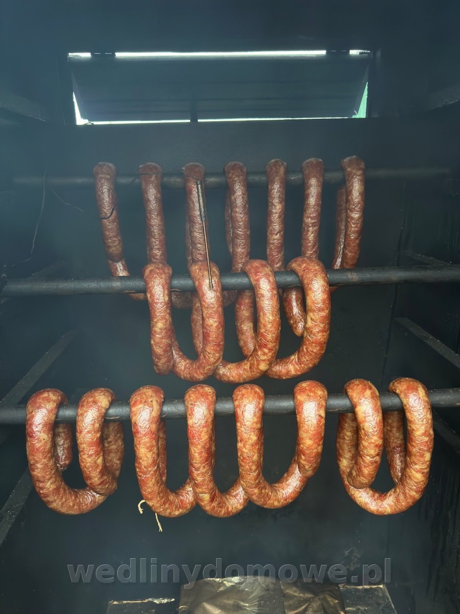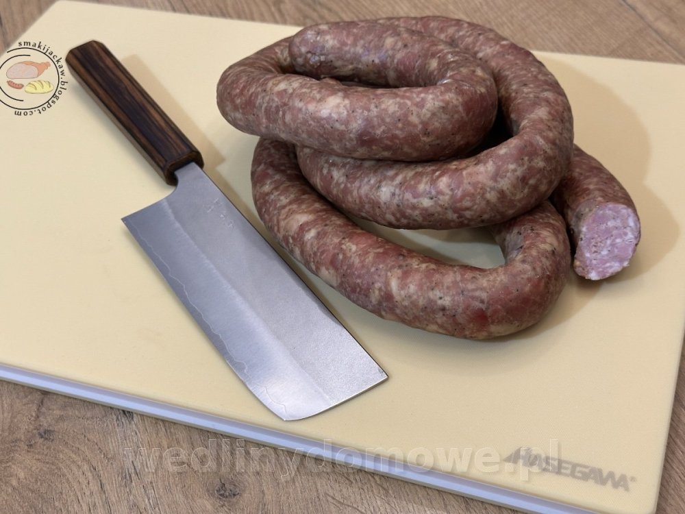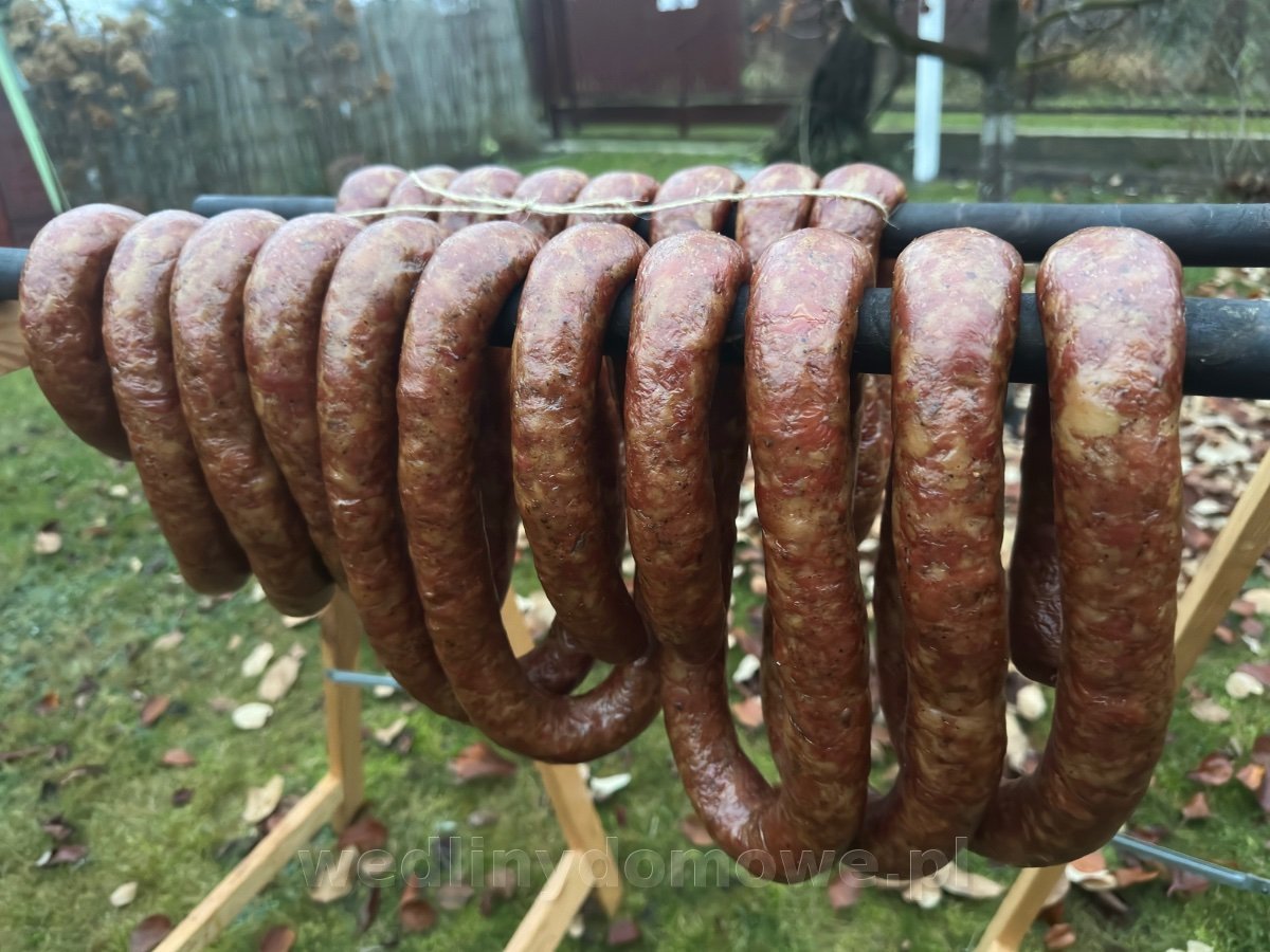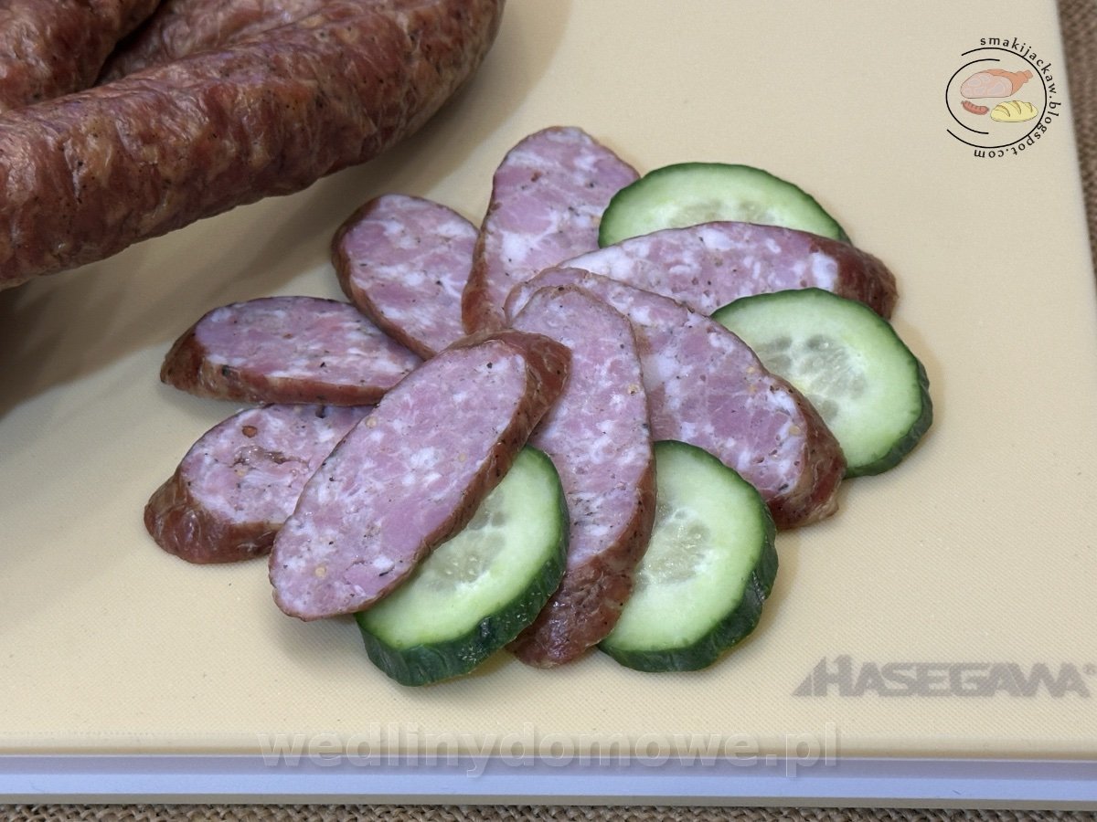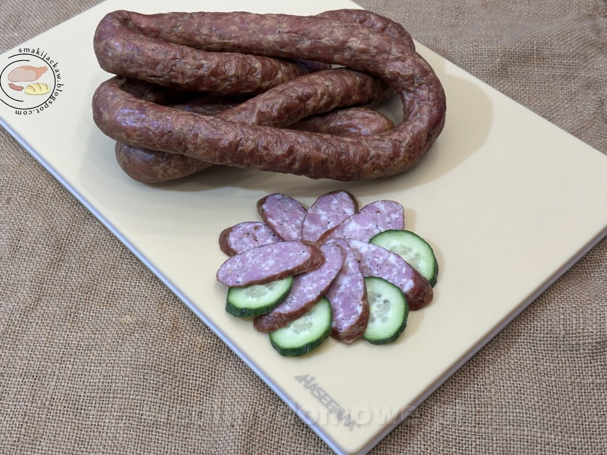 SUROWIEC I ROZDRABNIANIE Mielenie mięsa odbywało się na maszynce nr.8 -karkówka 2,5 kg / szarpak -boczek 2,5 kg / 10 mm -łopatka 2 kg / 8 mm PRZYPRAWY I MATERIAŁY POMOCNICZE -peklosól 14 g/kg -wywar z robienia galarety 14% w stosunku do ilości mięsa, wywar był solony do smaku podczas robienia galarety -pieprz czarny 3g/kg -pieprz ziołowy białowieski 3g/kg -gorczyca czarna i biała po 2g/kg -liść laurowy mielony 0,5g/kg -czosnek zgnieciony w prasce 6g/kg -jelita wieprzowe - drewno owocowe WYKONANIE Mięso kroimy w kostkę peklujemy i zostawiamy na 2 dni w lodówce temp 6 stopni, Po tym czasie mięso mielimy, podczas rozdrabniania dodajemy wszystkie przyprawy. Na koniec wlewamy wywar. Mieszamy tyle, aby mięso wchłonęło wywar i tyle masa mięsna nie musi się bardzo kleić. Napełniamy jelita średnio nie bardzo mocno/ściśle. Odwieszamy na kije wędzarnicze. Teraz rozgrzewamy wędzarnie aby pozbyć się wilgoci. W wędzarni musi być sucho i ciepło. Teraz osuszamy kiełbasę bez dymu za samym żarze - lub znikomej ilości dymu przy dużym ruchu powietrza. Osobiście osuszałem w 60 stopniach. Osuszanie trwało około 30 min do momentu, aż kiełbasa w dotyku była całkowicie sucha i ciepła. Po osuszaniu przystępujemy do wędzenia docelowego w dymie nie bardzo gęstym temp. wędzenia 50-60 stopni. Wędziłem do koloru jaki mnie zadowala trwało to około 2,5-3 godz. OBRÓBKA TERMICZNA NA KONIEC Kiełbaskę zrobiłem na dwa sposoby podpiekana w wędzarki i parzona tradycyjnie w garnku z wodą. Podpiekałem do temp. 70 w środku w temp. 90-100 stopni. Parzenie do 70 w środku kiełbasy woda 85 stopni. Osobiście bardziej mi przypadła wersja parzona. PS. Konsystencja Kiełbasa jest soczysta, ale nie luźna – idealna do krojenia w plastry, ale i w kawałkach zacnie się prezentuje i smakuje Tłuszcz boczku nadaje delikatną miękkość i przenosi pełny smak do kubków smakowych, a wywar z galarety sprawia, że masa jest lekko wilgotna, ale nie klejąca. Smak i aromat Wyraźnie mięsny i bogaty, idealnie zbalansowany dobranymi przyprawami. Pieprz czarny i mieszanka przypraw pieprz ziołowy Białowieski, gorczyca i czosnek tworzą delikatną pikantność i głębię smaku, bez przytłaczania mięsa która wyczuwalna jest w każdym kęsie. Podsumowując, ta kiełbasa jest pełna smaku, aromatyczna, soczysta, a jednocześnie elegancko sprężysta, z pięknym, naturalnym wyglądem, który zachęca do podania na stole zarówno w plasterkach, jak i w całości.