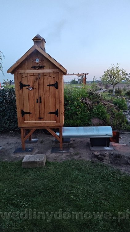 4. Witam ponownie na chwilę obecną jest deska dębowa 2 cm po ostatnim wędzeniu przy temperaturze +2stC i silnym wietrze stwierdziłem, że trzeba coś pokombinować aby dymienie nie było tak uciążliwe w takich okolicznościach przyrody. Po o czytaniu forum odnośnie dodatkowej izolacji termicznej stwierdziłem że najlepiej dołożyć od wewnątrz deskę i zostawiać wolną przestrzeń z powietrzem. Ale mam kawałem tej maty i taki pomysł aby wyglądało to tak: deska zew. dębowa 2 cm; mata 5 mm; 2,5 cm powietrze; dokładam deskę pióro wpust olcha 1,6 cm. I jak teraz to widzicie? Wędzarnia wygląda jak niżej.