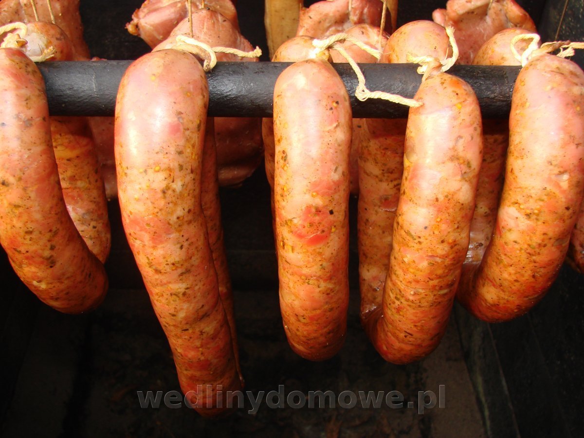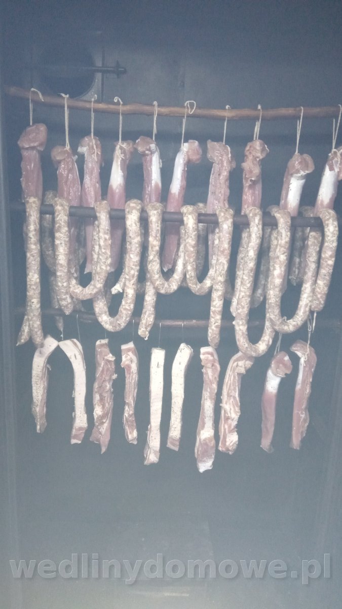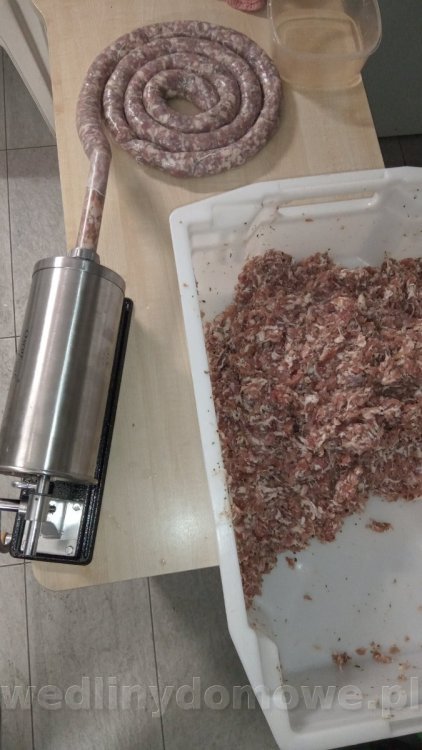 Pochwalę się. Kilka kilogramów kiełbasy wg przepisu: -3 kg boczku, -7 kg łopatki, Pokrojone w kostkę i zapeklowane peklosola 48h 18g na kg mięsa. Zmieniłem na grubych oczkach i wyrobiłem z dodatkiem przyprawy gotowej do kiełbasy drwala (Jelux), 20 g pieprzu czosnkowego i 500 ml zimnej wody. W smaku wyszła bardzo czosnkowa i aromatyczna. Najbliżsi zachwycają się smakiem. Wędzenie 3h drzewem olchowym. Parzenie w 70°C przez 20 min.