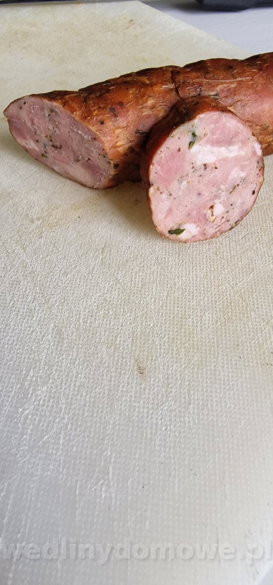 1. II wp. z obróbki szynek - 80/20- 4 kg 2. podgardle wp. - 1 kg Przyprawy 1.Czosnek - 2 g/kg 2.Pieprz biały - 1,5g/kg 3.Papryka wędzona Pimenton - 20g/kg Peklowanie 1,Peklosól-19g/kg Materiały pomocnicze 1,Jelita kaliber 26-28 Suszenie 1.Temperatura 14º C 2.Wilgotność nieznana bo nie mam higrometru. Wnioski 1.Sklejenie bardzo dobre 2.Jak dla mnie mało słona 3.Jak dla mnie dodam na drugi raz trochę więcej różnych przypraw jak ziele, kolendra, jałowiec, papryka ostra i pieprz czarny zamiast białego bo jest mocniejszy. Nie dodawałem żadnych kultur ponieważ miała być to z założenia kiełbasa podsuszana a nie dojrzewająca.Mój klub "Kiełbasy" # 196 .