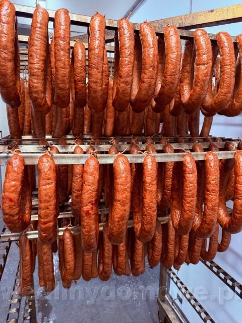 Kiełbasa lisiecka wyprodukowana tradycyjnym sposobem, wędzona w klasycznej wędzarni z bezpośrednim paleniskiem. Należy zwrócić szczególną uwagę na równomierne wędzenie oraz uzyskanie właściwego, jednolitego koloru wyrobu. W procesie tym ogromne znaczenie mają naturalne warunki, jakie daje natura — odpowiedni rodzaj drewna używanego do wędzenia (np. olcha, buk, dąb, jałowiec), jego wilgotność, temperatura otoczenia oraz ruch powietrza. To właśnie te czynniki wpływają na barwę, aromat i smak kiełbasy, nadając jej niepowtarzalny, tradycyjny charakter, którego nie da się uzyskać w procesach przemysłowych. -