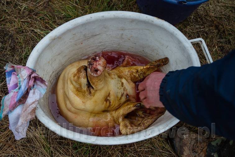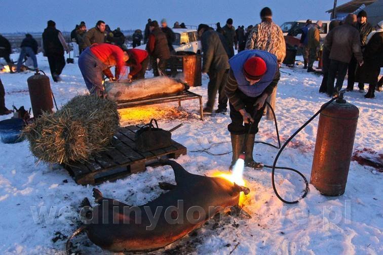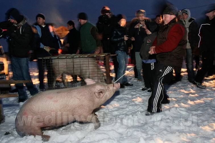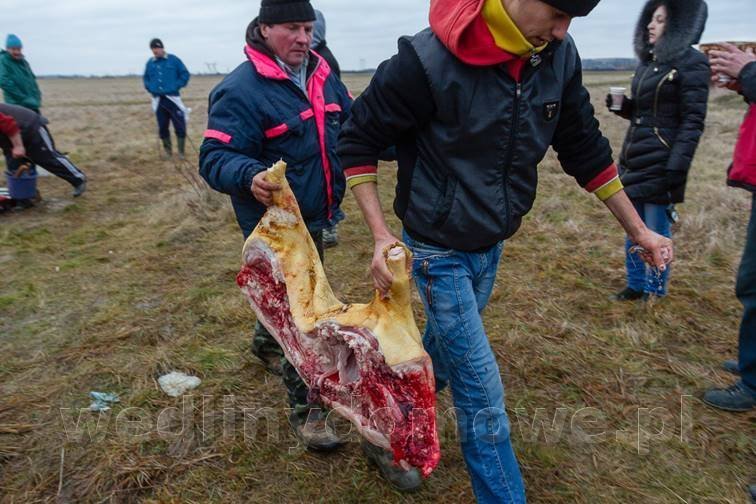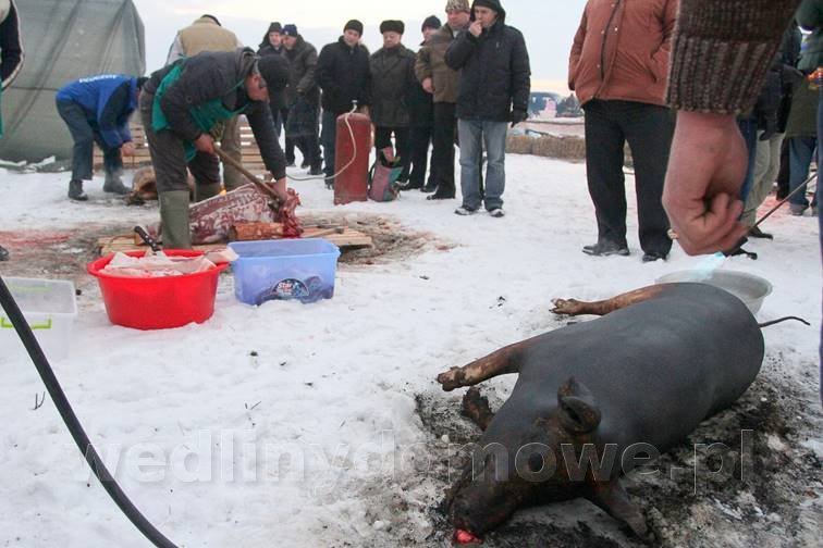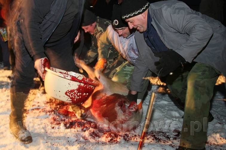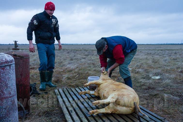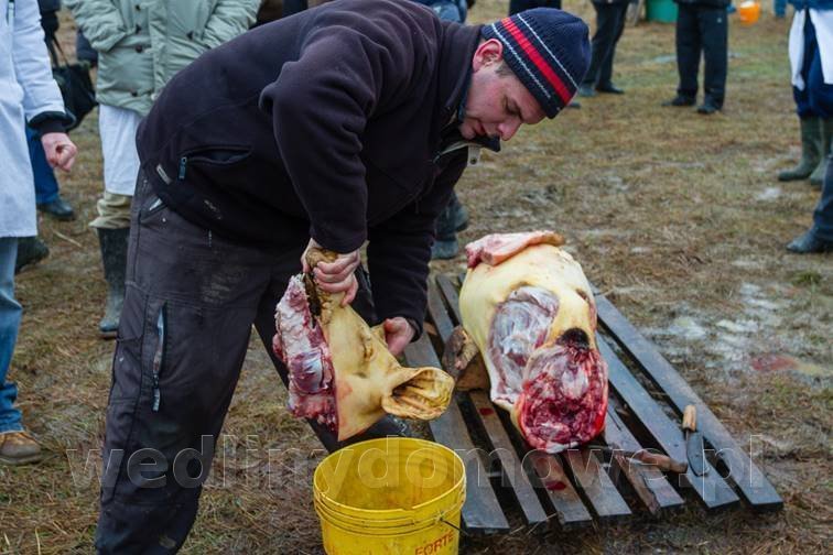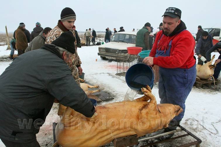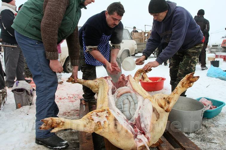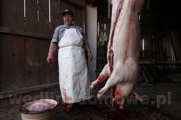 Świniobicie Świniobicie w Polsce. "Po uboju mężczyźni odprawiali swój atawistyczny rytuał" Słowo "świniobicie" dzisiaj jest postrzegane — szczególnie wśród wegetarian — jako barbarzyństwo. Jednak przez wieki oznaczało specjalne święto i symbol dobrobytu. Skąd się wzięło i co oznaczało świniobicie w Polsce. Świniobicie – przeprowadzany prywatnie, w gospodarstwach rolnych proces związany z zabiciem świni i przygotowaniem mięsa z uboju – aż do II wojny światowej było ważnym wydarzeniem w życiu wsi. Ten pochodzący jeszcze z tradycji pogańskiej rytuał, kultywowany przez wszystkie narody Europy Środkowej, w kulturze ludowej przybierał postać szczególnego święta, będącego oznaką obfitości i radości. Ze względów praktycznych świniobicie najczęściej odbywało się przed świętami Bożego Narodzenia. Na Węgrzech przyjął się zwyczaj dokonywania go 21 grudnia, czyli w dniu liturgicznego wspomnienia Świętego Tomasza Apostoła, którego w tradycji ludowej nazywano Tomaszem świniobójcą. Praktyka ta nie ma jednakże żadnych podstaw biblijnych, ponieważ święty Tomasz, towarzysz Jezusa Chrystusa, w żadnym procederze świniobicia nie uczestniczył. Na terenach protestanckich ubój następował przed karnawałem, a mięsem zajadano się na ostatki, co dokumentuje przysłowie: Na Świętego Antoniego [17 stycznia] sól wieprza i zamykaj oliwą. Trzeba tu zaznaczyć, że Święty Antoni jest we Francji patronem masarzy. Przysłowie to przy okazji sugeruje, jak powinno się prawidłowo konserwować mięso. Lud wiejski w zakresie przygotowania jedzenia zawsze kierował się ogromnym pragmatyzmem, dlatego dzień, w którym wieprzek położył głowę, musiał być dokładnie ustalony, aby świniobicie nie wypadło w każdym gospodarstwie w tym samym czasie. Rozdział mięsa wśród bliskich obligował do odwdzięczania się przy kolejnym świniobiciu. Był to pomysł na zagospodarowanie nadwyżek żywności, a właściwie – na zapewnienie sobie co pewien czas świeżego mięsa. Wspólna uczta urządzana przy tej okazji służyła jednoczeniu wiejskiej społeczności i była też swoistym aktem pomocy społecznej, dzięki której najbiedniejsi otrzymywali trochę żywności. We wsiach z czasem wykształcili się wędrujący, zazwyczaj domorośli rzeźnicy, którzy świadczyli usługi okolicznym gospodarstwom. Natomiast wykwalifikowani rzeźnicy czy masarze swoje jatki i kramy utrzymywali w miastach. Kresowe zwyczaje związane ze świniobiciem w Szczenięcych latach barwnie odmalował Melchior Wańkowicz: Specjalnym świętem było "skierstuwie" – bicie wieprzy, kiedy cały dom objadał się "wiadorami" (kiszki nadziane tartymi surowymi kartoflami) i "szupienią" (kasza z pęcaku, gotowana na ogonach wieprzowych). Na zimę przygotowywano dla czeladzi tak zwany "kindziuk", czyli "skiłłądź" (ten ostatni termin ma być polski) – brzuch wieprzowy, tęgo nabity obrzynkami mięsa, zaprawiony saletrą i korzeniami i wędzony. Dla włościan skierstuwie miało znacznie szerszy, bo społeczny wymiar. Tak opisuje to Biruta Markuza-Bieniecka w książce Chłodnik znad Niemna: kuchnia litewska: Świniobicie było zawsze na Żmudzi uroczystością oczekiwaną i ważnym wydarzeniem towarzyskim, wieńczonym – po zakończeniu zasadniczych czynności – biesiadką, na którą składały się znakomite dania przyrządzone ze świeżych podrobów i krwi. Do czynności obowiązkowych należało także rozsyłanie dzieci z miskami pełnymi świeżyny do bliskich krewnych i przyjaciół, którzy w odpowiednim czasie tym samym skrupulatnie się rewanżowali. Później zaczynały dymić wędzarnie, a w spiżarniach stały kubły i beczki zasolonego mięsa. Przyrządzano kiełbasy, boczki, polędwice, szynki i legendarne szkiłłądzie, które i dzisiaj jeszcze w kartach najwytworniejszych litewskich restauracji umieszczane są na miejscu honorowym, obok kawioru i szampana. Samo przygotowanie do świniobicia wymagało sporo zachodu. Nastawiano garnki z wrzącą wodą, ostrzono noże, mielono pieprz i przyprawy, tłuczono sól. Szykowano naczynia. Po ubiciu i podzieleniu wieprza na półtusze przystępowano do mycia mięsa, skrobania sierści i dzielenia mięsa w zależności od przeznaczenia. Bardziej wartościowe odkładano na szynki i kumpie (zapeklowane mięso, najczęściej z kością), słoninę solono, a podroby i kiszki szykowano do wyrobu pasztetówek i kaszanek. Nic nie mogło się zmarnować. Głowy i nogi czyszczono przed gotowaniem ich na galaretę czy salceson. Z kopyt wygotowywano klej, a zasolony ogon odkładano na zupę ogonową albo grochówkę. Po uboju mężczyźni odprawiali swój atawistyczny rytuał. Szklanka bimbru zapijana była gorącą upuszczoną krwią i zakąszana osmalonym świńskim uchem. To pozostałość po żmudzkim skierstuwiu. Teraz wędzone świńskie uszy są sztandarowym litewskim produktem eksportowym, który znaleźć możemy na półkach specjalistycznych sklepów. To, co dawniej było odpadem lub co najwyżej składnikiem wykpiwanych w okresie PRL-u salcesonów, dzisiaj staje się rarytasem. Podzielone mięso musiało ostygnąć i skruszeć. Składowano je więc w komorze, latem zaś – w lodowni. Kolejnego dnia zabierano się do sporządzania wędlin. Najpierw gromadzono przyprawy: sól, pieprz i czosnek. Nastawiano też potężne gary i kadzie, by zagotować w nich wodę. Szynki i polędwice przed wędzeniem solono. Z kości wykrawano resztki mięsa na kiełbasy. Ugotowane płuca i wątrobę mielono, łączono z ugotowaną kaszą gryczaną, krwią, i tak powstałym farszem nadziewano jelita. Po upieczeniu lub ugotowaniu otrzymywano smakowitą kaszankę. Jeśli do samej wątroby i płuc dodano kaszę mannę albo bułkę pszenną, wychodziły pasztetówki. W osobnym garze gotowano głowę, nogi i jęzor. Po ugotowaniu do miękkości i obraniu z kości otrzymywano farsz, którym nadziewano wyczyszczony i wyparz