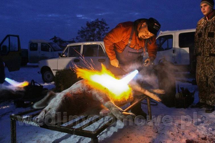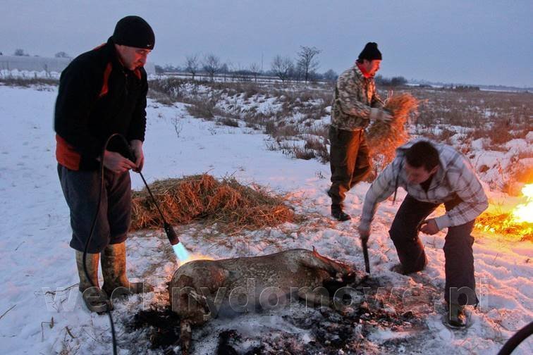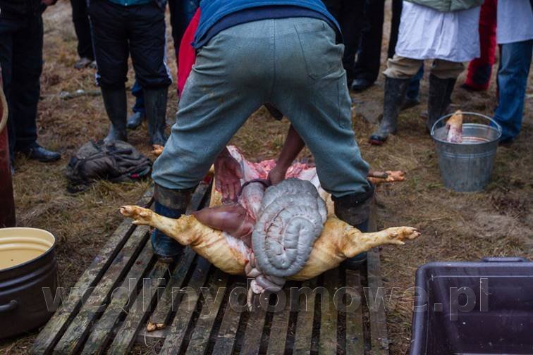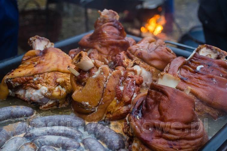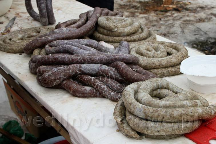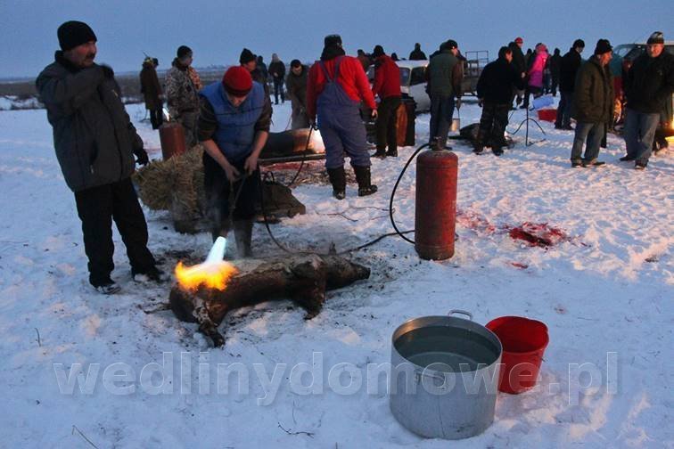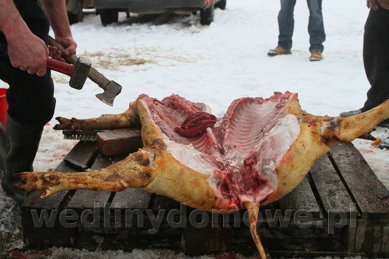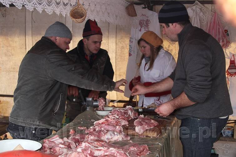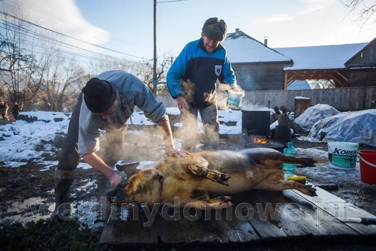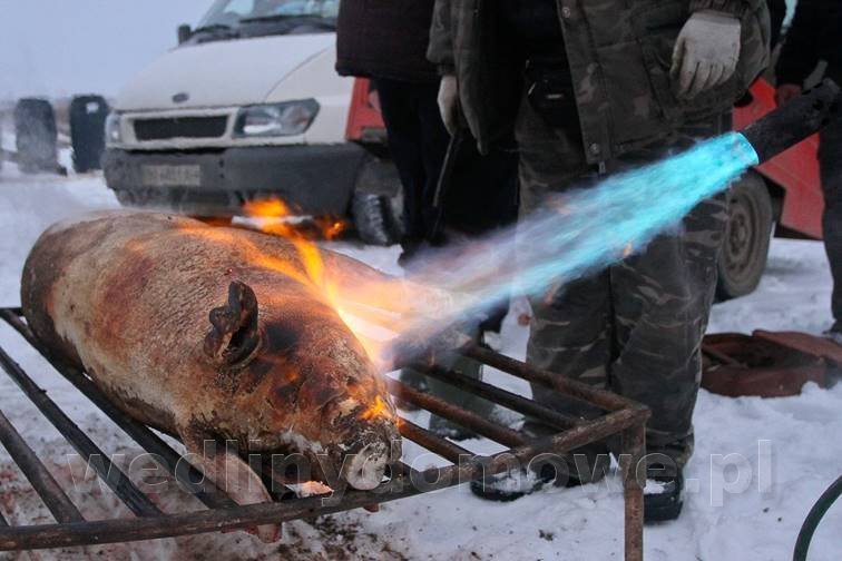 Świniobicie Świniobicie w Polsce. "Po uboju mężczyźni odprawiali swój atawistyczny rytuał" Słowo "świniobicie" dzisiaj jest postrzegane — szczególnie wśród wegetarian — jako barbarzyństwo. Jednak przez wieki oznaczało specjalne święto i symbol dobrobytu. Skąd się wzięło i co oznaczało świniobicie w Polsce. Świniobicie – przeprowadzany prywatnie, w gospodarstwach rolnych proces związany z zabiciem świni i przygotowaniem mięsa z uboju – aż do II wojny światowej było ważnym wydarzeniem w życiu wsi. Ten pochodzący jeszcze z tradycji pogańskiej rytuał, kultywowany przez wszystkie narody Europy Środkowej, w kulturze ludowej przybierał postać szczególnego święta, będącego oznaką obfitości i radości. Ze względów praktycznych świniobicie najczęściej odbywało się przed świętami Bożego Narodzenia. Na Węgrzech przyjął się zwyczaj dokonywania go 21 grudnia, czyli w dniu liturgicznego wspomnienia Świętego Tomasza Apostoła, którego w tradycji ludowej nazywano Tomaszem świniobójcą. Praktyka ta nie ma jednakże żadnych podstaw biblijnych, ponieważ święty Tomasz, towarzysz Jezusa Chrystusa, w żadnym procederze świniobicia nie uczestniczył. Na terenach protestanckich ubój następował przed karnawałem, a mięsem zajadano się na ostatki, co dokumentuje przysłowie: Na Świętego Antoniego [17 stycznia] sól wieprza i zamykaj oliwą. Trzeba tu zaznaczyć, że Święty Antoni jest we Francji patronem masarzy. Przysłowie to przy okazji sugeruje, jak powinno się prawidłowo konserwować mięso. Lud wiejski w zakresie przygotowania jedzenia zawsze kierował się ogromnym pragmatyzmem, dlatego dzień, w którym wieprzek położył głowę, musiał być dokładnie ustalony, aby świniobicie nie wypadło w każdym gospodarstwie w tym samym czasie. Rozdział mięsa wśród bliskich obligował do odwdzięczania się przy kolejnym świniobiciu. Był to pomysł na zagospodarowanie nadwyżek żywności, a właściwie – na zapewnienie sobie co pewien czas świeżego mięsa. Wspólna uczta urządzana przy tej okazji służyła jednoczeniu wiejskiej społeczności i była też swoistym aktem pomocy społecznej, dzięki której najbiedniejsi otrzymywali trochę żywności. We wsiach z czasem wykształcili się wędrujący, zazwyczaj domorośli rzeźnicy, którzy świadczyli usługi okolicznym gospodarstwom. Natomiast wykwalifikowani rzeźnicy czy masarze swoje jatki i kramy utrzymywali w miastach. Kresowe zwyczaje związane ze świniobiciem w Szczenięcych latach barwnie odmalował Melchior Wańkowicz: Specjalnym świętem było "skierstuwie" – bicie wieprzy, kiedy cały dom objadał się "wiadorami" (kiszki nadziane tartymi surowymi kartoflami) i "szupienią" (kasza z pęcaku, gotowana na ogonach wieprzowych). Na zimę przygotowywano dla czeladzi tak zwany "kindziuk", czyli "skiłłądź" (ten ostatni termin ma być polski) – brzuch wieprzowy, tęgo nabity obrzynkami mięsa, zaprawiony saletrą i korzeniami i wędzony. Dla włościan skierstuwie miało znacznie szerszy, bo społeczny wymiar. Tak opisuje to Biruta Markuza-Bieniecka w książce Chłodnik znad Niemna: kuchnia litewska: Świniobicie było zawsze na Żmudzi uroczystością oczekiwaną i ważnym wydarzeniem towarzyskim, wieńczonym – po zakończeniu zasadniczych czynności – biesiadką, na którą składały się znakomite dania przyrządzone ze świeżych podrobów i krwi. Do czynności obowiązkowych należało także rozsyłanie dzieci z miskami pełnymi świeżyny do bliskich krewnych i przyjaciół, którzy w odpowiednim czasie tym samym skrupulatnie się rewanżowali. Później zaczynały dymić wędzarnie, a w spiżarniach stały kubły i beczki zasolonego mięsa. Przyrządzano kiełbasy, boczki, polędwice, szynki i legendarne szkiłłądzie, które i dzisiaj jeszcze w kartach najwytworniejszych litewskich restauracji umieszczane są na miejscu honorowym, obok kawioru i szampana. Samo przygotowanie do świniobicia wymagało sporo zachodu. Nastawiano garnki z wrzącą wodą, ostrzono noże, mielono pieprz i przyprawy, tłuczono sól. Szykowano naczynia. Po ubiciu i podzieleniu wieprza na półtusze przystępowano do mycia mięsa, skrobania sierści i dzielenia mięsa w zależności od przeznaczenia. Bardziej wartościowe odkładano na szynki i kumpie (zapeklowane mięso, najczęściej z kością), słoninę solono, a podroby i kiszki szykowano do wyrobu pasztetówek i kaszanek. Nic nie mogło się zmarnować. Głowy i nogi czyszczono przed gotowaniem ich na galaretę czy salceson. Z kopyt wygotowywano klej, a zasolony ogon odkładano na zupę ogonową albo grochówkę. Po uboju mężczyźni odprawiali swój atawistyczny rytuał. Szklanka bimbru zapijana była gorącą upuszczoną krwią i zakąszana osmalonym świńskim uchem. To pozostałość po żmudzkim skierstuwiu. Teraz wędzone świńskie uszy są sztandarowym litewskim produktem eksportowym, który znaleźć możemy na półkach specjalistycznych sklepów. To, co dawniej było odpadem lub co najwyżej składnikiem wykpiwanych w okresie PRL-u salcesonów, dzisiaj staje się rarytasem. Podzielone mięso musiało ostygnąć i skruszeć. Składowano je więc w komorze, latem zaś – w lodowni. Kolejnego dnia zabierano się do sporządzania wędlin. Najpierw gromadzono przyprawy: sól, pieprz i czosnek. Nastawiano też potężne gary i kadzie, by zagotować w nich wodę. Szynki i polędwice przed wędzeniem solono. Z kości wykrawano resztki mięsa na kiełbasy. Ugotowane płuca i wątrobę mielono, łączono z ugotowaną kaszą gryczaną, krwią, i tak powstałym farszem nadziewano jelita. Po upieczeniu lub ugotowaniu otrzymywano smakowitą kaszankę. Jeśli do samej wątroby i płuc dodano kaszę mannę albo bułkę pszenną, wychodziły pasztetówki. W osobnym garze gotowano głowę, nogi i jęzor. Po ugotowaniu do miękkości i obraniu z kości otrzymywano farsz, którym nadziewano wyczyszczony i wyparz