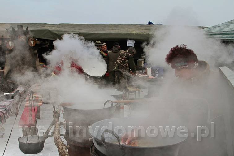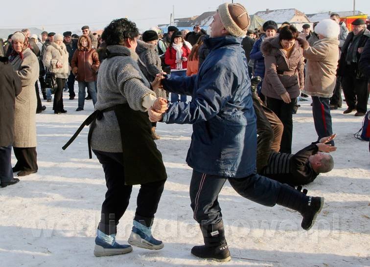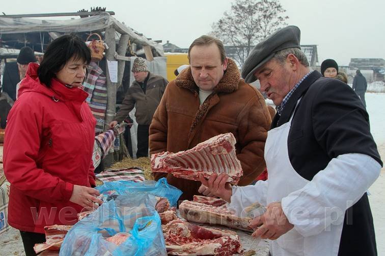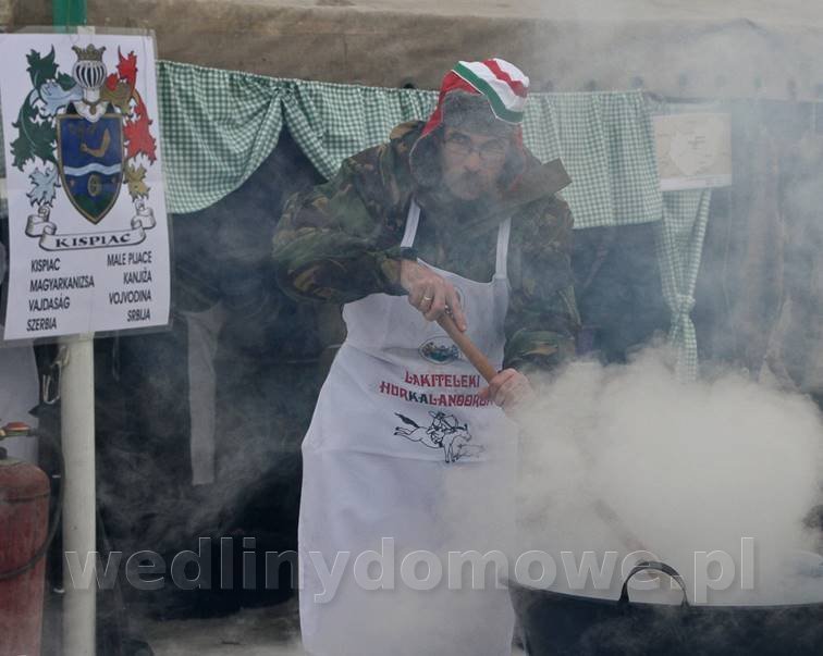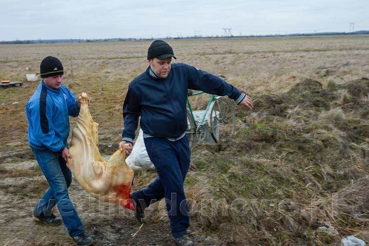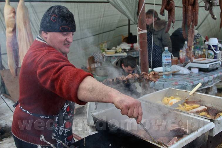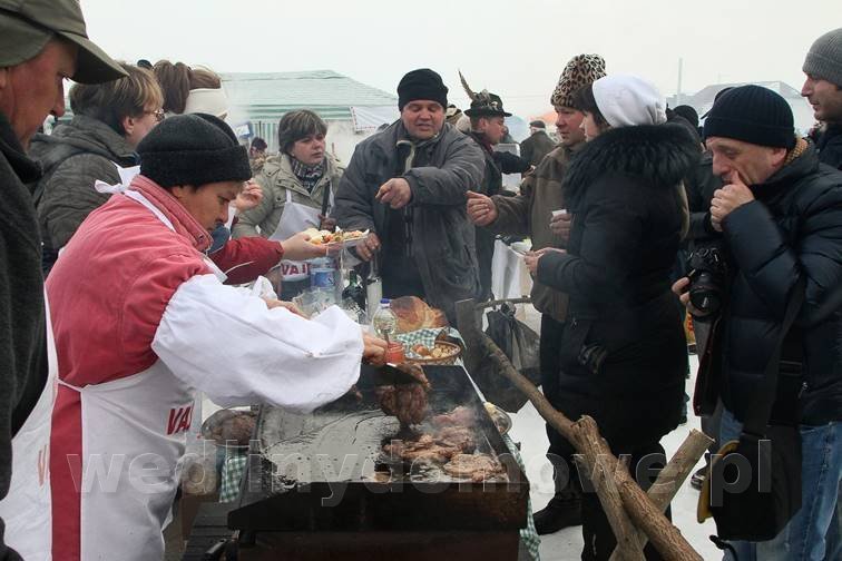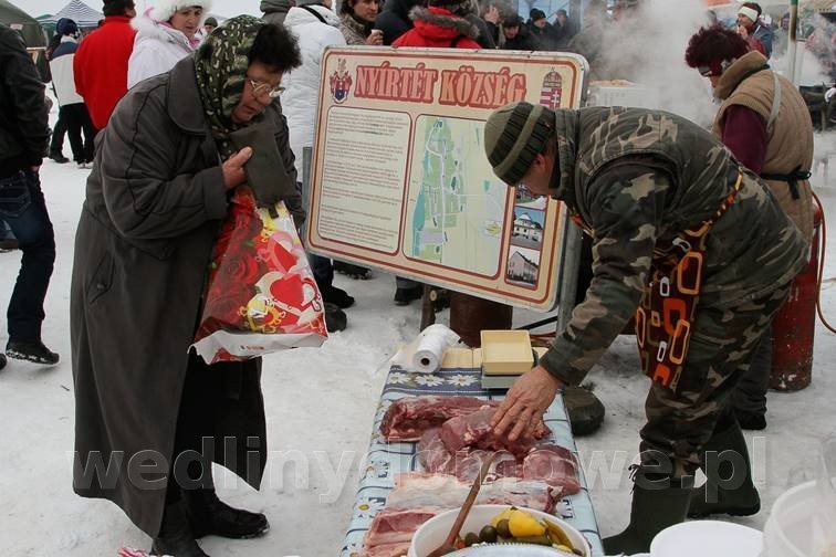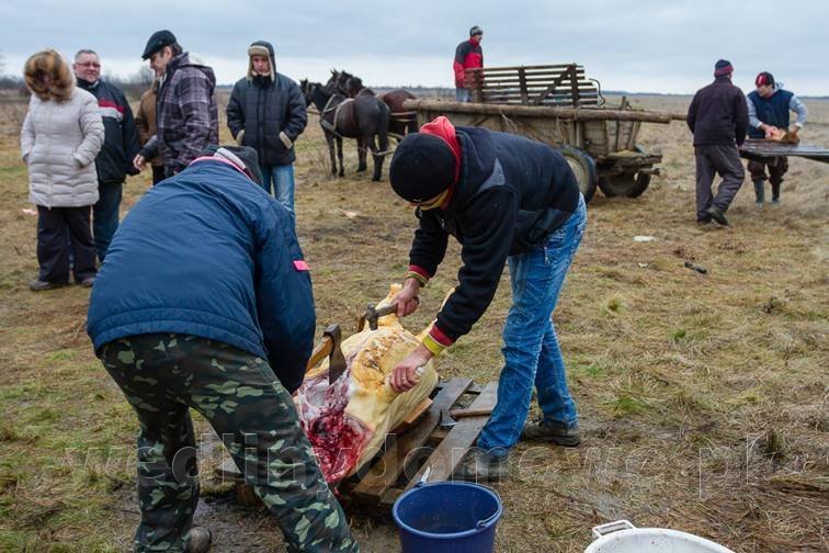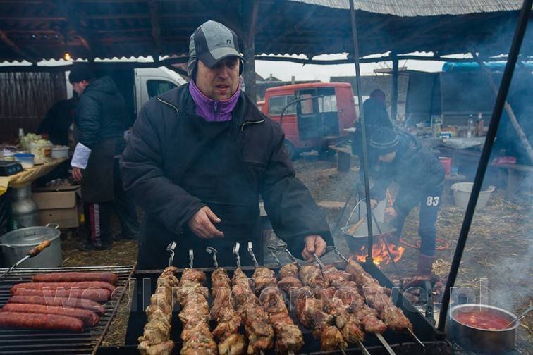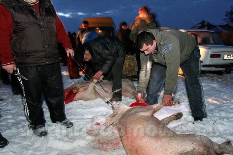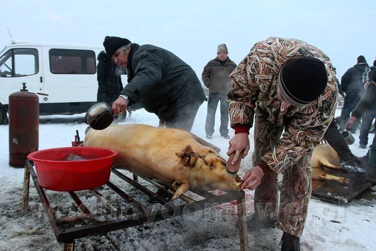Zapiski ze święta wędliniarzy i rzeźników na Zakarpaciu Takiego świniobicia nie zobaczycie już nigdzie. Nawet tam protesty obrońców zwierząt i wegetarian zrobiły swoje. Konkurs rzeźników i wędliniarzy od niepamiętnych czasów organizowany w kiedyś węgierskiej, obecnie ukraińskiej wsi Gecza na Zakarpaciu, pozbawiony został najbardziej drastycznego elementu – rzezania konkursowych świń. Jury ocenia teraz prawidłowość rozbioru tuszy oraz smaki kiełbas i wędlin, wyrabianych przez konkurujące ze sobą drużyny. Nam udało się być na tym konkursie kilka lat temu, gdy jury oceniało jeszcze prawidłowość uboju i opalania tuszy. Gdyby nie konkurs, o Geczy (po węgiersku Mezőgecse) nie wiedziałby nikt. Wieś jak wieś. Tysiąc mieszkańców, kilka ulic, domy z czterospadowymi kopertowymi dachami. Takimi samymi jak na Węgrzech, do granicy z którymi jest niespełna 10 kilometrów. Tyle samo dzieli Geczę od powiatowego miasteczka Berehovo (Ukraina). Kilometrów niewiele, ale trafić trudno, bo droga boczna. Dlatego przodem jedzie taxi, czarna łada, niemożliwie lśniąca i z bajeranckim spojlerem na klapie bagażnika. Ładę prowadzi były oficer Czerwonej Armii, Stanisław. Na skrzyżowaniu pokazuje kierunek i żegna się. Na niedługo, tylko do jutra. Bo jutro i on przyjedzie do Geczy. Spotka się przy okazji z kilkoma kolegami z wojska, którzy mieszkają w Mukaczewie. Zostali tam, gdy upadł Sojuz i ich armia przestała istnieć. Pożenili, dorobili dzieci, osiedli. Jest piątek, 27 stycznia. Ciemno, dochodzi 20. W odległym od Geczy o prawie 900 kilometrów Kijowie odpala silnik autokaru Gawriło. Do Geczy zawiezie pół setki stołecznych turystów. Czeka go nocna jazda przez Żytomierz, Tarnopol, Stryj. Drogi miejscami dziurawe, więc jest zadowolony, że będzie przemieszczał się w kolumnie trzech autobusów. Z drugiej strony mapy, w położonym pod Budapesztem Kecskemet, Tibor, też kierowca wycieczkowego autokaru, jeszcze śpi. Budzik w telefonie ma nastawiony na 5. rano, wyjeżdża o 6:15, też z turystami. Mają dotrzeć w południe, Tibor liczy, że pokona trasę w 5 godzin. Dolicza niecałą godzinę stania na granicy. Dziś święto w Geczy, więc pogranicznicy nie powinni trzymać długo. Zawodnicy są na miejscu od rana. Sześć drużyn z Węgier, dwie z Serbii, dwanaście z Ukrainy. Rozstawiają namioty, rąbią drwa na opał, gromadzą słomę, myją kotły, ostrzą narzędzia. Zawody zaczynają się w sobotę o 6. rano, będzie jeszcze ciemno, wszystko trzeba porobić dzisiaj. Konkurs Nie ma jeszcze szóstej, gdy na placu zaczyna się ruch. Śnieg skrzypi pod nogami. Zakarpacie niby ciepły region, ale mróz poniżej dziesięciu stopni. Zawodnicy skupiają się w kręgu światła pod wiszącą na słupie latarnią. Powitanie, prezentacja jury (jest międzynarodowe, ukraińsko- węgierskie), po stakanczyku (kieliszku) palinki i start. Pierwsze wieprze wychodzą z klatek niezbyt chętnie bo zimno, ale bez oporu. Padają pod obuchem siekiery, z błyskawicznie poderżniętych gardeł krew płynie do podstawionej miednicy. Z podręcznika rzeźnika: „Sposób w jaki przeprowadzony jest ubój oraz postępowanie z tuszami już po nim wpływa na wartość otrzymanego surowca. Stres związany z oszałamianiem elektrycznym jest najważniejszym negatywnym czynnikiem oddziaływającym na zwierzęta, a co za tym idzie, na mięso. Dlatego czas między oszałamianiem a kłuciem powinien być jak najkrótszy. Ogranicza to dotarcie hormonów stresowych do mięśni”. Konkursowe świnie nie mają czasu na stres. Jury patrzy i ocenia, nie ma elektrycznego oszałamiania, jest obuch siekiery i natychmiast po nim – by użyć podręcznikowego określenia – kłucie. Mniej szczęścia mają te z drugiej dwudziestki. Czują zapach krwi i śmierci. Z kojców trzeba je wyciągać siłą. Kwiczą przeraźliwie. Później słychać tylko syk gazowych palników, którymi posługuje się większość drużyn. W powietrzu unosi się woń palonej sierści. Jury znacznie wyżej ocenia jednak tradycyjne opalanie tuszy słomą, toteż część drużyn najpierw okłada zabite i wykrwawione świnie słomą i podpala. „Odcięta głowa prosięcia wraz z ryjkiem leżała na stole, dwie łopatki właśnie przyniosłam. I już biegłam przez podwórze (…) bo pan Myclik wyciągnął kiszki i kazał pomocnikowi, aby poszedł obrócić je i umyć, a sam – niczym ślepy Hanusz w wieżowym zegarze – grzebał na pamięć we wnętrznościach prosięcia, coś tu i ówdzie ponacinał i śledziona, wątroba oraz żołądek oderwały się, a po nich również płuca i serce. Nastawiłam ceber i spłynęły tam wszystkie te piękne podroby, ta symfonia soczystych barw i kształtów, nic mnie nie wprawiało w taki zachwyt jak jasnoczerwone wieprzowe płuca, wzdęte cudownie jak gąbczasta guma, nic nie jest tak namiętne w kolorze jak ciemnobrązowa barwa wątroby przyozdobionej szmaragdem żółci, niczym chmury przed burzą, niczym delikatne baranki – tak właśnie ciągnie się wzdłuż kiszek grudkowate sadło, żółte jak topiąca się świeca, jak pszczeli wosk. A ta krtań zbudowana z niebieskich i jasnoczerwonych pierścieni jak rurka kolorowego odkurzacza.”. (Bohumil Hrabal, Postrzyżyny) Robi się dzień, kiedy wypatroszone i fachowo poćwiartowane mięso trafia na stoły pod namiotami poszczególnych drużyn. Najbardziej wstydliwa część imprezy – i zarazem najważniejsza dla zawodników i jurorów – jest już za nami. Na plac, nad którym z ogromnych patelni i kotłów unoszą się smakowite zapachy, przybywa coraz tłumniej publiczność. Wielkie żarcie i rozmowy przy stole W powietrzu unosi się zapach smażonego z cebulą mięsa, grzanego wina, bograczu. Publiczności coraz więcej, apetyty dopisują. Jedni jedzą na stojąco przy ustawionych na środku placu stołach, inni szukają miejsca pod daszkiem, na drewnianych ławach lub wyłożonych kocami wiąz