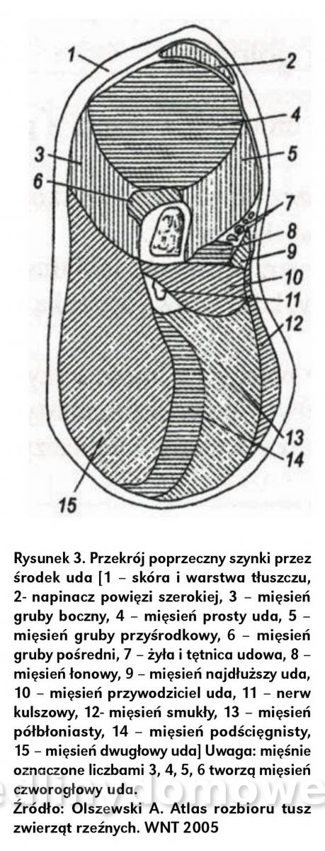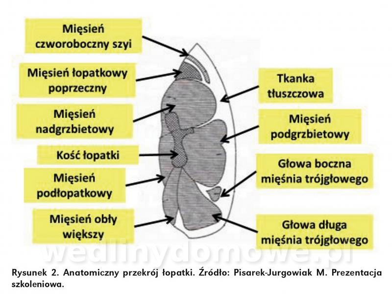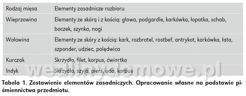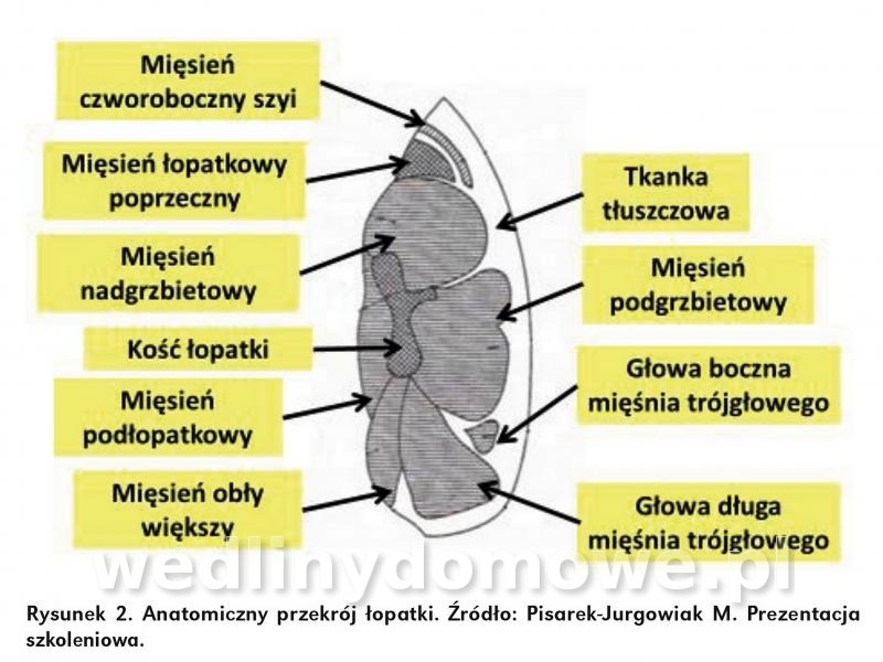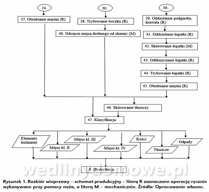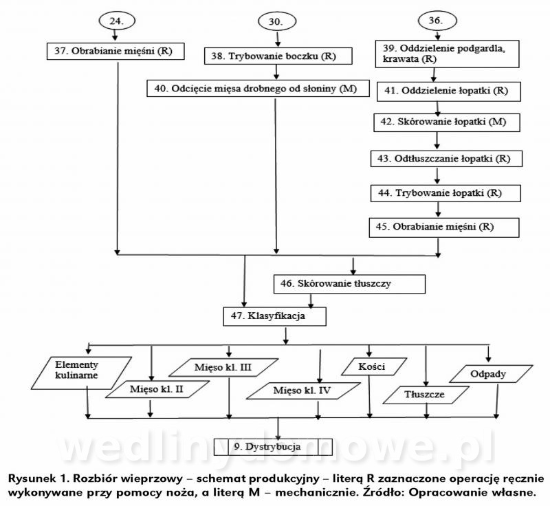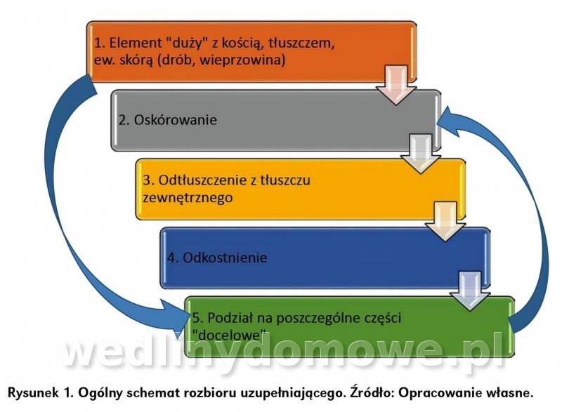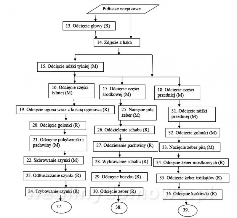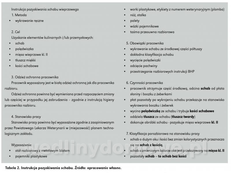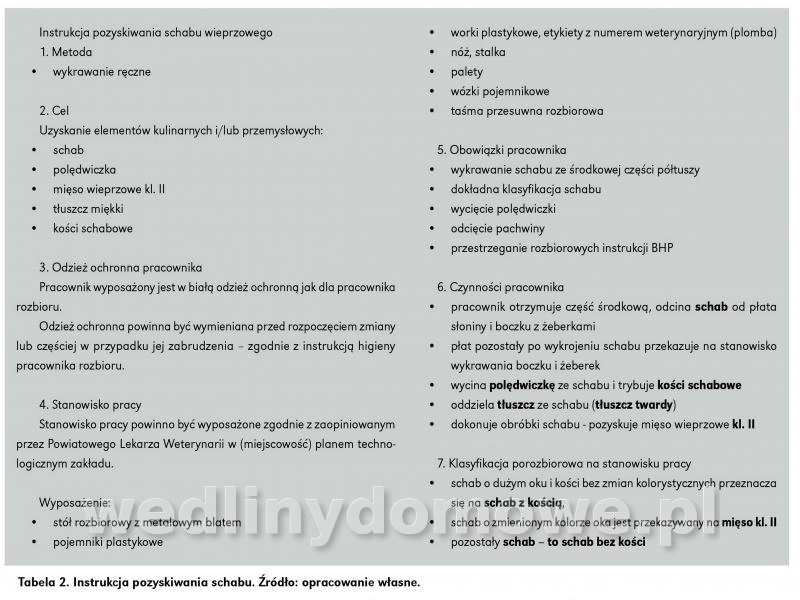 Procedury rozbiorowe - rozbiór zasadniczy Rozbiór zasadniczy dotyczy podziału tuszy zwierzęcia (w całości, w postaci półtusz czy ćwierćtuszy) na elementy zasadnicze, zazwyczaj zawierające kość i skórę. Można powiedzieć, że jest to podział „zgrubny” a uzyskanie kolejnych elementów lub elementów bez kości i skóry uzyskuje się w rozbiorze uzupełniającym. Zestawienie elementów zasadniczych dla najczęściej spożywanych zwierząt w Polsce pokazano w tabeli. Sposób prowadzenia rozbioru zależy od zaprojektowania linii technologicznej i dostępności pracowników. W większości przypadków w zakładach rozbioru w Polsce rozbiór wieprzowiny i wołowiny odbywa się w sposób ręczny z wykorzystaniem narzędzi mechanicznych, rozbiór kurczaka w nowocześniejszych zakładach jest robiony automatycznie lub półautomatycznie (pracują maszyny, lub maszyny z towarzyszącą pracą ludzi). Możliwość zastosowania rozbioru mechanicznego zależy od wystandaryzowania tusz do rozbioru oraz zaawansowania technologicznego linii. Rozbiór wieprzowy albo prowadzi się potokowo na jednym stole lub w celu zwiększenia wydajności równolegle na co najmniej trzech stołach lub ich wielokrotności, gdzie na kolejnych stołach dokonuje się rozbioru części przedniej, środkowej i tylnej półtuszy. Na rysunku 1 pokazano schemat rozbioru wieprzowego. Rozbiór wołowy niewielki prowadzi się na stołach rozbiorowych dedykowanych przednim lub tylnym częściom tuszy lub potokowo na jednym. Tylko duże zakłady mają wyspecjalizowane linie do rozbioru wołowiny. Rozbiór kurczaka może być wykonywany automatycznie lub półautomatycznie. Maszynowy rozbiór zakłada najpierw – zazwyczaj ręczne osadzanie tuszki na tubach, a następnie linia przesuwa się i piły odcinają poszczególne elementy tuszy. Rozbiór półautomatyczny – cześć działań wykonują pracownicy. W małych zakładach rozbioru wszystkie operacje wykonywane są ręcznie. Procedura rozbiorowa oprócz opisania czynności niezbędnych do uzyskania kolejnych elementów zawiera też odniesienie do opisu tych elementów – czyli specyfikacji wyrobów gotowych. Specyfikacje pokazują i opisują jak powinien wyglądać dany element i w jaki sposób należy go uzyskać. Załącznikami do procedury realizacji wyrobu też często są instrukcje stanowiskowe. Przykładową instrukcję stanowiskową pokazano w tabeli 2. W procedurze rozbiorowej powinno znaleźć się też odniesienie do wymagań higienicznych pod względem higieny pracy, higieny pracowników, zalecanych zachowań higienicznych pracowników, nadzoru nad zanieczyszczeniami – w tym metalicznymi, alergenami (szczególnie, jeśli w tym samym zakładzie jest też przetwórstwo). Procedury rozbiorowe - rozbiór uzupełniający Rozbiór uzupełniający polega na wyodrębnieniu poszczególnych partii mięśni z elementów zasadniczych, z odkostnieniem oraz oskórowaniem. W zależności od umaszynowienia i ustawienia linii rozbiorowej często w dużych zakładach nie wyodrębnia się rozbioru uzupełniającego jako oddzielnego procesu. Odpowiednia długość linii produkcyjnej oraz ilość pracowników, a także pożądane specyfikacje wyrobów gotowych są decydujące o zastosowaniu rozbioru uzupełniającego w czasie „zwykłego” rozbioru lub jako oddzielny proces. Zdarza się też, że przy braku zamówień na specyficzne elementy zostawia się w czasie rozbioru podstawowego elementy zasadnicze w całości, a potem w zależności od zamówień sprzedażowych i zapotrzebowania na mięsa produkcyjne dokonuje się podziału elementów zasadniczych na poszczególne składowe. Rozbiór uzupełniający dotyczy właściwie każdego rodzaju pozyskiwanego mięsa. Ogólny schemat rozbioru uzupełniającego pokazano na rysunku 1. Przy rozbiorze drobiu kolejność może być jak zaznaczono strzałkami – np. przy rozbiorze ćwiartki, którą najpierw dzieli się na nogę i fragment korpusu, potem nogę można podzielić na udo i podudzie, a element skórowania i odkostniania nie zawsze jest stosowany. Zazwyczaj odkostniania w przypadku drobiu występuje w celu pozyskania mięsa z uda lub mięsa gulaszowego. Rozbiór uzupełniający dla mięsa wieprzowego dotyczy takich elementów zasadniczych jak głowa, karkówka, schab, polędwiczka (która uzyskiwana jest przy obrabianiu schabu), szynka, łopatka, boczek, podgardle, pachwina, słonina. Celem jest pozyskanie elementów o określonej charakterystyce opisanej w specyfikacjach, zazwyczaj z wyraźnym podziałem na mięśnie i tłuszcz. Przy rozbiorze uzupełniającym produktem dodatkowo uzyskiwanym są wszelkiego rodzaju mięsa drobne o różnej zawartości mięsa, tłuszczu i tkanki łącznej. Zazwyczaj klasyfikuje się je jako IIa i IIb, gdzie IIa to mięsa drobne o większej zawartości mięsa niż tłuszczu, IIb – więcej tłuszczu niż mięsa. Mięso kl. III to mięso głównie z golonek zawierające duże ilości tkanki łącznej nie występującej w innych partiach mięśni. Ze względu na zawartość tkanki łącznej mięso to charakteryzuje się bardzo dobą wodochłonnością jest cenionym surowcem wędliniarskim do farszu kiełbas. Inny podział mięs drobnych odnosi się do zawartości procentowej mięsa i tłuszczu. Występują w związku z tym II 80/20, 70/30, 64/40, 50/50, 40/60, 30/70, 20/80, gdzie pierwsza liczba oznacza zawartość, mięsa, a druga tłuszczu. W dobie powszechności analizatorów składu np. urządzeń typu FOSS czy MeatMaster ilości te są łatwe do obliczenia i sprawdzenia, a przez to zminimalizowana jest ilość reklamacji co do składu dostarczonych surowców. Rozbiór uzupełniający łopatki wieprzowej Rozbiór łopatki prowadzi do uzyskania elementów „ekstra” z przeznaczeniem kulinarnym lub do produkcji wędlin. W wyniku rozbioru uzupełniającego uzyskać można łopatkę bez kości (jednocześnie bez skóry, o różnym stopniu odtłuszczenia, lub bez tłuszczu) lub 