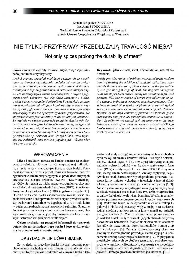 Przyprawy i mieszanki przypraw stosowane w przetwórstwie mięsnym Z przyzwyczajenia doprawiamy mięso solą i pieprzem, a przecież przypraw mamy znacznie więcej. Zioła podkreślają smak, wydobywają aromat i czynią potrawę niepowtarzalną. Dlatego warto z nimi eksperymentować, choć przyda się również podstawowa wiedza na temat poprawiania smaku mięs. Stosowanie przypraw jest nieodłącznym elementem produkcji żywności pochodzenia zwierzęcego od wielu lat. Niektóre przyprawy stosuje się „sezonowo”, ponieważ ich aromat nieodłącznie kojarzy się np. ze świętem. W przetwórstwie mięsa poza pieprzem i solą rozpowszechniono jeszcze przyprawy takie jak: imbir, ziele angielskie, goździki czy gałka muszkatołowa. By potrawa zachęcała do spożycia swoim zapachem, wyglądem i smakiem należy dobrać odpowiednią kompozycję przypraw, co niekiedy jest nie lada wyzwaniem. Bez podstawowej wiedzy o właściwościach i łączeniu przypraw, trudno byłoby przygotować wyroby mięsne o pożądanym profilu smakowym, zapachowym i odpowiedniej estetyce. Niektóre przyprawy są dość intensywne, dlatego też należy pamiętać, by dodawać je z umiarem. Substancje smakowo - zapachowe, do których zalicza się między innymi przyprawy, są niezbędnymi składnikami podczas produkcji wyrobów mięsnych. Celem ich stosowania jest przede wszystkim: • nadanie określonych właściwości smakowo zapachowych, • nadanie lub zmodyfikowanie już istniejącej smakowitości, • odtworzenie konkretnego profilu smakowego utraconego podczas procesu przetwórczego, • maskowanie niepożądanych lub mniej pożądanych właściwości smakowo- zapachowych, • stworzenie innowacyjnego smaku. Przyprawy ziołowe są znane i stosowane przez ludzi od bardzo dawna. Urozmaicają pożywienie, poprawiają jego strawność, a także działają konserwująco. Uważa się, że zioła są duszą i chwałą kucharzy. Przyprawy ziołowe, na przykład liście świeżych ziół używano najczęściej do konserwowania szybko psującej się żywności (mięso zawijane było w liście wrotyczu lub chrzanu). Zawarte w liściach odpowiednie substancje chroniły przed działaniem bakterii gnilnych, przy czym sprawiały również, że mięso stawało się kruche i nabierało odpowiedniego aromatu. Istnieje wiele ziół, które dodaje się do potraw, ponieważ odpowiednio kształtują ich profil smakowo zapachowy, ale także ze względu na ich funkcję, jaką jest ułatwianie trawienia. Do ziół, które mogą ułatwiać trawienie należą: kminek, kolendra, koper, rozmaryn i anyż. Ciekawostką jest, że starożytni rzymianie chcąc zadbać o swoje zdrowie, kończyli posiłek ciasteczkami anyżowymi. Z kolei Hindusi po spożyciu dość obfitego posiłku zajadali się prażonymi ziarnami anyżku. Podział przypraw Nie do każdego rodzaju mięsa pasuje każda przyprawa, dlatego też należy odpowiednio dobrać kompozycję przypraw do zakupionego asortymentu. Przyprawy definiowane są jako naturalne produkty roślinne lub ich mieszanki używane do poprawiania smaku i aromatu potraw. Jako przyprawy stosuje się różne części roślin. Przyprawą mogą być nasiona, owoc, liść, ziela, kora, czy korzenie i kłącza. W tabeli 1 przedstawiono podział przypraw w zależności od części rośliny, z której pochodzą. Tabela 1. Podział przypraw ze względu na pochodzenie. Przeznaczenie niektórych przypraw i mieszanek w przemyśle mięsnym Celem dodawanych do mięs przypraw jest wykształcenie odpowiednich nut smakowo-zapachowych. Poszczególne przyprawy różnią się od siebie rodzajem i zawartością składników odpowiedzialnych za wywołanie wrażeń smakowo- zapachowych. Istnieją potrawy, do których stworzono dedykowane przyprawy lub mieszanki przypraw, które uwydatniają w nich wszystko to, co najlepsze. Na przykład potrawa, taka jak gulasz czy strogonoff nie może istnieć bez papryki ostrej i słodkiej, które poza nadaniem odpowiedniego smaku i aromatu, kształtują również barwę potrawy. W tabeli 2 przedstawiono niektóre przyprawy oraz ich najkorzystniejsze przeznaczenie. Najczęściej stosowane dodatki i przyprawy w przemyśle mięsnym to: pieprz, oregano, ziele angielskie, goździki, cynamon, wanilia, kolendra, pieprz czarny, czosnek, różne rodzaje cebuli i najbardziej znana przyprawa na świecie, czyli curry, w skład której wchodzą: kurkumy, kozieradki, kolendra, gałka muszkatołowa, pieprz czarny, chili, czosnek, kardamon, goździki, kmin rzymski, cynamon i imbir. Szerokie zastosowanie przy sporządzaniu potraw mają mieszanki przyprawowe. Dzięki odpowiednio dobranym składnikom posiadają one specyficzny smak, aromat i barwę. Na rynku dostępne są gotowe, specjalnie przygotowane mieszanki, ale można je również komponować samodzielnie, dobierając poszczególne przyprawy i zioła. Stosowanie mieszanek przyprawowych ma nie tylko wpływ na uzyskanie odpowiednich walorów sensorycznych dania, ale jest też korzystne ze względów zdrowotnych. Niektóre przyprawy mogą działać synergistycznie, tzn. dodatek jednych może zwiększać siłę przeciwutleniającą innych. Takie skumulowane działanie posiadają np. mieszanki: imbiru, cebuli i czosnku. Sam imbir hamuje utlenianie lipidów w mniejszym stopniu, niż imbir w połączeniu z cebulą, bądź czosnkiem. Obecnie wiadomo już, że przyprawy mogą mieć dodatkowe właściwości (przeciwutleniające i bakteriostatyczne), dzięki którym stają się częstym dodatkiem w wielu recepturach. Przyprawy jednoskładnikowe pozyskiwane z wybranych części roślin swój zapach zawdzięczają przede wszystkim olejkom eterycznym, a smak nadadzą im najczęściej zawarte w nich alkaloidy, glikozydy, garbniki oraz wiele innych substancji. Biorą one udział w przedłużeniu trwałości surowca mięsnego podczas przechowywania, obniżając rozwój niepożądanej mikroflory oraz powstrzymując zmiany oksydacyjne tłuszczy i białek zawartych w tk