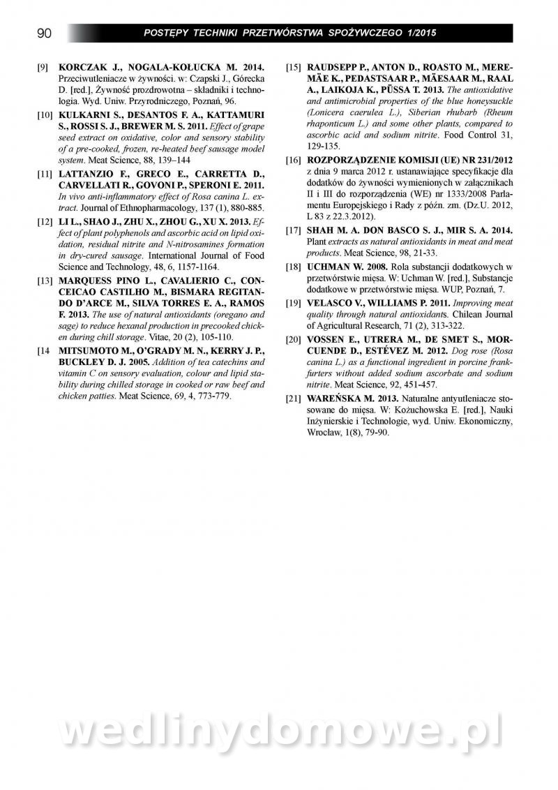Wędzenie jako jedna z metod utrwalania mięsa Wędzenie to tradycyjna i zarazem najstarsza metoda utrwalania żywności. Jednakże, już wiele lat wcześniej efekt utrwalający wędzenia zszedł na dalszy plan, by ustąpić miejsca innym metodom utrwalania żywności, np. podsuszanie, chłodzenie czy zamrażanie. Obecnie wędzenie zarówno tradycyjne, jak i wędzenie płynem dymu wędzarniczego służy przede wszystkim do uzyskania specyficznych, unikalnych i pożądanych nut smakowo – zapachowych wyrobu. Proces wędzenia należy do specyficznych rodzajów obróbki termicznej i służy przede wszystkim nadaniu typowego smaku i aromatu, a także odpowiedniego zabarwienia oraz utrwaleniu produktów mięsnych. Polega ono na umieszczaniu żywności w tzw. wędzarni i poddaniu produktu działaniu dymu i składników w nim zawartych. Utrwalanie dotyczy głównie powierzchni produktów mięsnych poprzez obsuszenie i stworzenie specyficznej skórki oraz oddziaływanie zawartych w dymie substancji o działaniu bakteriostatycznym. Działanie utrwalające dymu wędzarniczego opiera się na zawartości w nim głównie związków fenolowych o charakterze przeciwutleniającym i bakteriostatycznym. Jedną z termicznych metod obróbki produktów spożywczych, głównie mięsa, drobiu, ryb i ich przetworów jest wędzenie. Proces wędzenia może być przeprowadzany z wykorzystaniem dymu wędzarniczego lub z zastosowaniem preparatu dymu wędzarniczego. Tradycyjny proces wędzenia polega na poddaniu przetworów mięsnych działaniu dymu wytworzonego w wyniku termicznego rozkładu różnych gatunków drewna. Dym używany do wędzenia jest mieszaniną frakcji lotnej, w której znajdują się związki takie jak fenole, związki karbonylowe, kwasy organiczne, oraz frakcji nielotnej, na którą składają się smoła, żywice i sadza. Czas wędzenia zależy od rodzaju wędliny, konstrukcji wędzarni, warunków atmosferycznych panujących na zewnątrz wędzarni oraz upodobań konsumenta. W przemyśle mięsnym najczęściej stosuje się następujące metody wędzenia: • wędzenie owiewowe – polega na traktowaniu produktu dymem zimnym, ciepłym lub gorącym, • wędzenie elektrostatyczne, • wędzenie z zastosowaniem preparatów dymu. Proces wędzenia można podzielić również ze względu na zastosowaną temperaturę obróbki termicznej: • wędzenie zimne, • wędzenie gorące, a w tym: wędzenie dymem ciepłym oraz dymem gorącym, • wędzenie z równoczesnym pieczeniem. Tab.1. Wybrane parametry różnych metod wędzenia. Źródło: Opracowanie własne. W tabeli 1 przedstawiono parametry wymienionych metod wędzenia. Obróbka cieplna za pomocą świeżo wytworzonego dymu skutkuje wprowadzeniem do produktu wielu substancji o korzystnym oddziaływaniu, np. przeciwdrobnoustrojowym, przeciwutleniającym, smakowym oraz barwiącym. Przykładem związku o właściwościach przeciwdrobnoustrojowych i przeciwutleniających są fenole. Głównym celem wędzenia jest wykształcenie pożądanych cech sensorycznych produktu, takich jak smak czy barwa. Ogólnie rzecz ujmując wędzenie działa: • smakotwórczo i aromatyzująco - wytworzenie charakterystycznego i cenionego przez konsumentów zapachu i smaku, w wyniku spalania drewna (np. bukowego, olchowego czy wiśniowego). Za smak i zapach odpowiedzialne są takie związki, jak fenole czy związki karbonylowe, • konserwująco - Inaktywacja lub eliminacja drobnoustrojów będących w produkcie mięsnym, dzięki obecności fenoli, kwasu karbonylowego i aldehydu mrówkowego, • barwotwórczo – dzięki obecności w dymie substancji barwiących (sadza, smoła), jak również poprzez zachodzące reakcje chemiczne między dymem, a białkiem mięsa (szczególnie związków karbonylowych z grupami NH2 i tworzenie melaninoidyn), • utwardzająco na białka poprzez denaturację białek mięśniowych (w przypadku wędzenia na gorąco) – sieciowanie molekuł białek przez aldehydy, a głównie przez formaldehydy, • osuszająco - osuszenie powierzchni wędzonego produktu w celu wytworzenia charakterystycznej skórki oraz zwiększenia jego trwałości. Zmiany zachodzące podczas wędzenia Wędzenie jako jedna z form termicznej obróbki produktu niesie za sobą powstawanie pożądanych, jak i niepożądanych zmian przetwarzanego produktu: • zmianie ulega zawartość wody i tłuszczu w produkcie. większy ubytek wody i tłuszczu następuje, gdy wędzenie jest dłuższe, zastosowana zostaje większa temperatura procesu czy też szybsze krążenie powietrza, • zmiany zapachu, smaku, barwy i konsystencji, • obecność formaldehydu wpływa na stwardnienie tkanki łącznej mięsa oraz osłonek, zwiększając ich odporność na rozerwanie, • kwas mrówkowy zwiększa kwasowość mięsa, tym samym hamując rozwój drobnoustrojów oraz procesy autolizy, • koagulacja białek, co powoduje kurczenie się mięsa i uzyskanie charakterystycznej konsystencji. Preparaty dymu wędzarniczego Preparaty dymu wędzarniczego to alternatywa dla tradycyjnego wędzenia dymem powstałym na skutek spalania. Metoda wytwarzania preparatów dymu wędzarniczego polega na skropleniu (absorpcja w wodzie lub oleju roślinnym) składników dymu wędzarniczego i usunięciu z otrzymanego kondensatu wielopierścieniowych węglowodorów aromatycznych (WWA), potencjalnie rakotwórczych oraz innych niepożądanych związków chemicznych. Stosując preparaty dymu wędzarniczego, ogranicza się możliwość dodatkowego tworzenia N-nitrozoamin w wędzonych produktach, poprzez eliminację tlenków azotu, które mogą się tworzyć podczas termicznego rozkładu drewna. Preparaty te stosuje się zazwyczaj w mieszankach z solą kuchenną. W Polsce produkowana jest sól wędzonkowa o zawartości 1 % koncentratu dymu wędzarniczego. Sól ta ma działanie aromatyzujące oraz antyoksydacyjne. Nadaje produktom smak wędzonek oraz zapobiega procesom autooksydacji tłuszczu obecnego w produkcie mięsnym. Zazwyc