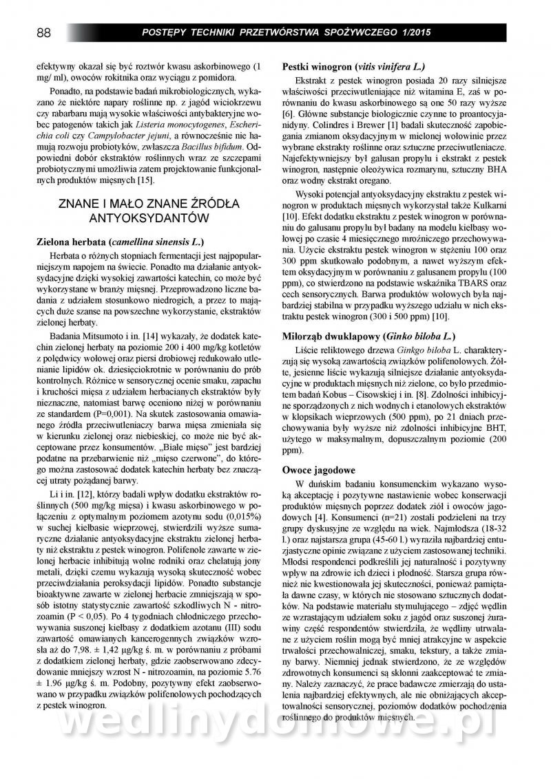 Wędzenie jako jedna z metod utrwalania mięsa Wędzenie to tradycyjna i zarazem najstarsza metoda utrwalania żywności. Jednakże, już wiele lat wcześniej efekt utrwalający wędzenia zszedł na dalszy plan, by ustąpić miejsca innym metodom utrwalania żywności, np. podsuszanie, chłodzenie czy zamrażanie. Obecnie wędzenie zarówno tradycyjne, jak i wędzenie płynem dymu wędzarniczego służy przede wszystkim do uzyskania specyficznych, unikalnych i pożądanych nut smakowo – zapachowych wyrobu. Proces wędzenia należy do specyficznych rodzajów obróbki termicznej i służy przede wszystkim nadaniu typowego smaku i aromatu, a także odpowiedniego zabarwienia oraz utrwaleniu produktów mięsnych. Polega ono na umieszczaniu żywności w tzw. wędzarni i poddaniu produktu działaniu dymu i składników w nim zawartych. Utrwalanie dotyczy głównie powierzchni produktów mięsnych poprzez obsuszenie i stworzenie specyficznej skórki oraz oddziaływanie zawartych w dymie substancji o działaniu bakteriostatycznym. Działanie utrwalające dymu wędzarniczego opiera się na zawartości w nim głównie związków fenolowych o charakterze przeciwutleniającym i bakteriostatycznym. Jedną z termicznych metod obróbki produktów spożywczych, głównie mięsa, drobiu, ryb i ich przetworów jest wędzenie. Proces wędzenia może być przeprowadzany z wykorzystaniem dymu wędzarniczego lub z zastosowaniem preparatu dymu wędzarniczego. Tradycyjny proces wędzenia polega na poddaniu przetworów mięsnych działaniu dymu wytworzonego w wyniku termicznego rozkładu różnych gatunków drewna. Dym używany do wędzenia jest mieszaniną frakcji lotnej, w której znajdują się związki takie jak fenole, związki karbonylowe, kwasy organiczne, oraz frakcji nielotnej, na którą składają się smoła, żywice i sadza. Czas wędzenia zależy od rodzaju wędliny, konstrukcji wędzarni, warunków atmosferycznych panujących na zewnątrz wędzarni oraz upodobań konsumenta. W przemyśle mięsnym najczęściej stosuje się następujące metody wędzenia: • wędzenie owiewowe – polega na traktowaniu produktu dymem zimnym, ciepłym lub gorącym, • wędzenie elektrostatyczne, • wędzenie z zastosowaniem preparatów dymu. Proces wędzenia można podzielić również ze względu na zastosowaną temperaturę obróbki termicznej: • wędzenie zimne, • wędzenie gorące, a w tym: wędzenie dymem ciepłym oraz dymem gorącym, • wędzenie z równoczesnym pieczeniem. W tabeli 1 przedstawiono parametry wymienionych metod wędzenia. Obróbka cieplna za pomocą świeżo wytworzonego dymu skutkuje wprowadzeniem do produktu wielu substancji o korzystnym oddziaływaniu, np. przeciwdrobnoustrojowym, przeciwutleniającym, smakowym oraz barwiącym. Przykładem związku o właściwościach przeciwdrobnoustrojowych i przeciwutleniających są fenole. Głównym celem wędzenia jest wykształcenie pożądanych cech sensorycznych produktu, takich jak smak czy barwa. Ogólnie rzecz ujmując wędzenie działa: • smakotwórczo i aromatyzująco - wytworzenie charakterystycznego i cenionego przez konsumentów zapachu i smaku, w wyniku spalania drewna (np. bukowego, olchowego czy wiśniowego). Za smak i zapach odpowiedzialne są takie związki, jak fenole czy związki karbonylowe, • konserwująco - Inaktywacja lub eliminacja drobnoustrojów będących w produkcie mięsnym, dzięki obecności fenoli, kwasu karbonylowego i aldehydu mrówkowego, • barwotwórczo – dzięki obecności w dymie substancji barwiących (sadza, smoła), jak również poprzez zachodzące reakcje chemiczne między dymem, a białkiem mięsa (szczególnie związków karbonylowych z grupami NH2 i tworzenie melaninoidyn), • utwardzająco na białka poprzez denaturację białek mięśniowych (w przypadku wędzenia na gorąco) – sieciowanie molekuł białek przez aldehydy, a głównie przez formaldehydy, • osuszająco - osuszenie powierzchni wędzonego produktu w celu wytworzenia charakterystycznej skórki oraz zwiększenia jego trwałości. Zmiany zachodzące podczas wędzenia Wędzenie jako jedna z form termicznej obróbki produktu niesie za sobą powstawanie pożądanych, jak i niepożądanych zmian przetwarzanego produktu: • zmianie ulega zawartość wody i tłuszczu w produkcie. większy ubytek wody i tłuszczu następuje, gdy wędzenie jest dłuższe, zastosowana zostaje większa temperatura procesu czy też szybsze krążenie powietrza, • zmiany zapachu, smaku, bar wy i konsystencji, • obecność formaldehydu wpływa na stwardnienie tkanki łącznej mięsa oraz osłonek, zwiększając ich odporność na rozerwanie, • kwas mrówkowy zwiększa kwasowość mięsa, tym samym hamując rozwój drobnoustrojów oraz procesy autolizy, • koagulacja białek, co powoduje kurczenie się mięsa i uzyskanie charakterystycznej konsystencji. Preparaty dymu wędzarniczego Preparaty dymu wędzarniczego to alternatywa dla tradycyjnego wędzenia dymem powstałym na skutek spalania. Metoda wytwarzania preparatów dymu wędzarniczego polega na skropleniu (absorpcja w wodzie lub oleju roślinnym) składników dymu wędzarniczego i usunięciu z otrzymanego kondensatu wielopierścieniowych węglowodorów aromatycznych (WWA), potencjalnie rakotwórczych oraz innych niepożądanych związków chemicznych. Stosując preparaty dymu wędzarniczego, ogranicza się możliwość dodatkowego tworzenia N-nitrozoamin w wędzonych produktach, poprzez eliminację tlenków azotu, które mogą się tworzyć podczas termicznego rozkładu drewna. Preparaty te stosuje się zazwyczaj w mieszankach z solą kuchenną. W Polsce produkowana jest sól wędzonkowa o zawartości 1 % koncentratu dymu wędzarniczego. Sól ta ma działanie aromatyzujące oraz antyoksydacyjne. Nadaje produktom smak wędzonek oraz zapobiega procesom autooksydacji tłuszczu obecnego w produkcie mięsnym. Zazwyczaj dodatek soli wędzonkowej w produktach zawiera się w przedziale od 15 do 25 mg