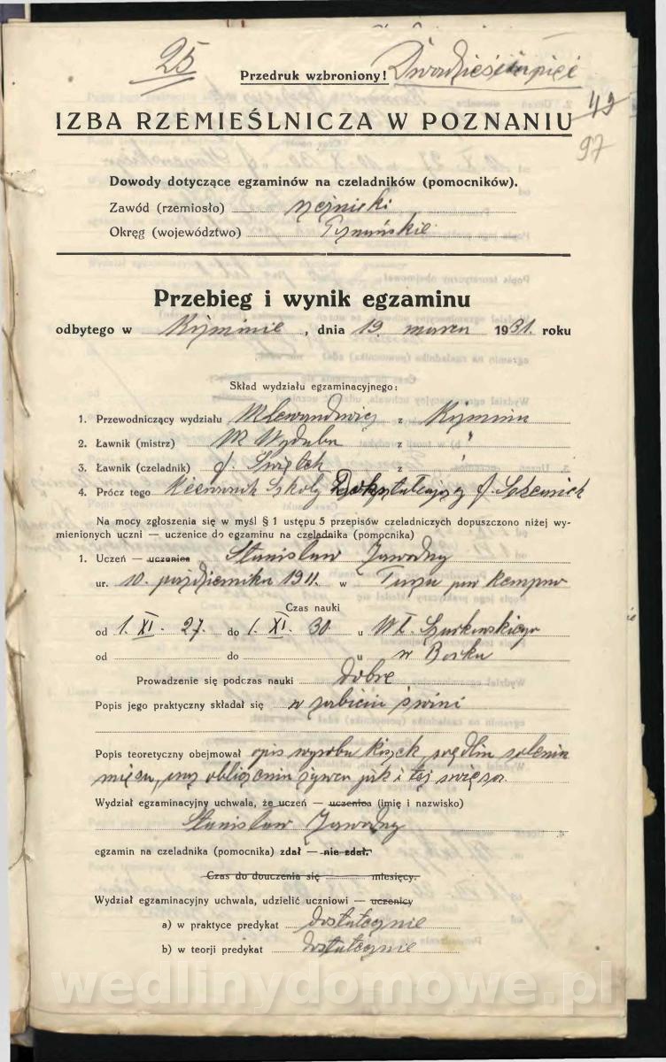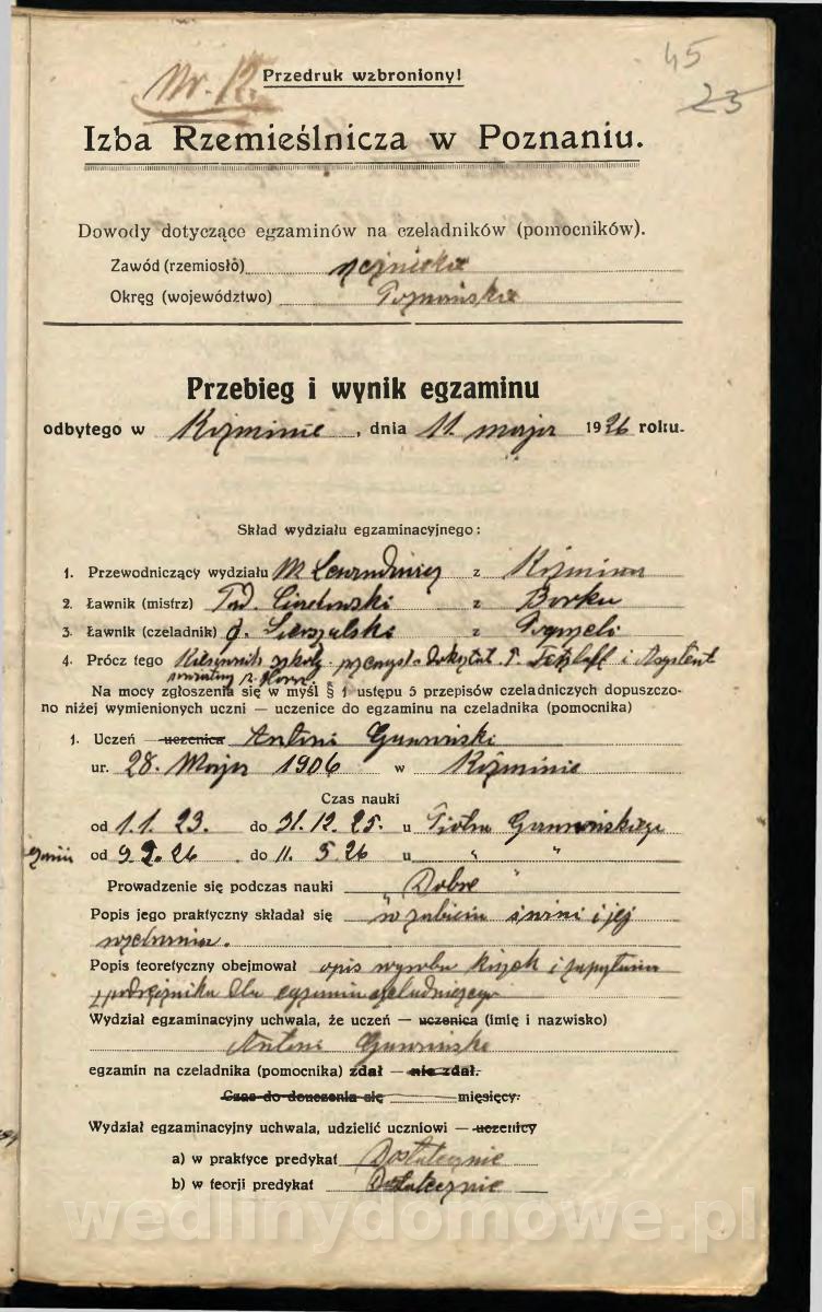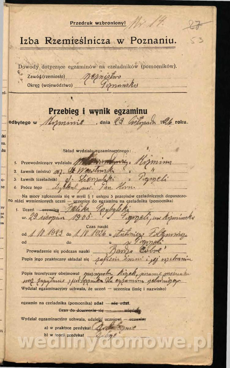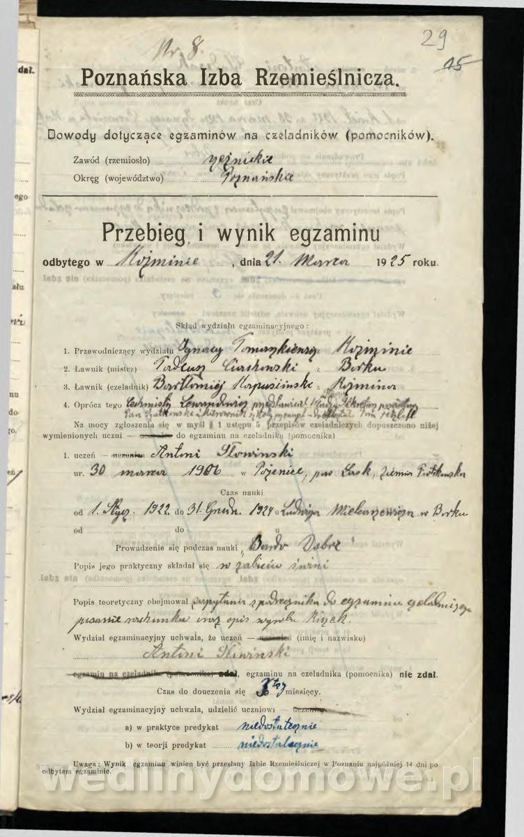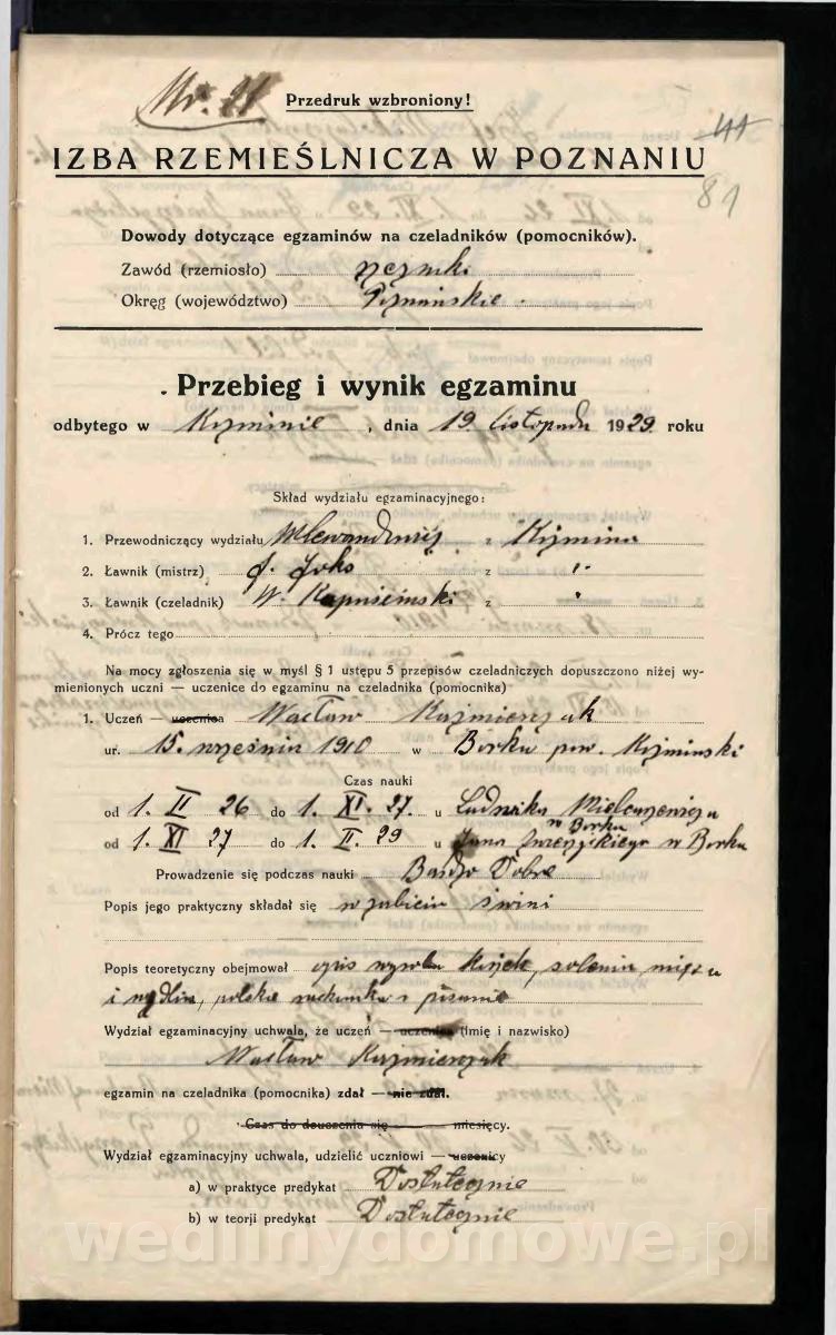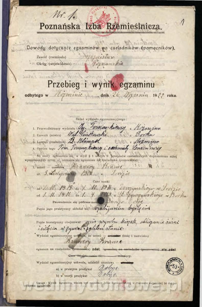 Przedstawiam bardzo unikalny materiał. Jest to zbiór protokółów egzaminacyjnych Poznańskiej Izby Rzemieślniczej z lat dwudziestych ubiegłego wieku. Materiały poddałem jedynie niewielkim zabiegom technicznym, aby nie umniejszać ich oryginalności. Bardzo ciekawe dokumenty - polecam.