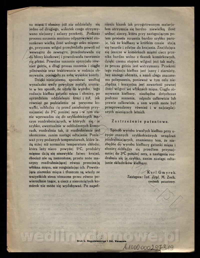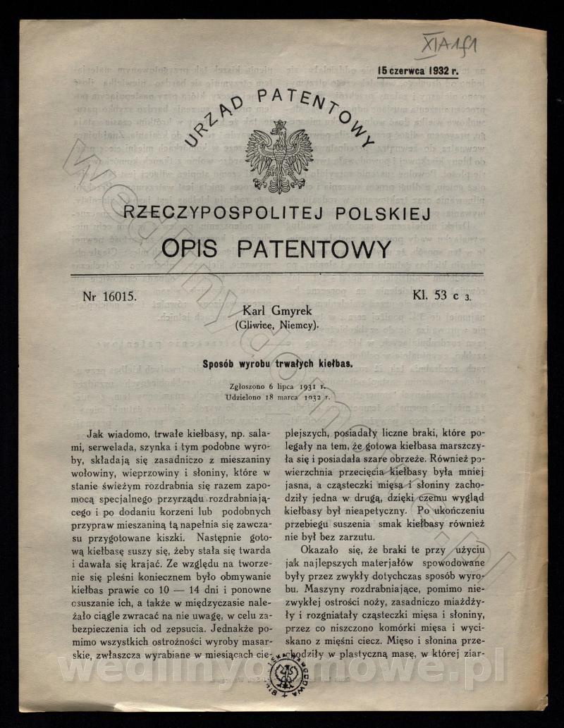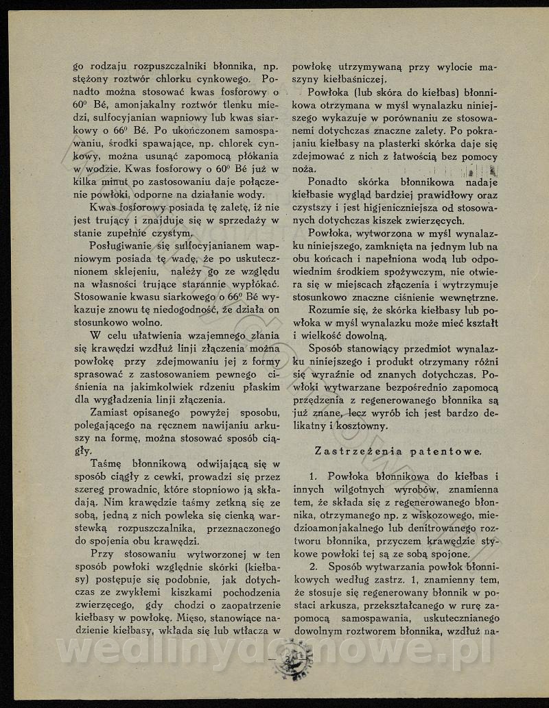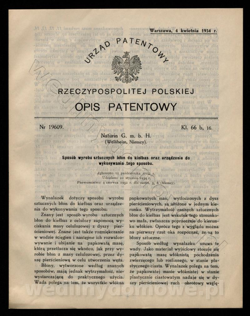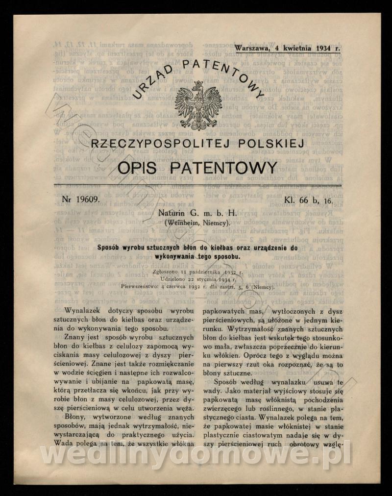 2. Patent nr 1 z dnia 04 kwietnia 1934 r.: Sposób wyrobu sztucznych błon do kiełbas oraz urządzenie do wykonywania tego sposobu. Patent nr 2 z dnia 15 czerwca 1932 r.: Sposób wyrobu trwałych kiełbas. Patent nr 3 z dnia 05 grudnia 1929 r.: Powłoka błonnikowa do kiełbas i innych wyrobów wilgotnych