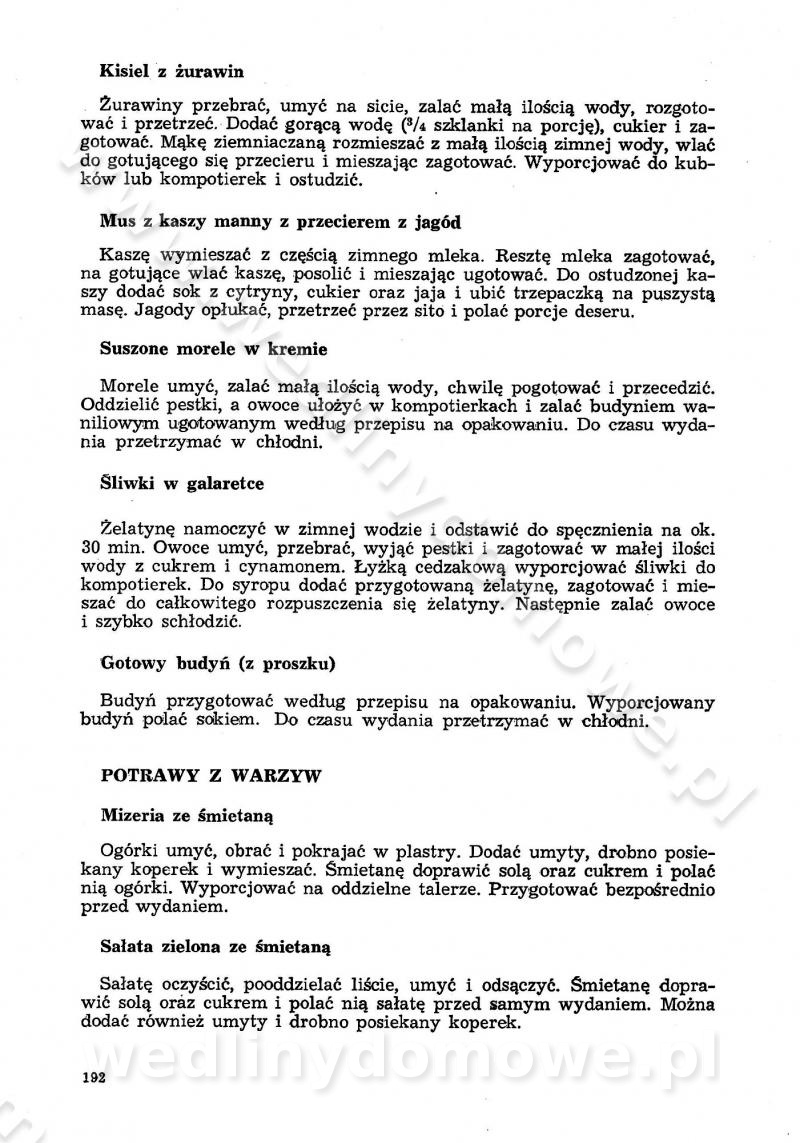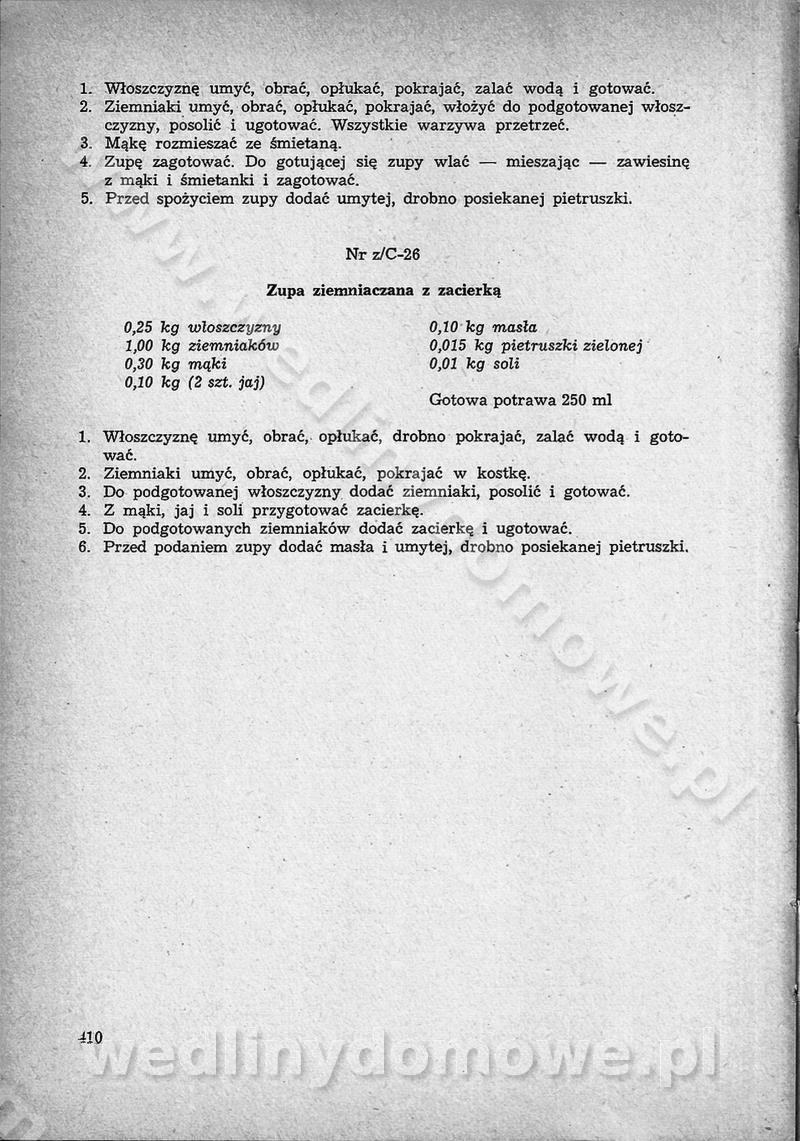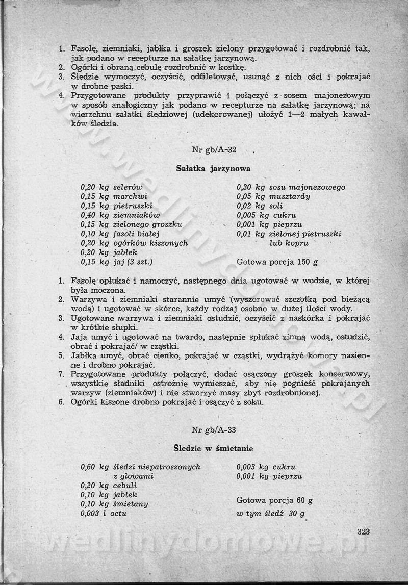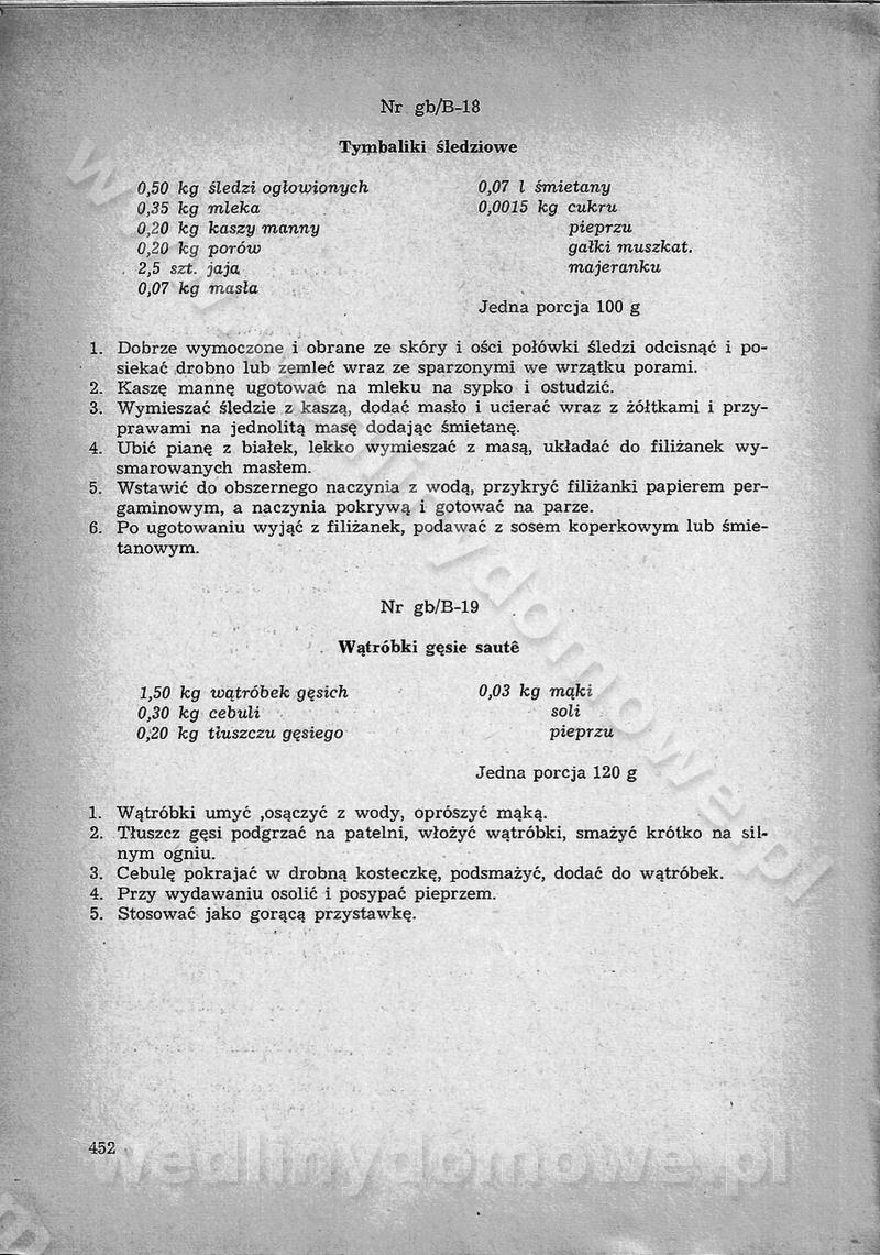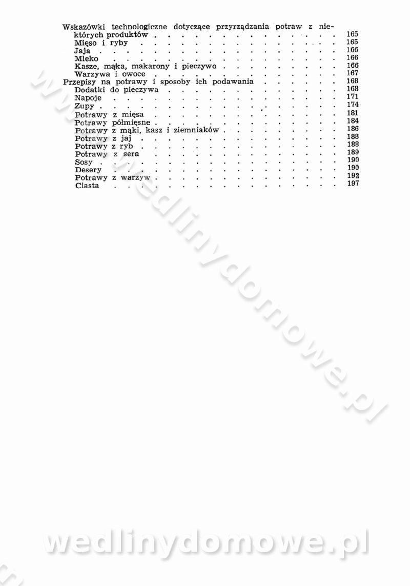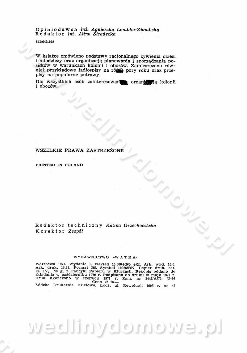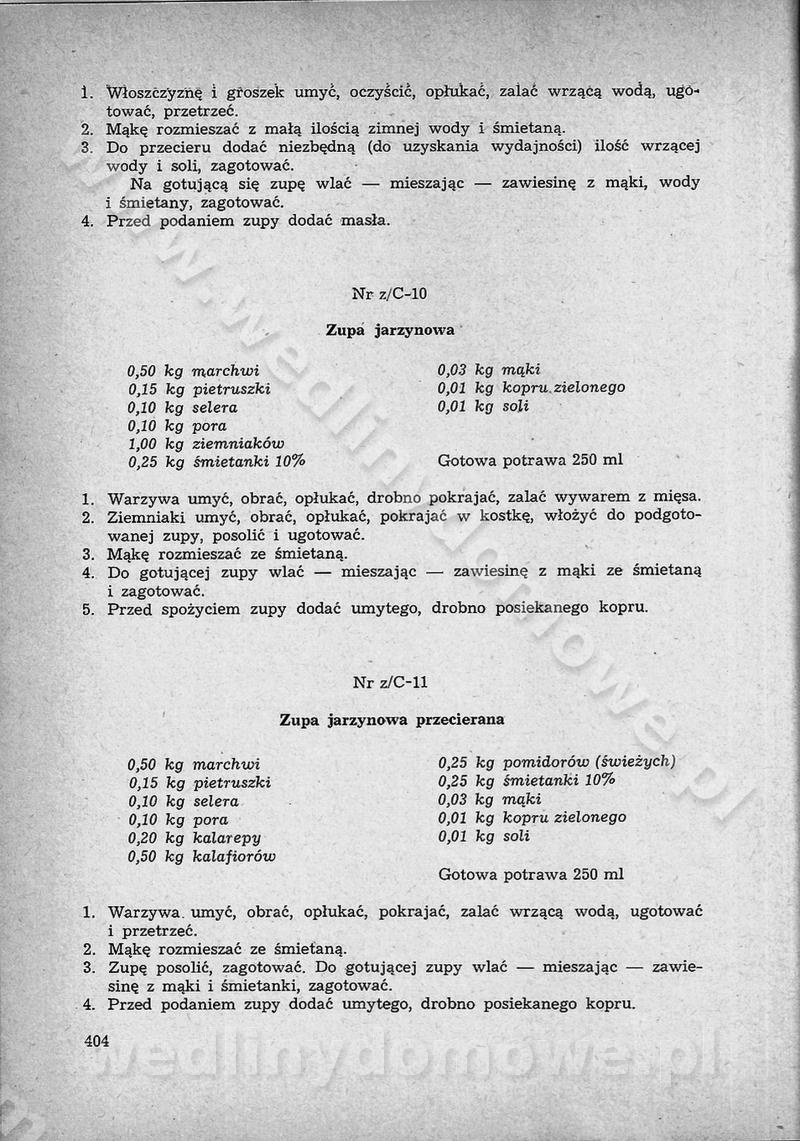 SPIS TREŚCI CZĘŚĆ I TEORETYCZNE PODSTAWY RACJONALNEGO ŻYWIENIA ZBIOROWEGO inż. Krystyna Wolf I. WSKAZÓWKI DO REALIZACJI NORM ŻYWIENIA WYRAŻONYCH W CAŁODZIENNYCH RACJACH POKARMOWYCH II. SKŁADNIKI POKARMOWE I ICH ROLA W ŻYWIENIU Zawartość składników pokarmowych w produktach Rola pożywienia Składniki pokarmowe Wzajemne zależności między składnikami pokarmowymi III. NORMY WYŻYWIENIA Normy zapotrzebowania na składniki pokarmowe Podział produktów Podział produktów na 2 grupy Podział produktów na 9 grup Podział produktów na 12 grup Całodzienne racje pokarmowe Zamiana produktów IV. WYTYCZNE PLANOWANIA ZESTAWU CAŁODZIENNYCH POSIŁKÓW Zasady podziału całodziennych racji pokarmowych na poszczególne posiłki Śniadanie Obiad Kolacja Wytyczne układania jadłospisów Kontrola prawidłowości planowania jadłospisów V. PROCESY TECHNOLOGICZNE, ICH CEL, PRZEBIEG I WPŁYW NA WARTOŚĆ ODŻYWCZĄ POTRAW Cel procesu technologicznego Obróbka wstępna i termiczna Ogólne wskazówki technologiczne Wykończanie potraw VI. WSKAZÓWKI PRAKTYCZNE DOTYCZĄCE KORZYSTANIA Z RECEPTUR CZĘŚĆ II RECEPTURY I. ZUPY inż. Jadwiga Celczyńska Podstawowe zasady sporządzania Sporządzanie wywarów Podział zup Przygotowanie głównych składników zup Wykończanie zup Rodzaje zup Zupy czyste Zupy zabielane Zupy zasmażane Zupy rozklejane Zupy mleczne Zupy owocowe Zupy z wkładką pełnowartościowego białka — samodzielne dania obiadowe lub kolacyjne Zupy czyste (normatyw surowcowy na 10 porcji) Zakwas burakowy na barszcz Zakwas na żur Barszcz burakowy czysty Barszcz czerwony czysty z zagęszczonego soku buraczanego Barszcz burakowy jarski Bulion jarski Rosół z wołowiny Zupa grzybowa czysta Zupa pomidorowa czysta Zupy rozklejane (normatyw surowcowy na 10 porcji) Krupnik na podrobach Krupnik zabielany Krupnik ze słoniną Krupnik z ryżu z jarzynami Zupa grochowa z pęczakiem Zupa grochowa z ziemniakami Zupa rumfordzka Zupa ziemniaczana z fasolą Zalewajka Zalewajka z kwaśnym mlekiem Żur z kiełbasą i boczkiem Żur na podrobach zabielany Zupy zasmażane (normatyw surowcowy na 10 porcji) Kapuśniak z kwaszonej kapusty z papryką Kapuśniak mazurski z kwaszonej kapusty Kapuśniak ze słodkiej kapusty Kapuśniak ze słodkiej kapusty z jabłkami Kapuśniak z czerwonej kapusty Zacierka z ziemniakami Zupa cebulowa Zupa z dyni i pomidorów Zupa fasolowa z makaronem Zupa fasolowa z ziemniakami Zupa z flaków wołowych Zupa „garbure” Zupa grzybowa Zupa jarzynowa z papryką Zupa jarzynowa z fasolą Zupa jarzynowa (jesienna) Zupa jarzynowa z makaronem i serem Zupa z kaszy manny zasmażana Zupa neapolitańska Zupa pomidorowa zasmażana Zupa z porów Zupa z selerów Zupa ziemniaczana zasmażana Zupa ziemniaczana z pomidorami Zupy mleczne (normatyw surowcowy na 10 porcji) Kukurydzanka na mleku Manna na mleku Ryż na mleku Makaron na mleku Płatki owsiane na mleku Zupa z dyni na mleku z tartym ciastem Zupa „nic” Zupa mleczna z lanym ciastem Zupa ze zsiadłego mleka Zupy zabielane (normatyw surowcowy na 10 porcji) Barszcz czerwony zabielany Barszcz czerwony zabielany z suszu Barszcz ukraiński Barszcz czeski Barszcz z botwiną Barszcz jarski z botwiną Chłodnik z botwiną Chłodnik z botwiną na mleku Kapuśniak ze słodkiej kapusty zabielany Kapuśniak na głowiźnie Zupa z brukselki zabielana Zupa cytrynowa Zupa z fasolki szparagowej Zupa grzybowa zabielana Zupa kalafiorowa Zupa koperkowa Zupa ogórkowa Zupa pomidorowa Zupa rybna Zupa szczawiowa Zupa pieczarkowa Zupa ze szpinaku Zupa z młodych jarzyn zabielana Zupa jarzynowa zabielana z mrożonek Zupa ziemniaczana „Paysanne” Pejzanka z puree ziemniaczanym Zupa z młodych ziemniaków Zupa ziemniaczana z porami Zupa z zielonego groszku Zupy owocowe (normatyw surowcowy na 10 porcji) Chłodnik z czarnych jagód Chłodnik truskawkowy Zupa z czarnych jagód Zupa jabłkowa Zupa jabłkowa zabielana Zupa z jabłek i śliwek Zupa ze śliwek Zupa z owoców mieszanych Zupa owocowa z suszu jabłkowego i marmolady Zupa owocowa czysta Zupa z powideł śliwkowych Zupa rabarbarowa Zupa z suszonych śliwek Zupa truskawkowa Zupa z truskawek i rabarbaru Zupy z wkładką mięsną (normatyw surowcowy na 10 porcji) Barszcz małorosyjski na rosole z mięsem Barszcz z ziemniakami i serdelkami Grochówka z mięsem i ziemniakami Kapuśniak z kwaszonej kapusty z kiełbasą Kapuśniak ze słodkiej kapusty z pomidorami i mięsem Krupnik z ryżu na mięsie Krupnik na mięsie Pejzanka na żeberkach Zupa z fasolki szparagowej na mięsie Zupa fasolowa z mięsem i makaronem Zupa jarzynowa z mięsem Gulaszowa polewka Zupa koperkowa na mięsie Zupa ogórkowa z ziemniakami na mięsie Zupa pomidorowa z makaronem i mięsem Zupa z porów z ziemniakami i wątróbką Zupa wiosenna z jajami Zupa ziemniaczana z mięsem Żur z kiełbasą i ziemniakami II. POTRAWY MIĘSNE inż. Krystyna Wolf Podstawowe zasady sporządzania Zachowanie wartości odżywczej dań mięsnych Cechy prawidłowo przyrządzonego mięsa Przechowywanie Rozmrażanie mięsa Rozbiór tuszy zwierząt rzeźnych Obróbka wstępna Obróbka termiczna Potrawy z baraniny (normatyw surowcowy na 10 porcji) Potrawka z baraniny Kotlet barani mielony Kotlet barani mielony z ryżem Baranina w warzywach Ragout baranie Baranina duszona Potrawy z cielęciny (normatyw surowcowy na 10 porcji) Potrawka cielęca Pulpety cielęce Kotlet cielęcy mielony Klopsiki cielęce do sosów Sznycel cielęcy (mielony) Filet cielęcy (do sosów i dodatków) Zrazy cielęce bite (do sosów) Zrazy cielęce nadziewane słoniną Sznycel cielęcy Zrazy cielęce po polsku (faszerowane) Paprykarz cielęcy Pieczeń cielęca duszona Pieczeń cielęca Mostek cielęcy po wiedeńsku Mostek cielęcy faszerowany Rolada cielęca faszerowana Potrawy z wieprzowiny (normatyw surowcowy na 10 porcji) Mięso wieprzowe gotowane Peklówka wieprzowa gotowana Filet wieprzowy saute Kotlet wieprzowy mielony Zraz wieprzowy (klopsik) mielony do sosów Kotlet miel
