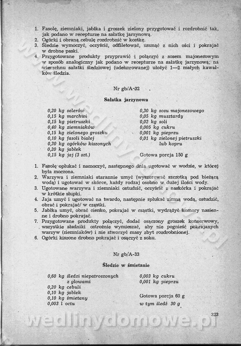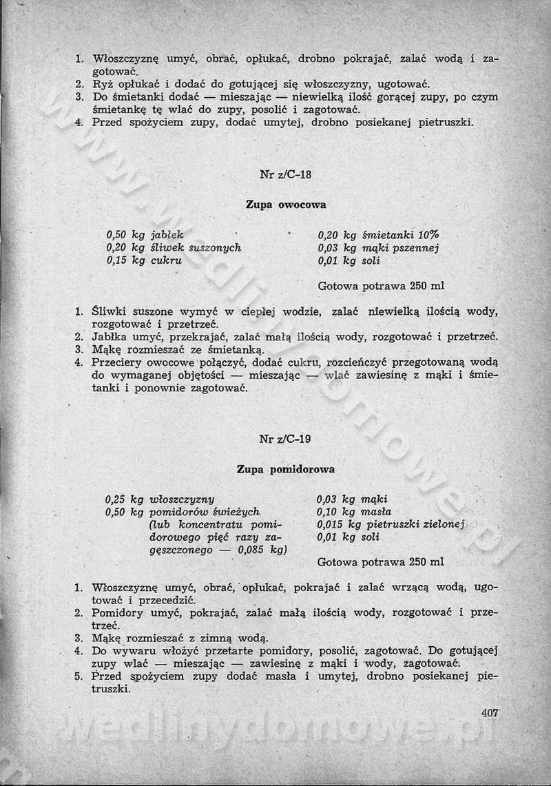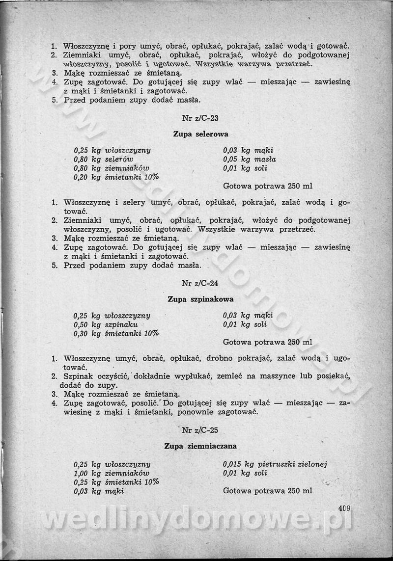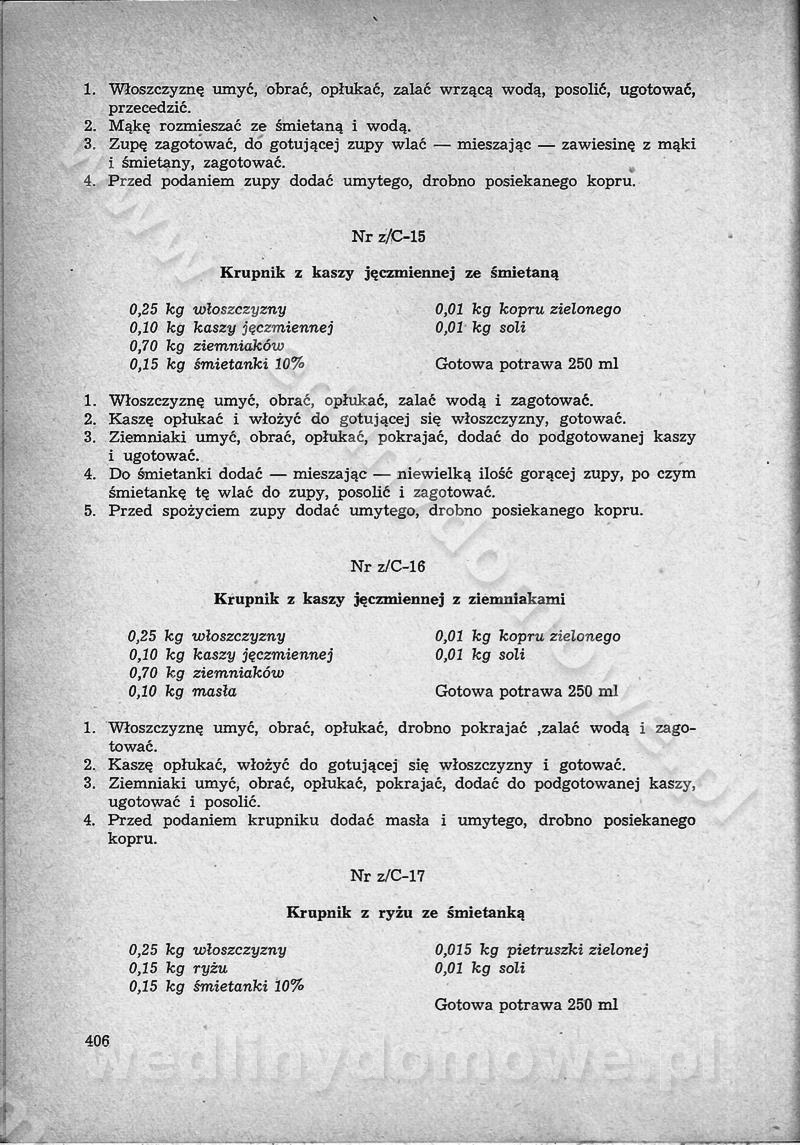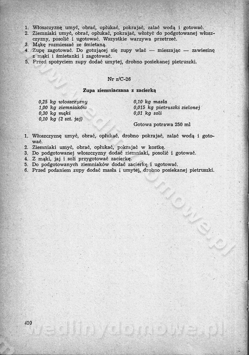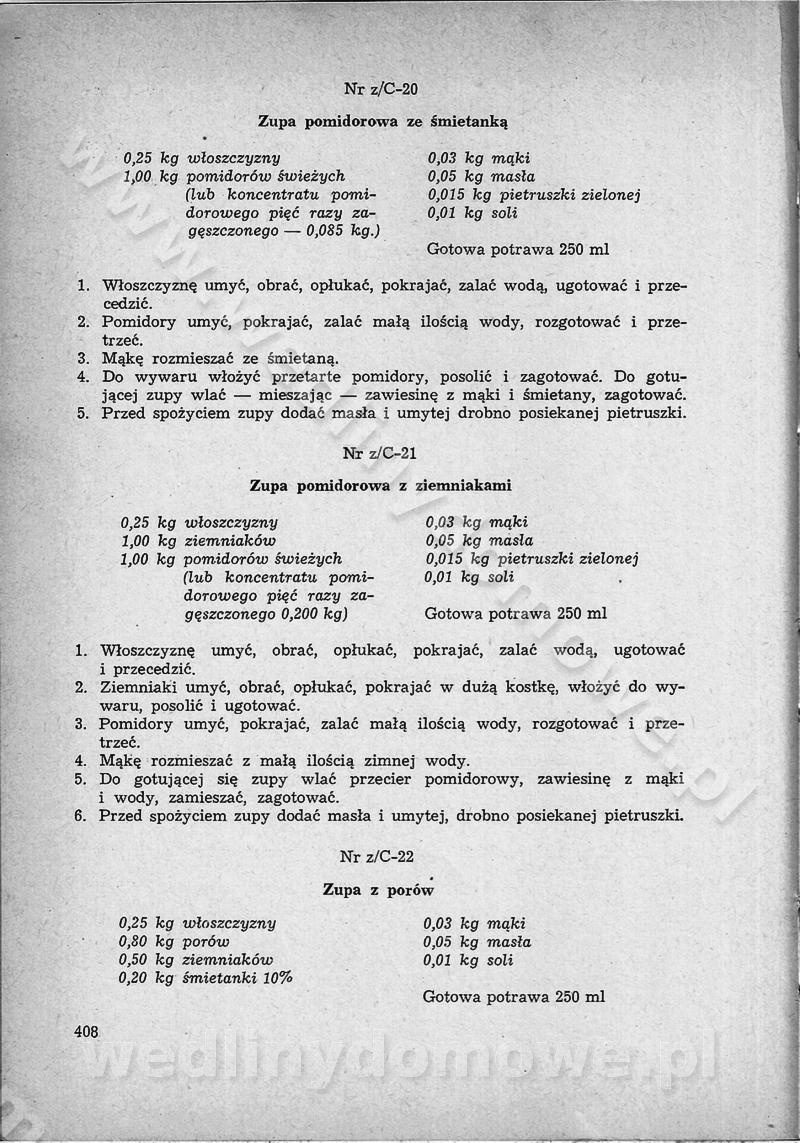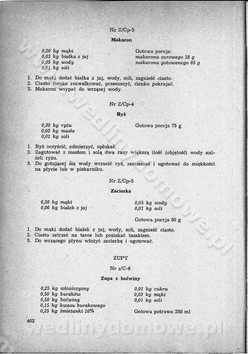 SPIS TREŚCI CZĘŚĆ I TEORETYCZNE PODSTAWY RACJONALNEGO ŻYWIENIA ZBIOROWEGO inż. Krystyna Wolf I. WSKAZÓWKI DO REALIZACJI NORM ŻYWIENIA WYRAŻONYCH W CAŁODZIENNYCH RACJACH POKARMOWYCH II. SKŁADNIKI POKARMOWE I ICH ROLA W ŻYWIENIU Zawartość składników pokarmowych w produktach Rola pożywienia Składniki pokarmowe Wzajemne zależności między składnikami pokarmowymi III. NORMY WYŻYWIENIA Normy zapotrzebowania na składniki pokarmowe Podział produktów Podział produktów na 2 grupy Podział produktów na 9 grup Podział produktów na 12 grup Całodzienne racje pokarmowe Zamiana produktów IV. WYTYCZNE PLANOWANIA ZESTAWU CAŁODZIENNYCH POSIŁKÓW Zasady podziału całodziennych racji pokarmowych na poszczególne posiłki Śniadanie Obiad Kolacja Wytyczne układania jadłospisów Kontrola prawidłowości planowania jadłospisów V. PROCESY TECHNOLOGICZNE, ICH CEL, PRZEBIEG I WPŁYW NA WARTOŚĆ ODŻYWCZĄ POTRAW Cel procesu technologicznego Obróbka wstępna i termiczna Ogólne wskazówki technologiczne Wykończanie potraw VI. WSKAZÓWKI PRAKTYCZNE DOTYCZĄCE KORZYSTANIA Z RECEPTUR CZĘŚĆ II RECEPTURY I. ZUPY inż. Jadwiga Celczyńska Podstawowe zasady sporządzania Sporządzanie wywarów Podział zup Przygotowanie głównych składników zup Wykończanie zup Rodzaje zup Zupy czyste Zupy zabielane Zupy zasmażane Zupy rozklejane Zupy mleczne Zupy owocowe Zupy z wkładką pełnowartościowego białka — samodzielne dania obiadowe lub kolacyjne Zupy czyste (normatyw surowcowy na 10 porcji) Zakwas burakowy na barszcz Zakwas na żur Barszcz burakowy czysty Barszcz czerwony czysty z zagęszczonego soku buraczanego Barszcz burakowy jarski Bulion jarski Rosół z wołowiny Zupa grzybowa czysta Zupa pomidorowa czysta Zupy rozklejane (normatyw surowcowy na 10 porcji) Krupnik na podrobach Krupnik zabielany Krupnik ze słoniną Krupnik z ryżu z jarzynami Zupa grochowa z pęczakiem Zupa grochowa z ziemniakami Zupa rumfordzka Zupa ziemniaczana z fasolą Zalewajka Zalewajka z kwaśnym mlekiem Żur z kiełbasą i boczkiem Żur na podrobach zabielany Zupy zasmażane (normatyw surowcowy na 10 porcji) Kapuśniak z kwaszonej kapusty z papryką Kapuśniak mazurski z kwaszonej kapusty Kapuśniak ze słodkiej kapusty Kapuśniak ze słodkiej kapusty z jabłkami Kapuśniak z czerwonej kapusty Zacierka z ziemniakami Zupa cebulowa Zupa z dyni i pomidorów Zupa fasolowa z makaronem Zupa fasolowa z ziemniakami Zupa z flaków wołowych Zupa „garbure” Zupa grzybowa Zupa jarzynowa z papryką Zupa jarzynowa z fasolą Zupa jarzynowa (jesienna) Zupa jarzynowa z makaronem i serem Zupa z kaszy manny zasmażana Zupa neapolitańska Zupa pomidorowa zasmażana Zupa z porów Zupa z selerów Zupa ziemniaczana zasmażana Zupa ziemniaczana z pomidorami Zupy mleczne (normatyw surowcowy na 10 porcji) Kukurydzanka na mleku Manna na mleku Ryż na mleku Makaron na mleku Płatki owsiane na mleku Zupa z dyni na mleku z tartym ciastem Zupa „nic” Zupa mleczna z lanym ciastem Zupa ze zsiadłego mleka Zupy zabielane (normatyw surowcowy na 10 porcji) Barszcz czerwony zabielany Barszcz czerwony zabielany z suszu Barszcz ukraiński Barszcz czeski Barszcz z botwiną Barszcz jarski z botwiną Chłodnik z botwiną Chłodnik z botwiną na mleku Kapuśniak ze słodkiej kapusty zabielany Kapuśniak na głowiźnie Zupa z brukselki zabielana Zupa cytrynowa Zupa z fasolki szparagowej Zupa grzybowa zabielana Zupa kalafiorowa Zupa koperkowa Zupa ogórkowa Zupa pomidorowa Zupa rybna Zupa szczawiowa Zupa pieczarkowa Zupa ze szpinaku Zupa z młodych jarzyn zabielana Zupa jarzynowa zabielana z mrożonek Zupa ziemniaczana „Paysanne” Pejzanka z puree ziemniaczanym Zupa z młodych ziemniaków Zupa ziemniaczana z porami Zupa z zielonego groszku Zupy owocowe (normatyw surowcowy na 10 porcji) Chłodnik z czarnych jagód Chłodnik truskawkowy Zupa z czarnych jagód Zupa jabłkowa Zupa jabłkowa zabielana Zupa z jabłek i śliwek Zupa ze śliwek Zupa z owoców mieszanych Zupa owocowa z suszu jabłkowego i marmolady Zupa owocowa czysta Zupa z powideł śliwkowych Zupa rabarbarowa Zupa z suszonych śliwek Zupa truskawkowa Zupa z truskawek i rabarbaru Zupy z wkładką mięsną (normatyw surowcowy na 10 porcji) Barszcz małorosyjski na rosole z mięsem Barszcz z ziemniakami i serdelkami Grochówka z mięsem i ziemniakami Kapuśniak z kwaszonej kapusty z kiełbasą Kapuśniak ze słodkiej kapusty z pomidorami i mięsem Krupnik z ryżu na mięsie Krupnik na mięsie Pejzanka na żeberkach Zupa z fasolki szparagowej na mięsie Zupa fasolowa z mięsem i makaronem Zupa jarzynowa z mięsem Gulaszowa polewka Zupa koperkowa na mięsie Zupa ogórkowa z ziemniakami na mięsie Zupa pomidorowa z makaronem i mięsem Zupa z porów z ziemniakami i wątróbką Zupa wiosenna z jajami Zupa ziemniaczana z mięsem Żur z kiełbasą i ziemniakami II. POTRAWY MIĘSNE inż. Krystyna Wolf Podstawowe zasady sporządzania Zachowanie wartości odżywczej dań mięsnych Cechy prawidłowo przyrządzonego mięsa Przechowywanie Rozmrażanie mięsa Rozbiór tuszy zwierząt rzeźnych Obróbka wstępna Obróbka termiczna Potrawy z baraniny (normatyw surowcowy na 10 porcji) Potrawka z baraniny Kotlet barani mielony Kotlet barani mielony z ryżem Baranina w warzywach Ragout baranie Baranina duszona Potrawy z cielęciny (normatyw surowcowy na 10 porcji) Potrawka cielęca Pulpety cielęce Kotlet cielęcy mielony Klopsiki cielęce do sosów Sznycel cielęcy (mielony) Filet cielęcy (do sosów i dodatków) Zrazy cielęce bite (do sosów) Zrazy cielęce nadziewane słoniną Sznycel cielęcy Zrazy cielęce po polsku (faszerowane) Paprykarz cielęcy Pieczeń cielęca duszona Pieczeń cielęca Mostek cielęcy po wiedeńsku Mostek cielęcy faszerowany Rolada cielęca faszerowana Potrawy z wieprzowiny (normatyw surowcowy na 10 porcji) Mięso wieprzowe gotowane Peklówka wieprzowa gotowana Filet wieprzowy saute Kotlet wieprzowy mielony Zraz wieprzowy (klopsik) mielony do sosów Kotlet miel