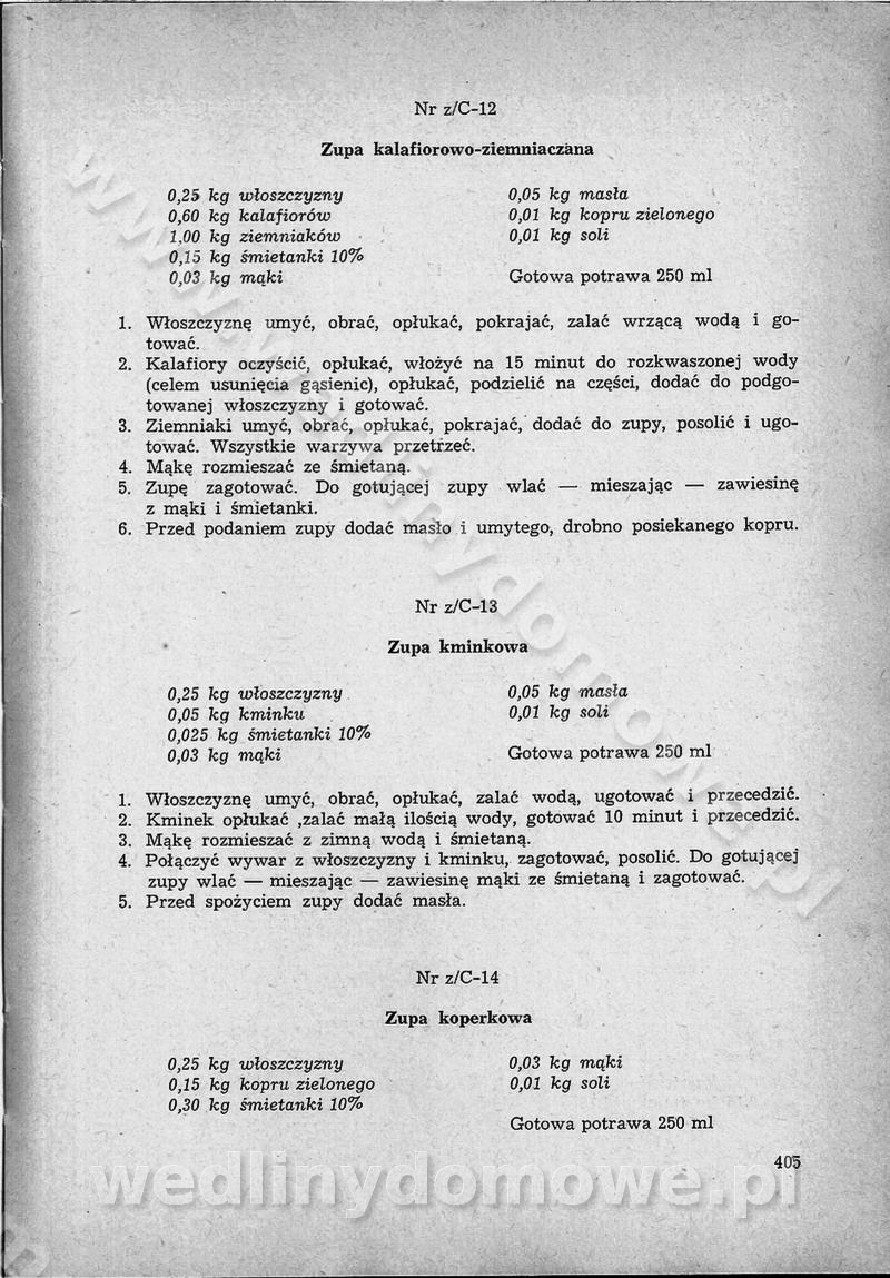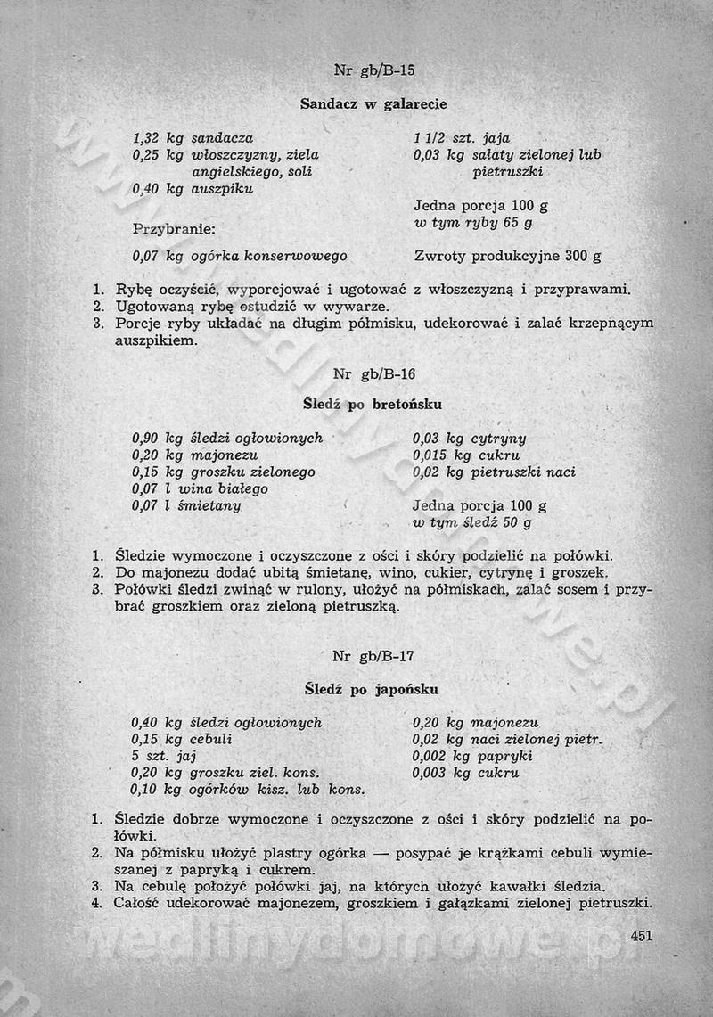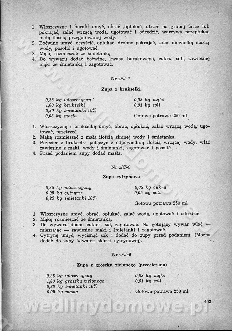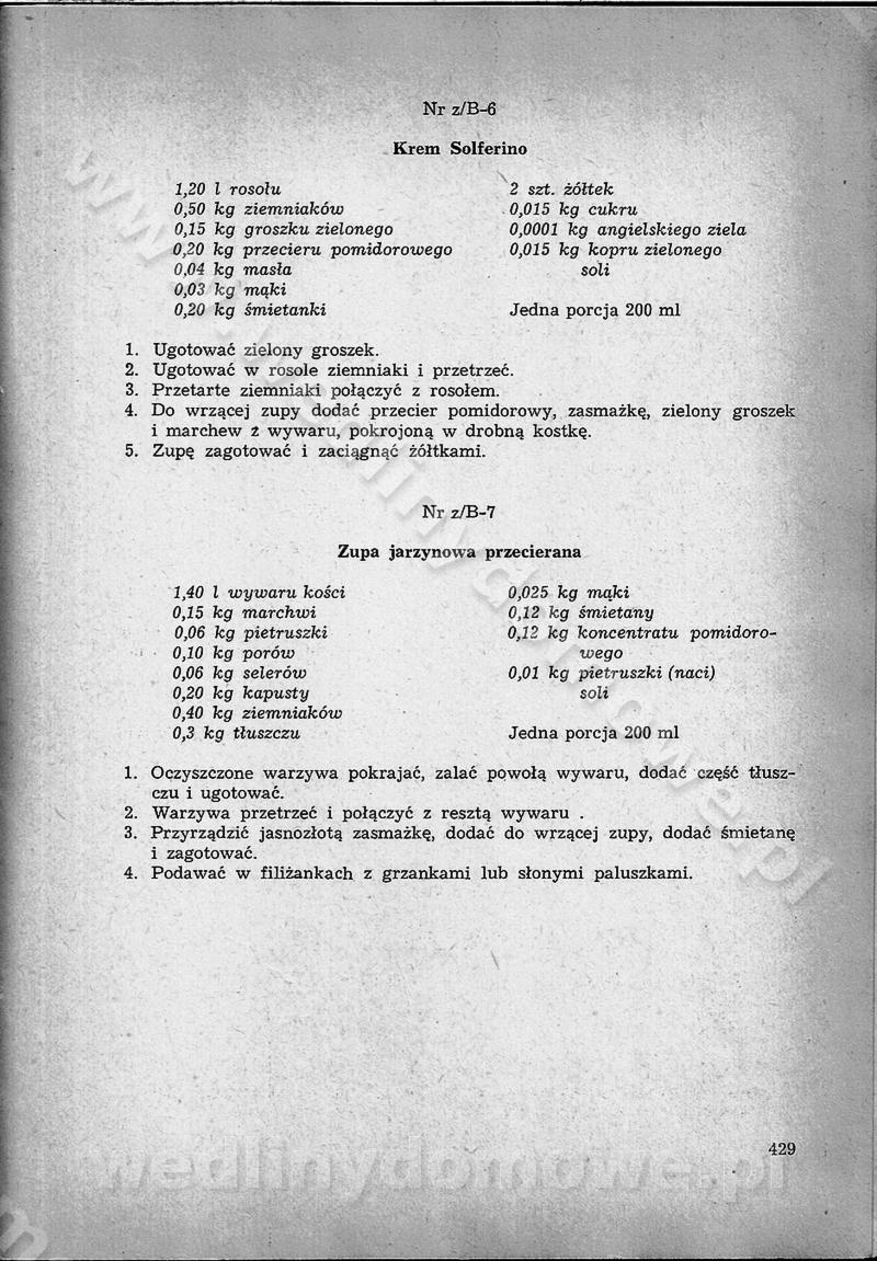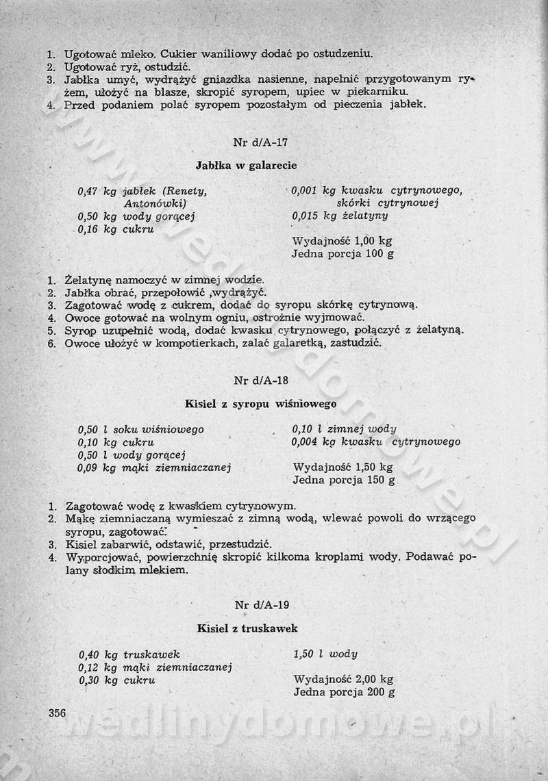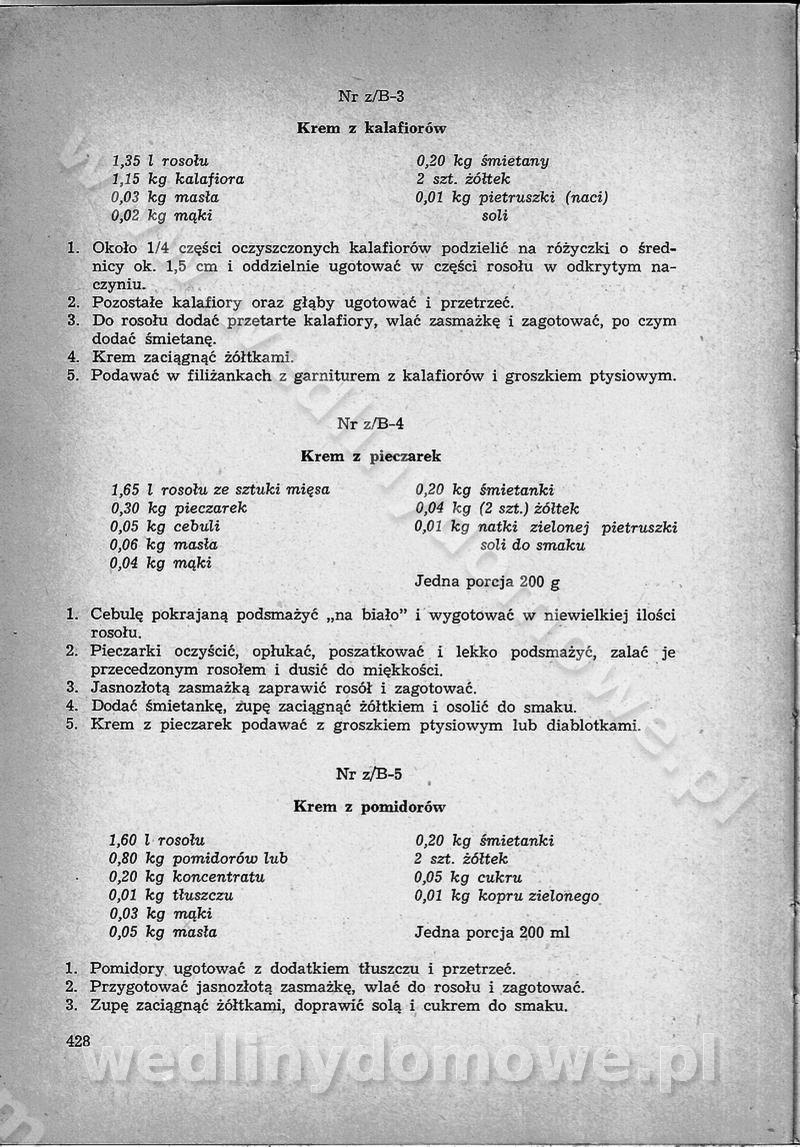 SPIS TREŚCI CZĘŚĆ I TEORETYCZNE PODSTAWY RACJONALNEGO ŻYWIENIA ZBIOROWEGO inż. Krystyna Wolf I. WSKAZÓWKI DO REALIZACJI NORM ŻYWIENIA WYRAŻONYCH W CAŁODZIENNYCH RACJACH POKARMOWYCH II. SKŁADNIKI POKARMOWE I ICH ROLA W ŻYWIENIU Zawartość składników pokarmowych w produktach Rola pożywienia Składniki pokarmowe Wzajemne zależności między składnikami pokarmowymi III. NORMY WYŻYWIENIA Normy zapotrzebowania na składniki pokarmowe Podział produktów Podział produktów na 2 grupy Podział produktów na 9 grup Podział produktów na 12 grup Całodzienne racje pokarmowe Zamiana produktów IV. WYTYCZNE PLANOWANIA ZESTAWU CAŁODZIENNYCH POSIŁKÓW Zasady podziału całodziennych racji pokarmowych na poszczególne posiłki Śniadanie Obiad Kolacja Wytyczne układania jadłospisów Kontrola prawidłowości planowania jadłospisów V. PROCESY TECHNOLOGICZNE, ICH CEL, PRZEBIEG I WPŁYW NA WARTOŚĆ ODŻYWCZĄ POTRAW Cel procesu technologicznego Obróbka wstępna i termiczna Ogólne wskazówki technologiczne Wykończanie potraw VI. WSKAZÓWKI PRAKTYCZNE DOTYCZĄCE KORZYSTANIA Z RECEPTUR CZĘŚĆ II RECEPTURY I. ZUPY inż. Jadwiga Celczyńska Podstawowe zasady sporządzania Sporządzanie wywarów Podział zup Przygotowanie głównych składników zup Wykończanie zup Rodzaje zup Zupy czyste Zupy zabielane Zupy zasmażane Zupy rozklejane Zupy mleczne Zupy owocowe Zupy z wkładką pełnowartościowego białka — samodzielne dania obiadowe lub kolacyjne Zupy czyste (normatyw surowcowy na 10 porcji) Zakwas burakowy na barszcz Zakwas na żur Barszcz burakowy czysty Barszcz czerwony czysty z zagęszczonego soku buraczanego Barszcz burakowy jarski Bulion jarski Rosół z wołowiny Zupa grzybowa czysta Zupa pomidorowa czysta Zupy rozklejane (normatyw surowcowy na 10 porcji) Krupnik na podrobach Krupnik zabielany Krupnik ze słoniną Krupnik z ryżu z jarzynami Zupa grochowa z pęczakiem Zupa grochowa z ziemniakami Zupa rumfordzka Zupa ziemniaczana z fasolą Zalewajka Zalewajka z kwaśnym mlekiem Żur z kiełbasą i boczkiem Żur na podrobach zabielany Zupy zasmażane (normatyw surowcowy na 10 porcji) Kapuśniak z kwaszonej kapusty z papryką Kapuśniak mazurski z kwaszonej kapusty Kapuśniak ze słodkiej kapusty Kapuśniak ze słodkiej kapusty z jabłkami Kapuśniak z czerwonej kapusty Zacierka z ziemniakami Zupa cebulowa Zupa z dyni i pomidorów Zupa fasolowa z makaronem Zupa fasolowa z ziemniakami Zupa z flaków wołowych Zupa „garbure” Zupa grzybowa Zupa jarzynowa z papryką Zupa jarzynowa z fasolą Zupa jarzynowa (jesienna) Zupa jarzynowa z makaronem i serem Zupa z kaszy manny zasmażana Zupa neapolitańska Zupa pomidorowa zasmażana Zupa z porów Zupa z selerów Zupa ziemniaczana zasmażana Zupa ziemniaczana z pomidorami Zupy mleczne (normatyw surowcowy na 10 porcji) Kukurydzanka na mleku Manna na mleku Ryż na mleku Makaron na mleku Płatki owsiane na mleku Zupa z dyni na mleku z tartym ciastem Zupa „nic” Zupa mleczna z lanym ciastem Zupa ze zsiadłego mleka Zupy zabielane (normatyw surowcowy na 10 porcji) Barszcz czerwony zabielany Barszcz czerwony zabielany z suszu Barszcz ukraiński Barszcz czeski Barszcz z botwiną Barszcz jarski z botwiną Chłodnik z botwiną Chłodnik z botwiną na mleku Kapuśniak ze słodkiej kapusty zabielany Kapuśniak na głowiźnie Zupa z brukselki zabielana Zupa cytrynowa Zupa z fasolki szparagowej Zupa grzybowa zabielana Zupa kalafiorowa Zupa koperkowa Zupa ogórkowa Zupa pomidorowa Zupa rybna Zupa szczawiowa Zupa pieczarkowa Zupa ze szpinaku Zupa z młodych jarzyn zabielana Zupa jarzynowa zabielana z mrożonek Zupa ziemniaczana „Paysanne” Pejzanka z puree ziemniaczanym Zupa z młodych ziemniaków Zupa ziemniaczana z porami Zupa z zielonego groszku Zupy owocowe (normatyw surowcowy na 10 porcji) Chłodnik z czarnych jagód Chłodnik truskawkowy Zupa z czarnych jagód Zupa jabłkowa Zupa jabłkowa zabielana Zupa z jabłek i śliwek Zupa ze śliwek Zupa z owoców mieszanych Zupa owocowa z suszu jabłkowego i marmolady Zupa owocowa czysta Zupa z powideł śliwkowych Zupa rabarbarowa Zupa z suszonych śliwek Zupa truskawkowa Zupa z truskawek i rabarbaru Zupy z wkładką mięsną (normatyw surowcowy na 10 porcji) Barszcz małorosyjski na rosole z mięsem Barszcz z ziemniakami i serdelkami Grochówka z mięsem i ziemniakami Kapuśniak z kwaszonej kapusty z kiełbasą Kapuśniak ze słodkiej kapusty z pomidorami i mięsem Krupnik z ryżu na mięsie Krupnik na mięsie Pejzanka na żeberkach Zupa z fasolki szparagowej na mięsie Zupa fasolowa z mięsem i makaronem Zupa jarzynowa z mięsem Gulaszowa polewka Zupa koperkowa na mięsie Zupa ogórkowa z ziemniakami na mięsie Zupa pomidorowa z makaronem i mięsem Zupa z porów z ziemniakami i wątróbką Zupa wiosenna z jajami Zupa ziemniaczana z mięsem Żur z kiełbasą i ziemniakami II. POTRAWY MIĘSNE inż. Krystyna Wolf Podstawowe zasady sporządzania Zachowanie wartości odżywczej dań mięsnych Cechy prawidłowo przyrządzonego mięsa Przechowywanie Rozmrażanie mięsa Rozbiór tuszy zwierząt rzeźnych Obróbka wstępna Obróbka termiczna Potrawy z baraniny (normatyw surowcowy na 10 porcji) Potrawka z baraniny Kotlet barani mielony Kotlet barani mielony z ryżem Baranina w warzywach Ragout baranie Baranina duszona Potrawy z cielęciny (normatyw surowcowy na 10 porcji) Potrawka cielęca Pulpety cielęce Kotlet cielęcy mielony Klopsiki cielęce do sosów Sznycel cielęcy (mielony) Filet cielęcy (do sosów i dodatków) Zrazy cielęce bite (do sosów) Zrazy cielęce nadziewane słoniną Sznycel cielęcy Zrazy cielęce po polsku (faszerowane) Paprykarz cielęcy Pieczeń cielęca duszona Pieczeń cielęca Mostek cielęcy po wiedeńsku Mostek cielęcy faszerowany Rolada cielęca faszerowana Potrawy z wieprzowiny (normatyw surowcowy na 10 porcji) Mięso wieprzowe gotowane Peklówka wieprzowa gotowana Filet wieprzowy saute Kotlet wieprzowy mielony Zraz wieprzowy (klopsik) mielony do sosów Kotlet miel