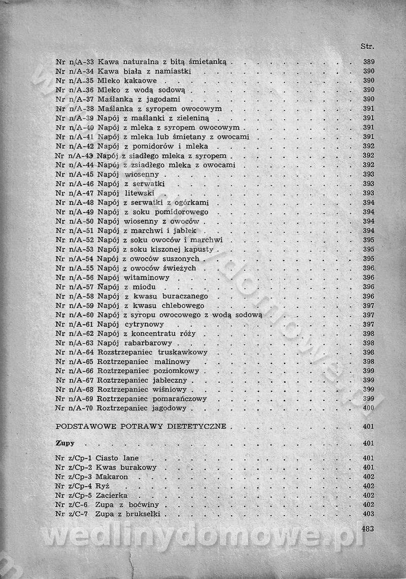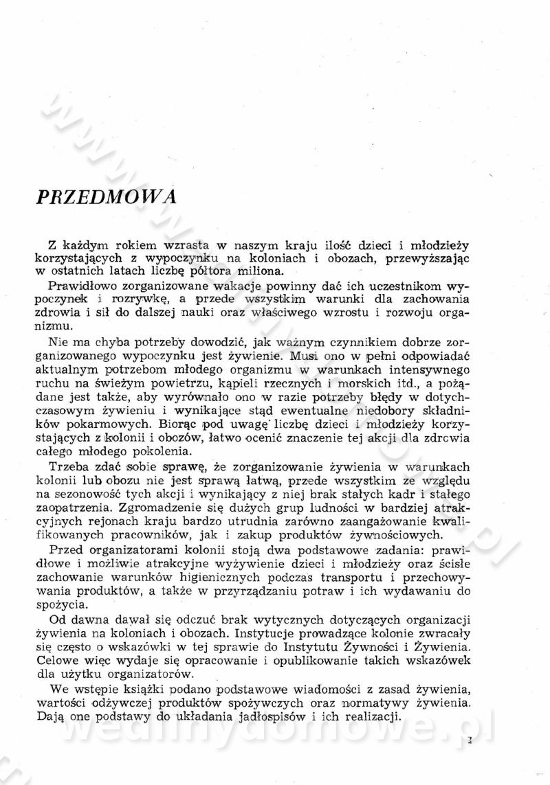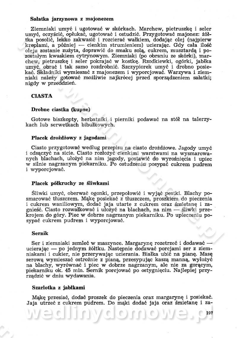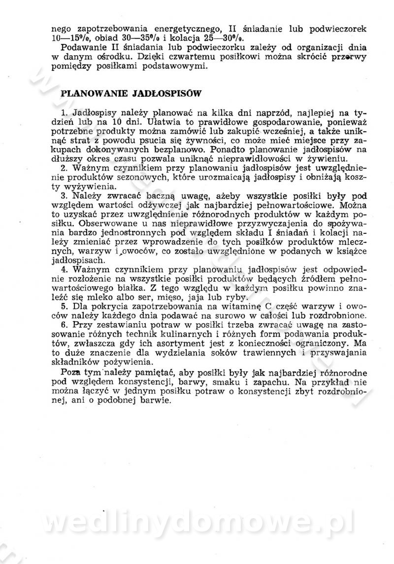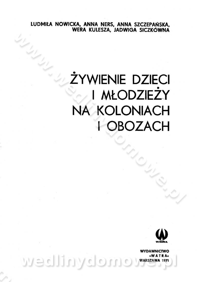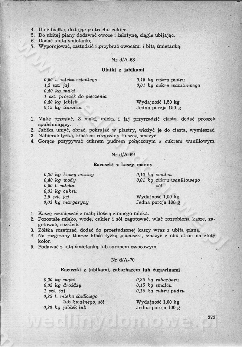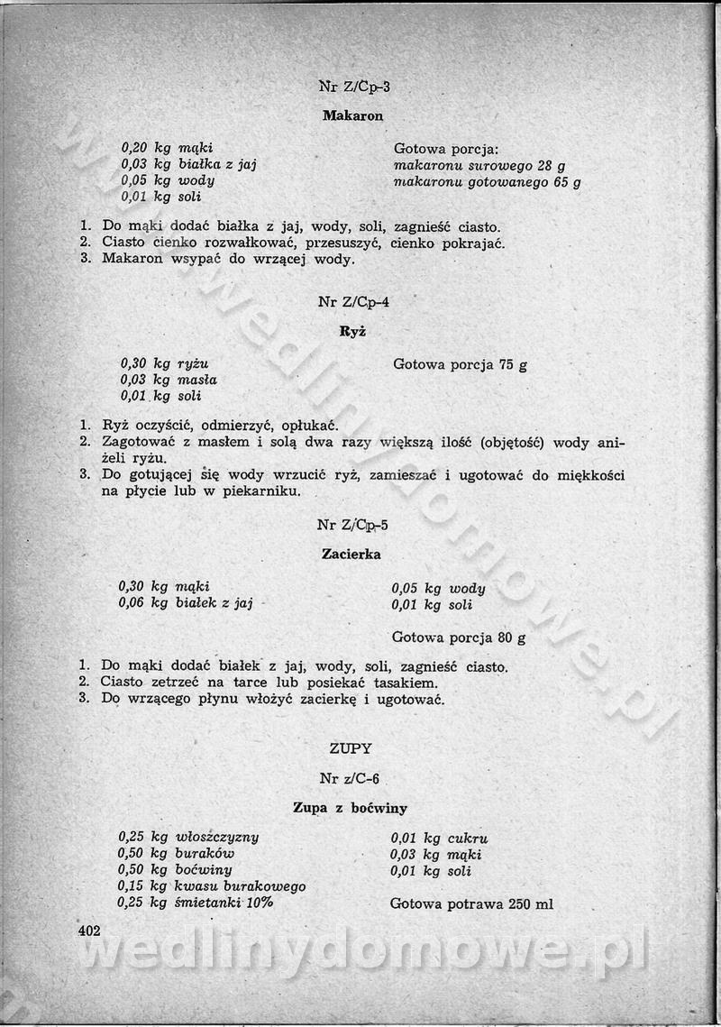 SPIS TREŚCI CZĘŚĆ I TEORETYCZNE PODSTAWY RACJONALNEGO ŻYWIENIA ZBIOROWEGO inż. Krystyna Wolf I. WSKAZÓWKI DO REALIZACJI NORM ŻYWIENIA WYRAŻONYCH W CAŁODZIENNYCH RACJACH POKARMOWYCH II. SKŁADNIKI POKARMOWE I ICH ROLA W ŻYWIENIU Zawartość składników pokarmowych w produktach Rola pożywienia Składniki pokarmowe Wzajemne zależności między składnikami pokarmowymi III. NORMY WYŻYWIENIA Normy zapotrzebowania na składniki pokarmowe Podział produktów Podział produktów na 2 grupy Podział produktów na 9 grup Podział produktów na 12 grup Całodzienne racje pokarmowe Zamiana produktów IV. WYTYCZNE PLANOWANIA ZESTAWU CAŁODZIENNYCH POSIŁKÓW Zasady podziału całodziennych racji pokarmowych na poszczególne posiłki Śniadanie Obiad Kolacja Wytyczne układania jadłospisów Kontrola prawidłowości planowania jadłospisów V. PROCESY TECHNOLOGICZNE, ICH CEL, PRZEBIEG I WPŁYW NA WARTOŚĆ ODŻYWCZĄ POTRAW Cel procesu technologicznego Obróbka wstępna i termiczna Ogólne wskazówki technologiczne Wykończanie potraw VI. WSKAZÓWKI PRAKTYCZNE DOTYCZĄCE KORZYSTANIA Z RECEPTUR CZĘŚĆ II RECEPTURY I. ZUPY inż. Jadwiga Celczyńska Podstawowe zasady sporządzania Sporządzanie wywarów Podział zup Przygotowanie głównych składników zup Wykończanie zup Rodzaje zup Zupy czyste Zupy zabielane Zupy zasmażane Zupy rozklejane Zupy mleczne Zupy owocowe Zupy z wkładką pełnowartościowego białka — samodzielne dania obiadowe lub kolacyjne Zupy czyste (normatyw surowcowy na 10 porcji) Zakwas burakowy na barszcz Zakwas na żur Barszcz burakowy czysty Barszcz czerwony czysty z zagęszczonego soku buraczanego Barszcz burakowy jarski Bulion jarski Rosół z wołowiny Zupa grzybowa czysta Zupa pomidorowa czysta Zupy rozklejane (normatyw surowcowy na 10 porcji) Krupnik na podrobach Krupnik zabielany Krupnik ze słoniną Krupnik z ryżu z jarzynami Zupa grochowa z pęczakiem Zupa grochowa z ziemniakami Zupa rumfordzka Zupa ziemniaczana z fasolą Zalewajka Zalewajka z kwaśnym mlekiem Żur z kiełbasą i boczkiem Żur na podrobach zabielany Zupy zasmażane (normatyw surowcowy na 10 porcji) Kapuśniak z kwaszonej kapusty z papryką Kapuśniak mazurski z kwaszonej kapusty Kapuśniak ze słodkiej kapusty Kapuśniak ze słodkiej kapusty z jabłkami Kapuśniak z czerwonej kapusty Zacierka z ziemniakami Zupa cebulowa Zupa z dyni i pomidorów Zupa fasolowa z makaronem Zupa fasolowa z ziemniakami Zupa z flaków wołowych Zupa „garbure” Zupa grzybowa Zupa jarzynowa z papryką Zupa jarzynowa z fasolą Zupa jarzynowa (jesienna) Zupa jarzynowa z makaronem i serem Zupa z kaszy manny zasmażana Zupa neapolitańska Zupa pomidorowa zasmażana Zupa z porów Zupa z selerów Zupa ziemniaczana zasmażana Zupa ziemniaczana z pomidorami Zupy mleczne (normatyw surowcowy na 10 porcji) Kukurydzanka na mleku Manna na mleku Ryż na mleku Makaron na mleku Płatki owsiane na mleku Zupa z dyni na mleku z tartym ciastem Zupa „nic” Zupa mleczna z lanym ciastem Zupa ze zsiadłego mleka Zupy zabielane (normatyw surowcowy na 10 porcji) Barszcz czerwony zabielany Barszcz czerwony zabielany z suszu Barszcz ukraiński Barszcz czeski Barszcz z botwiną Barszcz jarski z botwiną Chłodnik z botwiną Chłodnik z botwiną na mleku Kapuśniak ze słodkiej kapusty zabielany Kapuśniak na głowiźnie Zupa z brukselki zabielana Zupa cytrynowa Zupa z fasolki szparagowej Zupa grzybowa zabielana Zupa kalafiorowa Zupa koperkowa Zupa ogórkowa Zupa pomidorowa Zupa rybna Zupa szczawiowa Zupa pieczarkowa Zupa ze szpinaku Zupa z młodych jarzyn zabielana Zupa jarzynowa zabielana z mrożonek Zupa ziemniaczana „Paysanne” Pejzanka z puree ziemniaczanym Zupa z młodych ziemniaków Zupa ziemniaczana z porami Zupa z zielonego groszku Zupy owocowe (normatyw surowcowy na 10 porcji) Chłodnik z czarnych jagód Chłodnik truskawkowy Zupa z czarnych jagód Zupa jabłkowa Zupa jabłkowa zabielana Zupa z jabłek i śliwek Zupa ze śliwek Zupa z owoców mieszanych Zupa owocowa z suszu jabłkowego i marmolady Zupa owocowa czysta Zupa z powideł śliwkowych Zupa rabarbarowa Zupa z suszonych śliwek Zupa truskawkowa Zupa z truskawek i rabarbaru Zupy z wkładką mięsną (normatyw surowcowy na 10 porcji) Barszcz małorosyjski na rosole z mięsem Barszcz z ziemniakami i serdelkami Grochówka z mięsem i ziemniakami Kapuśniak z kwaszonej kapusty z kiełbasą Kapuśniak ze słodkiej kapusty z pomidorami i mięsem Krupnik z ryżu na mięsie Krupnik na mięsie Pejzanka na żeberkach Zupa z fasolki szparagowej na mięsie Zupa fasolowa z mięsem i makaronem Zupa jarzynowa z mięsem Gulaszowa polewka Zupa koperkowa na mięsie Zupa ogórkowa z ziemniakami na mięsie Zupa pomidorowa z makaronem i mięsem Zupa z porów z ziemniakami i wątróbką Zupa wiosenna z jajami Zupa ziemniaczana z mięsem Żur z kiełbasą i ziemniakami II. POTRAWY MIĘSNE inż. Krystyna Wolf Podstawowe zasady sporządzania Zachowanie wartości odżywczej dań mięsnych Cechy prawidłowo przyrządzonego mięsa Przechowywanie Rozmrażanie mięsa Rozbiór tuszy zwierząt rzeźnych Obróbka wstępna Obróbka termiczna Potrawy z baraniny (normatyw surowcowy na 10 porcji) Potrawka z baraniny Kotlet barani mielony Kotlet barani mielony z ryżem Baranina w warzywach Ragout baranie Baranina duszona Potrawy z cielęciny (normatyw surowcowy na 10 porcji) Potrawka cielęca Pulpety cielęce Kotlet cielęcy mielony Klopsiki cielęce do sosów Sznycel cielęcy (mielony) Filet cielęcy (do sosów i dodatków) Zrazy cielęce bite (do sosów) Zrazy cielęce nadziewane słoniną Sznycel cielęcy Zrazy cielęce po polsku (faszerowane) Paprykarz cielęcy Pieczeń cielęca duszona Pieczeń cielęca Mostek cielęcy po wiedeńsku Mostek cielęcy faszerowany Rolada cielęca faszerowana Potrawy z wieprzowiny (normatyw surowcowy na 10 porcji) Mięso wieprzowe gotowane Peklówka wieprzowa gotowana Filet wieprzowy saute Kotlet wieprzowy mielony Zraz wieprzowy (klopsik) mielony do sosów Kotlet miel