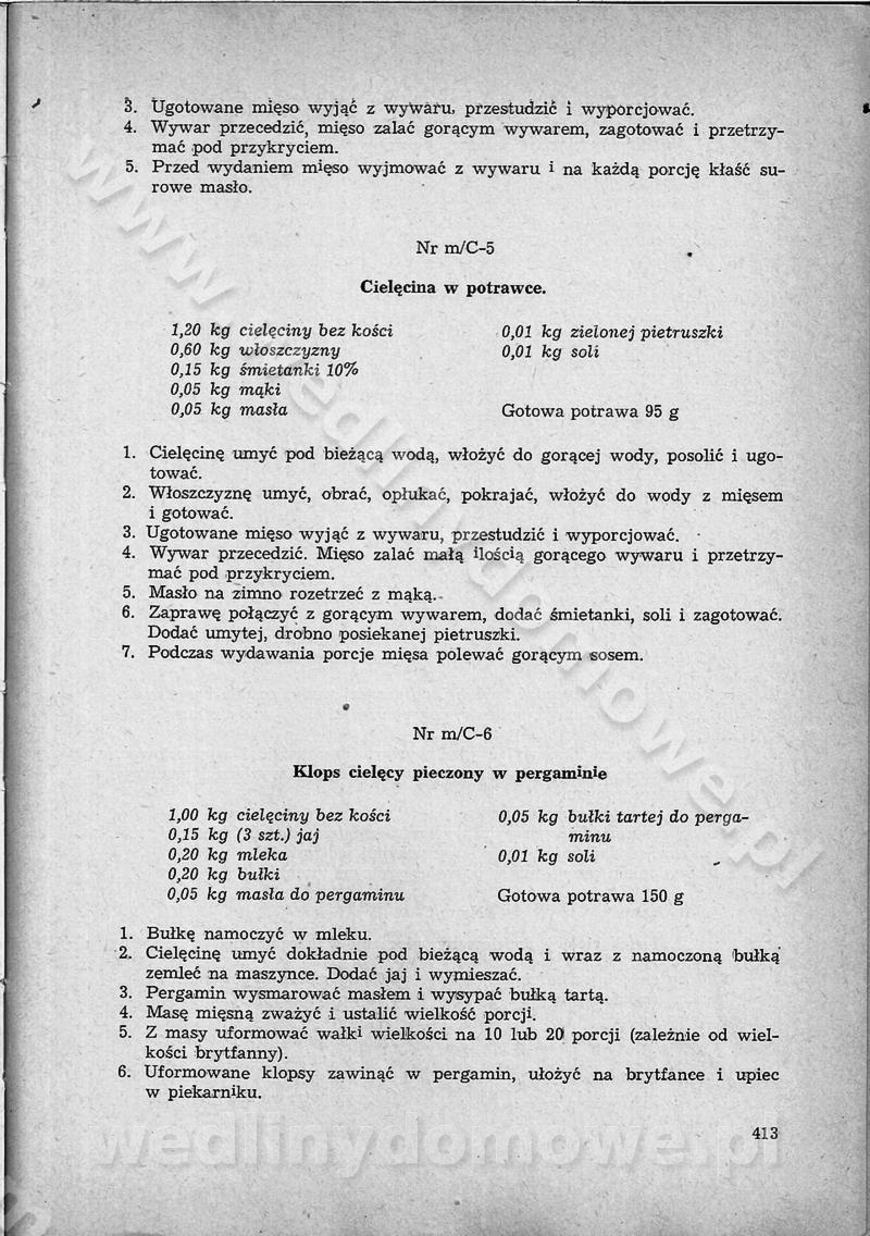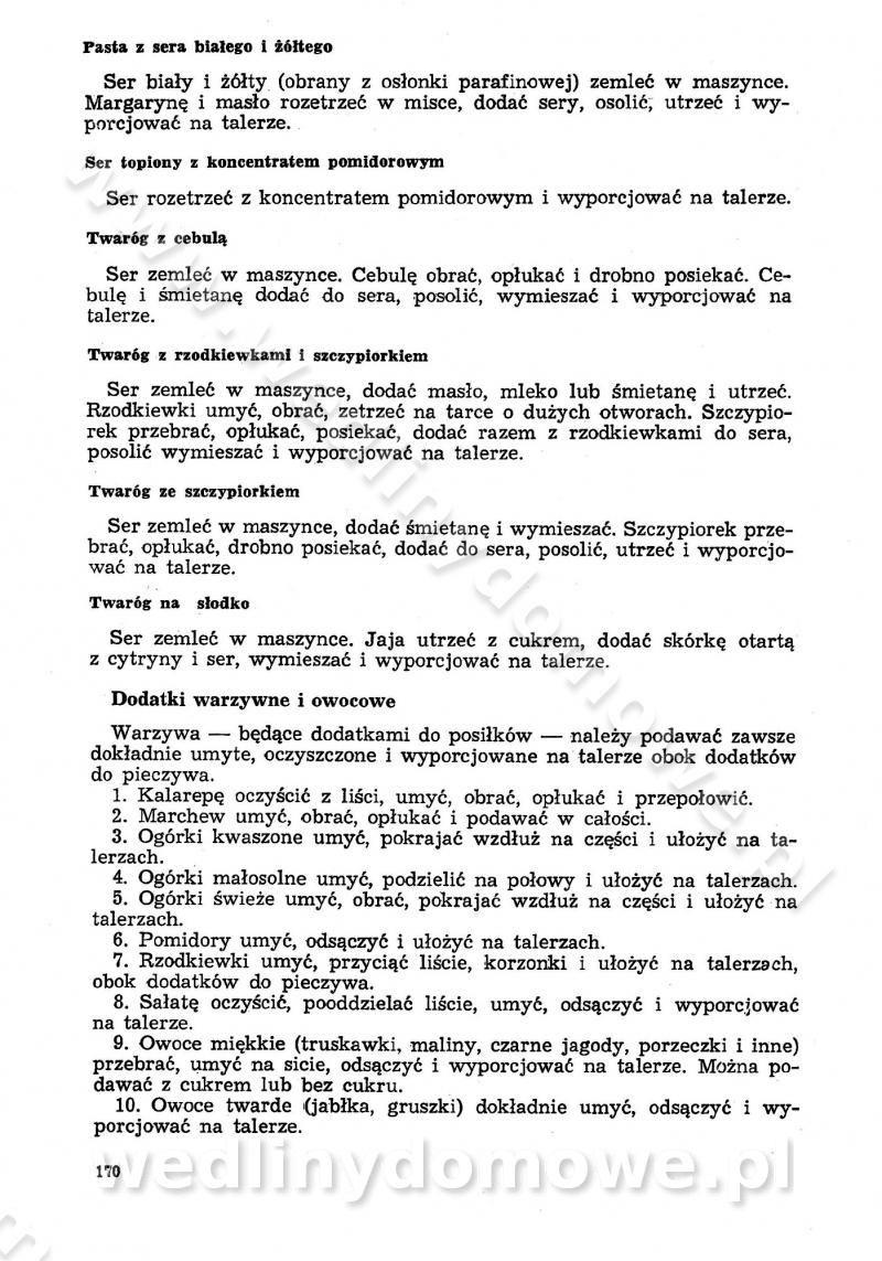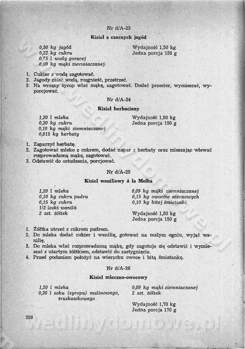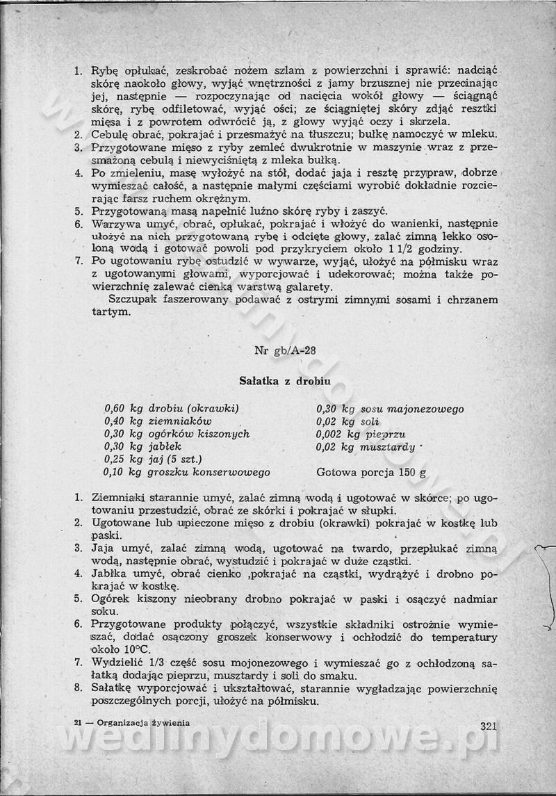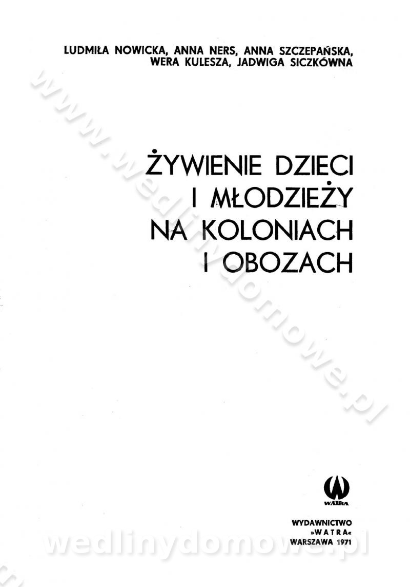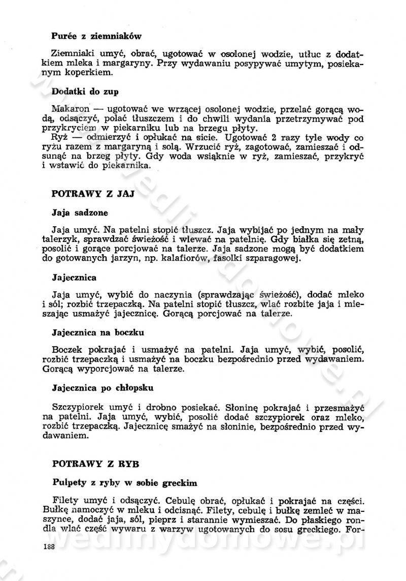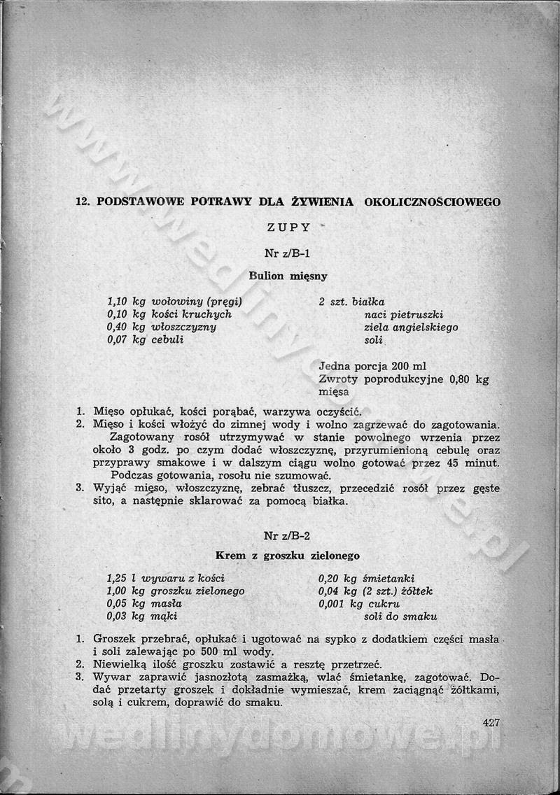 SPIS TREŚCI CZĘŚĆ I TEORETYCZNE PODSTAWY RACJONALNEGO ŻYWIENIA ZBIOROWEGO inż. Krystyna Wolf I. WSKAZÓWKI DO REALIZACJI NORM ŻYWIENIA WYRAŻONYCH W CAŁODZIENNYCH RACJACH POKARMOWYCH II. SKŁADNIKI POKARMOWE I ICH ROLA W ŻYWIENIU Zawartość składników pokarmowych w produktach Rola pożywienia Składniki pokarmowe Wzajemne zależności między składnikami pokarmowymi III. NORMY WYŻYWIENIA Normy zapotrzebowania na składniki pokarmowe Podział produktów Podział produktów na 2 grupy Podział produktów na 9 grup Podział produktów na 12 grup Całodzienne racje pokarmowe Zamiana produktów IV. WYTYCZNE PLANOWANIA ZESTAWU CAŁODZIENNYCH POSIŁKÓW Zasady podziału całodziennych racji pokarmowych na poszczególne posiłki Śniadanie Obiad Kolacja Wytyczne układania jadłospisów Kontrola prawidłowości planowania jadłospisów V. PROCESY TECHNOLOGICZNE, ICH CEL, PRZEBIEG I WPŁYW NA WARTOŚĆ ODŻYWCZĄ POTRAW Cel procesu technologicznego Obróbka wstępna i termiczna Ogólne wskazówki technologiczne Wykończanie potraw VI. WSKAZÓWKI PRAKTYCZNE DOTYCZĄCE KORZYSTANIA Z RECEPTUR CZĘŚĆ II RECEPTURY I. ZUPY inż. Jadwiga Celczyńska Podstawowe zasady sporządzania Sporządzanie wywarów Podział zup Przygotowanie głównych składników zup Wykończanie zup Rodzaje zup Zupy czyste Zupy zabielane Zupy zasmażane Zupy rozklejane Zupy mleczne Zupy owocowe Zupy z wkładką pełnowartościowego białka — samodzielne dania obiadowe lub kolacyjne Zupy czyste (normatyw surowcowy na 10 porcji) Zakwas burakowy na barszcz Zakwas na żur Barszcz burakowy czysty Barszcz czerwony czysty z zagęszczonego soku buraczanego Barszcz burakowy jarski Bulion jarski Rosół z wołowiny Zupa grzybowa czysta Zupa pomidorowa czysta Zupy rozklejane (normatyw surowcowy na 10 porcji) Krupnik na podrobach Krupnik zabielany Krupnik ze słoniną Krupnik z ryżu z jarzynami Zupa grochowa z pęczakiem Zupa grochowa z ziemniakami Zupa rumfordzka Zupa ziemniaczana z fasolą Zalewajka Zalewajka z kwaśnym mlekiem Żur z kiełbasą i boczkiem Żur na podrobach zabielany Zupy zasmażane (normatyw surowcowy na 10 porcji) Kapuśniak z kwaszonej kapusty z papryką Kapuśniak mazurski z kwaszonej kapusty Kapuśniak ze słodkiej kapusty Kapuśniak ze słodkiej kapusty z jabłkami Kapuśniak z czerwonej kapusty Zacierka z ziemniakami Zupa cebulowa Zupa z dyni i pomidorów Zupa fasolowa z makaronem Zupa fasolowa z ziemniakami Zupa z flaków wołowych Zupa „garbure” Zupa grzybowa Zupa jarzynowa z papryką Zupa jarzynowa z fasolą Zupa jarzynowa (jesienna) Zupa jarzynowa z makaronem i serem Zupa z kaszy manny zasmażana Zupa neapolitańska Zupa pomidorowa zasmażana Zupa z porów Zupa z selerów Zupa ziemniaczana zasmażana Zupa ziemniaczana z pomidorami Zupy mleczne (normatyw surowcowy na 10 porcji) Kukurydzanka na mleku Manna na mleku Ryż na mleku Makaron na mleku Płatki owsiane na mleku Zupa z dyni na mleku z tartym ciastem Zupa „nic” Zupa mleczna z lanym ciastem Zupa ze zsiadłego mleka Zupy zabielane (normatyw surowcowy na 10 porcji) Barszcz czerwony zabielany Barszcz czerwony zabielany z suszu Barszcz ukraiński Barszcz czeski Barszcz z botwiną Barszcz jarski z botwiną Chłodnik z botwiną Chłodnik z botwiną na mleku Kapuśniak ze słodkiej kapusty zabielany Kapuśniak na głowiźnie Zupa z brukselki zabielana Zupa cytrynowa Zupa z fasolki szparagowej Zupa grzybowa zabielana Zupa kalafiorowa Zupa koperkowa Zupa ogórkowa Zupa pomidorowa Zupa rybna Zupa szczawiowa Zupa pieczarkowa Zupa ze szpinaku Zupa z młodych jarzyn zabielana Zupa jarzynowa zabielana z mrożonek Zupa ziemniaczana „Paysanne” Pejzanka z puree ziemniaczanym Zupa z młodych ziemniaków Zupa ziemniaczana z porami Zupa z zielonego groszku Zupy owocowe (normatyw surowcowy na 10 porcji) Chłodnik z czarnych jagód Chłodnik truskawkowy Zupa z czarnych jagód Zupa jabłkowa Zupa jabłkowa zabielana Zupa z jabłek i śliwek Zupa ze śliwek Zupa z owoców mieszanych Zupa owocowa z suszu jabłkowego i marmolady Zupa owocowa czysta Zupa z powideł śliwkowych Zupa rabarbarowa Zupa z suszonych śliwek Zupa truskawkowa Zupa z truskawek i rabarbaru Zupy z wkładką mięsną (normatyw surowcowy na 10 porcji) Barszcz małorosyjski na rosole z mięsem Barszcz z ziemniakami i serdelkami Grochówka z mięsem i ziemniakami Kapuśniak z kwaszonej kapusty z kiełbasą Kapuśniak ze słodkiej kapusty z pomidorami i mięsem Krupnik z ryżu na mięsie Krupnik na mięsie Pejzanka na żeberkach Zupa z fasolki szparagowej na mięsie Zupa fasolowa z mięsem i makaronem Zupa jarzynowa z mięsem Gulaszowa polewka Zupa koperkowa na mięsie Zupa ogórkowa z ziemniakami na mięsie Zupa pomidorowa z makaronem i mięsem Zupa z porów z ziemniakami i wątróbką Zupa wiosenna z jajami Zupa ziemniaczana z mięsem Żur z kiełbasą i ziemniakami II. POTRAWY MIĘSNE inż. Krystyna Wolf Podstawowe zasady sporządzania Zachowanie wartości odżywczej dań mięsnych Cechy prawidłowo przyrządzonego mięsa Przechowywanie Rozmrażanie mięsa Rozbiór tuszy zwierząt rzeźnych Obróbka wstępna Obróbka termiczna Potrawy z baraniny (normatyw surowcowy na 10 porcji) Potrawka z baraniny Kotlet barani mielony Kotlet barani mielony z ryżem Baranina w warzywach Ragout baranie Baranina duszona Potrawy z cielęciny (normatyw surowcowy na 10 porcji) Potrawka cielęca Pulpety cielęce Kotlet cielęcy mielony Klopsiki cielęce do sosów Sznycel cielęcy (mielony) Filet cielęcy (do sosów i dodatków) Zrazy cielęce bite (do sosów) Zrazy cielęce nadziewane słoniną Sznycel cielęcy Zrazy cielęce po polsku (faszerowane) Paprykarz cielęcy Pieczeń cielęca duszona Pieczeń cielęca Mostek cielęcy po wiedeńsku Mostek cielęcy faszerowany Rolada cielęca faszerowana Potrawy z wieprzowiny (normatyw surowcowy na 10 porcji) Mięso wieprzowe gotowane Peklówka wieprzowa gotowana Filet wieprzowy saute Kotlet wieprzowy mielony Zraz wieprzowy (klopsik) mielony do sosów Kotlet miel