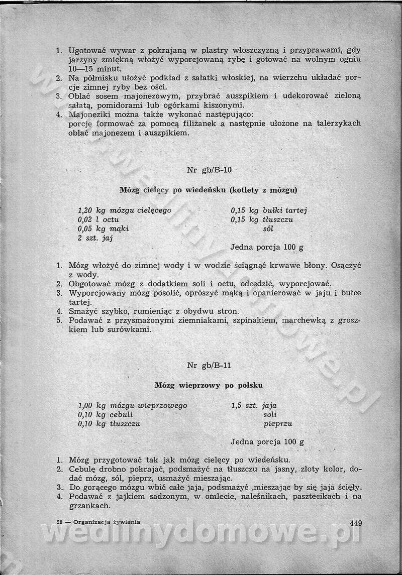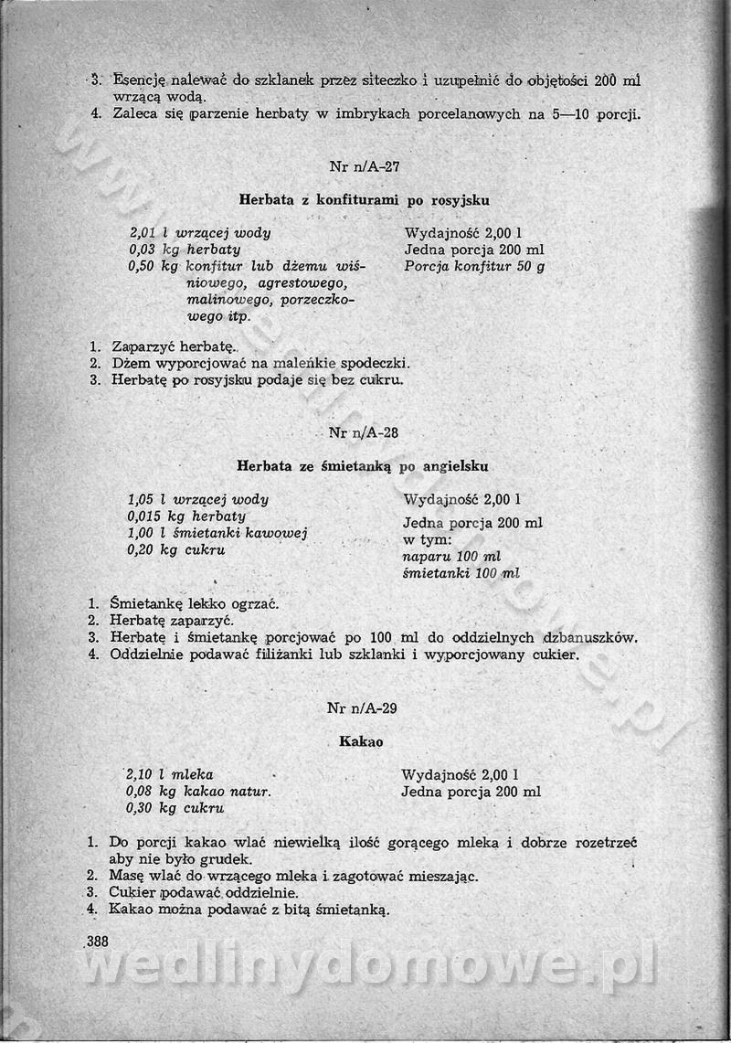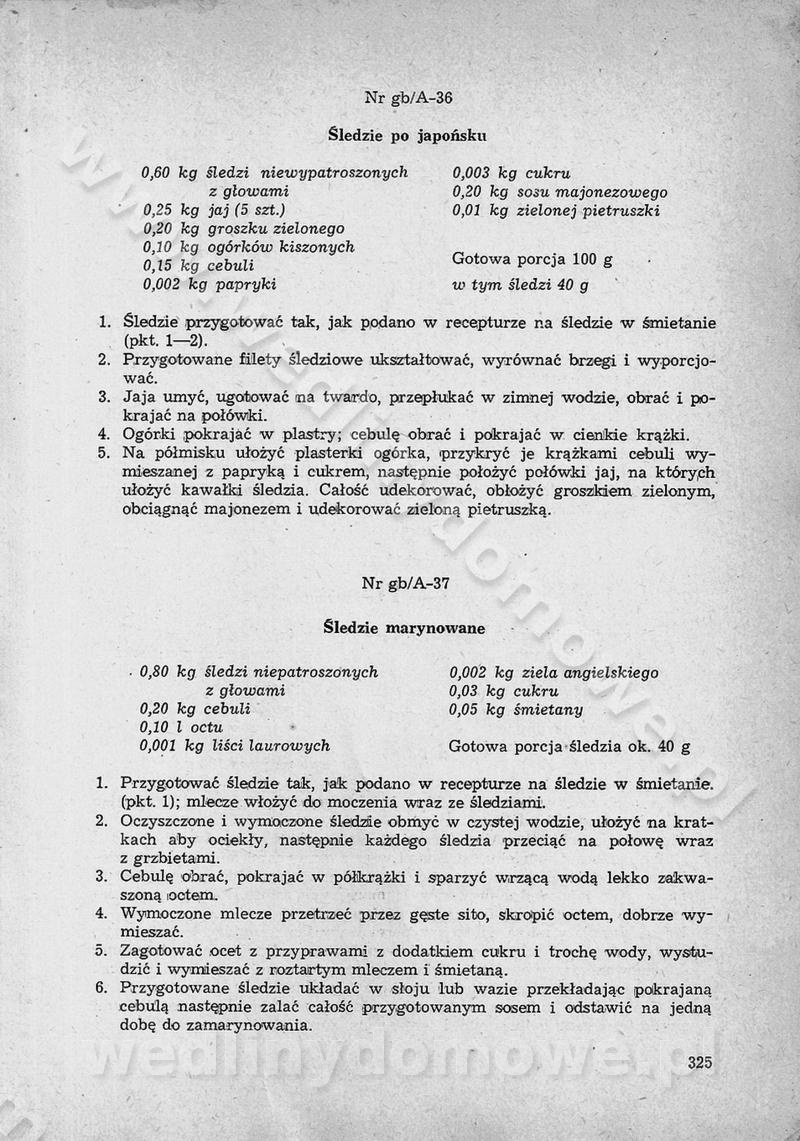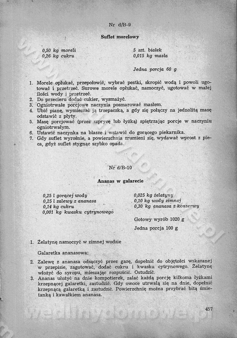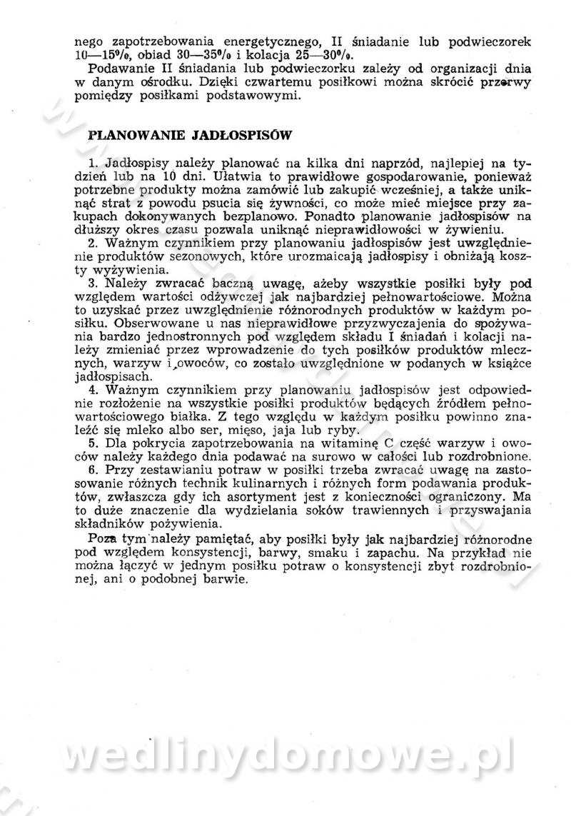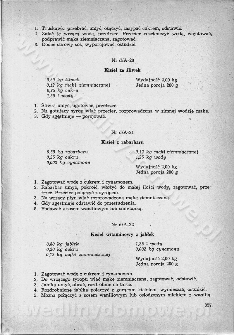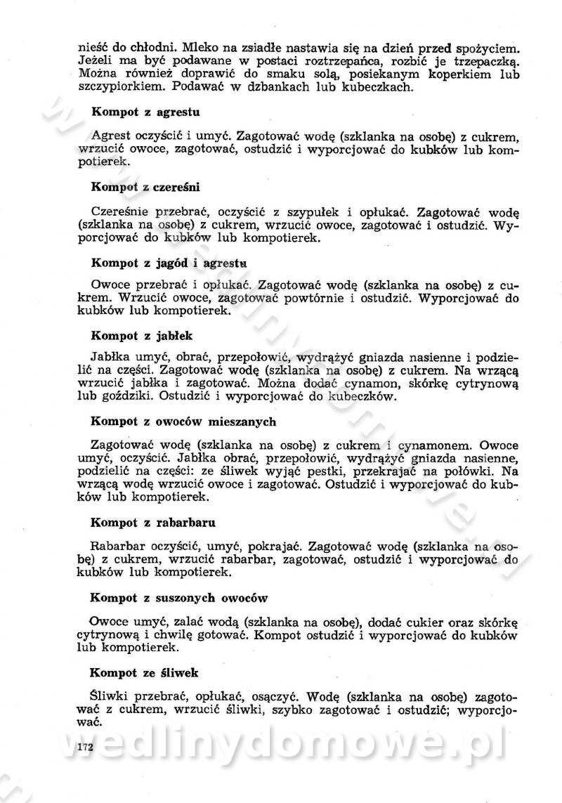 SPIS TREŚCI CZĘŚĆ I TEORETYCZNE PODSTAWY RACJONALNEGO ŻYWIENIA ZBIOROWEGO inż. Krystyna Wolf I. WSKAZÓWKI DO REALIZACJI NORM ŻYWIENIA WYRAŻONYCH W CAŁODZIENNYCH RACJACH POKARMOWYCH II. SKŁADNIKI POKARMOWE I ICH ROLA W ŻYWIENIU Zawartość składników pokarmowych w produktach Rola pożywienia Składniki pokarmowe Wzajemne zależności między składnikami pokarmowymi III. NORMY WYŻYWIENIA Normy zapotrzebowania na składniki pokarmowe Podział produktów Podział produktów na 2 grupy Podział produktów na 9 grup Podział produktów na 12 grup Całodzienne racje pokarmowe Zamiana produktów IV. WYTYCZNE PLANOWANIA ZESTAWU CAŁODZIENNYCH POSIŁKÓW Zasady podziału całodziennych racji pokarmowych na poszczególne posiłki Śniadanie Obiad Kolacja Wytyczne układania jadłospisów Kontrola prawidłowości planowania jadłospisów V. PROCESY TECHNOLOGICZNE, ICH CEL, PRZEBIEG I WPŁYW NA WARTOŚĆ ODŻYWCZĄ POTRAW Cel procesu technologicznego Obróbka wstępna i termiczna Ogólne wskazówki technologiczne Wykończanie potraw VI. WSKAZÓWKI PRAKTYCZNE DOTYCZĄCE KORZYSTANIA Z RECEPTUR CZĘŚĆ II RECEPTURY I. ZUPY inż. Jadwiga Celczyńska Podstawowe zasady sporządzania Sporządzanie wywarów Podział zup Przygotowanie głównych składników zup Wykończanie zup Rodzaje zup Zupy czyste Zupy zabielane Zupy zasmażane Zupy rozklejane Zupy mleczne Zupy owocowe Zupy z wkładką pełnowartościowego białka — samodzielne dania obiadowe lub kolacyjne Zupy czyste (normatyw surowcowy na 10 porcji) Zakwas burakowy na barszcz Zakwas na żur Barszcz burakowy czysty Barszcz czerwony czysty z zagęszczonego soku buraczanego Barszcz burakowy jarski Bulion jarski Rosół z wołowiny Zupa grzybowa czysta Zupa pomidorowa czysta Zupy rozklejane (normatyw surowcowy na 10 porcji) Krupnik na podrobach Krupnik zabielany Krupnik ze słoniną Krupnik z ryżu z jarzynami Zupa grochowa z pęczakiem Zupa grochowa z ziemniakami Zupa rumfordzka Zupa ziemniaczana z fasolą Zalewajka Zalewajka z kwaśnym mlekiem Żur z kiełbasą i boczkiem Żur na podrobach zabielany Zupy zasmażane (normatyw surowcowy na 10 porcji) Kapuśniak z kwaszonej kapusty z papryką Kapuśniak mazurski z kwaszonej kapusty Kapuśniak ze słodkiej kapusty Kapuśniak ze słodkiej kapusty z jabłkami Kapuśniak z czerwonej kapusty Zacierka z ziemniakami Zupa cebulowa Zupa z dyni i pomidorów Zupa fasolowa z makaronem Zupa fasolowa z ziemniakami Zupa z flaków wołowych Zupa „garbure” Zupa grzybowa Zupa jarzynowa z papryką Zupa jarzynowa z fasolą Zupa jarzynowa (jesienna) Zupa jarzynowa z makaronem i serem Zupa z kaszy manny zasmażana Zupa neapolitańska Zupa pomidorowa zasmażana Zupa z porów Zupa z selerów Zupa ziemniaczana zasmażana Zupa ziemniaczana z pomidorami Zupy mleczne (normatyw surowcowy na 10 porcji) Kukurydzanka na mleku Manna na mleku Ryż na mleku Makaron na mleku Płatki owsiane na mleku Zupa z dyni na mleku z tartym ciastem Zupa „nic” Zupa mleczna z lanym ciastem Zupa ze zsiadłego mleka Zupy zabielane (normatyw surowcowy na 10 porcji) Barszcz czerwony zabielany Barszcz czerwony zabielany z suszu Barszcz ukraiński Barszcz czeski Barszcz z botwiną Barszcz jarski z botwiną Chłodnik z botwiną Chłodnik z botwiną na mleku Kapuśniak ze słodkiej kapusty zabielany Kapuśniak na głowiźnie Zupa z brukselki zabielana Zupa cytrynowa Zupa z fasolki szparagowej Zupa grzybowa zabielana Zupa kalafiorowa Zupa koperkowa Zupa ogórkowa Zupa pomidorowa Zupa rybna Zupa szczawiowa Zupa pieczarkowa Zupa ze szpinaku Zupa z młodych jarzyn zabielana Zupa jarzynowa zabielana z mrożonek Zupa ziemniaczana „Paysanne” Pejzanka z puree ziemniaczanym Zupa z młodych ziemniaków Zupa ziemniaczana z porami Zupa z zielonego groszku Zupy owocowe (normatyw surowcowy na 10 porcji) Chłodnik z czarnych jagód Chłodnik truskawkowy Zupa z czarnych jagód Zupa jabłkowa Zupa jabłkowa zabielana Zupa z jabłek i śliwek Zupa ze śliwek Zupa z owoców mieszanych Zupa owocowa z suszu jabłkowego i marmolady Zupa owocowa czysta Zupa z powideł śliwkowych Zupa rabarbarowa Zupa z suszonych śliwek Zupa truskawkowa Zupa z truskawek i rabarbaru Zupy z wkładką mięsną (normatyw surowcowy na 10 porcji) Barszcz małorosyjski na rosole z mięsem Barszcz z ziemniakami i serdelkami Grochówka z mięsem i ziemniakami Kapuśniak z kwaszonej kapusty z kiełbasą Kapuśniak ze słodkiej kapusty z pomidorami i mięsem Krupnik z ryżu na mięsie Krupnik na mięsie Pejzanka na żeberkach Zupa z fasolki szparagowej na mięsie Zupa fasolowa z mięsem i makaronem Zupa jarzynowa z mięsem Gulaszowa polewka Zupa koperkowa na mięsie Zupa ogórkowa z ziemniakami na mięsie Zupa pomidorowa z makaronem i mięsem Zupa z porów z ziemniakami i wątróbką Zupa wiosenna z jajami Zupa ziemniaczana z mięsem Żur z kiełbasą i ziemniakami II. POTRAWY MIĘSNE inż. Krystyna Wolf Podstawowe zasady sporządzania Zachowanie wartości odżywczej dań mięsnych Cechy prawidłowo przyrządzonego mięsa Przechowywanie Rozmrażanie mięsa Rozbiór tuszy zwierząt rzeźnych Obróbka wstępna Obróbka termiczna Potrawy z baraniny (normatyw surowcowy na 10 porcji) Potrawka z baraniny Kotlet barani mielony Kotlet barani mielony z ryżem Baranina w warzywach Ragout baranie Baranina duszona Potrawy z cielęciny (normatyw surowcowy na 10 porcji) Potrawka cielęca Pulpety cielęce Kotlet cielęcy mielony Klopsiki cielęce do sosów Sznycel cielęcy (mielony) Filet cielęcy (do sosów i dodatków) Zrazy cielęce bite (do sosów) Zrazy cielęce nadziewane słoniną Sznycel cielęcy Zrazy cielęce po polsku (faszerowane) Paprykarz cielęcy Pieczeń cielęca duszona Pieczeń cielęca Mostek cielęcy po wiedeńsku Mostek cielęcy faszerowany Rolada cielęca faszerowana Potrawy z wieprzowiny (normatyw surowcowy na 10 porcji) Mięso wieprzowe gotowane Peklówka wieprzowa gotowana Filet wieprzowy saute Kotlet wieprzowy mielony Zraz wieprzowy (klopsik) mielony do sosów Kotlet miel