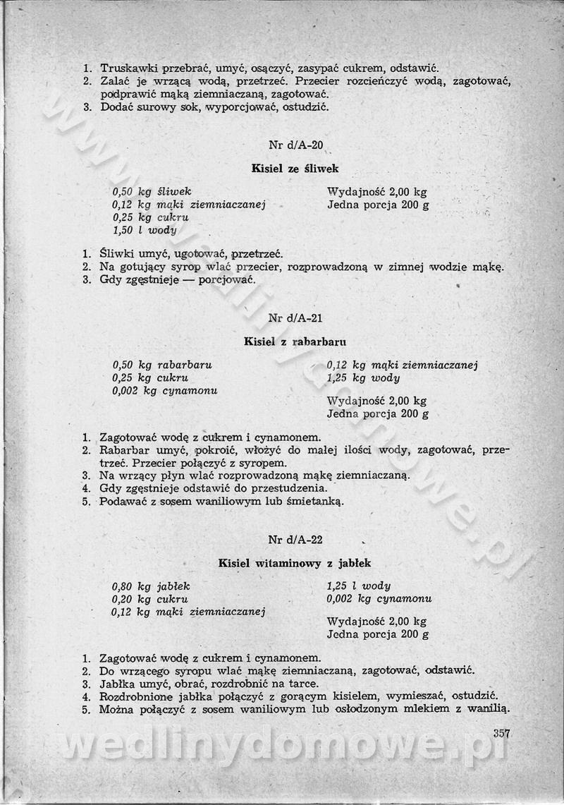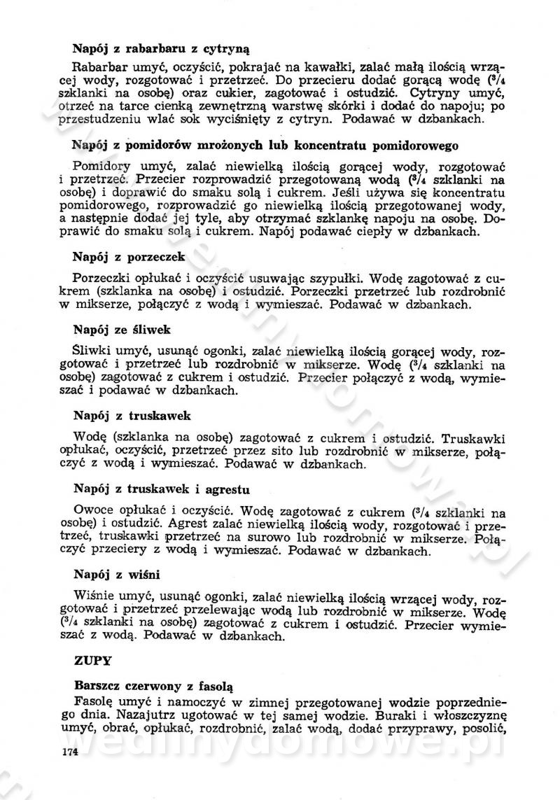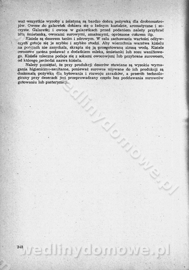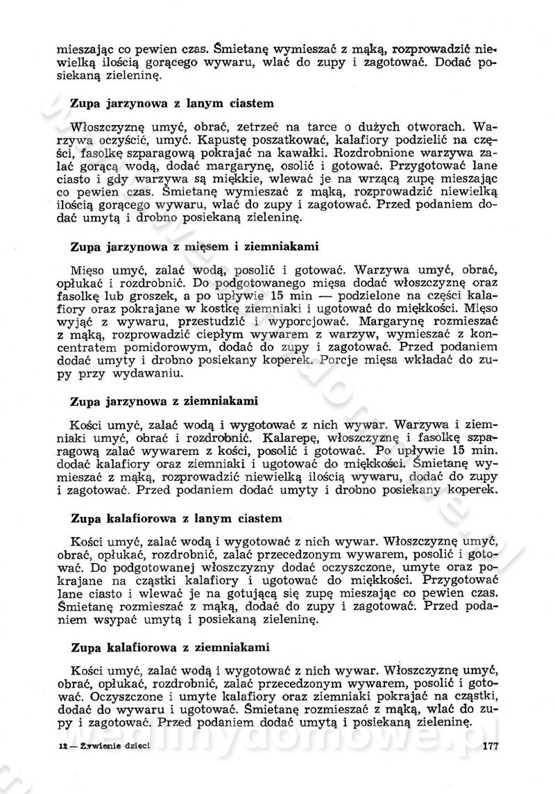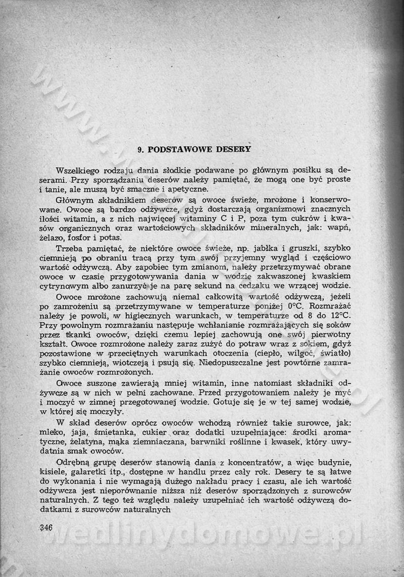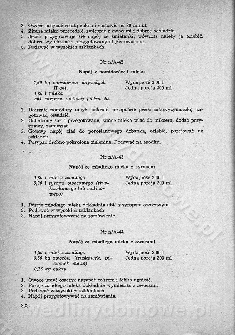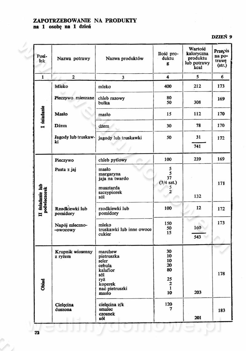 SPIS TREŚCI CZĘŚĆ I TEORETYCZNE PODSTAWY RACJONALNEGO ŻYWIENIA ZBIOROWEGO inż. Krystyna Wolf I. WSKAZÓWKI DO REALIZACJI NORM ŻYWIENIA WYRAŻONYCH W CAŁODZIENNYCH RACJACH POKARMOWYCH II. SKŁADNIKI POKARMOWE I ICH ROLA W ŻYWIENIU Zawartość składników pokarmowych w produktach Rola pożywienia Składniki pokarmowe Wzajemne zależności między składnikami pokarmowymi III. NORMY WYŻYWIENIA Normy zapotrzebowania na składniki pokarmowe Podział produktów Podział produktów na 2 grupy Podział produktów na 9 grup Podział produktów na 12 grup Całodzienne racje pokarmowe Zamiana produktów IV. WYTYCZNE PLANOWANIA ZESTAWU CAŁODZIENNYCH POSIŁKÓW Zasady podziału całodziennych racji pokarmowych na poszczególne posiłki Śniadanie Obiad Kolacja Wytyczne układania jadłospisów Kontrola prawidłowości planowania jadłospisów V. PROCESY TECHNOLOGICZNE, ICH CEL, PRZEBIEG I WPŁYW NA WARTOŚĆ ODŻYWCZĄ POTRAW Cel procesu technologicznego Obróbka wstępna i termiczna Ogólne wskazówki technologiczne Wykończanie potraw VI. WSKAZÓWKI PRAKTYCZNE DOTYCZĄCE KORZYSTANIA Z RECEPTUR CZĘŚĆ II RECEPTURY I. ZUPY inż. Jadwiga Celczyńska Podstawowe zasady sporządzania Sporządzanie wywarów Podział zup Przygotowanie głównych składników zup Wykończanie zup Rodzaje zup Zupy czyste Zupy zabielane Zupy zasmażane Zupy rozklejane Zupy mleczne Zupy owocowe Zupy z wkładką pełnowartościowego białka — samodzielne dania obiadowe lub kolacyjne Zupy czyste (normatyw surowcowy na 10 porcji) Zakwas burakowy na barszcz Zakwas na żur Barszcz burakowy czysty Barszcz czerwony czysty z zagęszczonego soku buraczanego Barszcz burakowy jarski Bulion jarski Rosół z wołowiny Zupa grzybowa czysta Zupa pomidorowa czysta Zupy rozklejane (normatyw surowcowy na 10 porcji) Krupnik na podrobach Krupnik zabielany Krupnik ze słoniną Krupnik z ryżu z jarzynami Zupa grochowa z pęczakiem Zupa grochowa z ziemniakami Zupa rumfordzka Zupa ziemniaczana z fasolą Zalewajka Zalewajka z kwaśnym mlekiem Żur z kiełbasą i boczkiem Żur na podrobach zabielany Zupy zasmażane (normatyw surowcowy na 10 porcji) Kapuśniak z kwaszonej kapusty z papryką Kapuśniak mazurski z kwaszonej kapusty Kapuśniak ze słodkiej kapusty Kapuśniak ze słodkiej kapusty z jabłkami Kapuśniak z czerwonej kapusty Zacierka z ziemniakami Zupa cebulowa Zupa z dyni i pomidorów Zupa fasolowa z makaronem Zupa fasolowa z ziemniakami Zupa z flaków wołowych Zupa „garbure” Zupa grzybowa Zupa jarzynowa z papryką Zupa jarzynowa z fasolą Zupa jarzynowa (jesienna) Zupa jarzynowa z makaronem i serem Zupa z kaszy manny zasmażana Zupa neapolitańska Zupa pomidorowa zasmażana Zupa z porów Zupa z selerów Zupa ziemniaczana zasmażana Zupa ziemniaczana z pomidorami Zupy mleczne (normatyw surowcowy na 10 porcji) Kukurydzanka na mleku Manna na mleku Ryż na mleku Makaron na mleku Płatki owsiane na mleku Zupa z dyni na mleku z tartym ciastem Zupa „nic” Zupa mleczna z lanym ciastem Zupa ze zsiadłego mleka Zupy zabielane (normatyw surowcowy na 10 porcji) Barszcz czerwony zabielany Barszcz czerwony zabielany z suszu Barszcz ukraiński Barszcz czeski Barszcz z botwiną Barszcz jarski z botwiną Chłodnik z botwiną Chłodnik z botwiną na mleku Kapuśniak ze słodkiej kapusty zabielany Kapuśniak na głowiźnie Zupa z brukselki zabielana Zupa cytrynowa Zupa z fasolki szparagowej Zupa grzybowa zabielana Zupa kalafiorowa Zupa koperkowa Zupa ogórkowa Zupa pomidorowa Zupa rybna Zupa szczawiowa Zupa pieczarkowa Zupa ze szpinaku Zupa z młodych jarzyn zabielana Zupa jarzynowa zabielana z mrożonek Zupa ziemniaczana „Paysanne” Pejzanka z puree ziemniaczanym Zupa z młodych ziemniaków Zupa ziemniaczana z porami Zupa z zielonego groszku Zupy owocowe (normatyw surowcowy na 10 porcji) Chłodnik z czarnych jagód Chłodnik truskawkowy Zupa z czarnych jagód Zupa jabłkowa Zupa jabłkowa zabielana Zupa z jabłek i śliwek Zupa ze śliwek Zupa z owoców mieszanych Zupa owocowa z suszu jabłkowego i marmolady Zupa owocowa czysta Zupa z powideł śliwkowych Zupa rabarbarowa Zupa z suszonych śliwek Zupa truskawkowa Zupa z truskawek i rabarbaru Zupy z wkładką mięsną (normatyw surowcowy na 10 porcji) Barszcz małorosyjski na rosole z mięsem Barszcz z ziemniakami i serdelkami Grochówka z mięsem i ziemniakami Kapuśniak z kwaszonej kapusty z kiełbasą Kapuśniak ze słodkiej kapusty z pomidorami i mięsem Krupnik z ryżu na mięsie Krupnik na mięsie Pejzanka na żeberkach Zupa z fasolki szparagowej na mięsie Zupa fasolowa z mięsem i makaronem Zupa jarzynowa z mięsem Gulaszowa polewka Zupa koperkowa na mięsie Zupa ogórkowa z ziemniakami na mięsie Zupa pomidorowa z makaronem i mięsem Zupa z porów z ziemniakami i wątróbką Zupa wiosenna z jajami Zupa ziemniaczana z mięsem Żur z kiełbasą i ziemniakami II. POTRAWY MIĘSNE inż. Krystyna Wolf Podstawowe zasady sporządzania Zachowanie wartości odżywczej dań mięsnych Cechy prawidłowo przyrządzonego mięsa Przechowywanie Rozmrażanie mięsa Rozbiór tuszy zwierząt rzeźnych Obróbka wstępna Obróbka termiczna Potrawy z baraniny (normatyw surowcowy na 10 porcji) Potrawka z baraniny Kotlet barani mielony Kotlet barani mielony z ryżem Baranina w warzywach Ragout baranie Baranina duszona Potrawy z cielęciny (normatyw surowcowy na 10 porcji) Potrawka cielęca Pulpety cielęce Kotlet cielęcy mielony Klopsiki cielęce do sosów Sznycel cielęcy (mielony) Filet cielęcy (do sosów i dodatków) Zrazy cielęce bite (do sosów) Zrazy cielęce nadziewane słoniną Sznycel cielęcy Zrazy cielęce po polsku (faszerowane) Paprykarz cielęcy Pieczeń cielęca duszona Pieczeń cielęca Mostek cielęcy po wiedeńsku Mostek cielęcy faszerowany Rolada cielęca faszerowana Potrawy z wieprzowiny (normatyw surowcowy na 10 porcji) Mięso wieprzowe gotowane Peklówka wieprzowa gotowana Filet wieprzowy saute Kotlet wieprzowy mielony Zraz wieprzowy (klopsik) mielony do sosów Kotlet miel