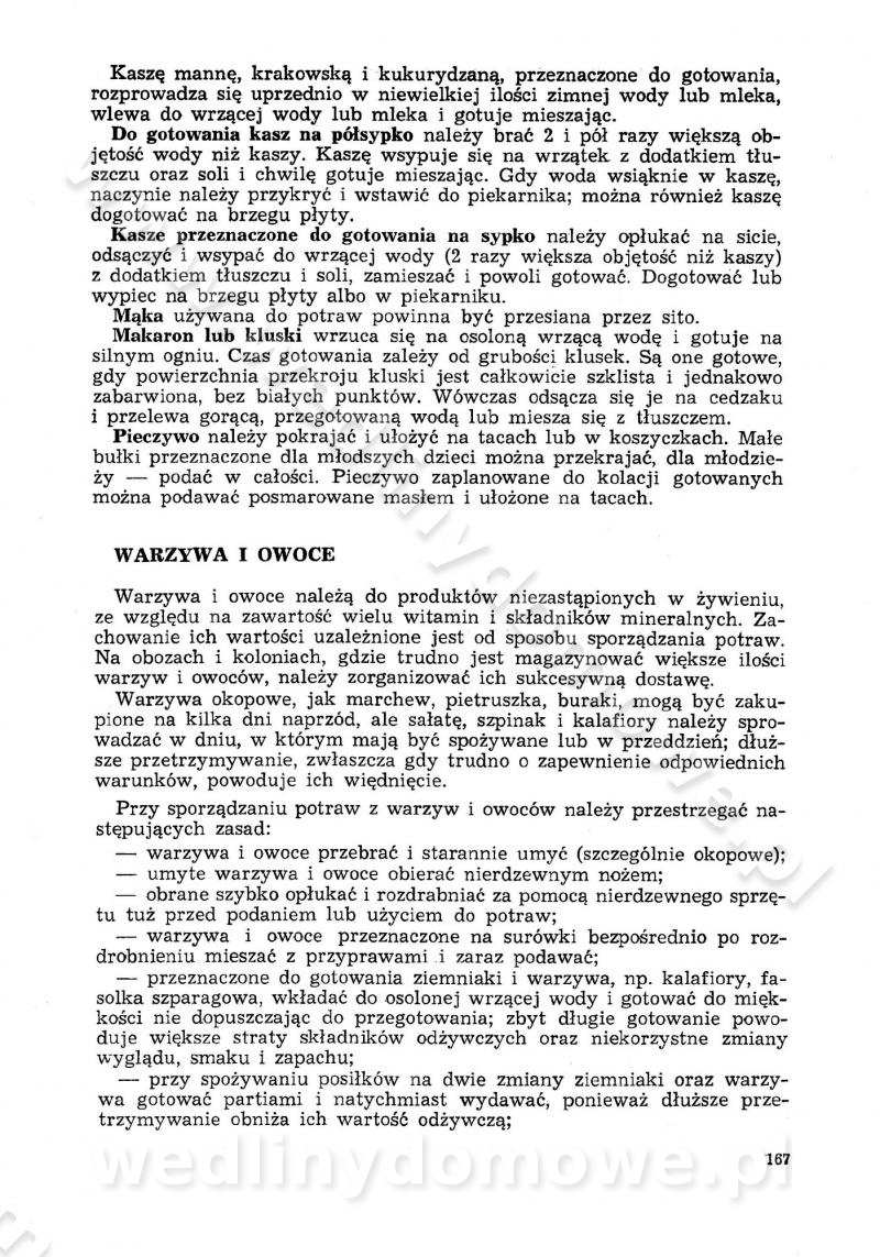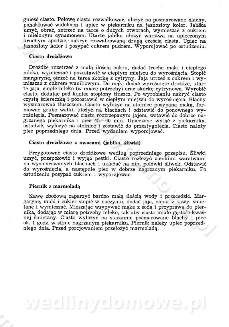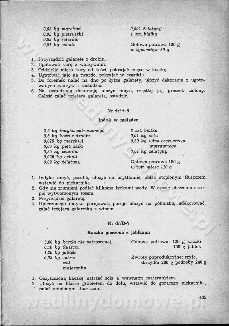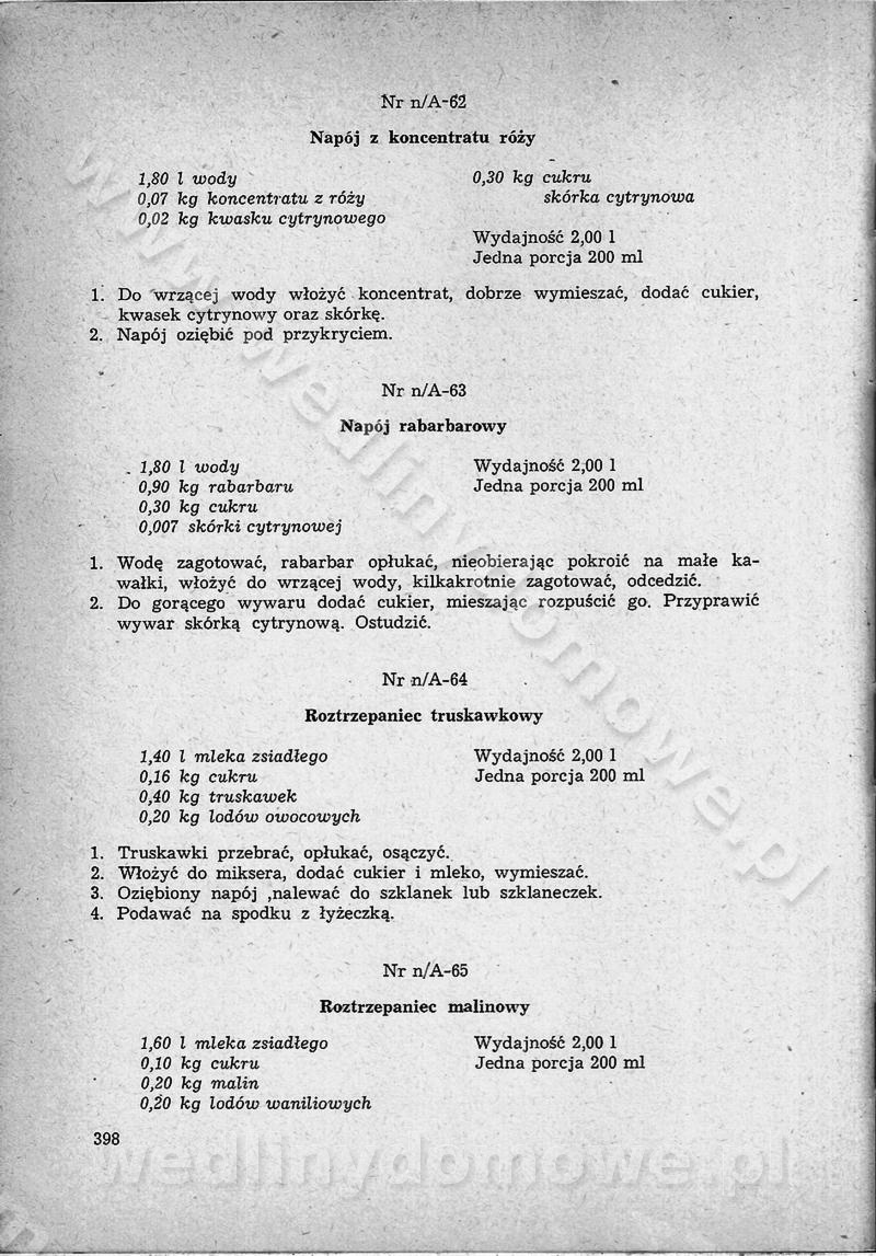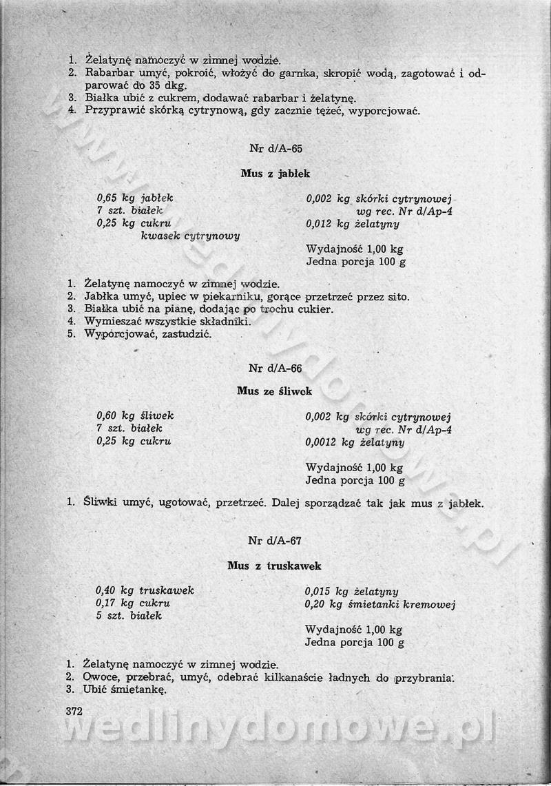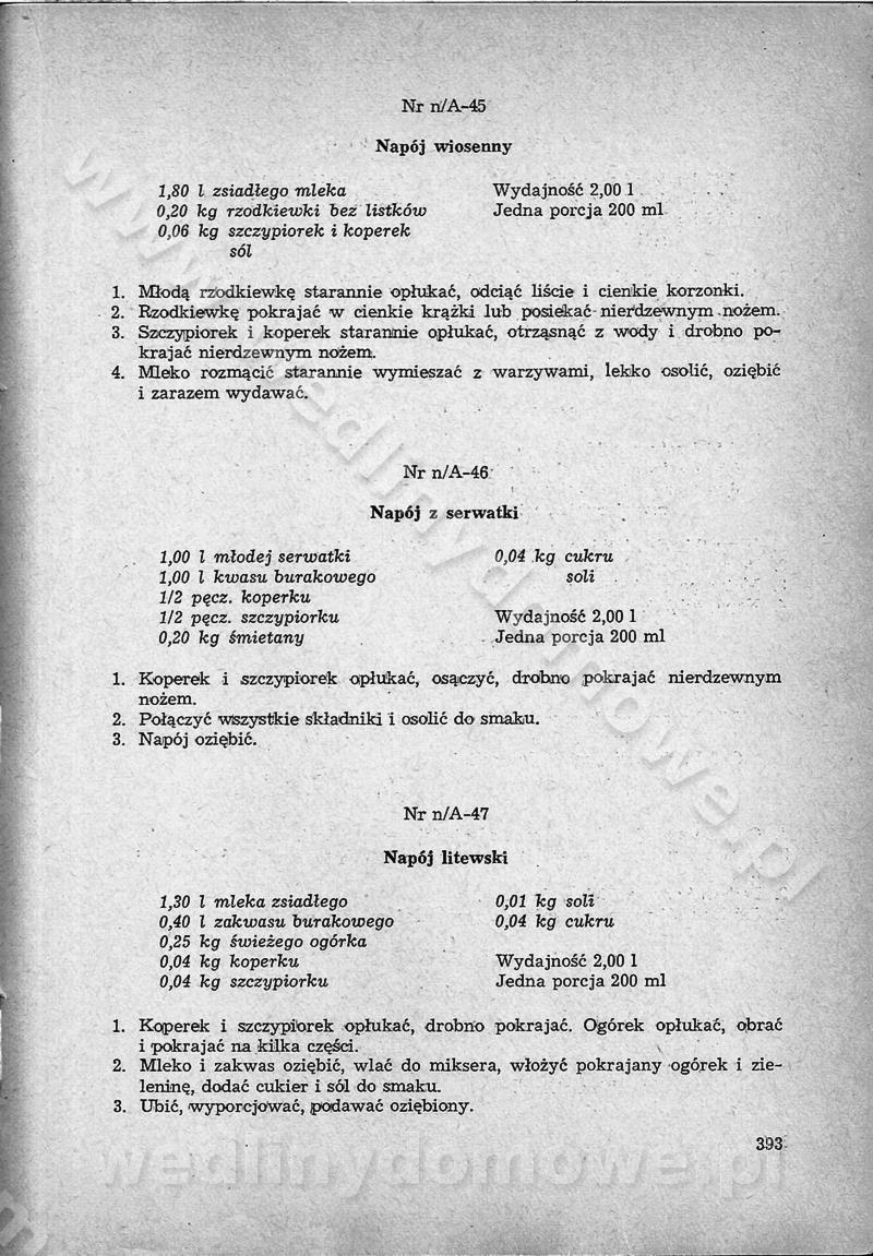 SPIS TREŚCI CZĘŚĆ I TEORETYCZNE PODSTAWY RACJONALNEGO ŻYWIENIA ZBIOROWEGO inż. Krystyna Wolf I. WSKAZÓWKI DO REALIZACJI NORM ŻYWIENIA WYRAŻONYCH W CAŁODZIENNYCH RACJACH POKARMOWYCH II. SKŁADNIKI POKARMOWE I ICH ROLA W ŻYWIENIU Zawartość składników pokarmowych w produktach Rola pożywienia Składniki pokarmowe Wzajemne zależności między składnikami pokarmowymi III. NORMY WYŻYWIENIA Normy zapotrzebowania na składniki pokarmowe Podział produktów Podział produktów na 2 grupy Podział produktów na 9 grup Podział produktów na 12 grup Całodzienne racje pokarmowe Zamiana produktów IV. WYTYCZNE PLANOWANIA ZESTAWU CAŁODZIENNYCH POSIŁKÓW Zasady podziału całodziennych racji pokarmowych na poszczególne posiłki Śniadanie Obiad Kolacja Wytyczne układania jadłospisów Kontrola prawidłowości planowania jadłospisów V. PROCESY TECHNOLOGICZNE, ICH CEL, PRZEBIEG I WPŁYW NA WARTOŚĆ ODŻYWCZĄ POTRAW Cel procesu technologicznego Obróbka wstępna i termiczna Ogólne wskazówki technologiczne Wykończanie potraw VI. WSKAZÓWKI PRAKTYCZNE DOTYCZĄCE KORZYSTANIA Z RECEPTUR CZĘŚĆ II RECEPTURY I. ZUPY inż. Jadwiga Celczyńska Podstawowe zasady sporządzania Sporządzanie wywarów Podział zup Przygotowanie głównych składników zup Wykończanie zup Rodzaje zup Zupy czyste Zupy zabielane Zupy zasmażane Zupy rozklejane Zupy mleczne Zupy owocowe Zupy z wkładką pełnowartościowego białka — samodzielne dania obiadowe lub kolacyjne Zupy czyste (normatyw surowcowy na 10 porcji) Zakwas burakowy na barszcz Zakwas na żur Barszcz burakowy czysty Barszcz czerwony czysty z zagęszczonego soku buraczanego Barszcz burakowy jarski Bulion jarski Rosół z wołowiny Zupa grzybowa czysta Zupa pomidorowa czysta Zupy rozklejane (normatyw surowcowy na 10 porcji) Krupnik na podrobach Krupnik zabielany Krupnik ze słoniną Krupnik z ryżu z jarzynami Zupa grochowa z pęczakiem Zupa grochowa z ziemniakami Zupa rumfordzka Zupa ziemniaczana z fasolą Zalewajka Zalewajka z kwaśnym mlekiem Żur z kiełbasą i boczkiem Żur na podrobach zabielany Zupy zasmażane (normatyw surowcowy na 10 porcji) Kapuśniak z kwaszonej kapusty z papryką Kapuśniak mazurski z kwaszonej kapusty Kapuśniak ze słodkiej kapusty Kapuśniak ze słodkiej kapusty z jabłkami Kapuśniak z czerwonej kapusty Zacierka z ziemniakami Zupa cebulowa Zupa z dyni i pomidorów Zupa fasolowa z makaronem Zupa fasolowa z ziemniakami Zupa z flaków wołowych Zupa „garbure” Zupa grzybowa Zupa jarzynowa z papryką Zupa jarzynowa z fasolą Zupa jarzynowa (jesienna) Zupa jarzynowa z makaronem i serem Zupa z kaszy manny zasmażana Zupa neapolitańska Zupa pomidorowa zasmażana Zupa z porów Zupa z selerów Zupa ziemniaczana zasmażana Zupa ziemniaczana z pomidorami Zupy mleczne (normatyw surowcowy na 10 porcji) Kukurydzanka na mleku Manna na mleku Ryż na mleku Makaron na mleku Płatki owsiane na mleku Zupa z dyni na mleku z tartym ciastem Zupa „nic” Zupa mleczna z lanym ciastem Zupa ze zsiadłego mleka Zupy zabielane (normatyw surowcowy na 10 porcji) Barszcz czerwony zabielany Barszcz czerwony zabielany z suszu Barszcz ukraiński Barszcz czeski Barszcz z botwiną Barszcz jarski z botwiną Chłodnik z botwiną Chłodnik z botwiną na mleku Kapuśniak ze słodkiej kapusty zabielany Kapuśniak na głowiźnie Zupa z brukselki zabielana Zupa cytrynowa Zupa z fasolki szparagowej Zupa grzybowa zabielana Zupa kalafiorowa Zupa koperkowa Zupa ogórkowa Zupa pomidorowa Zupa rybna Zupa szczawiowa Zupa pieczarkowa Zupa ze szpinaku Zupa z młodych jarzyn zabielana Zupa jarzynowa zabielana z mrożonek Zupa ziemniaczana „Paysanne” Pejzanka z puree ziemniaczanym Zupa z młodych ziemniaków Zupa ziemniaczana z porami Zupa z zielonego groszku Zupy owocowe (normatyw surowcowy na 10 porcji) Chłodnik z czarnych jagód Chłodnik truskawkowy Zupa z czarnych jagód Zupa jabłkowa Zupa jabłkowa zabielana Zupa z jabłek i śliwek Zupa ze śliwek Zupa z owoców mieszanych Zupa owocowa z suszu jabłkowego i marmolady Zupa owocowa czysta Zupa z powideł śliwkowych Zupa rabarbarowa Zupa z suszonych śliwek Zupa truskawkowa Zupa z truskawek i rabarbaru Zupy z wkładką mięsną (normatyw surowcowy na 10 porcji) Barszcz małorosyjski na rosole z mięsem Barszcz z ziemniakami i serdelkami Grochówka z mięsem i ziemniakami Kapuśniak z kwaszonej kapusty z kiełbasą Kapuśniak ze słodkiej kapusty z pomidorami i mięsem Krupnik z ryżu na mięsie Krupnik na mięsie Pejzanka na żeberkach Zupa z fasolki szparagowej na mięsie Zupa fasolowa z mięsem i makaronem Zupa jarzynowa z mięsem Gulaszowa polewka Zupa koperkowa na mięsie Zupa ogórkowa z ziemniakami na mięsie Zupa pomidorowa z makaronem i mięsem Zupa z porów z ziemniakami i wątróbką Zupa wiosenna z jajami Zupa ziemniaczana z mięsem Żur z kiełbasą i ziemniakami II. POTRAWY MIĘSNE inż. Krystyna Wolf Podstawowe zasady sporządzania Zachowanie wartości odżywczej dań mięsnych Cechy prawidłowo przyrządzonego mięsa Przechowywanie Rozmrażanie mięsa Rozbiór tuszy zwierząt rzeźnych Obróbka wstępna Obróbka termiczna Potrawy z baraniny (normatyw surowcowy na 10 porcji) Potrawka z baraniny Kotlet barani mielony Kotlet barani mielony z ryżem Baranina w warzywach Ragout baranie Baranina duszona Potrawy z cielęciny (normatyw surowcowy na 10 porcji) Potrawka cielęca Pulpety cielęce Kotlet cielęcy mielony Klopsiki cielęce do sosów Sznycel cielęcy (mielony) Filet cielęcy (do sosów i dodatków) Zrazy cielęce bite (do sosów) Zrazy cielęce nadziewane słoniną Sznycel cielęcy Zrazy cielęce po polsku (faszerowane) Paprykarz cielęcy Pieczeń cielęca duszona Pieczeń cielęca Mostek cielęcy po wiedeńsku Mostek cielęcy faszerowany Rolada cielęca faszerowana Potrawy z wieprzowiny (normatyw surowcowy na 10 porcji) Mięso wieprzowe gotowane Peklówka wieprzowa gotowana Filet wieprzowy saute Kotlet wieprzowy mielony Zraz wieprzowy (klopsik) mielony do sosów Kotlet miel