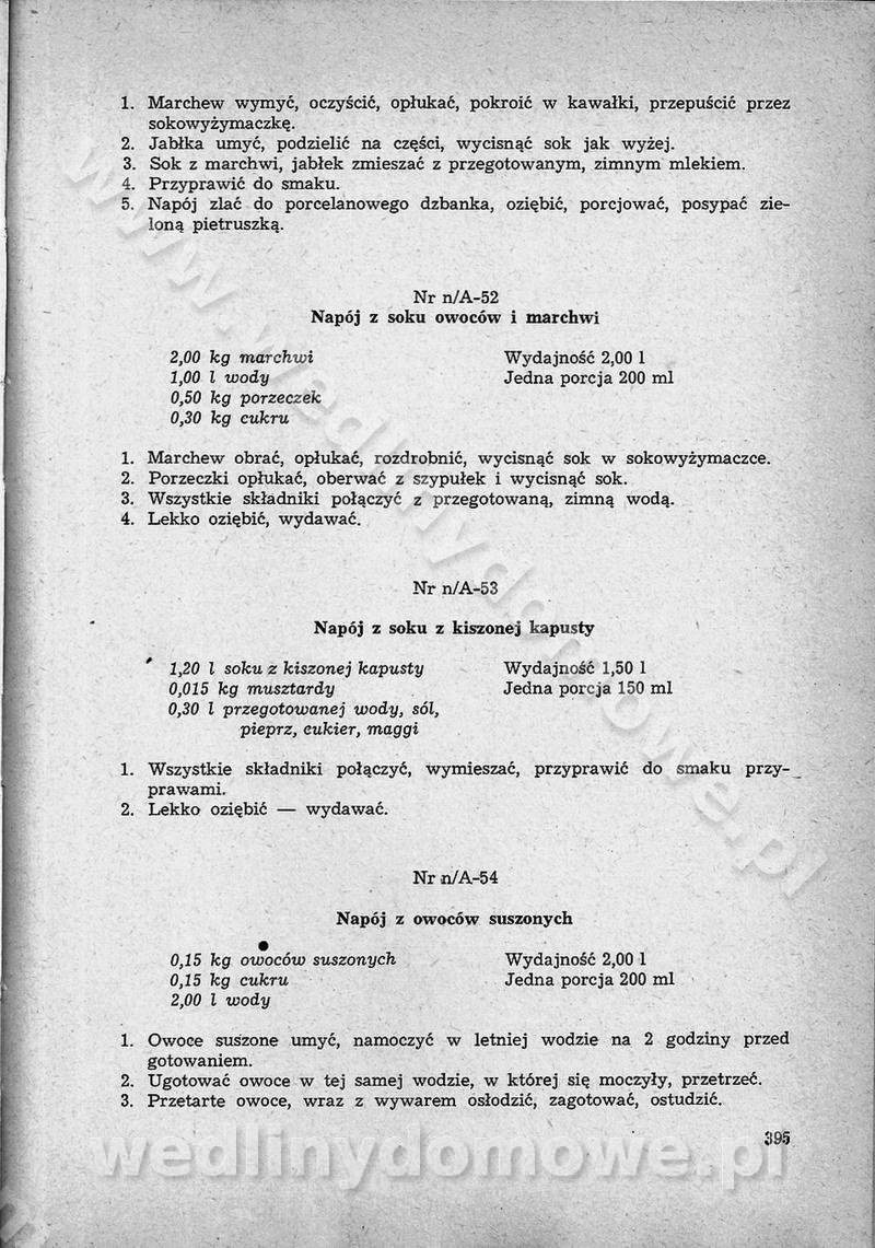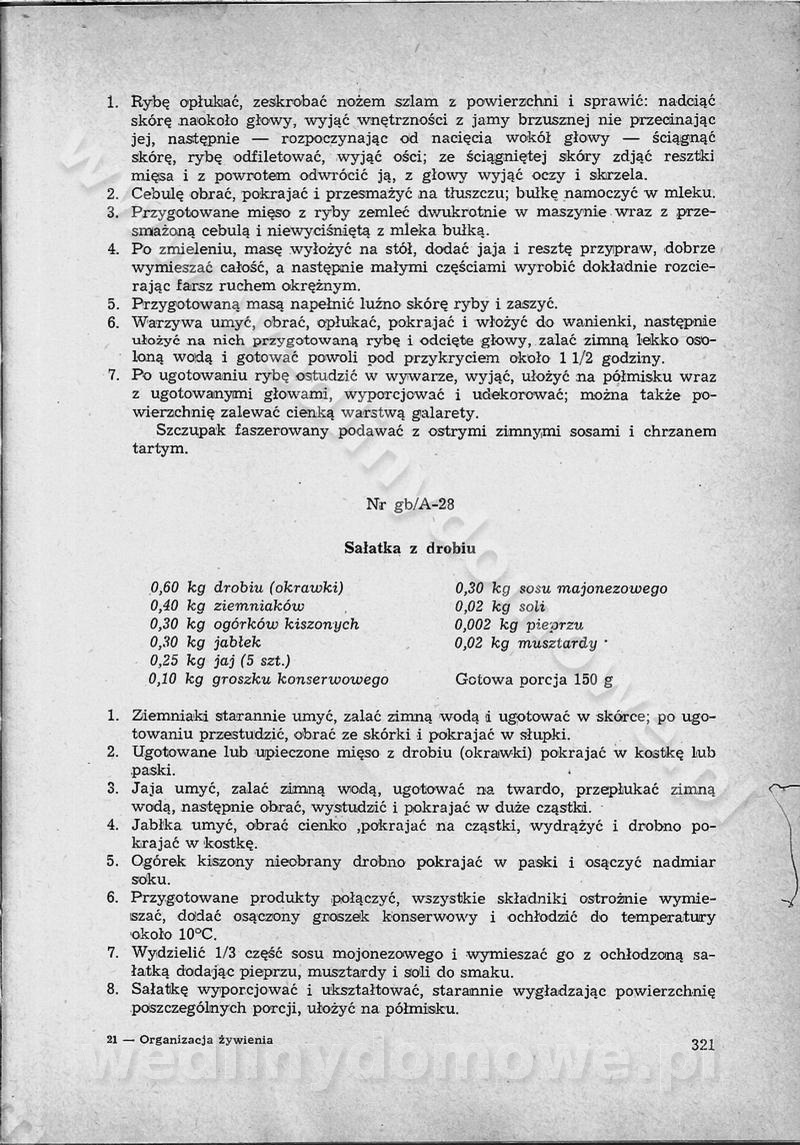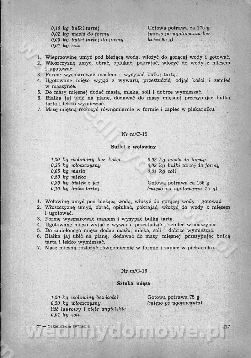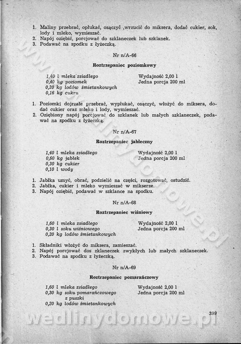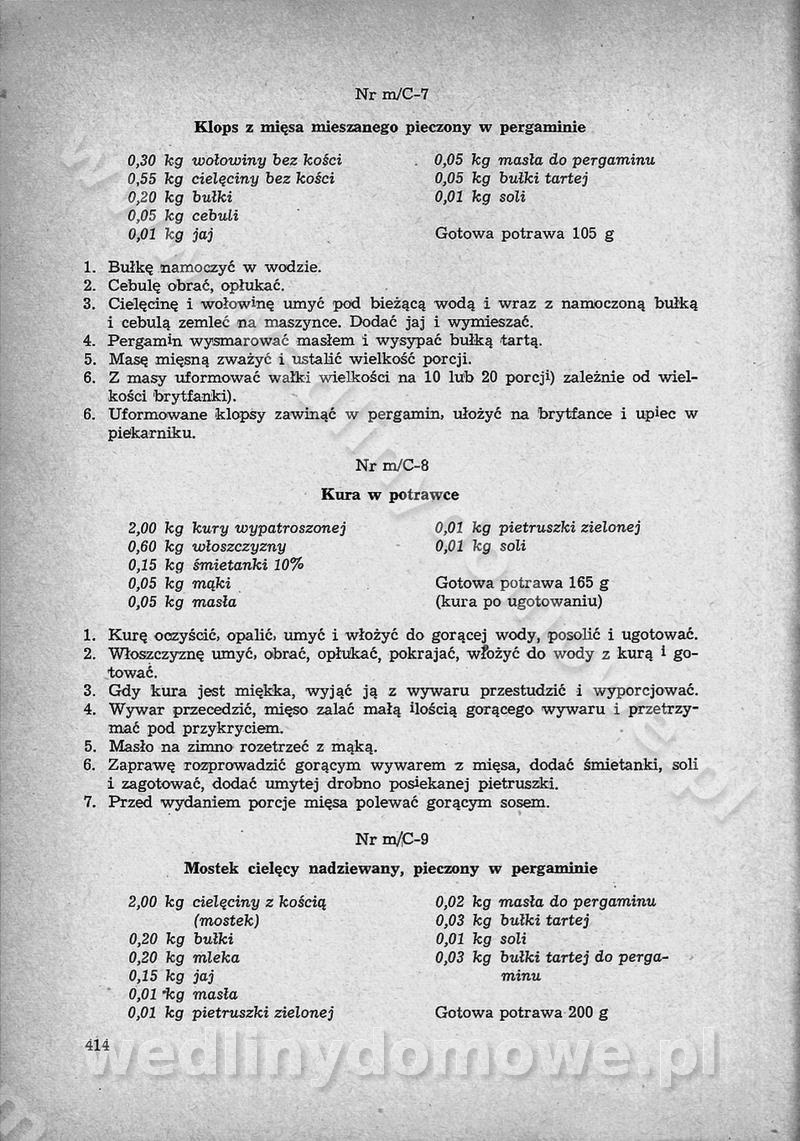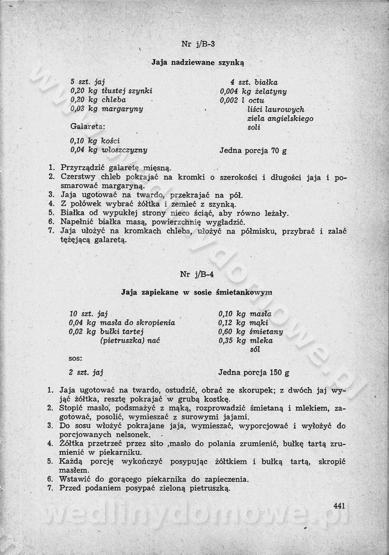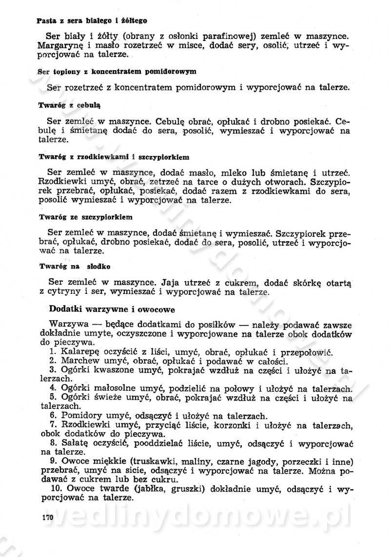 SPIS TREŚCI CZĘŚĆ I TEORETYCZNE PODSTAWY RACJONALNEGO ŻYWIENIA ZBIOROWEGO inż. Krystyna Wolf I. WSKAZÓWKI DO REALIZACJI NORM ŻYWIENIA WYRAŻONYCH W CAŁODZIENNYCH RACJACH POKARMOWYCH II. SKŁADNIKI POKARMOWE I ICH ROLA W ŻYWIENIU Zawartość składników pokarmowych w produktach Rola pożywienia Składniki pokarmowe Wzajemne zależności między składnikami pokarmowymi III. NORMY WYŻYWIENIA Normy zapotrzebowania na składniki pokarmowe Podział produktów Podział produktów na 2 grupy Podział produktów na 9 grup Podział produktów na 12 grup Całodzienne racje pokarmowe Zamiana produktów IV. WYTYCZNE PLANOWANIA ZESTAWU CAŁODZIENNYCH POSIŁKÓW Zasady podziału całodziennych racji pokarmowych na poszczególne posiłki Śniadanie Obiad Kolacja Wytyczne układania jadłospisów Kontrola prawidłowości planowania jadłospisów V. PROCESY TECHNOLOGICZNE, ICH CEL, PRZEBIEG I WPŁYW NA WARTOŚĆ ODŻYWCZĄ POTRAW Cel procesu technologicznego Obróbka wstępna i termiczna Ogólne wskazówki technologiczne Wykończanie potraw VI. WSKAZÓWKI PRAKTYCZNE DOTYCZĄCE KORZYSTANIA Z RECEPTUR CZĘŚĆ II RECEPTURY I. ZUPY inż. Jadwiga Celczyńska Podstawowe zasady sporządzania Sporządzanie wywarów Podział zup Przygotowanie głównych składników zup Wykończanie zup Rodzaje zup Zupy czyste Zupy zabielane Zupy zasmażane Zupy rozklejane Zupy mleczne Zupy owocowe Zupy z wkładką pełnowartościowego białka — samodzielne dania obiadowe lub kolacyjne Zupy czyste (normatyw surowcowy na 10 porcji) Zakwas burakowy na barszcz Zakwas na żur Barszcz burakowy czysty Barszcz czerwony czysty z zagęszczonego soku buraczanego Barszcz burakowy jarski Bulion jarski Rosół z wołowiny Zupa grzybowa czysta Zupa pomidorowa czysta Zupy rozklejane (normatyw surowcowy na 10 porcji) Krupnik na podrobach Krupnik zabielany Krupnik ze słoniną Krupnik z ryżu z jarzynami Zupa grochowa z pęczakiem Zupa grochowa z ziemniakami Zupa rumfordzka Zupa ziemniaczana z fasolą Zalewajka Zalewajka z kwaśnym mlekiem Żur z kiełbasą i boczkiem Żur na podrobach zabielany Zupy zasmażane (normatyw surowcowy na 10 porcji) Kapuśniak z kwaszonej kapusty z papryką Kapuśniak mazurski z kwaszonej kapusty Kapuśniak ze słodkiej kapusty Kapuśniak ze słodkiej kapusty z jabłkami Kapuśniak z czerwonej kapusty Zacierka z ziemniakami Zupa cebulowa Zupa z dyni i pomidorów Zupa fasolowa z makaronem Zupa fasolowa z ziemniakami Zupa z flaków wołowych Zupa „garbure” Zupa grzybowa Zupa jarzynowa z papryką Zupa jarzynowa z fasolą Zupa jarzynowa (jesienna) Zupa jarzynowa z makaronem i serem Zupa z kaszy manny zasmażana Zupa neapolitańska Zupa pomidorowa zasmażana Zupa z porów Zupa z selerów Zupa ziemniaczana zasmażana Zupa ziemniaczana z pomidorami Zupy mleczne (normatyw surowcowy na 10 porcji) Kukurydzanka na mleku Manna na mleku Ryż na mleku Makaron na mleku Płatki owsiane na mleku Zupa z dyni na mleku z tartym ciastem Zupa „nic” Zupa mleczna z lanym ciastem Zupa ze zsiadłego mleka Zupy zabielane (normatyw surowcowy na 10 porcji) Barszcz czerwony zabielany Barszcz czerwony zabielany z suszu Barszcz ukraiński Barszcz czeski Barszcz z botwiną Barszcz jarski z botwiną Chłodnik z botwiną Chłodnik z botwiną na mleku Kapuśniak ze słodkiej kapusty zabielany Kapuśniak na głowiźnie Zupa z brukselki zabielana Zupa cytrynowa Zupa z fasolki szparagowej Zupa grzybowa zabielana Zupa kalafiorowa Zupa koperkowa Zupa ogórkowa Zupa pomidorowa Zupa rybna Zupa szczawiowa Zupa pieczarkowa Zupa ze szpinaku Zupa z młodych jarzyn zabielana Zupa jarzynowa zabielana z mrożonek Zupa ziemniaczana „Paysanne” Pejzanka z puree ziemniaczanym Zupa z młodych ziemniaków Zupa ziemniaczana z porami Zupa z zielonego groszku Zupy owocowe (normatyw surowcowy na 10 porcji) Chłodnik z czarnych jagód Chłodnik truskawkowy Zupa z czarnych jagód Zupa jabłkowa Zupa jabłkowa zabielana Zupa z jabłek i śliwek Zupa ze śliwek Zupa z owoców mieszanych Zupa owocowa z suszu jabłkowego i marmolady Zupa owocowa czysta Zupa z powideł śliwkowych Zupa rabarbarowa Zupa z suszonych śliwek Zupa truskawkowa Zupa z truskawek i rabarbaru Zupy z wkładką mięsną (normatyw surowcowy na 10 porcji) Barszcz małorosyjski na rosole z mięsem Barszcz z ziemniakami i serdelkami Grochówka z mięsem i ziemniakami Kapuśniak z kwaszonej kapusty z kiełbasą Kapuśniak ze słodkiej kapusty z pomidorami i mięsem Krupnik z ryżu na mięsie Krupnik na mięsie Pejzanka na żeberkach Zupa z fasolki szparagowej na mięsie Zupa fasolowa z mięsem i makaronem Zupa jarzynowa z mięsem Gulaszowa polewka Zupa koperkowa na mięsie Zupa ogórkowa z ziemniakami na mięsie Zupa pomidorowa z makaronem i mięsem Zupa z porów z ziemniakami i wątróbką Zupa wiosenna z jajami Zupa ziemniaczana z mięsem Żur z kiełbasą i ziemniakami II. POTRAWY MIĘSNE inż. Krystyna Wolf Podstawowe zasady sporządzania Zachowanie wartości odżywczej dań mięsnych Cechy prawidłowo przyrządzonego mięsa Przechowywanie Rozmrażanie mięsa Rozbiór tuszy zwierząt rzeźnych Obróbka wstępna Obróbka termiczna Potrawy z baraniny (normatyw surowcowy na 10 porcji) Potrawka z baraniny Kotlet barani mielony Kotlet barani mielony z ryżem Baranina w warzywach Ragout baranie Baranina duszona Potrawy z cielęciny (normatyw surowcowy na 10 porcji) Potrawka cielęca Pulpety cielęce Kotlet cielęcy mielony Klopsiki cielęce do sosów Sznycel cielęcy (mielony) Filet cielęcy (do sosów i dodatków) Zrazy cielęce bite (do sosów) Zrazy cielęce nadziewane słoniną Sznycel cielęcy Zrazy cielęce po polsku (faszerowane) Paprykarz cielęcy Pieczeń cielęca duszona Pieczeń cielęca Mostek cielęcy po wiedeńsku Mostek cielęcy faszerowany Rolada cielęca faszerowana Potrawy z wieprzowiny (normatyw surowcowy na 10 porcji) Mięso wieprzowe gotowane Peklówka wieprzowa gotowana Filet wieprzowy saute Kotlet wieprzowy mielony Zraz wieprzowy (klopsik) mielony do sosów Kotlet miel