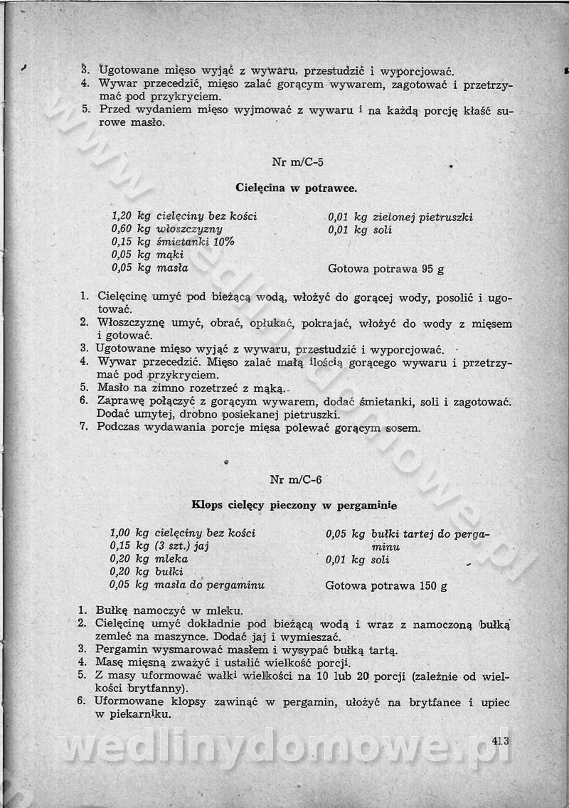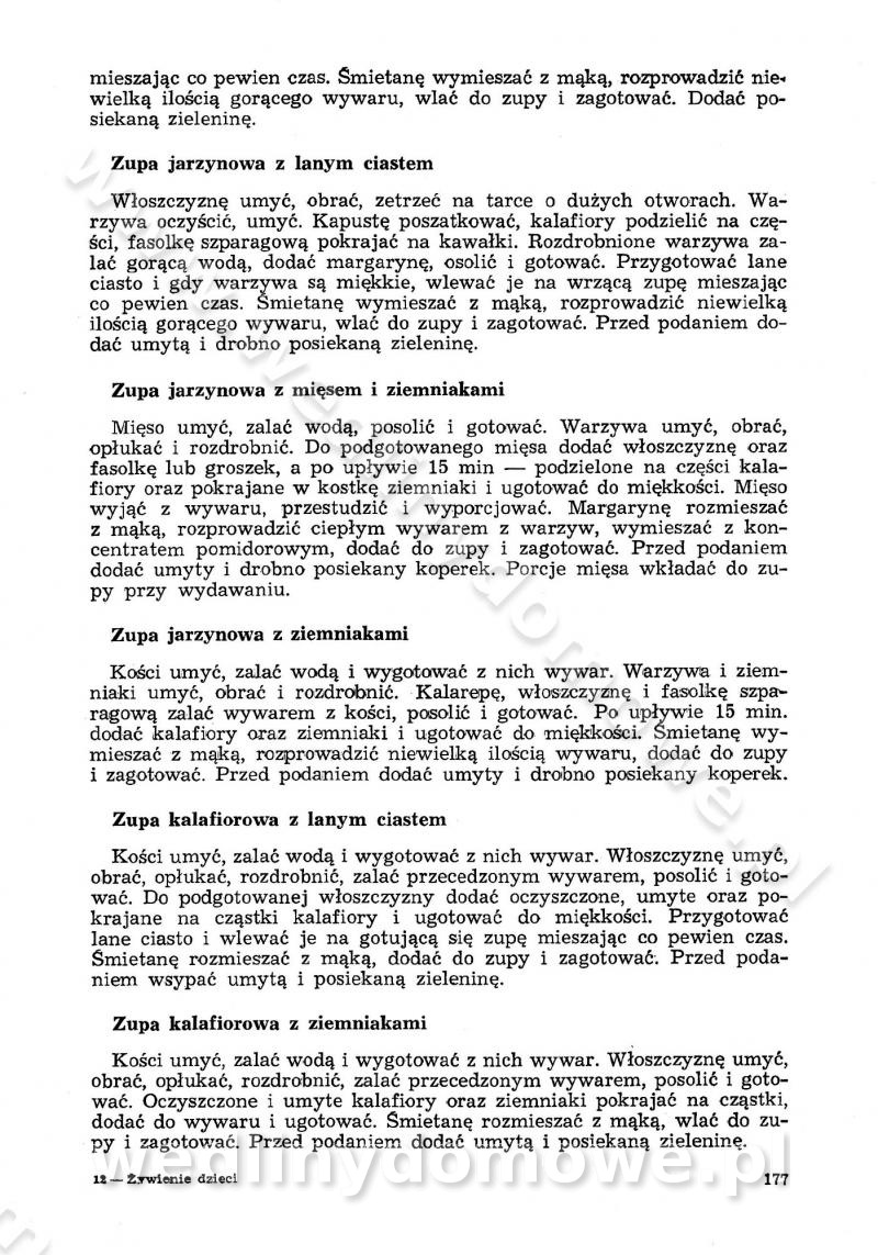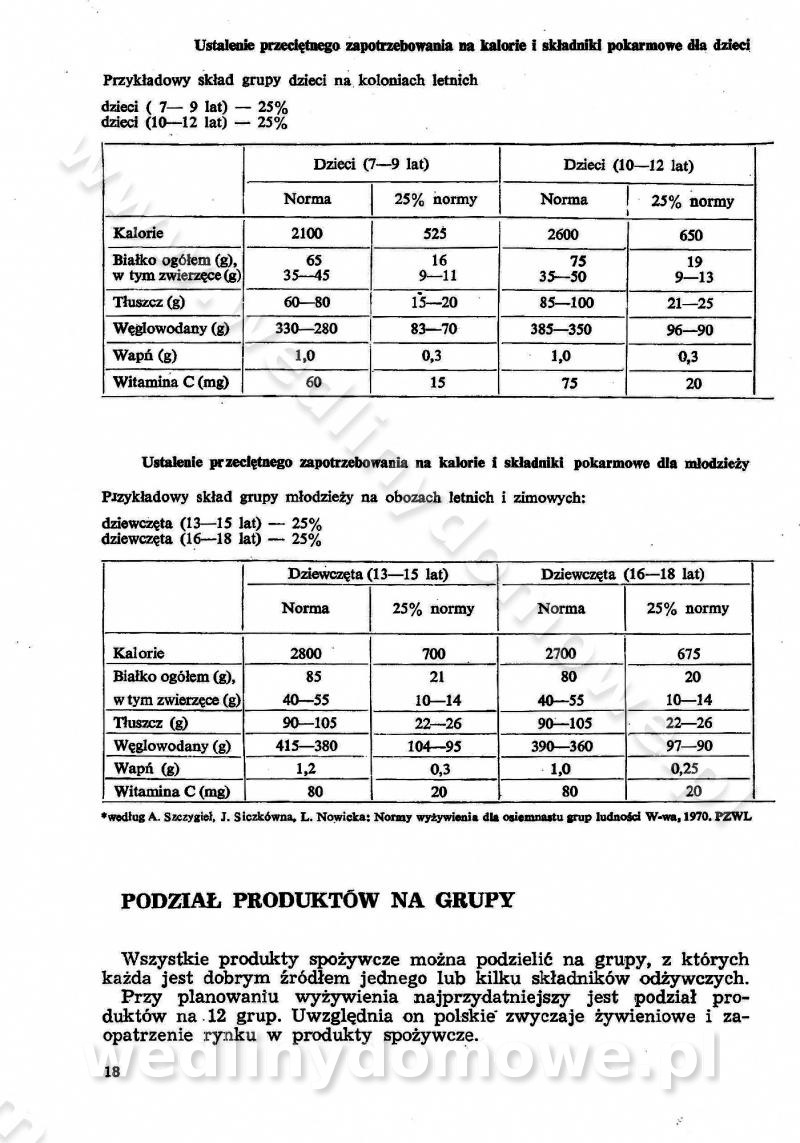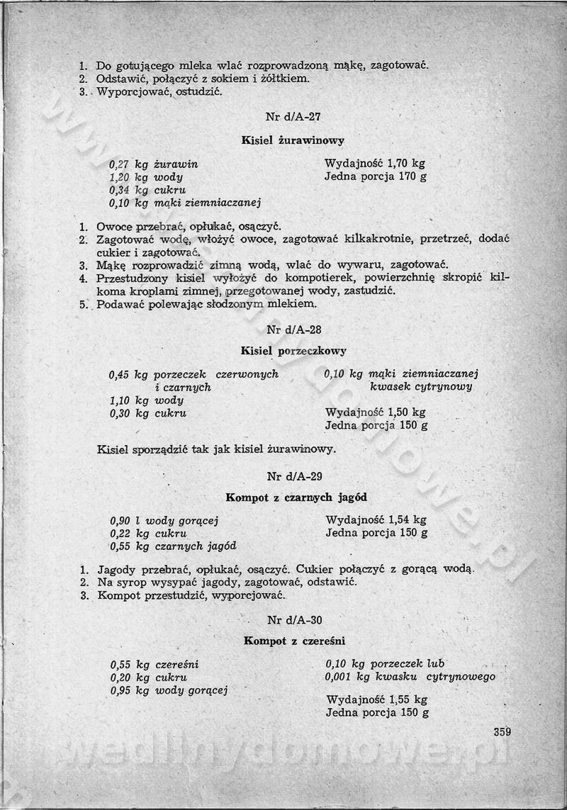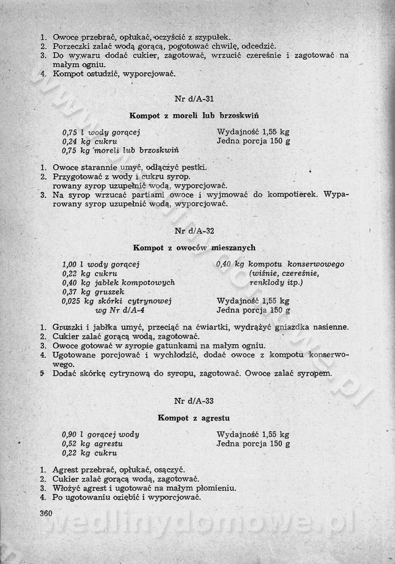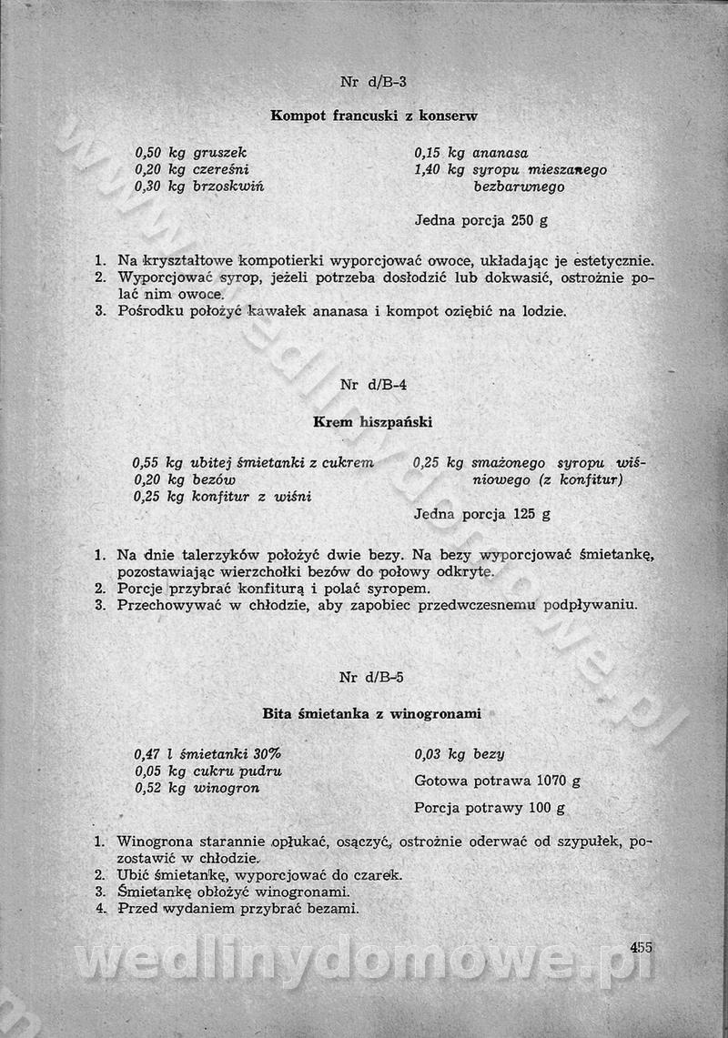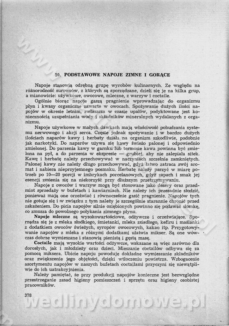 SPIS TREŚCI CZĘŚĆ I TEORETYCZNE PODSTAWY RACJONALNEGO ŻYWIENIA ZBIOROWEGO inż. Krystyna Wolf I. WSKAZÓWKI DO REALIZACJI NORM ŻYWIENIA WYRAŻONYCH W CAŁODZIENNYCH RACJACH POKARMOWYCH II. SKŁADNIKI POKARMOWE I ICH ROLA W ŻYWIENIU Zawartość składników pokarmowych w produktach Rola pożywienia Składniki pokarmowe Wzajemne zależności między składnikami pokarmowymi III. NORMY WYŻYWIENIA Normy zapotrzebowania na składniki pokarmowe Podział produktów Podział produktów na 2 grupy Podział produktów na 9 grup Podział produktów na 12 grup Całodzienne racje pokarmowe Zamiana produktów IV. WYTYCZNE PLANOWANIA ZESTAWU CAŁODZIENNYCH POSIŁKÓW Zasady podziału całodziennych racji pokarmowych na poszczególne posiłki Śniadanie Obiad Kolacja Wytyczne układania jadłospisów Kontrola prawidłowości planowania jadłospisów V. PROCESY TECHNOLOGICZNE, ICH CEL, PRZEBIEG I WPŁYW NA WARTOŚĆ ODŻYWCZĄ POTRAW Cel procesu technologicznego Obróbka wstępna i termiczna Ogólne wskazówki technologiczne Wykończanie potraw VI. WSKAZÓWKI PRAKTYCZNE DOTYCZĄCE KORZYSTANIA Z RECEPTUR CZĘŚĆ II RECEPTURY I. ZUPY inż. Jadwiga Celczyńska Podstawowe zasady sporządzania Sporządzanie wywarów Podział zup Przygotowanie głównych składników zup Wykończanie zup Rodzaje zup Zupy czyste Zupy zabielane Zupy zasmażane Zupy rozklejane Zupy mleczne Zupy owocowe Zupy z wkładką pełnowartościowego białka — samodzielne dania obiadowe lub kolacyjne Zupy czyste (normatyw surowcowy na 10 porcji) Zakwas burakowy na barszcz Zakwas na żur Barszcz burakowy czysty Barszcz czerwony czysty z zagęszczonego soku buraczanego Barszcz burakowy jarski Bulion jarski Rosół z wołowiny Zupa grzybowa czysta Zupa pomidorowa czysta Zupy rozklejane (normatyw surowcowy na 10 porcji) Krupnik na podrobach Krupnik zabielany Krupnik ze słoniną Krupnik z ryżu z jarzynami Zupa grochowa z pęczakiem Zupa grochowa z ziemniakami Zupa rumfordzka Zupa ziemniaczana z fasolą Zalewajka Zalewajka z kwaśnym mlekiem Żur z kiełbasą i boczkiem Żur na podrobach zabielany Zupy zasmażane (normatyw surowcowy na 10 porcji) Kapuśniak z kwaszonej kapusty z papryką Kapuśniak mazurski z kwaszonej kapusty Kapuśniak ze słodkiej kapusty Kapuśniak ze słodkiej kapusty z jabłkami Kapuśniak z czerwonej kapusty Zacierka z ziemniakami Zupa cebulowa Zupa z dyni i pomidorów Zupa fasolowa z makaronem Zupa fasolowa z ziemniakami Zupa z flaków wołowych Zupa „garbure” Zupa grzybowa Zupa jarzynowa z papryką Zupa jarzynowa z fasolą Zupa jarzynowa (jesienna) Zupa jarzynowa z makaronem i serem Zupa z kaszy manny zasmażana Zupa neapolitańska Zupa pomidorowa zasmażana Zupa z porów Zupa z selerów Zupa ziemniaczana zasmażana Zupa ziemniaczana z pomidorami Zupy mleczne (normatyw surowcowy na 10 porcji) Kukurydzanka na mleku Manna na mleku Ryż na mleku Makaron na mleku Płatki owsiane na mleku Zupa z dyni na mleku z tartym ciastem Zupa „nic” Zupa mleczna z lanym ciastem Zupa ze zsiadłego mleka Zupy zabielane (normatyw surowcowy na 10 porcji) Barszcz czerwony zabielany Barszcz czerwony zabielany z suszu Barszcz ukraiński Barszcz czeski Barszcz z botwiną Barszcz jarski z botwiną Chłodnik z botwiną Chłodnik z botwiną na mleku Kapuśniak ze słodkiej kapusty zabielany Kapuśniak na głowiźnie Zupa z brukselki zabielana Zupa cytrynowa Zupa z fasolki szparagowej Zupa grzybowa zabielana Zupa kalafiorowa Zupa koperkowa Zupa ogórkowa Zupa pomidorowa Zupa rybna Zupa szczawiowa Zupa pieczarkowa Zupa ze szpinaku Zupa z młodych jarzyn zabielana Zupa jarzynowa zabielana z mrożonek Zupa ziemniaczana „Paysanne” Pejzanka z puree ziemniaczanym Zupa z młodych ziemniaków Zupa ziemniaczana z porami Zupa z zielonego groszku Zupy owocowe (normatyw surowcowy na 10 porcji) Chłodnik z czarnych jagód Chłodnik truskawkowy Zupa z czarnych jagód Zupa jabłkowa Zupa jabłkowa zabielana Zupa z jabłek i śliwek Zupa ze śliwek Zupa z owoców mieszanych Zupa owocowa z suszu jabłkowego i marmolady Zupa owocowa czysta Zupa z powideł śliwkowych Zupa rabarbarowa Zupa z suszonych śliwek Zupa truskawkowa Zupa z truskawek i rabarbaru Zupy z wkładką mięsną (normatyw surowcowy na 10 porcji) Barszcz małorosyjski na rosole z mięsem Barszcz z ziemniakami i serdelkami Grochówka z mięsem i ziemniakami Kapuśniak z kwaszonej kapusty z kiełbasą Kapuśniak ze słodkiej kapusty z pomidorami i mięsem Krupnik z ryżu na mięsie Krupnik na mięsie Pejzanka na żeberkach Zupa z fasolki szparagowej na mięsie Zupa fasolowa z mięsem i makaronem Zupa jarzynowa z mięsem Gulaszowa polewka Zupa koperkowa na mięsie Zupa ogórkowa z ziemniakami na mięsie Zupa pomidorowa z makaronem i mięsem Zupa z porów z ziemniakami i wątróbką Zupa wiosenna z jajami Zupa ziemniaczana z mięsem Żur z kiełbasą i ziemniakami II. POTRAWY MIĘSNE inż. Krystyna Wolf Podstawowe zasady sporządzania Zachowanie wartości odżywczej dań mięsnych Cechy prawidłowo przyrządzonego mięsa Przechowywanie Rozmrażanie mięsa Rozbiór tuszy zwierząt rzeźnych Obróbka wstępna Obróbka termiczna Potrawy z baraniny (normatyw surowcowy na 10 porcji) Potrawka z baraniny Kotlet barani mielony Kotlet barani mielony z ryżem Baranina w warzywach Ragout baranie Baranina duszona Potrawy z cielęciny (normatyw surowcowy na 10 porcji) Potrawka cielęca Pulpety cielęce Kotlet cielęcy mielony Klopsiki cielęce do sosów Sznycel cielęcy (mielony) Filet cielęcy (do sosów i dodatków) Zrazy cielęce bite (do sosów) Zrazy cielęce nadziewane słoniną Sznycel cielęcy Zrazy cielęce po polsku (faszerowane) Paprykarz cielęcy Pieczeń cielęca duszona Pieczeń cielęca Mostek cielęcy po wiedeńsku Mostek cielęcy faszerowany Rolada cielęca faszerowana Potrawy z wieprzowiny (normatyw surowcowy na 10 porcji) Mięso wieprzowe gotowane Peklówka wieprzowa gotowana Filet wieprzowy saute Kotlet wieprzowy mielony Zraz wieprzowy (klopsik) mielony do sosów Kotlet miel
