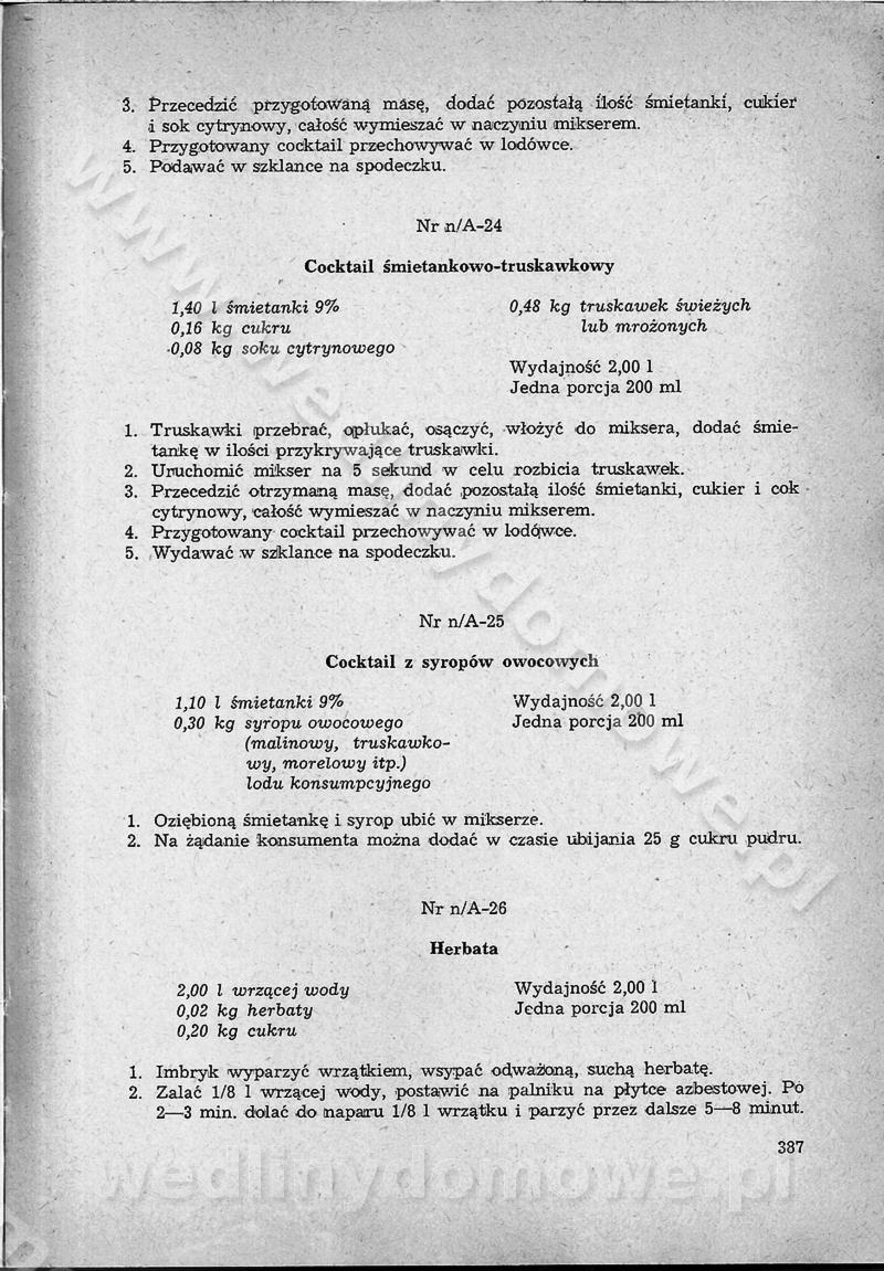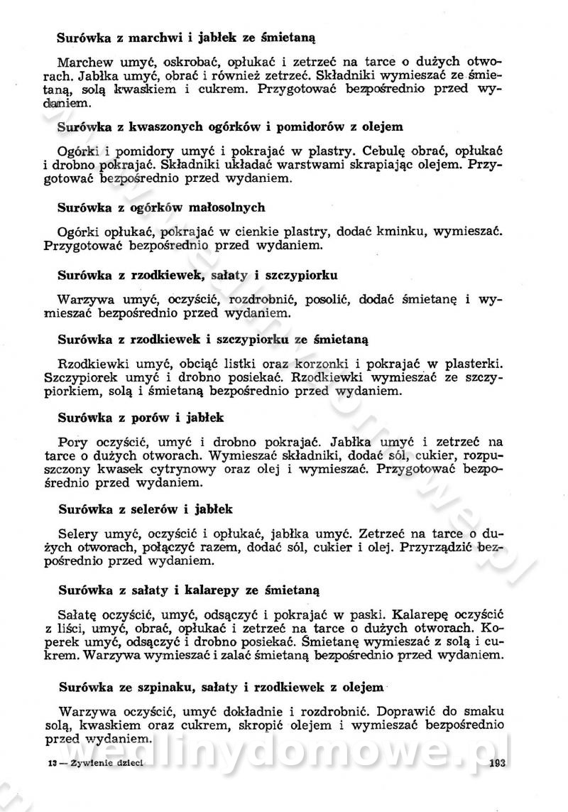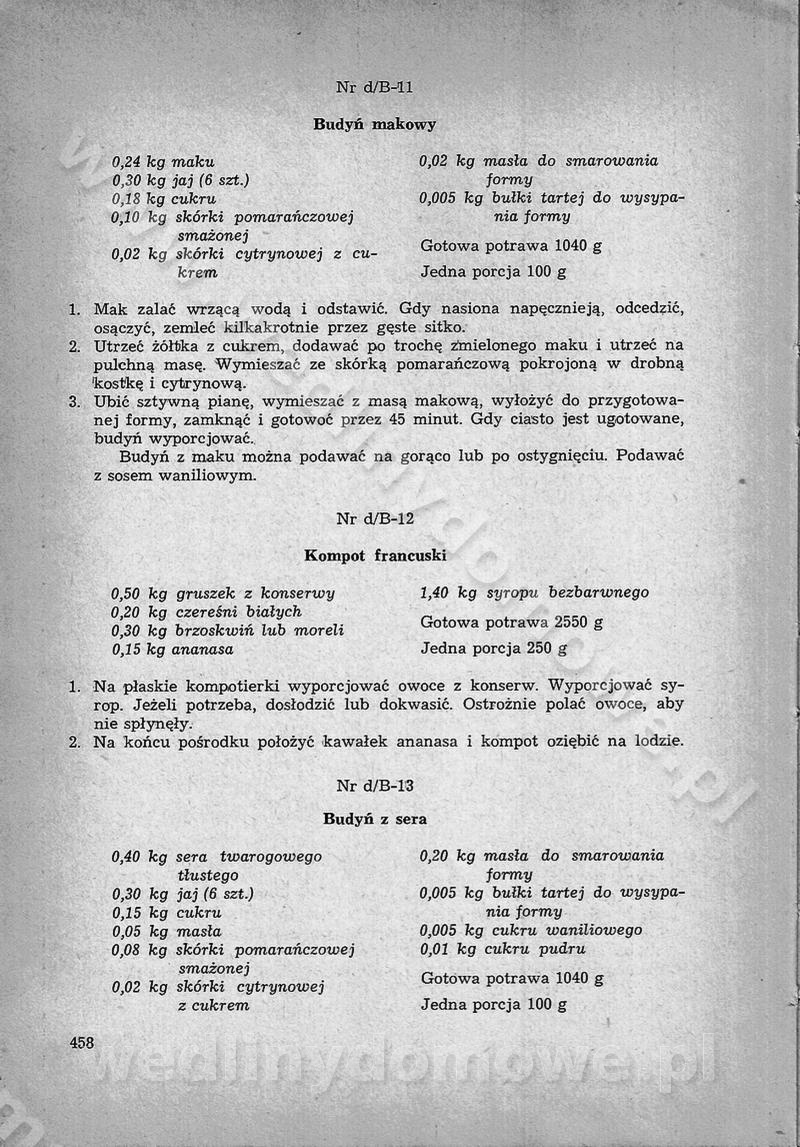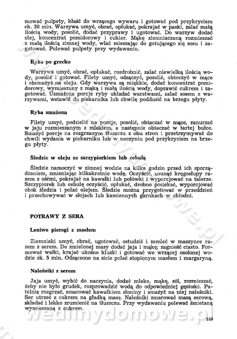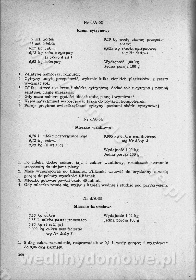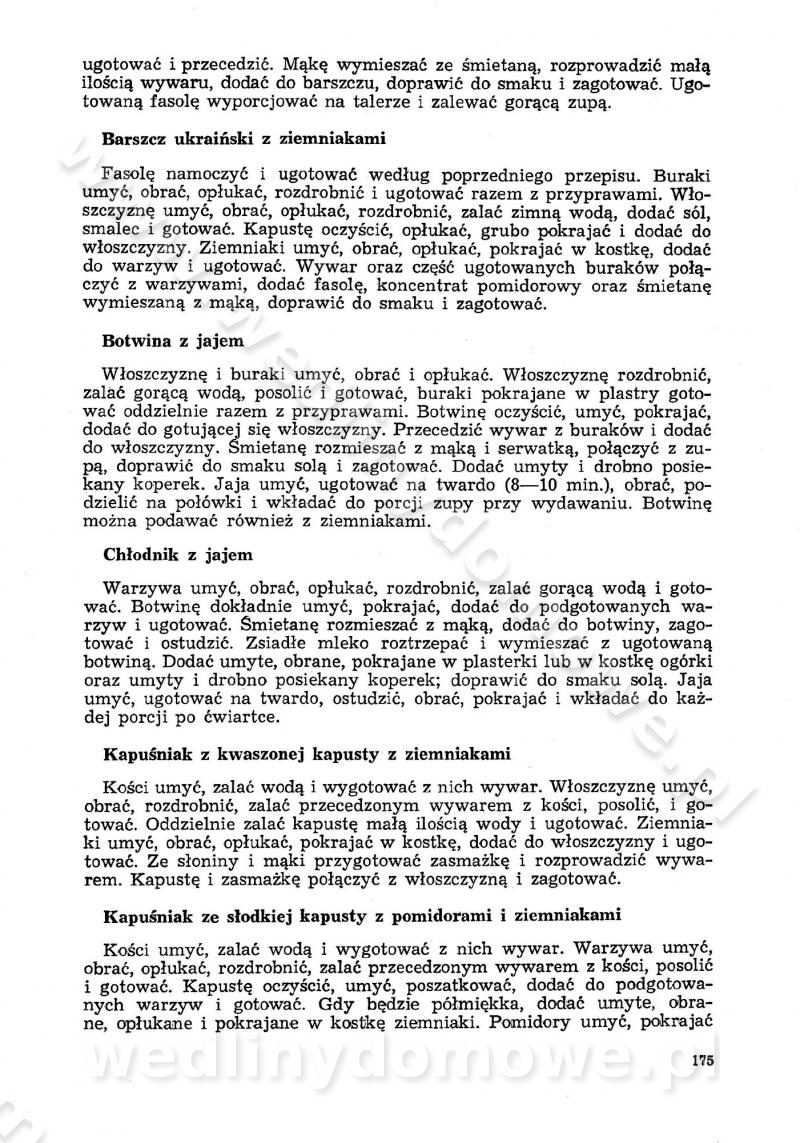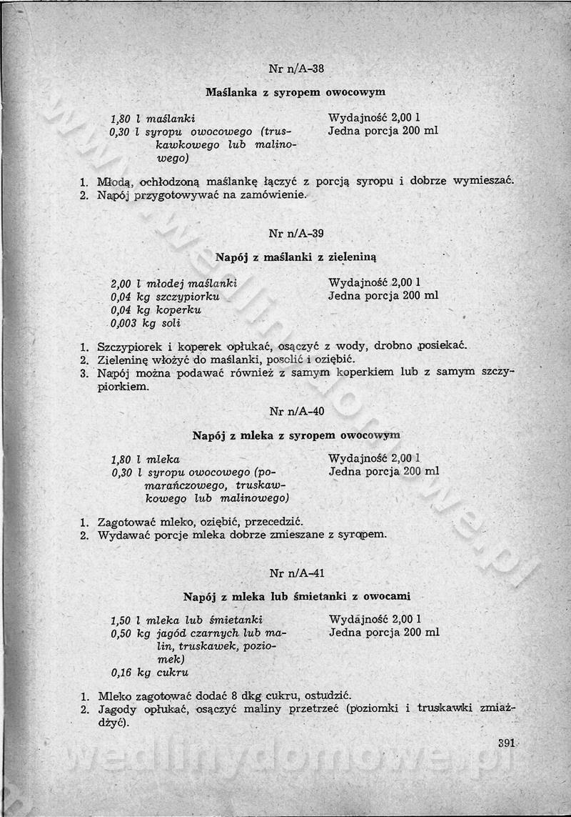 SPIS TREŚCI CZĘŚĆ I TEORETYCZNE PODSTAWY RACJONALNEGO ŻYWIENIA ZBIOROWEGO inż. Krystyna Wolf I. WSKAZÓWKI DO REALIZACJI NORM ŻYWIENIA WYRAŻONYCH W CAŁODZIENNYCH RACJACH POKARMOWYCH II. SKŁADNIKI POKARMOWE I ICH ROLA W ŻYWIENIU Zawartość składników pokarmowych w produktach Rola pożywienia Składniki pokarmowe Wzajemne zależności między składnikami pokarmowymi III. NORMY WYŻYWIENIA Normy zapotrzebowania na składniki pokarmowe Podział produktów Podział produktów na 2 grupy Podział produktów na 9 grup Podział produktów na 12 grup Całodzienne racje pokarmowe Zamiana produktów IV. WYTYCZNE PLANOWANIA ZESTAWU CAŁODZIENNYCH POSIŁKÓW Zasady podziału całodziennych racji pokarmowych na poszczególne posiłki Śniadanie Obiad Kolacja Wytyczne układania jadłospisów Kontrola prawidłowości planowania jadłospisów V. PROCESY TECHNOLOGICZNE, ICH CEL, PRZEBIEG I WPŁYW NA WARTOŚĆ ODŻYWCZĄ POTRAW Cel procesu technologicznego Obróbka wstępna i termiczna Ogólne wskazówki technologiczne Wykończanie potraw VI. WSKAZÓWKI PRAKTYCZNE DOTYCZĄCE KORZYSTANIA Z RECEPTUR CZĘŚĆ II RECEPTURY I. ZUPY inż. Jadwiga Celczyńska Podstawowe zasady sporządzania Sporządzanie wywarów Podział zup Przygotowanie głównych składników zup Wykończanie zup Rodzaje zup Zupy czyste Zupy zabielane Zupy zasmażane Zupy rozklejane Zupy mleczne Zupy owocowe Zupy z wkładką pełnowartościowego białka — samodzielne dania obiadowe lub kolacyjne Zupy czyste (normatyw surowcowy na 10 porcji) Zakwas burakowy na barszcz Zakwas na żur Barszcz burakowy czysty Barszcz czerwony czysty z zagęszczonego soku buraczanego Barszcz burakowy jarski Bulion jarski Rosół z wołowiny Zupa grzybowa czysta Zupa pomidorowa czysta Zupy rozklejane (normatyw surowcowy na 10 porcji) Krupnik na podrobach Krupnik zabielany Krupnik ze słoniną Krupnik z ryżu z jarzynami Zupa grochowa z pęczakiem Zupa grochowa z ziemniakami Zupa rumfordzka Zupa ziemniaczana z fasolą Zalewajka Zalewajka z kwaśnym mlekiem Żur z kiełbasą i boczkiem Żur na podrobach zabielany Zupy zasmażane (normatyw surowcowy na 10 porcji) Kapuśniak z kwaszonej kapusty z papryką Kapuśniak mazurski z kwaszonej kapusty Kapuśniak ze słodkiej kapusty Kapuśniak ze słodkiej kapusty z jabłkami Kapuśniak z czerwonej kapusty Zacierka z ziemniakami Zupa cebulowa Zupa z dyni i pomidorów Zupa fasolowa z makaronem Zupa fasolowa z ziemniakami Zupa z flaków wołowych Zupa „garbure” Zupa grzybowa Zupa jarzynowa z papryką Zupa jarzynowa z fasolą Zupa jarzynowa (jesienna) Zupa jarzynowa z makaronem i serem Zupa z kaszy manny zasmażana Zupa neapolitańska Zupa pomidorowa zasmażana Zupa z porów Zupa z selerów Zupa ziemniaczana zasmażana Zupa ziemniaczana z pomidorami Zupy mleczne (normatyw surowcowy na 10 porcji) Kukurydzanka na mleku Manna na mleku Ryż na mleku Makaron na mleku Płatki owsiane na mleku Zupa z dyni na mleku z tartym ciastem Zupa „nic” Zupa mleczna z lanym ciastem Zupa ze zsiadłego mleka Zupy zabielane (normatyw surowcowy na 10 porcji) Barszcz czerwony zabielany Barszcz czerwony zabielany z suszu Barszcz ukraiński Barszcz czeski Barszcz z botwiną Barszcz jarski z botwiną Chłodnik z botwiną Chłodnik z botwiną na mleku Kapuśniak ze słodkiej kapusty zabielany Kapuśniak na głowiźnie Zupa z brukselki zabielana Zupa cytrynowa Zupa z fasolki szparagowej Zupa grzybowa zabielana Zupa kalafiorowa Zupa koperkowa Zupa ogórkowa Zupa pomidorowa Zupa rybna Zupa szczawiowa Zupa pieczarkowa Zupa ze szpinaku Zupa z młodych jarzyn zabielana Zupa jarzynowa zabielana z mrożonek Zupa ziemniaczana „Paysanne” Pejzanka z puree ziemniaczanym Zupa z młodych ziemniaków Zupa ziemniaczana z porami Zupa z zielonego groszku Zupy owocowe (normatyw surowcowy na 10 porcji) Chłodnik z czarnych jagód Chłodnik truskawkowy Zupa z czarnych jagód Zupa jabłkowa Zupa jabłkowa zabielana Zupa z jabłek i śliwek Zupa ze śliwek Zupa z owoców mieszanych Zupa owocowa z suszu jabłkowego i marmolady Zupa owocowa czysta Zupa z powideł śliwkowych Zupa rabarbarowa Zupa z suszonych śliwek Zupa truskawkowa Zupa z truskawek i rabarbaru Zupy z wkładką mięsną (normatyw surowcowy na 10 porcji) Barszcz małorosyjski na rosole z mięsem Barszcz z ziemniakami i serdelkami Grochówka z mięsem i ziemniakami Kapuśniak z kwaszonej kapusty z kiełbasą Kapuśniak ze słodkiej kapusty z pomidorami i mięsem Krupnik z ryżu na mięsie Krupnik na mięsie Pejzanka na żeberkach Zupa z fasolki szparagowej na mięsie Zupa fasolowa z mięsem i makaronem Zupa jarzynowa z mięsem Gulaszowa polewka Zupa koperkowa na mięsie Zupa ogórkowa z ziemniakami na mięsie Zupa pomidorowa z makaronem i mięsem Zupa z porów z ziemniakami i wątróbką Zupa wiosenna z jajami Zupa ziemniaczana z mięsem Żur z kiełbasą i ziemniakami II. POTRAWY MIĘSNE inż. Krystyna Wolf Podstawowe zasady sporządzania Zachowanie wartości odżywczej dań mięsnych Cechy prawidłowo przyrządzonego mięsa Przechowywanie Rozmrażanie mięsa Rozbiór tuszy zwierząt rzeźnych Obróbka wstępna Obróbka termiczna Potrawy z baraniny (normatyw surowcowy na 10 porcji) Potrawka z baraniny Kotlet barani mielony Kotlet barani mielony z ryżem Baranina w warzywach Ragout baranie Baranina duszona Potrawy z cielęciny (normatyw surowcowy na 10 porcji) Potrawka cielęca Pulpety cielęce Kotlet cielęcy mielony Klopsiki cielęce do sosów Sznycel cielęcy (mielony) Filet cielęcy (do sosów i dodatków) Zrazy cielęce bite (do sosów) Zrazy cielęce nadziewane słoniną Sznycel cielęcy Zrazy cielęce po polsku (faszerowane) Paprykarz cielęcy Pieczeń cielęca duszona Pieczeń cielęca Mostek cielęcy po wiedeńsku Mostek cielęcy faszerowany Rolada cielęca faszerowana Potrawy z wieprzowiny (normatyw surowcowy na 10 porcji) Mięso wieprzowe gotowane Peklówka wieprzowa gotowana Filet wieprzowy saute Kotlet wieprzowy mielony Zraz wieprzowy (klopsik) mielony do sosów Kotlet miel