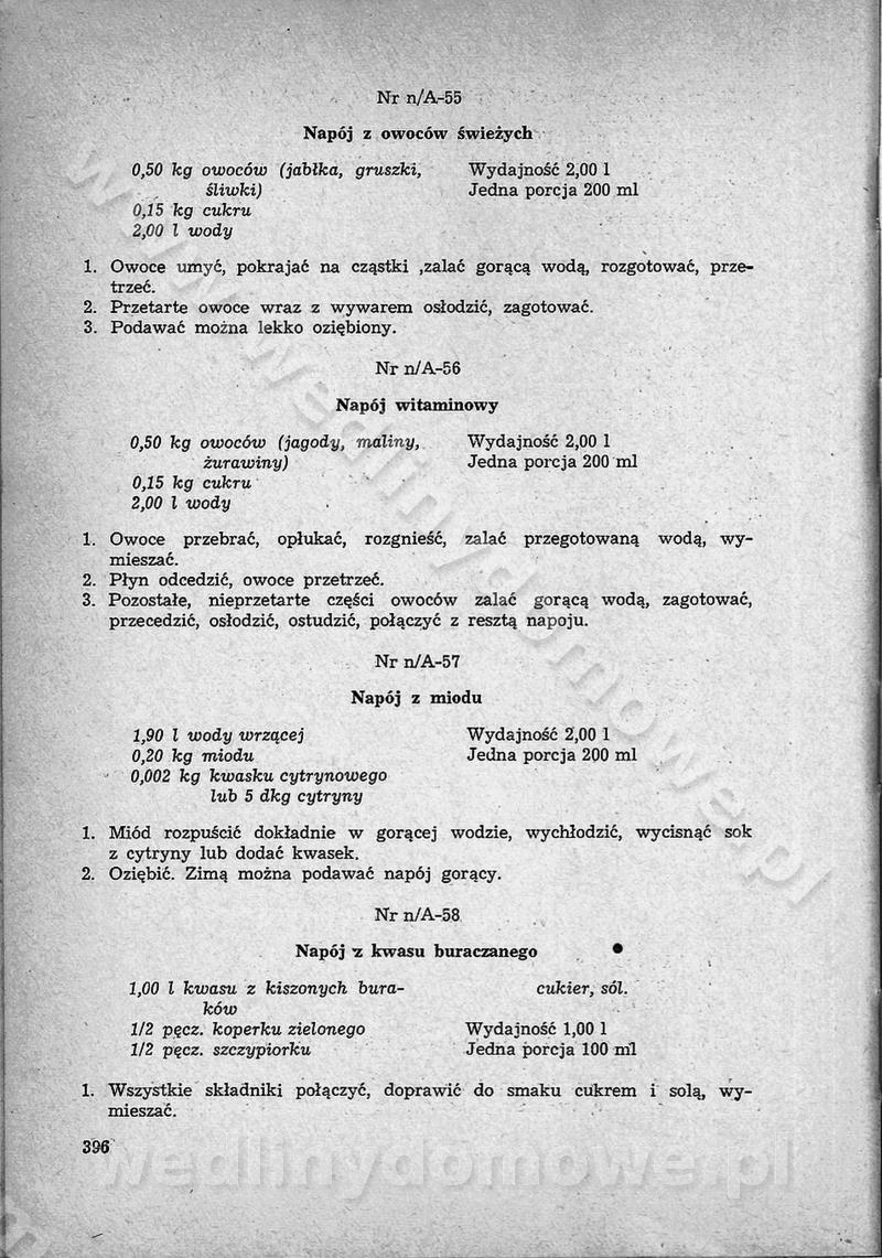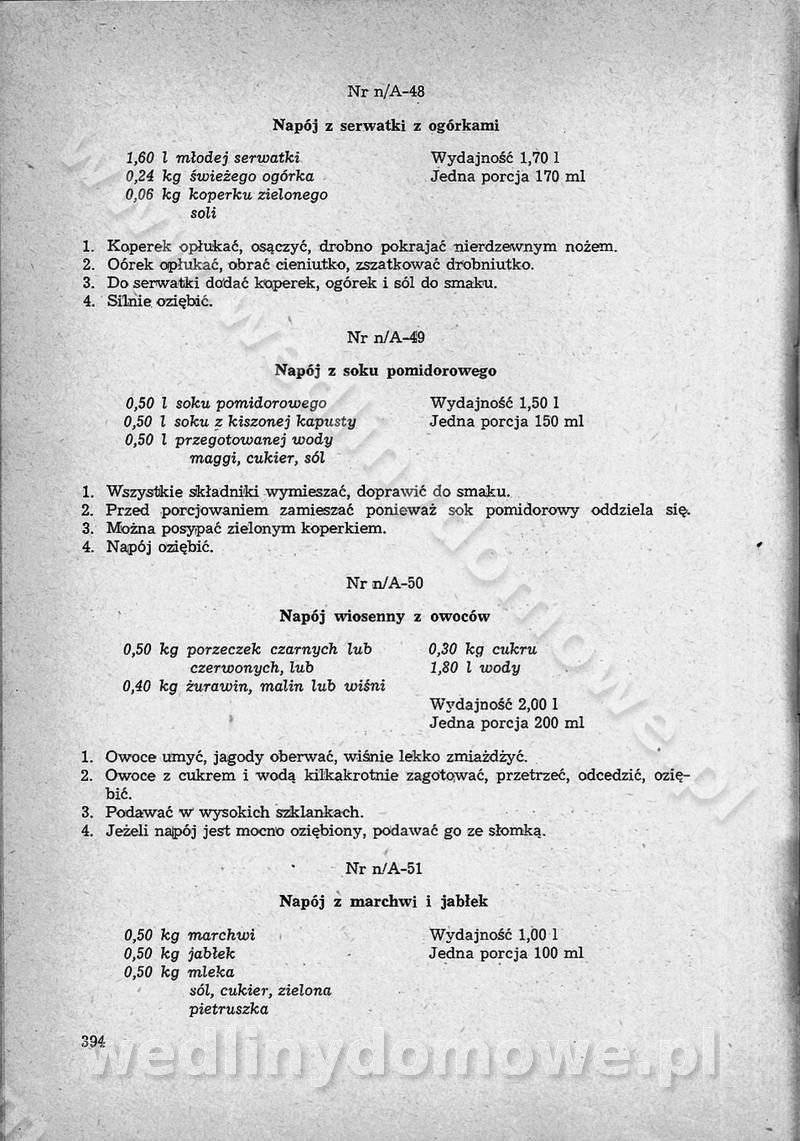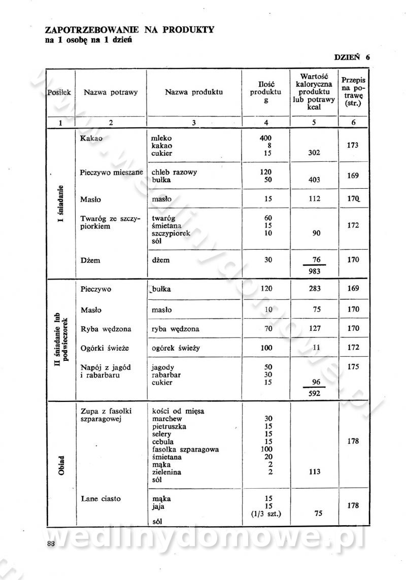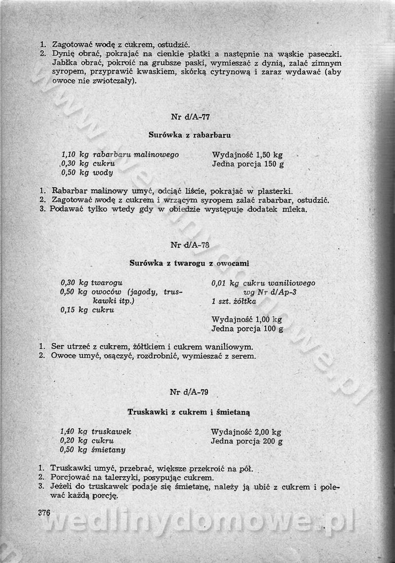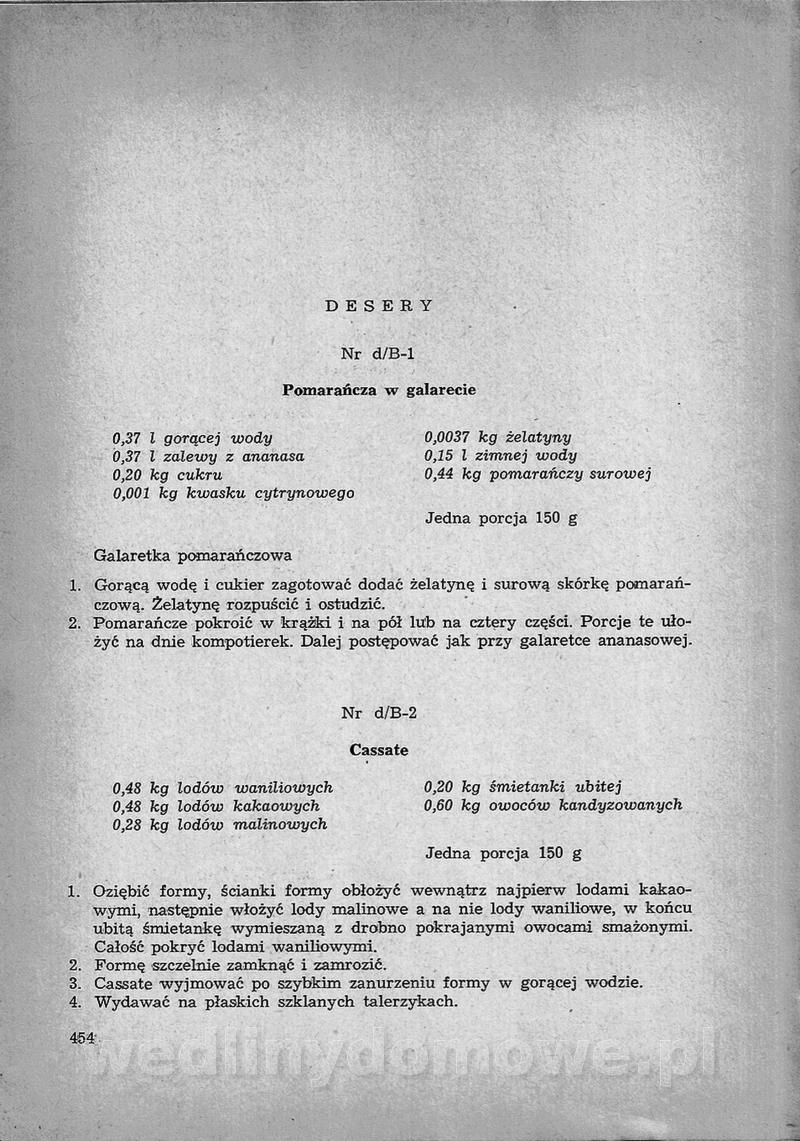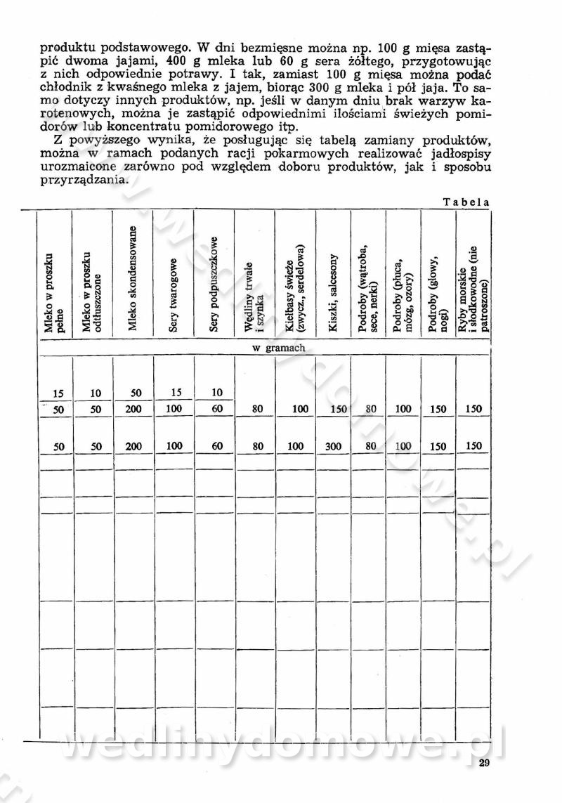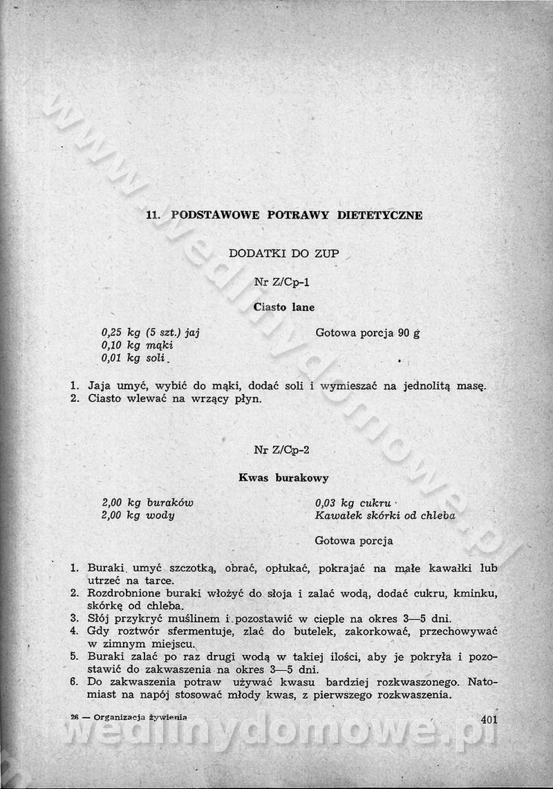 SPIS TREŚCI CZĘŚĆ I TEORETYCZNE PODSTAWY RACJONALNEGO ŻYWIENIA ZBIOROWEGO inż. Krystyna Wolf I. WSKAZÓWKI DO REALIZACJI NORM ŻYWIENIA WYRAŻONYCH W CAŁODZIENNYCH RACJACH POKARMOWYCH II. SKŁADNIKI POKARMOWE I ICH ROLA W ŻYWIENIU Zawartość składników pokarmowych w produktach Rola pożywienia Składniki pokarmowe Wzajemne zależności między składnikami pokarmowymi III. NORMY WYŻYWIENIA Normy zapotrzebowania na składniki pokarmowe Podział produktów Podział produktów na 2 grupy Podział produktów na 9 grup Podział produktów na 12 grup Całodzienne racje pokarmowe Zamiana produktów IV. WYTYCZNE PLANOWANIA ZESTAWU CAŁODZIENNYCH POSIŁKÓW Zasady podziału całodziennych racji pokarmowych na poszczególne posiłki Śniadanie Obiad Kolacja Wytyczne układania jadłospisów Kontrola prawidłowości planowania jadłospisów V. PROCESY TECHNOLOGICZNE, ICH CEL, PRZEBIEG I WPŁYW NA WARTOŚĆ ODŻYWCZĄ POTRAW Cel procesu technologicznego Obróbka wstępna i termiczna Ogólne wskazówki technologiczne Wykończanie potraw VI. WSKAZÓWKI PRAKTYCZNE DOTYCZĄCE KORZYSTANIA Z RECEPTUR CZĘŚĆ II RECEPTURY I. ZUPY inż. Jadwiga Celczyńska Podstawowe zasady sporządzania Sporządzanie wywarów Podział zup Przygotowanie głównych składników zup Wykończanie zup Rodzaje zup Zupy czyste Zupy zabielane Zupy zasmażane Zupy rozklejane Zupy mleczne Zupy owocowe Zupy z wkładką pełnowartościowego białka — samodzielne dania obiadowe lub kolacyjne Zupy czyste (normatyw surowcowy na 10 porcji) Zakwas burakowy na barszcz Zakwas na żur Barszcz burakowy czysty Barszcz czerwony czysty z zagęszczonego soku buraczanego Barszcz burakowy jarski Bulion jarski Rosół z wołowiny Zupa grzybowa czysta Zupa pomidorowa czysta Zupy rozklejane (normatyw surowcowy na 10 porcji) Krupnik na podrobach Krupnik zabielany Krupnik ze słoniną Krupnik z ryżu z jarzynami Zupa grochowa z pęczakiem Zupa grochowa z ziemniakami Zupa rumfordzka Zupa ziemniaczana z fasolą Zalewajka Zalewajka z kwaśnym mlekiem Żur z kiełbasą i boczkiem Żur na podrobach zabielany Zupy zasmażane (normatyw surowcowy na 10 porcji) Kapuśniak z kwaszonej kapusty z papryką Kapuśniak mazurski z kwaszonej kapusty Kapuśniak ze słodkiej kapusty Kapuśniak ze słodkiej kapusty z jabłkami Kapuśniak z czerwonej kapusty Zacierka z ziemniakami Zupa cebulowa Zupa z dyni i pomidorów Zupa fasolowa z makaronem Zupa fasolowa z ziemniakami Zupa z flaków wołowych Zupa „garbure” Zupa grzybowa Zupa jarzynowa z papryką Zupa jarzynowa z fasolą Zupa jarzynowa (jesienna) Zupa jarzynowa z makaronem i serem Zupa z kaszy manny zasmażana Zupa neapolitańska Zupa pomidorowa zasmażana Zupa z porów Zupa z selerów Zupa ziemniaczana zasmażana Zupa ziemniaczana z pomidorami Zupy mleczne (normatyw surowcowy na 10 porcji) Kukurydzanka na mleku Manna na mleku Ryż na mleku Makaron na mleku Płatki owsiane na mleku Zupa z dyni na mleku z tartym ciastem Zupa „nic” Zupa mleczna z lanym ciastem Zupa ze zsiadłego mleka Zupy zabielane (normatyw surowcowy na 10 porcji) Barszcz czerwony zabielany Barszcz czerwony zabielany z suszu Barszcz ukraiński Barszcz czeski Barszcz z botwiną Barszcz jarski z botwiną Chłodnik z botwiną Chłodnik z botwiną na mleku Kapuśniak ze słodkiej kapusty zabielany Kapuśniak na głowiźnie Zupa z brukselki zabielana Zupa cytrynowa Zupa z fasolki szparagowej Zupa grzybowa zabielana Zupa kalafiorowa Zupa koperkowa Zupa ogórkowa Zupa pomidorowa Zupa rybna Zupa szczawiowa Zupa pieczarkowa Zupa ze szpinaku Zupa z młodych jarzyn zabielana Zupa jarzynowa zabielana z mrożonek Zupa ziemniaczana „Paysanne” Pejzanka z puree ziemniaczanym Zupa z młodych ziemniaków Zupa ziemniaczana z porami Zupa z zielonego groszku Zupy owocowe (normatyw surowcowy na 10 porcji) Chłodnik z czarnych jagód Chłodnik truskawkowy Zupa z czarnych jagód Zupa jabłkowa Zupa jabłkowa zabielana Zupa z jabłek i śliwek Zupa ze śliwek Zupa z owoców mieszanych Zupa owocowa z suszu jabłkowego i marmolady Zupa owocowa czysta Zupa z powideł śliwkowych Zupa rabarbarowa Zupa z suszonych śliwek Zupa truskawkowa Zupa z truskawek i rabarbaru Zupy z wkładką mięsną (normatyw surowcowy na 10 porcji) Barszcz małorosyjski na rosole z mięsem Barszcz z ziemniakami i serdelkami Grochówka z mięsem i ziemniakami Kapuśniak z kwaszonej kapusty z kiełbasą Kapuśniak ze słodkiej kapusty z pomidorami i mięsem Krupnik z ryżu na mięsie Krupnik na mięsie Pejzanka na żeberkach Zupa z fasolki szparagowej na mięsie Zupa fasolowa z mięsem i makaronem Zupa jarzynowa z mięsem Gulaszowa polewka Zupa koperkowa na mięsie Zupa ogórkowa z ziemniakami na mięsie Zupa pomidorowa z makaronem i mięsem Zupa z porów z ziemniakami i wątróbką Zupa wiosenna z jajami Zupa ziemniaczana z mięsem Żur z kiełbasą i ziemniakami II. POTRAWY MIĘSNE inż. Krystyna Wolf Podstawowe zasady sporządzania Zachowanie wartości odżywczej dań mięsnych Cechy prawidłowo przyrządzonego mięsa Przechowywanie Rozmrażanie mięsa Rozbiór tuszy zwierząt rzeźnych Obróbka wstępna Obróbka termiczna Potrawy z baraniny (normatyw surowcowy na 10 porcji) Potrawka z baraniny Kotlet barani mielony Kotlet barani mielony z ryżem Baranina w warzywach Ragout baranie Baranina duszona Potrawy z cielęciny (normatyw surowcowy na 10 porcji) Potrawka cielęca Pulpety cielęce Kotlet cielęcy mielony Klopsiki cielęce do sosów Sznycel cielęcy (mielony) Filet cielęcy (do sosów i dodatków) Zrazy cielęce bite (do sosów) Zrazy cielęce nadziewane słoniną Sznycel cielęcy Zrazy cielęce po polsku (faszerowane) Paprykarz cielęcy Pieczeń cielęca duszona Pieczeń cielęca Mostek cielęcy po wiedeńsku Mostek cielęcy faszerowany Rolada cielęca faszerowana Potrawy z wieprzowiny (normatyw surowcowy na 10 porcji) Mięso wieprzowe gotowane Peklówka wieprzowa gotowana Filet wieprzowy saute Kotlet wieprzowy mielony Zraz wieprzowy (klopsik) mielony do sosów Kotlet miel