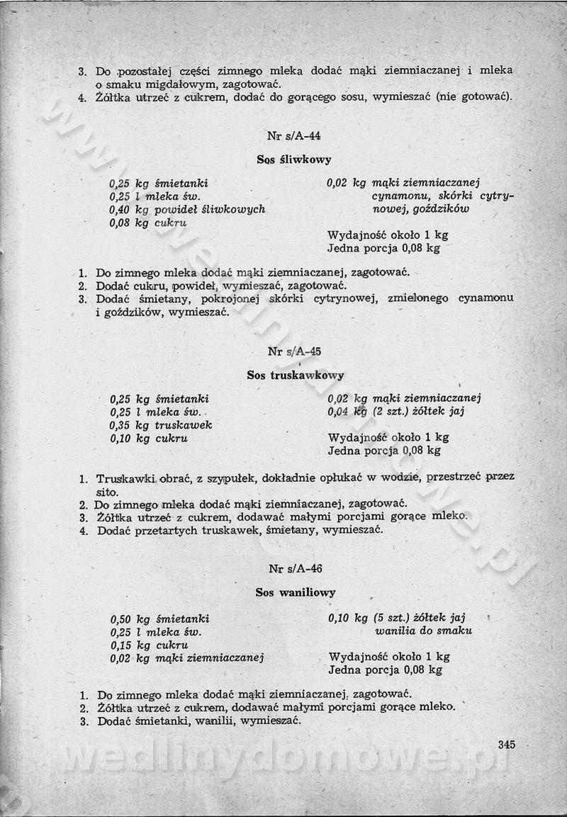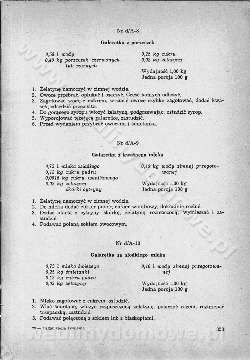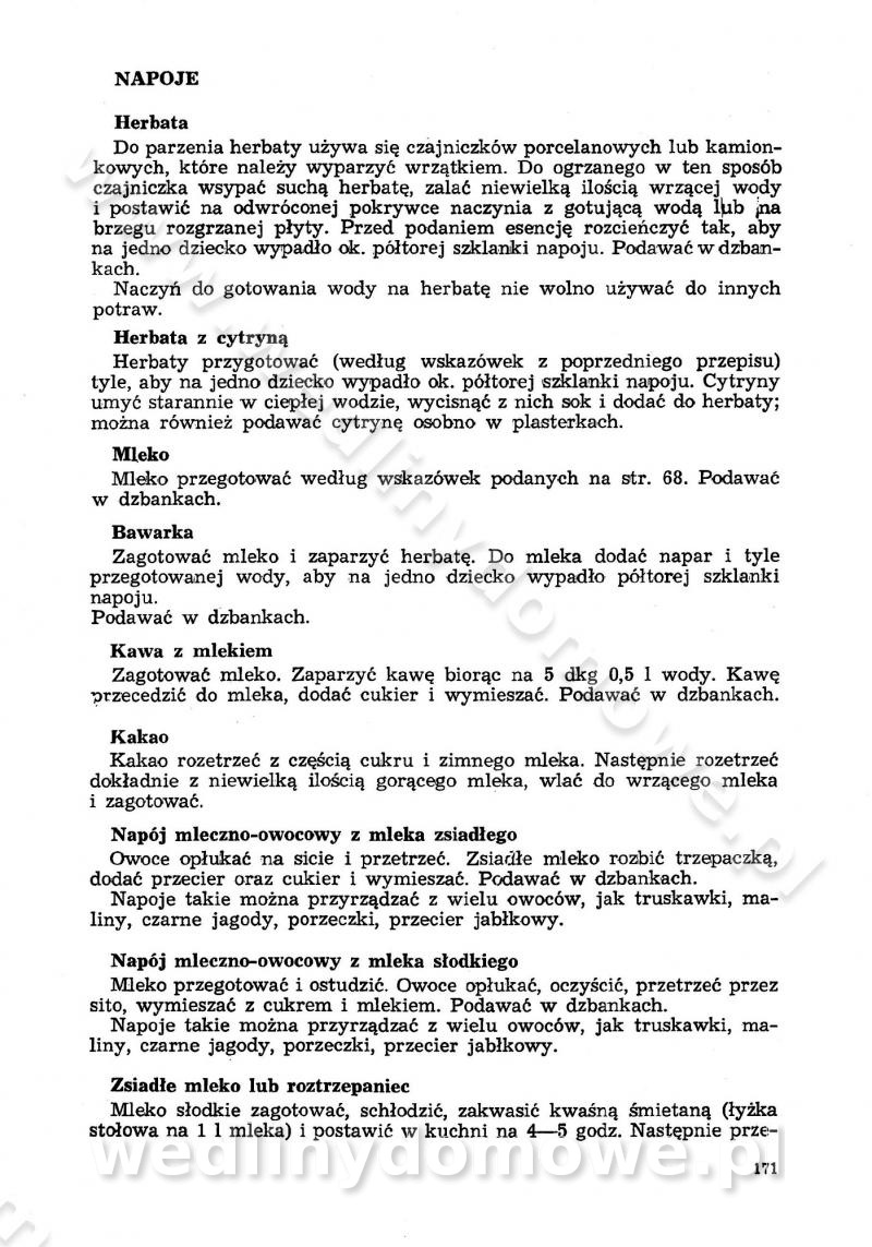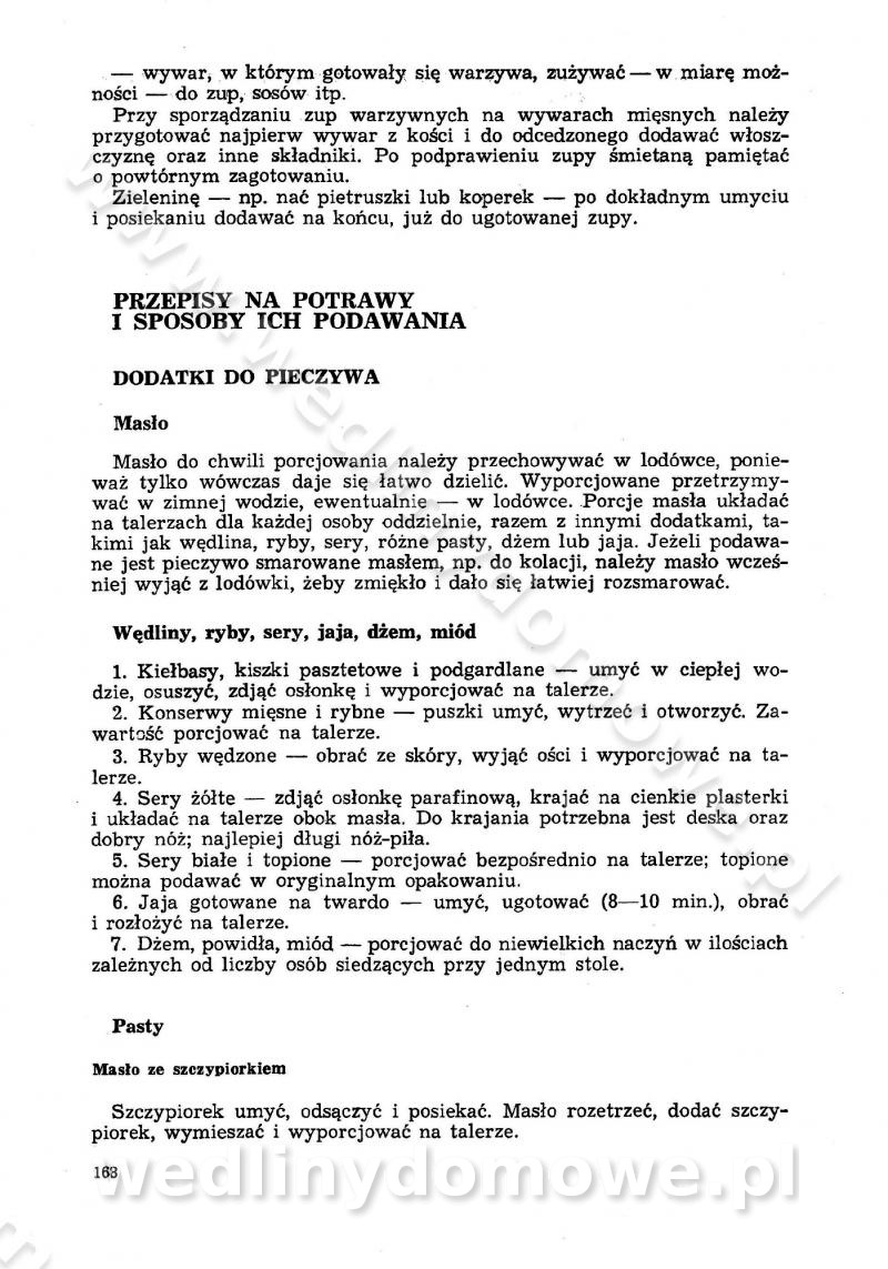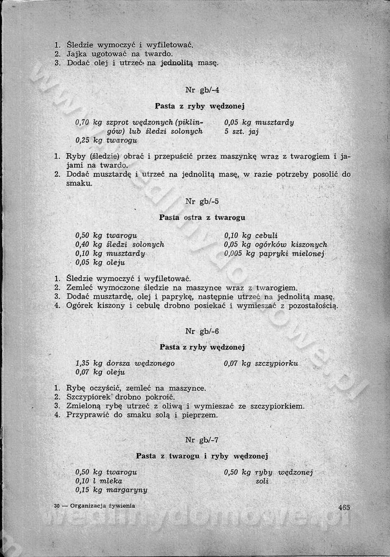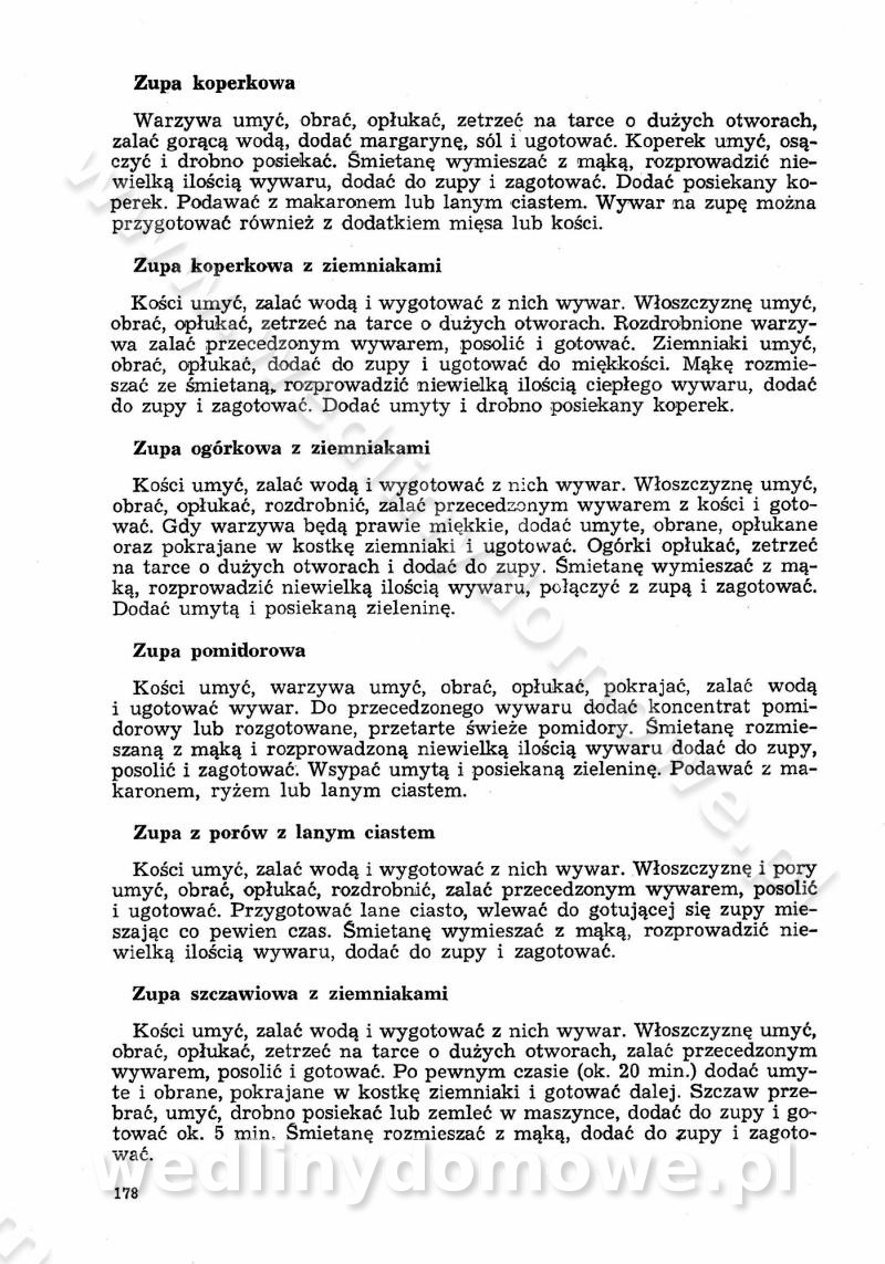 SPIS TREŚCI CZĘŚĆ I TEORETYCZNE PODSTAWY RACJONALNEGO ŻYWIENIA ZBIOROWEGO inż. Krystyna Wolf I. WSKAZÓWKI DO REALIZACJI NORM ŻYWIENIA WYRAŻONYCH W CAŁODZIENNYCH RACJACH POKARMOWYCH II. SKŁADNIKI POKARMOWE I ICH ROLA W ŻYWIENIU Zawartość składników pokarmowych w produktach Rola pożywienia Składniki pokarmowe Wzajemne zależności między składnikami pokarmowymi III. NORMY WYŻYWIENIA Normy zapotrzebowania na składniki pokarmowe Podział produktów Podział produktów na 2 grupy Podział produktów na 9 grup Podział produktów na 12 grup Całodzienne racje pokarmowe Zamiana produktów IV. WYTYCZNE PLANOWANIA ZESTAWU CAŁODZIENNYCH POSIŁKÓW Zasady podziału całodziennych racji pokarmowych na poszczególne posiłki Śniadanie Obiad Kolacja Wytyczne układania jadłospisów Kontrola prawidłowości planowania jadłospisów V. PROCESY TECHNOLOGICZNE, ICH CEL, PRZEBIEG I WPŁYW NA WARTOŚĆ ODŻYWCZĄ POTRAW Cel procesu technologicznego Obróbka wstępna i termiczna Ogólne wskazówki technologiczne Wykończanie potraw VI. WSKAZÓWKI PRAKTYCZNE DOTYCZĄCE KORZYSTANIA Z RECEPTUR CZĘŚĆ II RECEPTURY I. ZUPY inż. Jadwiga Celczyńska Podstawowe zasady sporządzania Sporządzanie wywarów Podział zup Przygotowanie głównych składników zup Wykończanie zup Rodzaje zup Zupy czyste Zupy zabielane Zupy zasmażane Zupy rozklejane Zupy mleczne Zupy owocowe Zupy z wkładką pełnowartościowego białka — samodzielne dania obiadowe lub kolacyjne Zupy czyste (normatyw surowcowy na 10 porcji) Zakwas burakowy na barszcz Zakwas na żur Barszcz burakowy czysty Barszcz czerwony czysty z zagęszczonego soku buraczanego Barszcz burakowy jarski Bulion jarski Rosół z wołowiny Zupa grzybowa czysta Zupa pomidorowa czysta Zupy rozklejane (normatyw surowcowy na 10 porcji) Krupnik na podrobach Krupnik zabielany Krupnik ze słoniną Krupnik z ryżu z jarzynami Zupa grochowa z pęczakiem Zupa grochowa z ziemniakami Zupa rumfordzka Zupa ziemniaczana z fasolą Zalewajka Zalewajka z kwaśnym mlekiem Żur z kiełbasą i boczkiem Żur na podrobach zabielany Zupy zasmażane (normatyw surowcowy na 10 porcji) Kapuśniak z kwaszonej kapusty z papryką Kapuśniak mazurski z kwaszonej kapusty Kapuśniak ze słodkiej kapusty Kapuśniak ze słodkiej kapusty z jabłkami Kapuśniak z czerwonej kapusty Zacierka z ziemniakami Zupa cebulowa Zupa z dyni i pomidorów Zupa fasolowa z makaronem Zupa fasolowa z ziemniakami Zupa z flaków wołowych Zupa „garbure” Zupa grzybowa Zupa jarzynowa z papryką Zupa jarzynowa z fasolą Zupa jarzynowa (jesienna) Zupa jarzynowa z makaronem i serem Zupa z kaszy manny zasmażana Zupa neapolitańska Zupa pomidorowa zasmażana Zupa z porów Zupa z selerów Zupa ziemniaczana zasmażana Zupa ziemniaczana z pomidorami Zupy mleczne (normatyw surowcowy na 10 porcji) Kukurydzanka na mleku Manna na mleku Ryż na mleku Makaron na mleku Płatki owsiane na mleku Zupa z dyni na mleku z tartym ciastem Zupa „nic” Zupa mleczna z lanym ciastem Zupa ze zsiadłego mleka Zupy zabielane (normatyw surowcowy na 10 porcji) Barszcz czerwony zabielany Barszcz czerwony zabielany z suszu Barszcz ukraiński Barszcz czeski Barszcz z botwiną Barszcz jarski z botwiną Chłodnik z botwiną Chłodnik z botwiną na mleku Kapuśniak ze słodkiej kapusty zabielany Kapuśniak na głowiźnie Zupa z brukselki zabielana Zupa cytrynowa Zupa z fasolki szparagowej Zupa grzybowa zabielana Zupa kalafiorowa Zupa koperkowa Zupa ogórkowa Zupa pomidorowa Zupa rybna Zupa szczawiowa Zupa pieczarkowa Zupa ze szpinaku Zupa z młodych jarzyn zabielana Zupa jarzynowa zabielana z mrożonek Zupa ziemniaczana „Paysanne” Pejzanka z puree ziemniaczanym Zupa z młodych ziemniaków Zupa ziemniaczana z porami Zupa z zielonego groszku Zupy owocowe (normatyw surowcowy na 10 porcji) Chłodnik z czarnych jagód Chłodnik truskawkowy Zupa z czarnych jagód Zupa jabłkowa Zupa jabłkowa zabielana Zupa z jabłek i śliwek Zupa ze śliwek Zupa z owoców mieszanych Zupa owocowa z suszu jabłkowego i marmolady Zupa owocowa czysta Zupa z powideł śliwkowych Zupa rabarbarowa Zupa z suszonych śliwek Zupa truskawkowa Zupa z truskawek i rabarbaru Zupy z wkładką mięsną (normatyw surowcowy na 10 porcji) Barszcz małorosyjski na rosole z mięsem Barszcz z ziemniakami i serdelkami Grochówka z mięsem i ziemniakami Kapuśniak z kwaszonej kapusty z kiełbasą Kapuśniak ze słodkiej kapusty z pomidorami i mięsem Krupnik z ryżu na mięsie Krupnik na mięsie Pejzanka na żeberkach Zupa z fasolki szparagowej na mięsie Zupa fasolowa z mięsem i makaronem Zupa jarzynowa z mięsem Gulaszowa polewka Zupa koperkowa na mięsie Zupa ogórkowa z ziemniakami na mięsie Zupa pomidorowa z makaronem i mięsem Zupa z porów z ziemniakami i wątróbką Zupa wiosenna z jajami Zupa ziemniaczana z mięsem Żur z kiełbasą i ziemniakami II. POTRAWY MIĘSNE inż. Krystyna Wolf Podstawowe zasady sporządzania Zachowanie wartości odżywczej dań mięsnych Cechy prawidłowo przyrządzonego mięsa Przechowywanie Rozmrażanie mięsa Rozbiór tuszy zwierząt rzeźnych Obróbka wstępna Obróbka termiczna Potrawy z baraniny (normatyw surowcowy na 10 porcji) Potrawka z baraniny Kotlet barani mielony Kotlet barani mielony z ryżem Baranina w warzywach Ragout baranie Baranina duszona Potrawy z cielęciny (normatyw surowcowy na 10 porcji) Potrawka cielęca Pulpety cielęce Kotlet cielęcy mielony Klopsiki cielęce do sosów Sznycel cielęcy (mielony) Filet cielęcy (do sosów i dodatków) Zrazy cielęce bite (do sosów) Zrazy cielęce nadziewane słoniną Sznycel cielęcy Zrazy cielęce po polsku (faszerowane) Paprykarz cielęcy Pieczeń cielęca duszona Pieczeń cielęca Mostek cielęcy po wiedeńsku Mostek cielęcy faszerowany Rolada cielęca faszerowana Potrawy z wieprzowiny (normatyw surowcowy na 10 porcji) Mięso wieprzowe gotowane Peklówka wieprzowa gotowana Filet wieprzowy saute Kotlet wieprzowy mielony Zraz wieprzowy (klopsik) mielony do sosów Kotlet miel