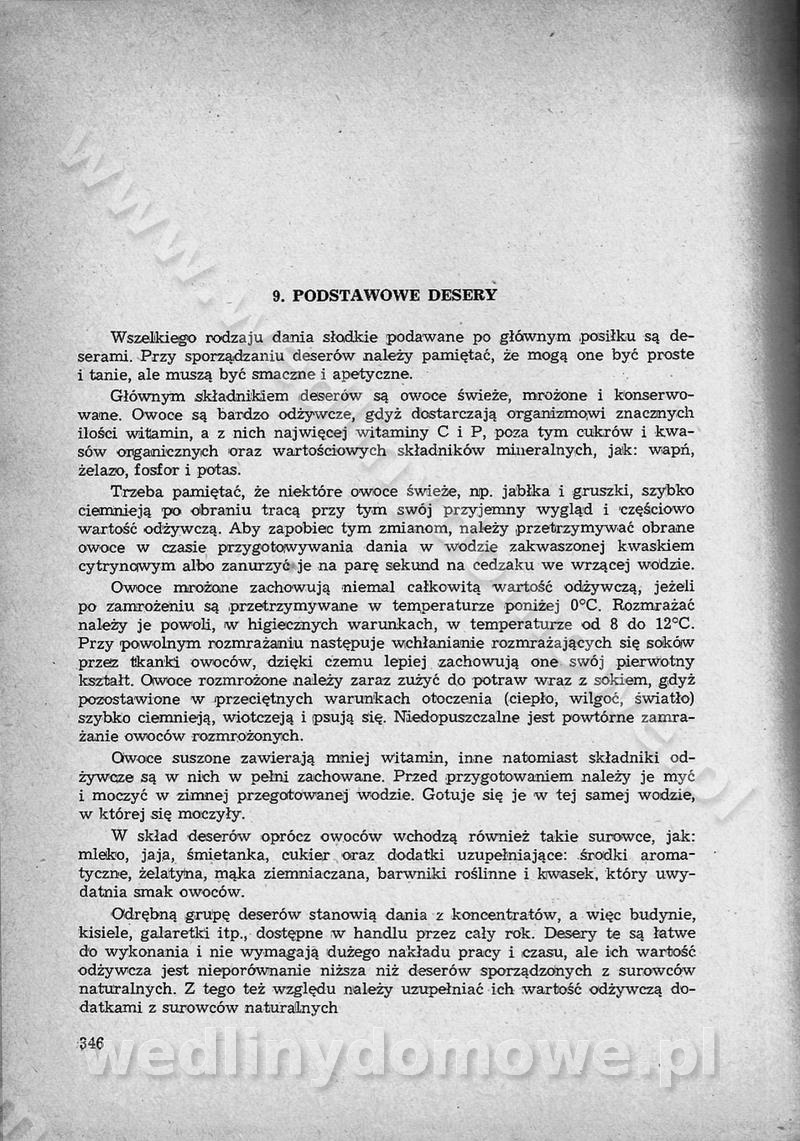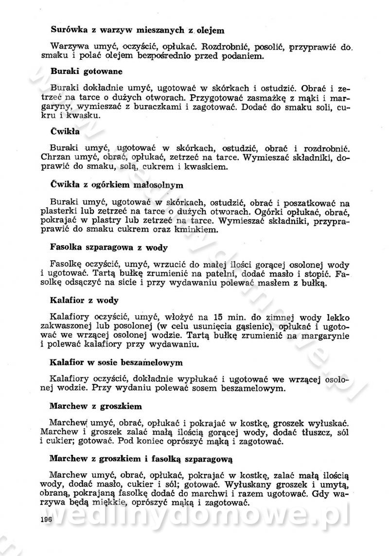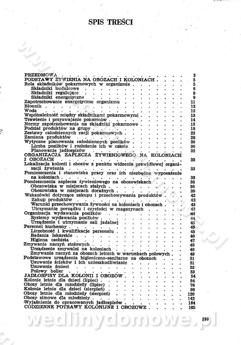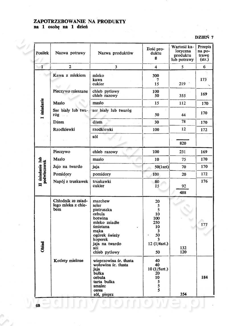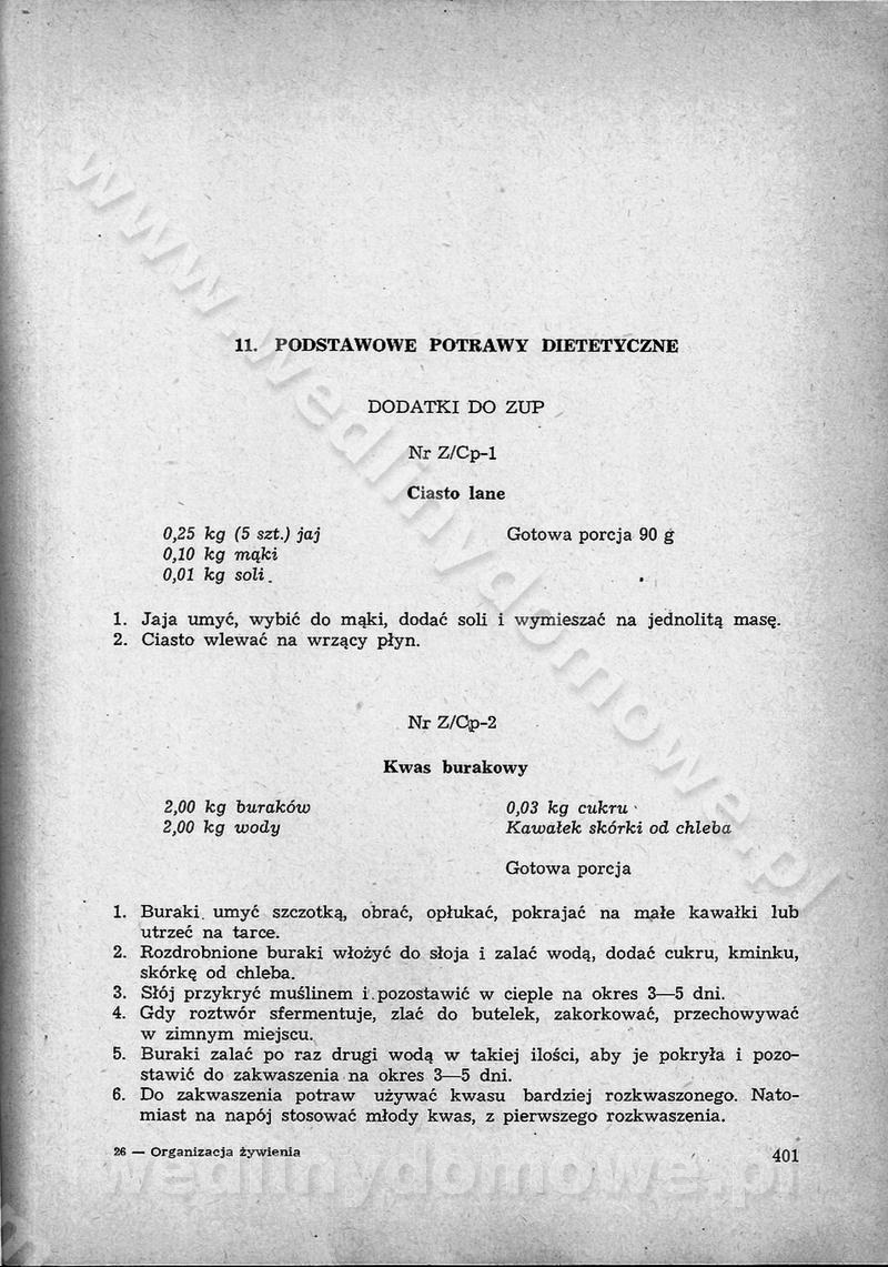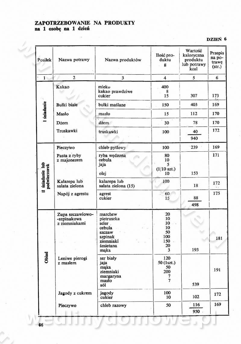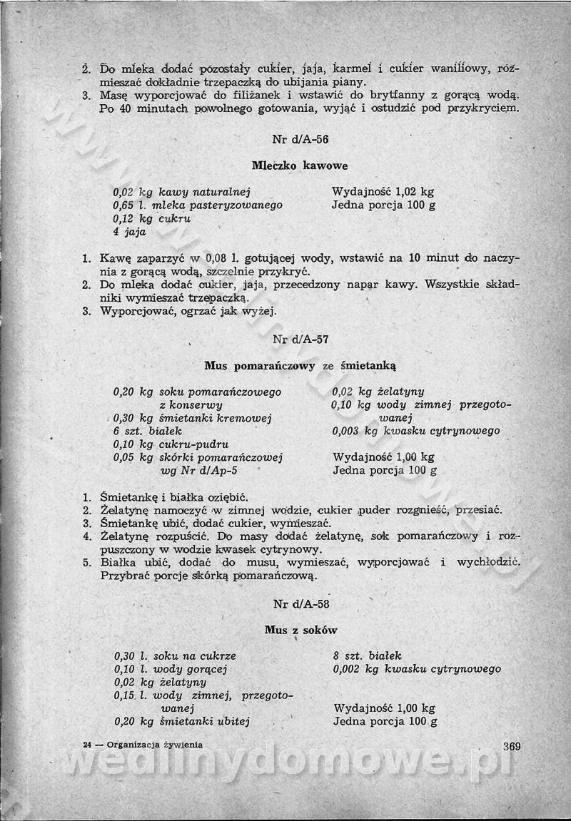 SPIS TREŚCI CZĘŚĆ I TEORETYCZNE PODSTAWY RACJONALNEGO ŻYWIENIA ZBIOROWEGO inż. Krystyna Wolf I. WSKAZÓWKI DO REALIZACJI NORM ŻYWIENIA WYRAŻONYCH W CAŁODZIENNYCH RACJACH POKARMOWYCH II. SKŁADNIKI POKARMOWE I ICH ROLA W ŻYWIENIU Zawartość składników pokarmowych w produktach Rola pożywienia Składniki pokarmowe Wzajemne zależności między składnikami pokarmowymi III. NORMY WYŻYWIENIA Normy zapotrzebowania na składniki pokarmowe Podział produktów Podział produktów na 2 grupy Podział produktów na 9 grup Podział produktów na 12 grup Całodzienne racje pokarmowe Zamiana produktów IV. WYTYCZNE PLANOWANIA ZESTAWU CAŁODZIENNYCH POSIŁKÓW Zasady podziału całodziennych racji pokarmowych na poszczególne posiłki Śniadanie Obiad Kolacja Wytyczne układania jadłospisów Kontrola prawidłowości planowania jadłospisów V. PROCESY TECHNOLOGICZNE, ICH CEL, PRZEBIEG I WPŁYW NA WARTOŚĆ ODŻYWCZĄ POTRAW Cel procesu technologicznego Obróbka wstępna i termiczna Ogólne wskazówki technologiczne Wykończanie potraw VI. WSKAZÓWKI PRAKTYCZNE DOTYCZĄCE KORZYSTANIA Z RECEPTUR CZĘŚĆ II RECEPTURY I. ZUPY inż. Jadwiga Celczyńska Podstawowe zasady sporządzania Sporządzanie wywarów Podział zup Przygotowanie głównych składników zup Wykończanie zup Rodzaje zup Zupy czyste Zupy zabielane Zupy zasmażane Zupy rozklejane Zupy mleczne Zupy owocowe Zupy z wkładką pełnowartościowego białka — samodzielne dania obiadowe lub kolacyjne Zupy czyste (normatyw surowcowy na 10 porcji) Zakwas burakowy na barszcz Zakwas na żur Barszcz burakowy czysty Barszcz czerwony czysty z zagęszczonego soku buraczanego Barszcz burakowy jarski Bulion jarski Rosół z wołowiny Zupa grzybowa czysta Zupa pomidorowa czysta Zupy rozklejane (normatyw surowcowy na 10 porcji) Krupnik na podrobach Krupnik zabielany Krupnik ze słoniną Krupnik z ryżu z jarzynami Zupa grochowa z pęczakiem Zupa grochowa z ziemniakami Zupa rumfordzka Zupa ziemniaczana z fasolą Zalewajka Zalewajka z kwaśnym mlekiem Żur z kiełbasą i boczkiem Żur na podrobach zabielany Zupy zasmażane (normatyw surowcowy na 10 porcji) Kapuśniak z kwaszonej kapusty z papryką Kapuśniak mazurski z kwaszonej kapusty Kapuśniak ze słodkiej kapusty Kapuśniak ze słodkiej kapusty z jabłkami Kapuśniak z czerwonej kapusty Zacierka z ziemniakami Zupa cebulowa Zupa z dyni i pomidorów Zupa fasolowa z makaronem Zupa fasolowa z ziemniakami Zupa z flaków wołowych Zupa „garbure” Zupa grzybowa Zupa jarzynowa z papryką Zupa jarzynowa z fasolą Zupa jarzynowa (jesienna) Zupa jarzynowa z makaronem i serem Zupa z kaszy manny zasmażana Zupa neapolitańska Zupa pomidorowa zasmażana Zupa z porów Zupa z selerów Zupa ziemniaczana zasmażana Zupa ziemniaczana z pomidorami Zupy mleczne (normatyw surowcowy na 10 porcji) Kukurydzanka na mleku Manna na mleku Ryż na mleku Makaron na mleku Płatki owsiane na mleku Zupa z dyni na mleku z tartym ciastem Zupa „nic” Zupa mleczna z lanym ciastem Zupa ze zsiadłego mleka Zupy zabielane (normatyw surowcowy na 10 porcji) Barszcz czerwony zabielany Barszcz czerwony zabielany z suszu Barszcz ukraiński Barszcz czeski Barszcz z botwiną Barszcz jarski z botwiną Chłodnik z botwiną Chłodnik z botwiną na mleku Kapuśniak ze słodkiej kapusty zabielany Kapuśniak na głowiźnie Zupa z brukselki zabielana Zupa cytrynowa Zupa z fasolki szparagowej Zupa grzybowa zabielana Zupa kalafiorowa Zupa koperkowa Zupa ogórkowa Zupa pomidorowa Zupa rybna Zupa szczawiowa Zupa pieczarkowa Zupa ze szpinaku Zupa z młodych jarzyn zabielana Zupa jarzynowa zabielana z mrożonek Zupa ziemniaczana „Paysanne” Pejzanka z puree ziemniaczanym Zupa z młodych ziemniaków Zupa ziemniaczana z porami Zupa z zielonego groszku Zupy owocowe (normatyw surowcowy na 10 porcji) Chłodnik z czarnych jagód Chłodnik truskawkowy Zupa z czarnych jagód Zupa jabłkowa Zupa jabłkowa zabielana Zupa z jabłek i śliwek Zupa ze śliwek Zupa z owoców mieszanych Zupa owocowa z suszu jabłkowego i marmolady Zupa owocowa czysta Zupa z powideł śliwkowych Zupa rabarbarowa Zupa z suszonych śliwek Zupa truskawkowa Zupa z truskawek i rabarbaru Zupy z wkładką mięsną (normatyw surowcowy na 10 porcji) Barszcz małorosyjski na rosole z mięsem Barszcz z ziemniakami i serdelkami Grochówka z mięsem i ziemniakami Kapuśniak z kwaszonej kapusty z kiełbasą Kapuśniak ze słodkiej kapusty z pomidorami i mięsem Krupnik z ryżu na mięsie Krupnik na mięsie Pejzanka na żeberkach Zupa z fasolki szparagowej na mięsie Zupa fasolowa z mięsem i makaronem Zupa jarzynowa z mięsem Gulaszowa polewka Zupa koperkowa na mięsie Zupa ogórkowa z ziemniakami na mięsie Zupa pomidorowa z makaronem i mięsem Zupa z porów z ziemniakami i wątróbką Zupa wiosenna z jajami Zupa ziemniaczana z mięsem Żur z kiełbasą i ziemniakami II. POTRAWY MIĘSNE inż. Krystyna Wolf Podstawowe zasady sporządzania Zachowanie wartości odżywczej dań mięsnych Cechy prawidłowo przyrządzonego mięsa Przechowywanie Rozmrażanie mięsa Rozbiór tuszy zwierząt rzeźnych Obróbka wstępna Obróbka termiczna Potrawy z baraniny (normatyw surowcowy na 10 porcji) Potrawka z baraniny Kotlet barani mielony Kotlet barani mielony z ryżem Baranina w warzywach Ragout baranie Baranina duszona Potrawy z cielęciny (normatyw surowcowy na 10 porcji) Potrawka cielęca Pulpety cielęce Kotlet cielęcy mielony Klopsiki cielęce do sosów Sznycel cielęcy (mielony) Filet cielęcy (do sosów i dodatków) Zrazy cielęce bite (do sosów) Zrazy cielęce nadziewane słoniną Sznycel cielęcy Zrazy cielęce po polsku (faszerowane) Paprykarz cielęcy Pieczeń cielęca duszona Pieczeń cielęca Mostek cielęcy po wiedeńsku Mostek cielęcy faszerowany Rolada cielęca faszerowana Potrawy z wieprzowiny (normatyw surowcowy na 10 porcji) Mięso wieprzowe gotowane Peklówka wieprzowa gotowana Filet wieprzowy saute Kotlet wieprzowy mielony Zraz wieprzowy (klopsik) mielony do sosów Kotlet miel