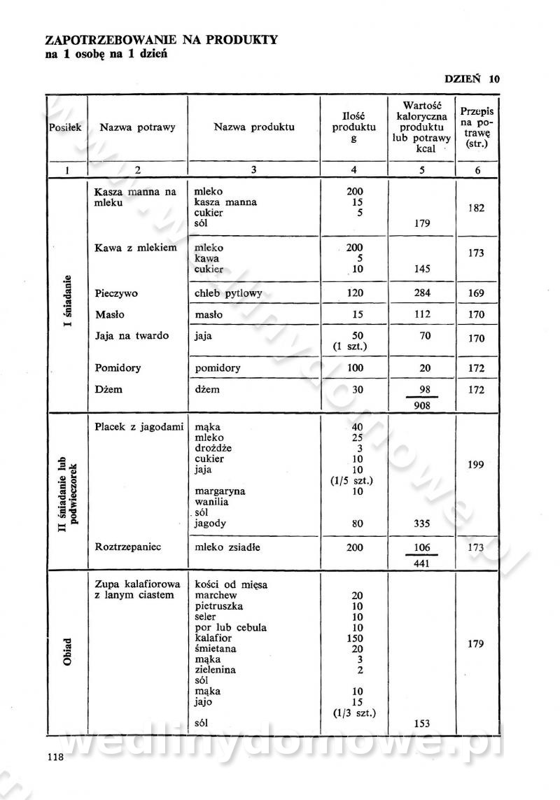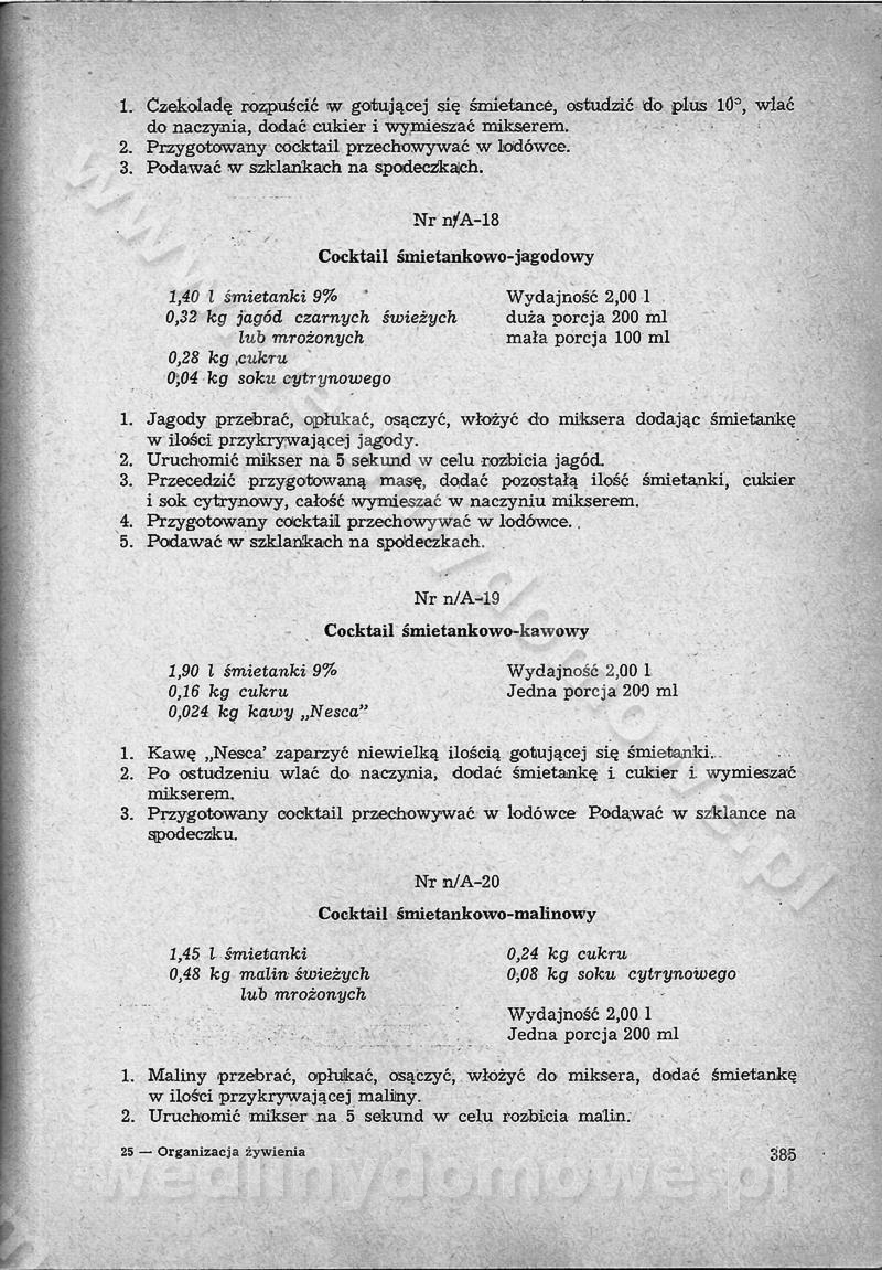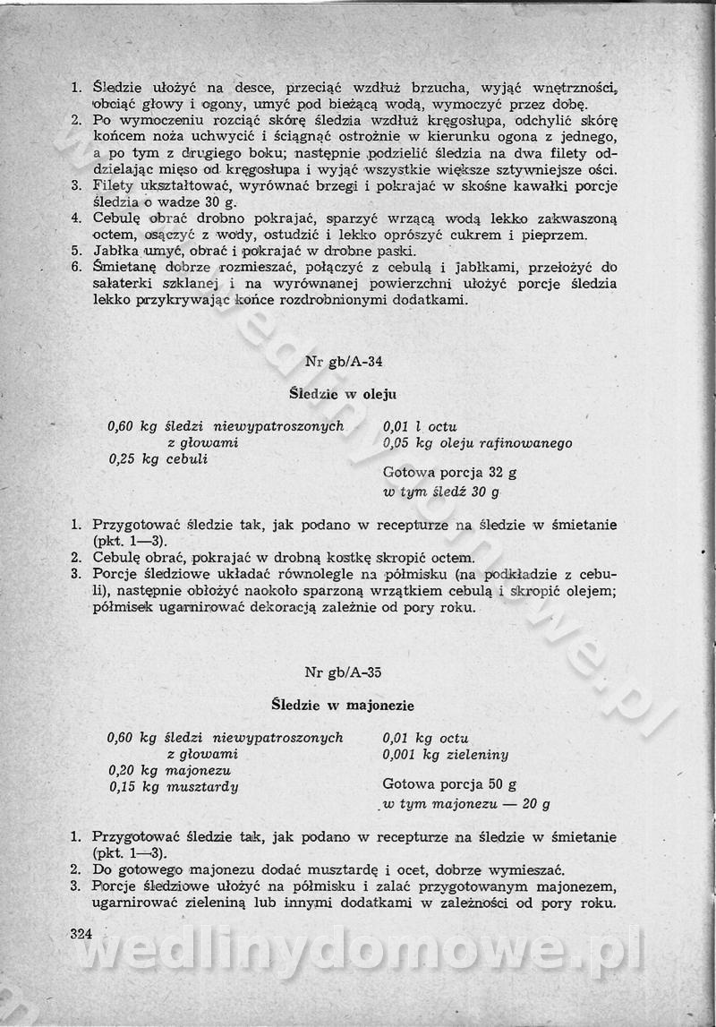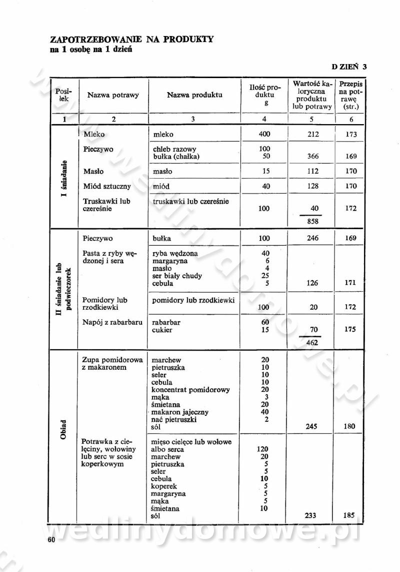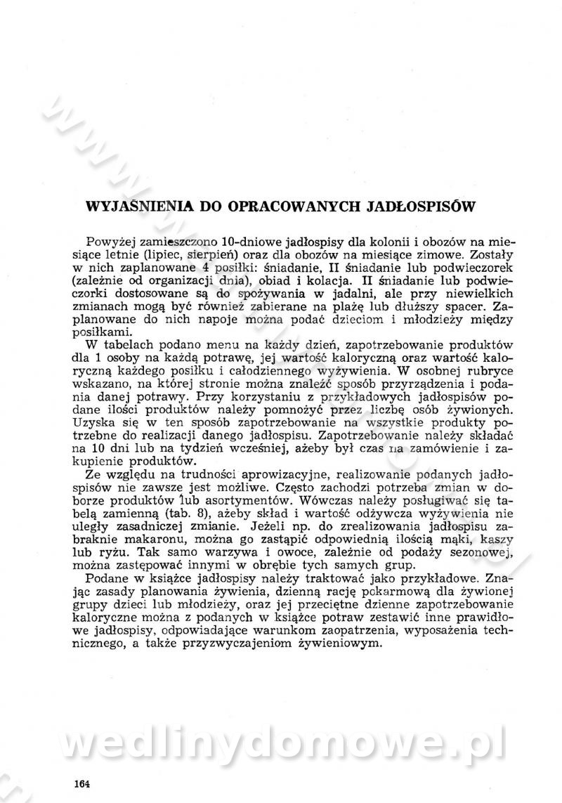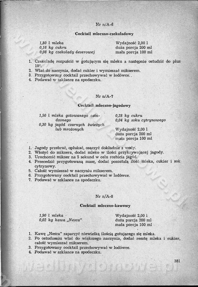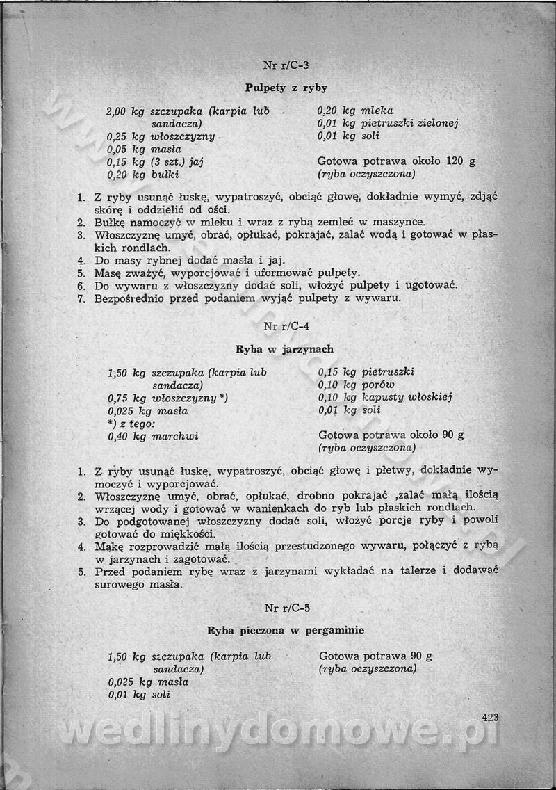 SPIS TREŚCI CZĘŚĆ I TEORETYCZNE PODSTAWY RACJONALNEGO ŻYWIENIA ZBIOROWEGO inż. Krystyna Wolf I. WSKAZÓWKI DO REALIZACJI NORM ŻYWIENIA WYRAŻONYCH W CAŁODZIENNYCH RACJACH POKARMOWYCH II. SKŁADNIKI POKARMOWE I ICH ROLA W ŻYWIENIU Zawartość składników pokarmowych w produktach Rola pożywienia Składniki pokarmowe Wzajemne zależności między składnikami pokarmowymi III. NORMY WYŻYWIENIA Normy zapotrzebowania na składniki pokarmowe Podział produktów Podział produktów na 2 grupy Podział produktów na 9 grup Podział produktów na 12 grup Całodzienne racje pokarmowe Zamiana produktów IV. WYTYCZNE PLANOWANIA ZESTAWU CAŁODZIENNYCH POSIŁKÓW Zasady podziału całodziennych racji pokarmowych na poszczególne posiłki Śniadanie Obiad Kolacja Wytyczne układania jadłospisów Kontrola prawidłowości planowania jadłospisów V. PROCESY TECHNOLOGICZNE, ICH CEL, PRZEBIEG I WPŁYW NA WARTOŚĆ ODŻYWCZĄ POTRAW Cel procesu technologicznego Obróbka wstępna i termiczna Ogólne wskazówki technologiczne Wykończanie potraw VI. WSKAZÓWKI PRAKTYCZNE DOTYCZĄCE KORZYSTANIA Z RECEPTUR CZĘŚĆ II RECEPTURY I. ZUPY inż. Jadwiga Celczyńska Podstawowe zasady sporządzania Sporządzanie wywarów Podział zup Przygotowanie głównych składników zup Wykończanie zup Rodzaje zup Zupy czyste Zupy zabielane Zupy zasmażane Zupy rozklejane Zupy mleczne Zupy owocowe Zupy z wkładką pełnowartościowego białka — samodzielne dania obiadowe lub kolacyjne Zupy czyste (normatyw surowcowy na 10 porcji) Zakwas burakowy na barszcz Zakwas na żur Barszcz burakowy czysty Barszcz czerwony czysty z zagęszczonego soku buraczanego Barszcz burakowy jarski Bulion jarski Rosół z wołowiny Zupa grzybowa czysta Zupa pomidorowa czysta Zupy rozklejane (normatyw surowcowy na 10 porcji) Krupnik na podrobach Krupnik zabielany Krupnik ze słoniną Krupnik z ryżu z jarzynami Zupa grochowa z pęczakiem Zupa grochowa z ziemniakami Zupa rumfordzka Zupa ziemniaczana z fasolą Zalewajka Zalewajka z kwaśnym mlekiem Żur z kiełbasą i boczkiem Żur na podrobach zabielany Zupy zasmażane (normatyw surowcowy na 10 porcji) Kapuśniak z kwaszonej kapusty z papryką Kapuśniak mazurski z kwaszonej kapusty Kapuśniak ze słodkiej kapusty Kapuśniak ze słodkiej kapusty z jabłkami Kapuśniak z czerwonej kapusty Zacierka z ziemniakami Zupa cebulowa Zupa z dyni i pomidorów Zupa fasolowa z makaronem Zupa fasolowa z ziemniakami Zupa z flaków wołowych Zupa „garbure” Zupa grzybowa Zupa jarzynowa z papryką Zupa jarzynowa z fasolą Zupa jarzynowa (jesienna) Zupa jarzynowa z makaronem i serem Zupa z kaszy manny zasmażana Zupa neapolitańska Zupa pomidorowa zasmażana Zupa z porów Zupa z selerów Zupa ziemniaczana zasmażana Zupa ziemniaczana z pomidorami Zupy mleczne (normatyw surowcowy na 10 porcji) Kukurydzanka na mleku Manna na mleku Ryż na mleku Makaron na mleku Płatki owsiane na mleku Zupa z dyni na mleku z tartym ciastem Zupa „nic” Zupa mleczna z lanym ciastem Zupa ze zsiadłego mleka Zupy zabielane (normatyw surowcowy na 10 porcji) Barszcz czerwony zabielany Barszcz czerwony zabielany z suszu Barszcz ukraiński Barszcz czeski Barszcz z botwiną Barszcz jarski z botwiną Chłodnik z botwiną Chłodnik z botwiną na mleku Kapuśniak ze słodkiej kapusty zabielany Kapuśniak na głowiźnie Zupa z brukselki zabielana Zupa cytrynowa Zupa z fasolki szparagowej Zupa grzybowa zabielana Zupa kalafiorowa Zupa koperkowa Zupa ogórkowa Zupa pomidorowa Zupa rybna Zupa szczawiowa Zupa pieczarkowa Zupa ze szpinaku Zupa z młodych jarzyn zabielana Zupa jarzynowa zabielana z mrożonek Zupa ziemniaczana „Paysanne” Pejzanka z puree ziemniaczanym Zupa z młodych ziemniaków Zupa ziemniaczana z porami Zupa z zielonego groszku Zupy owocowe (normatyw surowcowy na 10 porcji) Chłodnik z czarnych jagód Chłodnik truskawkowy Zupa z czarnych jagód Zupa jabłkowa Zupa jabłkowa zabielana Zupa z jabłek i śliwek Zupa ze śliwek Zupa z owoców mieszanych Zupa owocowa z suszu jabłkowego i marmolady Zupa owocowa czysta Zupa z powideł śliwkowych Zupa rabarbarowa Zupa z suszonych śliwek Zupa truskawkowa Zupa z truskawek i rabarbaru Zupy z wkładką mięsną (normatyw surowcowy na 10 porcji) Barszcz małorosyjski na rosole z mięsem Barszcz z ziemniakami i serdelkami Grochówka z mięsem i ziemniakami Kapuśniak z kwaszonej kapusty z kiełbasą Kapuśniak ze słodkiej kapusty z pomidorami i mięsem Krupnik z ryżu na mięsie Krupnik na mięsie Pejzanka na żeberkach Zupa z fasolki szparagowej na mięsie Zupa fasolowa z mięsem i makaronem Zupa jarzynowa z mięsem Gulaszowa polewka Zupa koperkowa na mięsie Zupa ogórkowa z ziemniakami na mięsie Zupa pomidorowa z makaronem i mięsem Zupa z porów z ziemniakami i wątróbką Zupa wiosenna z jajami Zupa ziemniaczana z mięsem Żur z kiełbasą i ziemniakami II. POTRAWY MIĘSNE inż. Krystyna Wolf Podstawowe zasady sporządzania Zachowanie wartości odżywczej dań mięsnych Cechy prawidłowo przyrządzonego mięsa Przechowywanie Rozmrażanie mięsa Rozbiór tuszy zwierząt rzeźnych Obróbka wstępna Obróbka termiczna Potrawy z baraniny (normatyw surowcowy na 10 porcji) Potrawka z baraniny Kotlet barani mielony Kotlet barani mielony z ryżem Baranina w warzywach Ragout baranie Baranina duszona Potrawy z cielęciny (normatyw surowcowy na 10 porcji) Potrawka cielęca Pulpety cielęce Kotlet cielęcy mielony Klopsiki cielęce do sosów Sznycel cielęcy (mielony) Filet cielęcy (do sosów i dodatków) Zrazy cielęce bite (do sosów) Zrazy cielęce nadziewane słoniną Sznycel cielęcy Zrazy cielęce po polsku (faszerowane) Paprykarz cielęcy Pieczeń cielęca duszona Pieczeń cielęca Mostek cielęcy po wiedeńsku Mostek cielęcy faszerowany Rolada cielęca faszerowana Potrawy z wieprzowiny (normatyw surowcowy na 10 porcji) Mięso wieprzowe gotowane Peklówka wieprzowa gotowana Filet wieprzowy saute Kotlet wieprzowy mielony Zraz wieprzowy (klopsik) mielony do sosów Kotlet miel