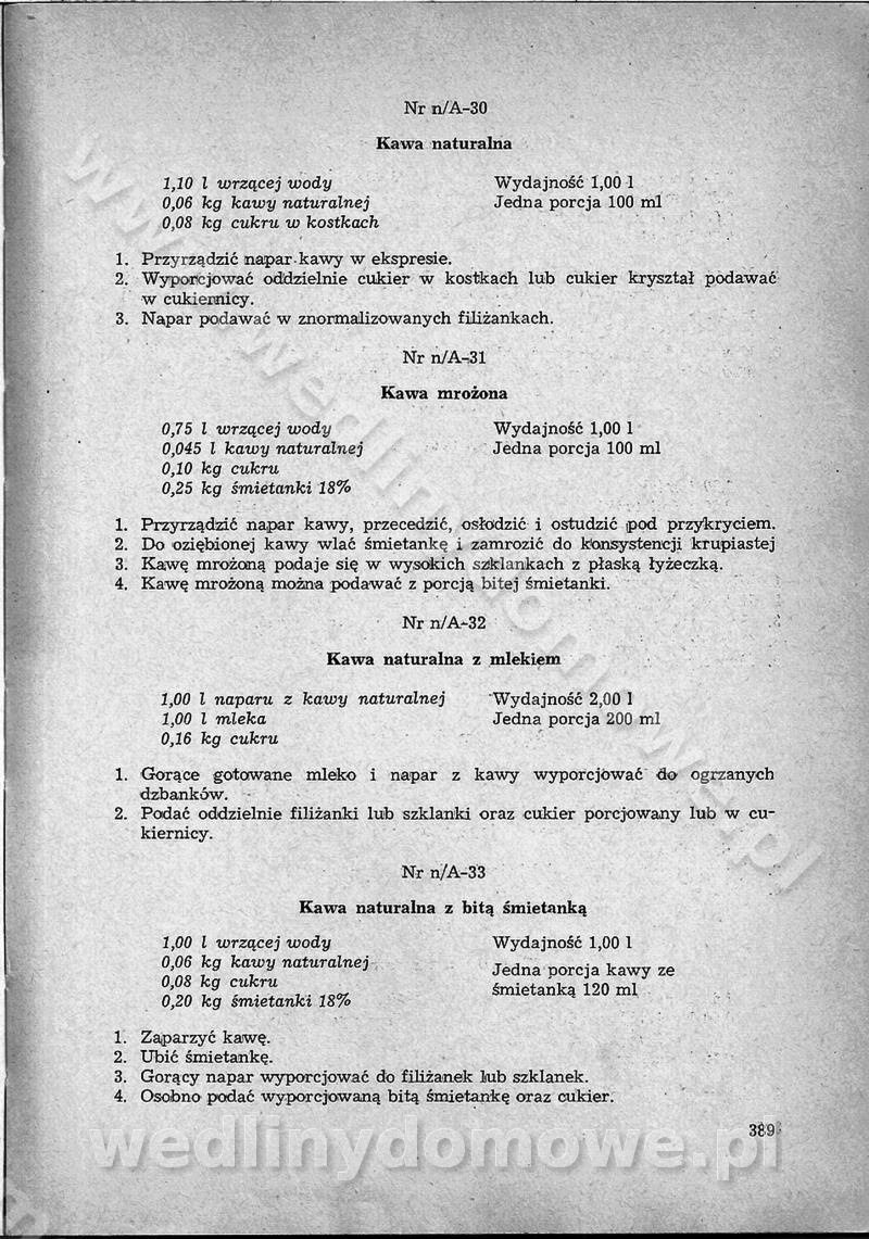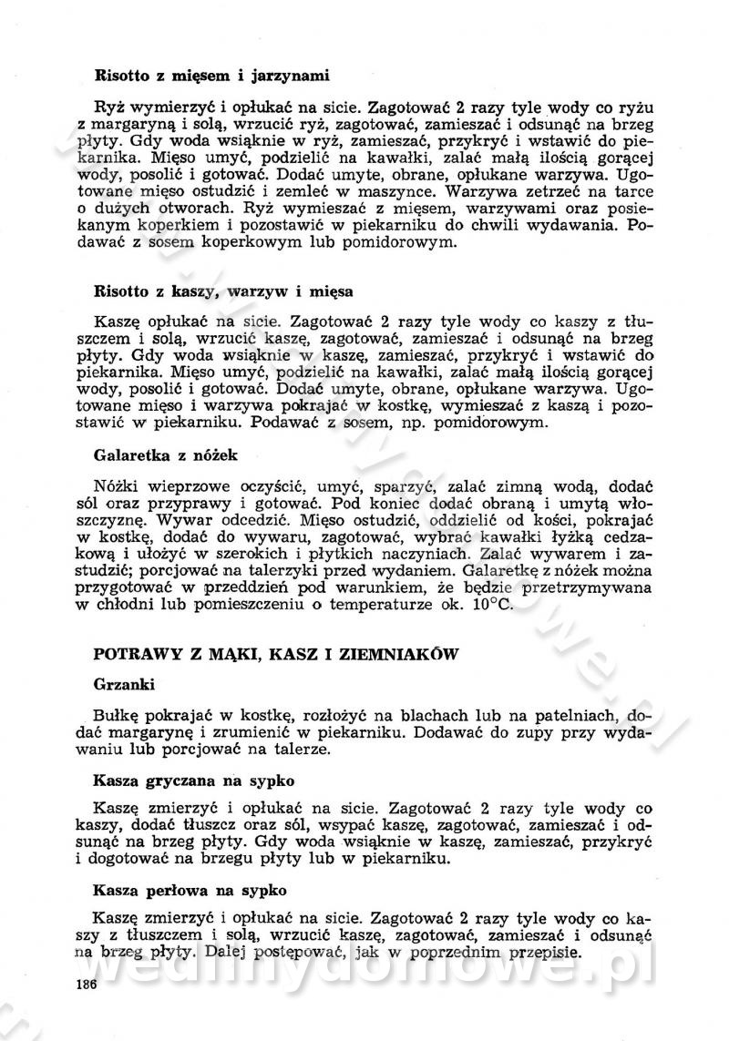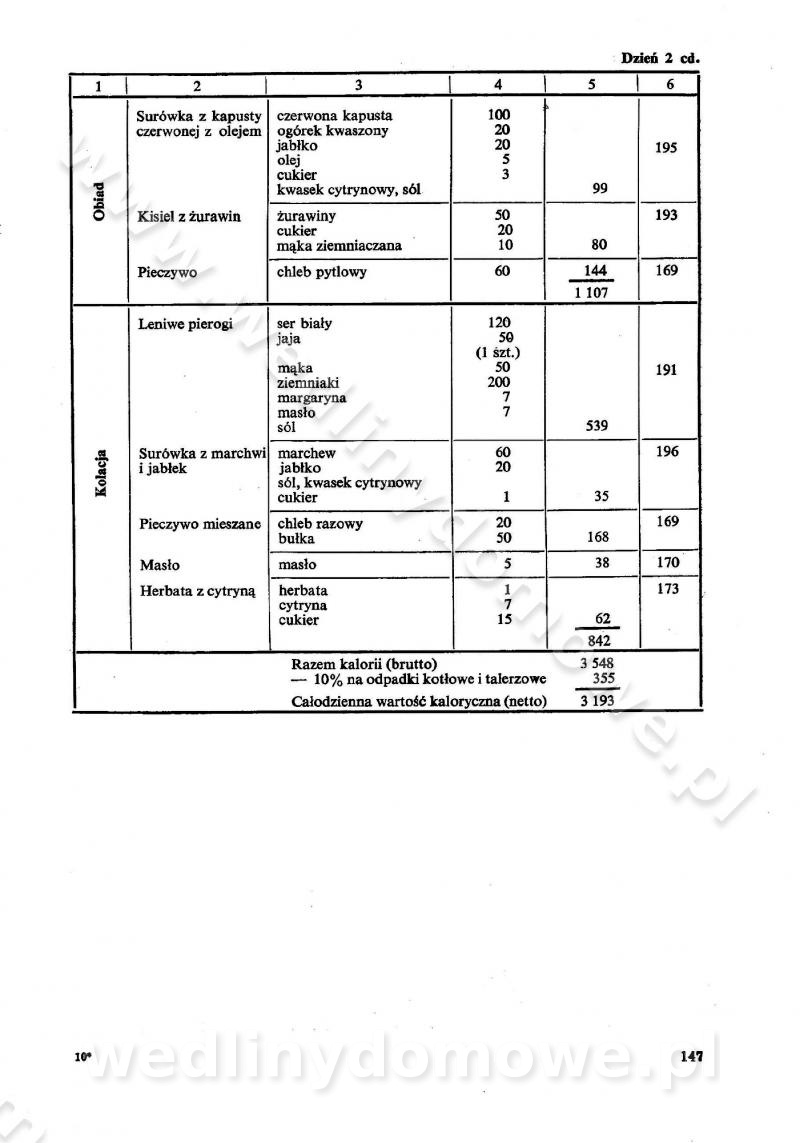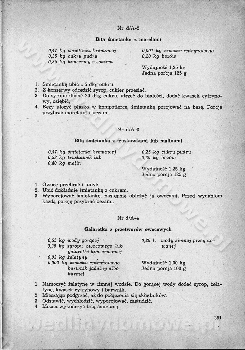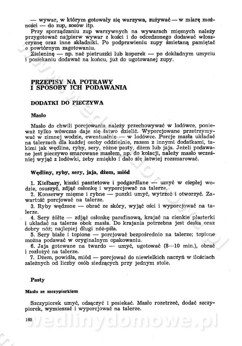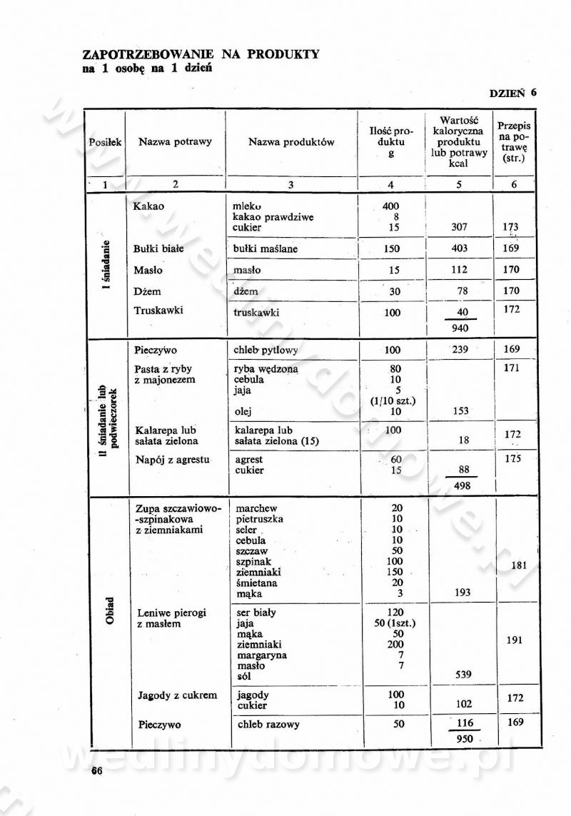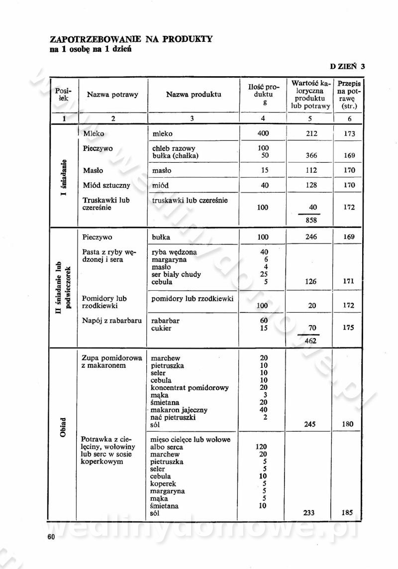 SPIS TREŚCI CZĘŚĆ I TEORETYCZNE PODSTAWY RACJONALNEGO ŻYWIENIA ZBIOROWEGO inż. Krystyna Wolf I. WSKAZÓWKI DO REALIZACJI NORM ŻYWIENIA WYRAŻONYCH W CAŁODZIENNYCH RACJACH POKARMOWYCH II. SKŁADNIKI POKARMOWE I ICH ROLA W ŻYWIENIU Zawartość składników pokarmowych w produktach Rola pożywienia Składniki pokarmowe Wzajemne zależności między składnikami pokarmowymi III. NORMY WYŻYWIENIA Normy zapotrzebowania na składniki pokarmowe Podział produktów Podział produktów na 2 grupy Podział produktów na 9 grup Podział produktów na 12 grup Całodzienne racje pokarmowe Zamiana produktów IV. WYTYCZNE PLANOWANIA ZESTAWU CAŁODZIENNYCH POSIŁKÓW Zasady podziału całodziennych racji pokarmowych na poszczególne posiłki Śniadanie Obiad Kolacja Wytyczne układania jadłospisów Kontrola prawidłowości planowania jadłospisów V. PROCESY TECHNOLOGICZNE, ICH CEL, PRZEBIEG I WPŁYW NA WARTOŚĆ ODŻYWCZĄ POTRAW Cel procesu technologicznego Obróbka wstępna i termiczna Ogólne wskazówki technologiczne Wykończanie potraw VI. WSKAZÓWKI PRAKTYCZNE DOTYCZĄCE KORZYSTANIA Z RECEPTUR CZĘŚĆ II RECEPTURY I. ZUPY inż. Jadwiga Celczyńska Podstawowe zasady sporządzania Sporządzanie wywarów Podział zup Przygotowanie głównych składników zup Wykończanie zup Rodzaje zup Zupy czyste Zupy zabielane Zupy zasmażane Zupy rozklejane Zupy mleczne Zupy owocowe Zupy z wkładką pełnowartościowego białka — samodzielne dania obiadowe lub kolacyjne Zupy czyste (normatyw surowcowy na 10 porcji) Zakwas burakowy na barszcz Zakwas na żur Barszcz burakowy czysty Barszcz czerwony czysty z zagęszczonego soku buraczanego Barszcz burakowy jarski Bulion jarski Rosół z wołowiny Zupa grzybowa czysta Zupa pomidorowa czysta Zupy rozklejane (normatyw surowcowy na 10 porcji) Krupnik na podrobach Krupnik zabielany Krupnik ze słoniną Krupnik z ryżu z jarzynami Zupa grochowa z pęczakiem Zupa grochowa z ziemniakami Zupa rumfordzka Zupa ziemniaczana z fasolą Zalewajka Zalewajka z kwaśnym mlekiem Żur z kiełbasą i boczkiem Żur na podrobach zabielany Zupy zasmażane (normatyw surowcowy na 10 porcji) Kapuśniak z kwaszonej kapusty z papryką Kapuśniak mazurski z kwaszonej kapusty Kapuśniak ze słodkiej kapusty Kapuśniak ze słodkiej kapusty z jabłkami Kapuśniak z czerwonej kapusty Zacierka z ziemniakami Zupa cebulowa Zupa z dyni i pomidorów Zupa fasolowa z makaronem Zupa fasolowa z ziemniakami Zupa z flaków wołowych Zupa „garbure” Zupa grzybowa Zupa jarzynowa z papryką Zupa jarzynowa z fasolą Zupa jarzynowa (jesienna) Zupa jarzynowa z makaronem i serem Zupa z kaszy manny zasmażana Zupa neapolitańska Zupa pomidorowa zasmażana Zupa z porów Zupa z selerów Zupa ziemniaczana zasmażana Zupa ziemniaczana z pomidorami Zupy mleczne (normatyw surowcowy na 10 porcji) Kukurydzanka na mleku Manna na mleku Ryż na mleku Makaron na mleku Płatki owsiane na mleku Zupa z dyni na mleku z tartym ciastem Zupa „nic” Zupa mleczna z lanym ciastem Zupa ze zsiadłego mleka Zupy zabielane (normatyw surowcowy na 10 porcji) Barszcz czerwony zabielany Barszcz czerwony zabielany z suszu Barszcz ukraiński Barszcz czeski Barszcz z botwiną Barszcz jarski z botwiną Chłodnik z botwiną Chłodnik z botwiną na mleku Kapuśniak ze słodkiej kapusty zabielany Kapuśniak na głowiźnie Zupa z brukselki zabielana Zupa cytrynowa Zupa z fasolki szparagowej Zupa grzybowa zabielana Zupa kalafiorowa Zupa koperkowa Zupa ogórkowa Zupa pomidorowa Zupa rybna Zupa szczawiowa Zupa pieczarkowa Zupa ze szpinaku Zupa z młodych jarzyn zabielana Zupa jarzynowa zabielana z mrożonek Zupa ziemniaczana „Paysanne” Pejzanka z puree ziemniaczanym Zupa z młodych ziemniaków Zupa ziemniaczana z porami Zupa z zielonego groszku Zupy owocowe (normatyw surowcowy na 10 porcji) Chłodnik z czarnych jagód Chłodnik truskawkowy Zupa z czarnych jagód Zupa jabłkowa Zupa jabłkowa zabielana Zupa z jabłek i śliwek Zupa ze śliwek Zupa z owoców mieszanych Zupa owocowa z suszu jabłkowego i marmolady Zupa owocowa czysta Zupa z powideł śliwkowych Zupa rabarbarowa Zupa z suszonych śliwek Zupa truskawkowa Zupa z truskawek i rabarbaru Zupy z wkładką mięsną (normatyw surowcowy na 10 porcji) Barszcz małorosyjski na rosole z mięsem Barszcz z ziemniakami i serdelkami Grochówka z mięsem i ziemniakami Kapuśniak z kwaszonej kapusty z kiełbasą Kapuśniak ze słodkiej kapusty z pomidorami i mięsem Krupnik z ryżu na mięsie Krupnik na mięsie Pejzanka na żeberkach Zupa z fasolki szparagowej na mięsie Zupa fasolowa z mięsem i makaronem Zupa jarzynowa z mięsem Gulaszowa polewka Zupa koperkowa na mięsie Zupa ogórkowa z ziemniakami na mięsie Zupa pomidorowa z makaronem i mięsem Zupa z porów z ziemniakami i wątróbką Zupa wiosenna z jajami Zupa ziemniaczana z mięsem Żur z kiełbasą i ziemniakami II. POTRAWY MIĘSNE inż. Krystyna Wolf Podstawowe zasady sporządzania Zachowanie wartości odżywczej dań mięsnych Cechy prawidłowo przyrządzonego mięsa Przechowywanie Rozmrażanie mięsa Rozbiór tuszy zwierząt rzeźnych Obróbka wstępna Obróbka termiczna Potrawy z baraniny (normatyw surowcowy na 10 porcji) Potrawka z baraniny Kotlet barani mielony Kotlet barani mielony z ryżem Baranina w warzywach Ragout baranie Baranina duszona Potrawy z cielęciny (normatyw surowcowy na 10 porcji) Potrawka cielęca Pulpety cielęce Kotlet cielęcy mielony Klopsiki cielęce do sosów Sznycel cielęcy (mielony) Filet cielęcy (do sosów i dodatków) Zrazy cielęce bite (do sosów) Zrazy cielęce nadziewane słoniną Sznycel cielęcy Zrazy cielęce po polsku (faszerowane) Paprykarz cielęcy Pieczeń cielęca duszona Pieczeń cielęca Mostek cielęcy po wiedeńsku Mostek cielęcy faszerowany Rolada cielęca faszerowana Potrawy z wieprzowiny (normatyw surowcowy na 10 porcji) Mięso wieprzowe gotowane Peklówka wieprzowa gotowana Filet wieprzowy saute Kotlet wieprzowy mielony Zraz wieprzowy (klopsik) mielony do sosów Kotlet miel