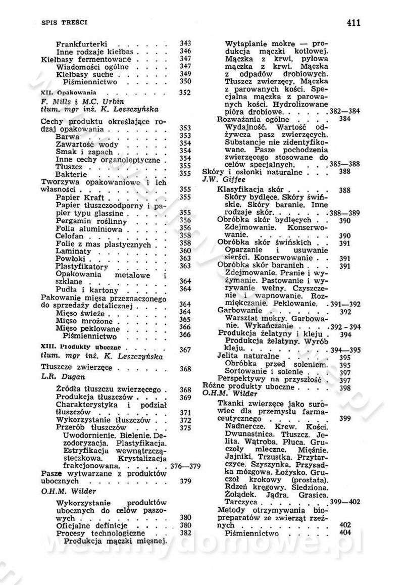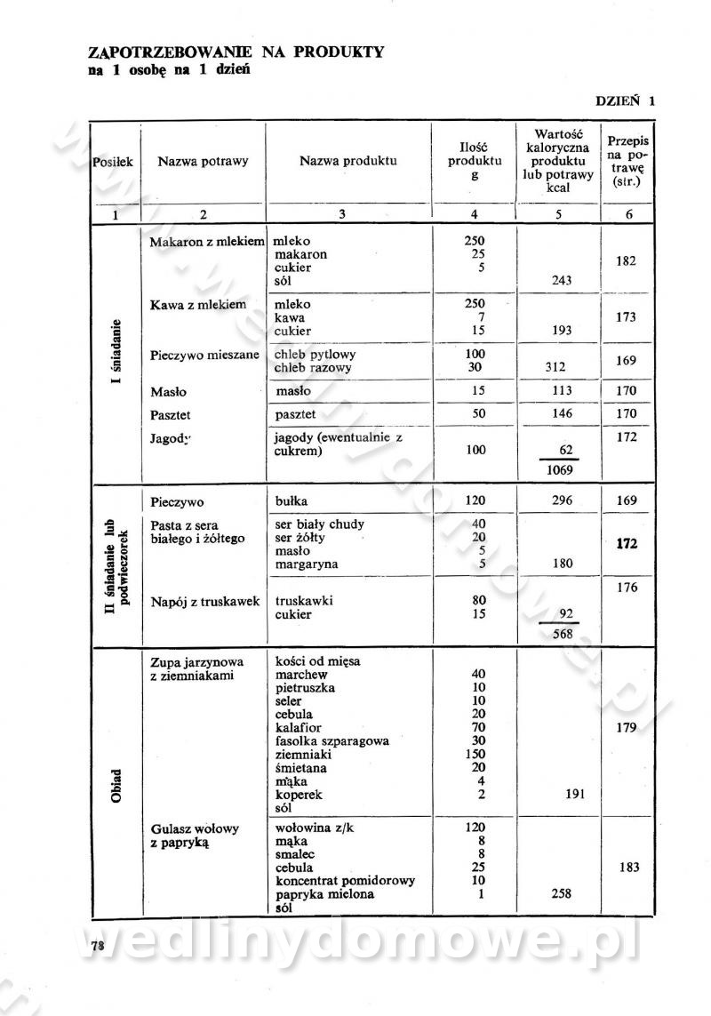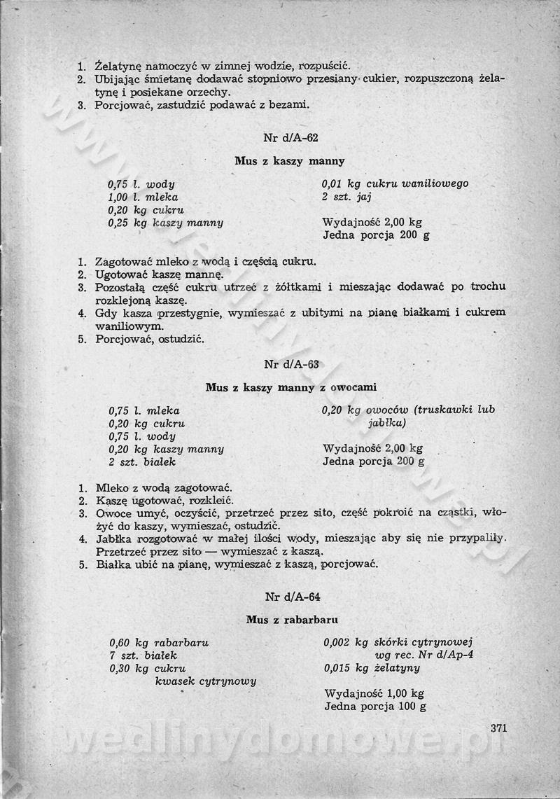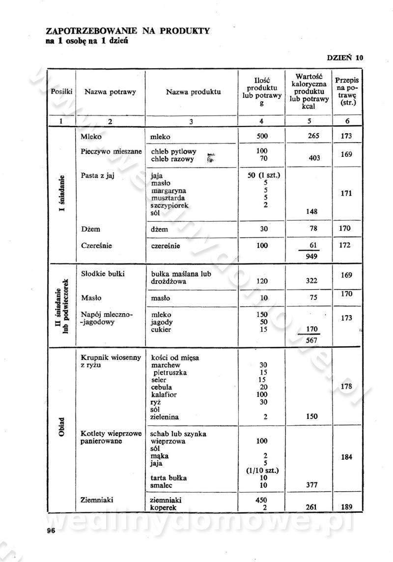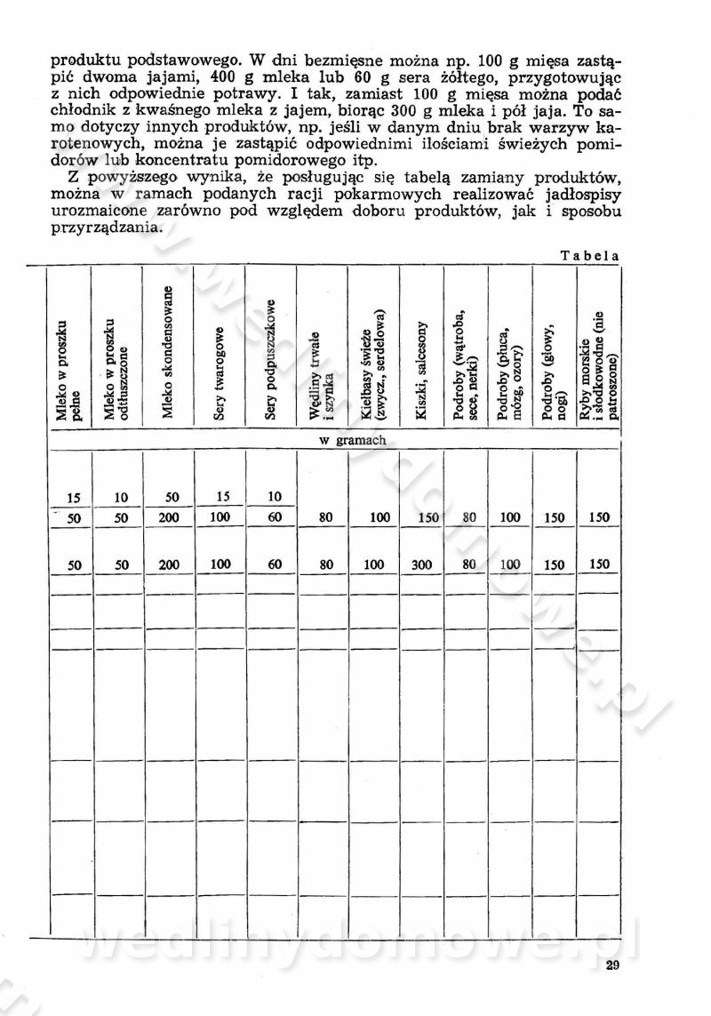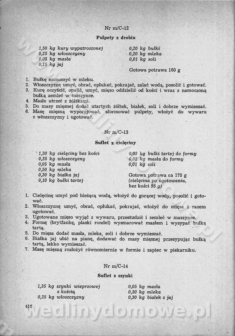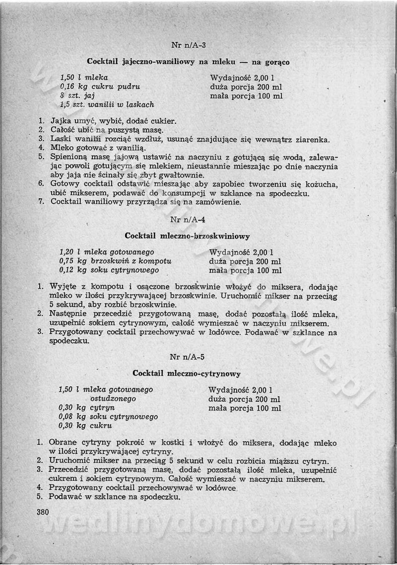 SPIS TREŚCI CZĘŚĆ I TEORETYCZNE PODSTAWY RACJONALNEGO ŻYWIENIA ZBIOROWEGO inż. Krystyna Wolf I. WSKAZÓWKI DO REALIZACJI NORM ŻYWIENIA WYRAŻONYCH W CAŁODZIENNYCH RACJACH POKARMOWYCH II. SKŁADNIKI POKARMOWE I ICH ROLA W ŻYWIENIU Zawartość składników pokarmowych w produktach Rola pożywienia Składniki pokarmowe Wzajemne zależności między składnikami pokarmowymi III. NORMY WYŻYWIENIA Normy zapotrzebowania na składniki pokarmowe Podział produktów Podział produktów na 2 grupy Podział produktów na 9 grup Podział produktów na 12 grup Całodzienne racje pokarmowe Zamiana produktów IV. WYTYCZNE PLANOWANIA ZESTAWU CAŁODZIENNYCH POSIŁKÓW Zasady podziału całodziennych racji pokarmowych na poszczególne posiłki Śniadanie Obiad Kolacja Wytyczne układania jadłospisów Kontrola prawidłowości planowania jadłospisów V. PROCESY TECHNOLOGICZNE, ICH CEL, PRZEBIEG I WPŁYW NA WARTOŚĆ ODŻYWCZĄ POTRAW Cel procesu technologicznego Obróbka wstępna i termiczna Ogólne wskazówki technologiczne Wykończanie potraw VI. WSKAZÓWKI PRAKTYCZNE DOTYCZĄCE KORZYSTANIA Z RECEPTUR CZĘŚĆ II RECEPTURY I. ZUPY inż. Jadwiga Celczyńska Podstawowe zasady sporządzania Sporządzanie wywarów Podział zup Przygotowanie głównych składników zup Wykończanie zup Rodzaje zup Zupy czyste Zupy zabielane Zupy zasmażane Zupy rozklejane Zupy mleczne Zupy owocowe Zupy z wkładką pełnowartościowego białka — samodzielne dania obiadowe lub kolacyjne Zupy czyste (normatyw surowcowy na 10 porcji) Zakwas burakowy na barszcz Zakwas na żur Barszcz burakowy czysty Barszcz czerwony czysty z zagęszczonego soku buraczanego Barszcz burakowy jarski Bulion jarski Rosół z wołowiny Zupa grzybowa czysta Zupa pomidorowa czysta Zupy rozklejane (normatyw surowcowy na 10 porcji) Krupnik na podrobach Krupnik zabielany Krupnik ze słoniną Krupnik z ryżu z jarzynami Zupa grochowa z pęczakiem Zupa grochowa z ziemniakami Zupa rumfordzka Zupa ziemniaczana z fasolą Zalewajka Zalewajka z kwaśnym mlekiem Żur z kiełbasą i boczkiem Żur na podrobach zabielany Zupy zasmażane (normatyw surowcowy na 10 porcji) Kapuśniak z kwaszonej kapusty z papryką Kapuśniak mazurski z kwaszonej kapusty Kapuśniak ze słodkiej kapusty Kapuśniak ze słodkiej kapusty z jabłkami Kapuśniak z czerwonej kapusty Zacierka z ziemniakami Zupa cebulowa Zupa z dyni i pomidorów Zupa fasolowa z makaronem Zupa fasolowa z ziemniakami Zupa z flaków wołowych Zupa „garbure” Zupa grzybowa Zupa jarzynowa z papryką Zupa jarzynowa z fasolą Zupa jarzynowa (jesienna) Zupa jarzynowa z makaronem i serem Zupa z kaszy manny zasmażana Zupa neapolitańska Zupa pomidorowa zasmażana Zupa z porów Zupa z selerów Zupa ziemniaczana zasmażana Zupa ziemniaczana z pomidorami Zupy mleczne (normatyw surowcowy na 10 porcji) Kukurydzanka na mleku Manna na mleku Ryż na mleku Makaron na mleku Płatki owsiane na mleku Zupa z dyni na mleku z tartym ciastem Zupa „nic” Zupa mleczna z lanym ciastem Zupa ze zsiadłego mleka Zupy zabielane (normatyw surowcowy na 10 porcji) Barszcz czerwony zabielany Barszcz czerwony zabielany z suszu Barszcz ukraiński Barszcz czeski Barszcz z botwiną Barszcz jarski z botwiną Chłodnik z botwiną Chłodnik z botwiną na mleku Kapuśniak ze słodkiej kapusty zabielany Kapuśniak na głowiźnie Zupa z brukselki zabielana Zupa cytrynowa Zupa z fasolki szparagowej Zupa grzybowa zabielana Zupa kalafiorowa Zupa koperkowa Zupa ogórkowa Zupa pomidorowa Zupa rybna Zupa szczawiowa Zupa pieczarkowa Zupa ze szpinaku Zupa z młodych jarzyn zabielana Zupa jarzynowa zabielana z mrożonek Zupa ziemniaczana „Paysanne” Pejzanka z puree ziemniaczanym Zupa z młodych ziemniaków Zupa ziemniaczana z porami Zupa z zielonego groszku Zupy owocowe (normatyw surowcowy na 10 porcji) Chłodnik z czarnych jagód Chłodnik truskawkowy Zupa z czarnych jagód Zupa jabłkowa Zupa jabłkowa zabielana Zupa z jabłek i śliwek Zupa ze śliwek Zupa z owoców mieszanych Zupa owocowa z suszu jabłkowego i marmolady Zupa owocowa czysta Zupa z powideł śliwkowych Zupa rabarbarowa Zupa z suszonych śliwek Zupa truskawkowa Zupa z truskawek i rabarbaru Zupy z wkładką mięsną (normatyw surowcowy na 10 porcji) Barszcz małorosyjski na rosole z mięsem Barszcz z ziemniakami i serdelkami Grochówka z mięsem i ziemniakami Kapuśniak z kwaszonej kapusty z kiełbasą Kapuśniak ze słodkiej kapusty z pomidorami i mięsem Krupnik z ryżu na mięsie Krupnik na mięsie Pejzanka na żeberkach Zupa z fasolki szparagowej na mięsie Zupa fasolowa z mięsem i makaronem Zupa jarzynowa z mięsem Gulaszowa polewka Zupa koperkowa na mięsie Zupa ogórkowa z ziemniakami na mięsie Zupa pomidorowa z makaronem i mięsem Zupa z porów z ziemniakami i wątróbką Zupa wiosenna z jajami Zupa ziemniaczana z mięsem Żur z kiełbasą i ziemniakami II. POTRAWY MIĘSNE inż. Krystyna Wolf Podstawowe zasady sporządzania Zachowanie wartości odżywczej dań mięsnych Cechy prawidłowo przyrządzonego mięsa Przechowywanie Rozmrażanie mięsa Rozbiór tuszy zwierząt rzeźnych Obróbka wstępna Obróbka termiczna Potrawy z baraniny (normatyw surowcowy na 10 porcji) Potrawka z baraniny Kotlet barani mielony Kotlet barani mielony z ryżem Baranina w warzywach Ragout baranie Baranina duszona Potrawy z cielęciny (normatyw surowcowy na 10 porcji) Potrawka cielęca Pulpety cielęce Kotlet cielęcy mielony Klopsiki cielęce do sosów Sznycel cielęcy (mielony) Filet cielęcy (do sosów i dodatków) Zrazy cielęce bite (do sosów) Zrazy cielęce nadziewane słoniną Sznycel cielęcy Zrazy cielęce po polsku (faszerowane) Paprykarz cielęcy Pieczeń cielęca duszona Pieczeń cielęca Mostek cielęcy po wiedeńsku Mostek cielęcy faszerowany Rolada cielęca faszerowana Potrawy z wieprzowiny (normatyw surowcowy na 10 porcji) Mięso wieprzowe gotowane Peklówka wieprzowa gotowana Filet wieprzowy saute Kotlet wieprzowy mielony Zraz wieprzowy (klopsik) mielony do sosów Kotlet miel