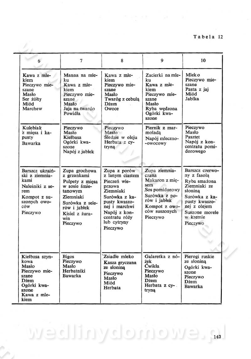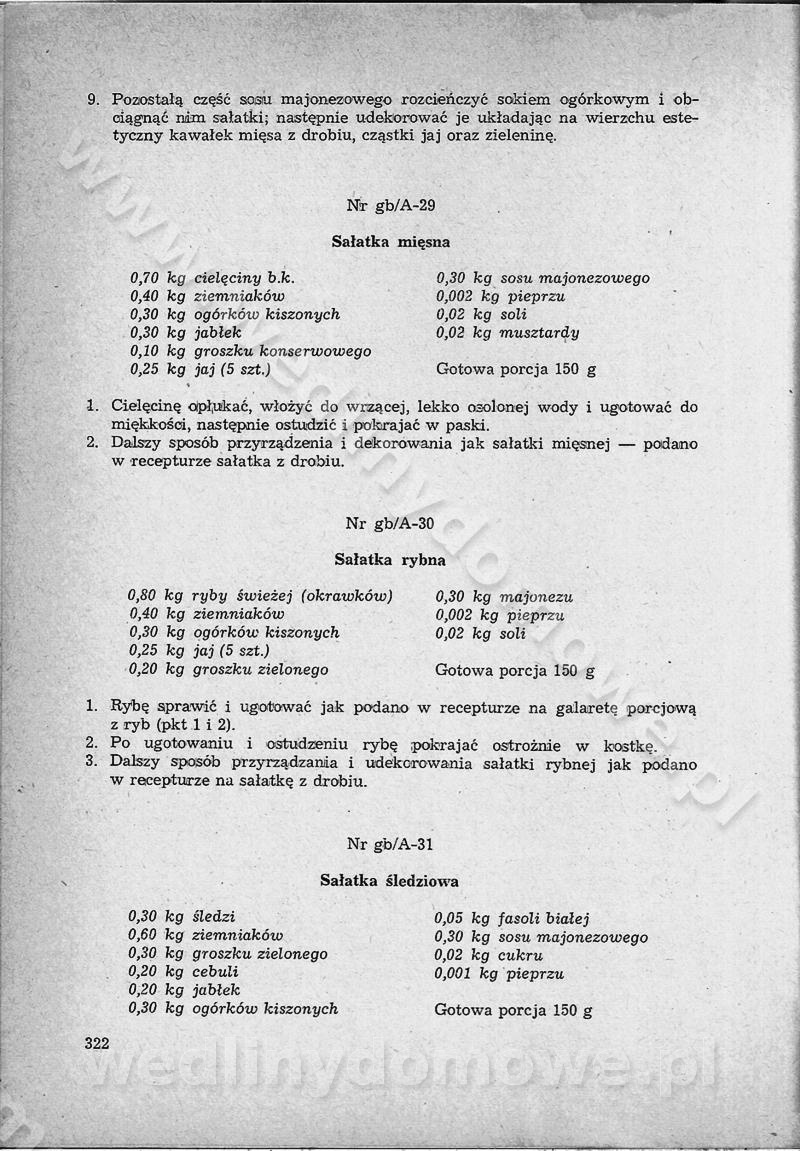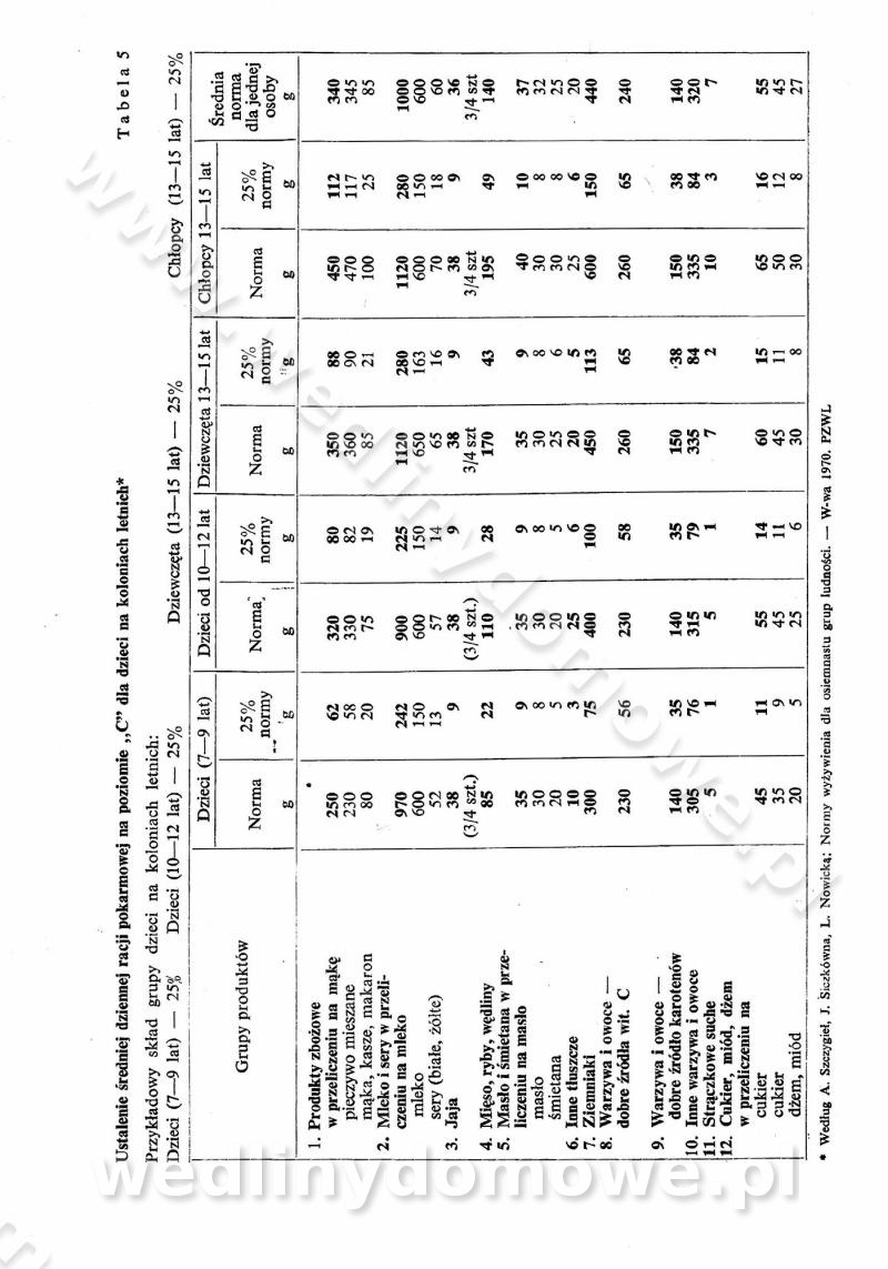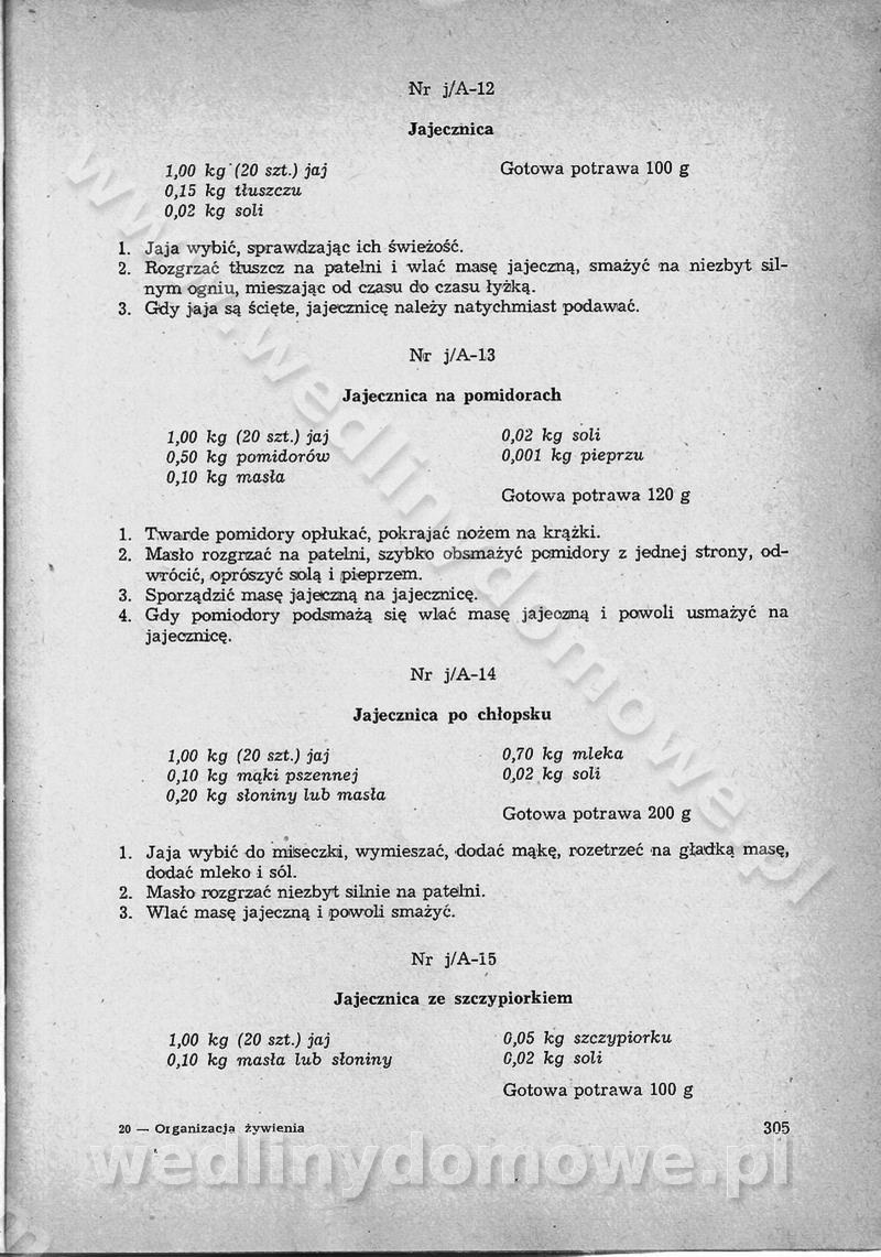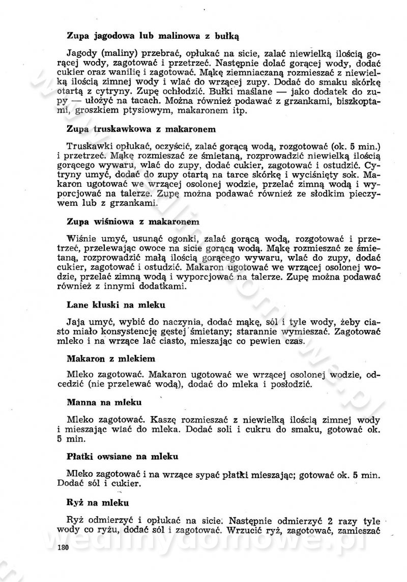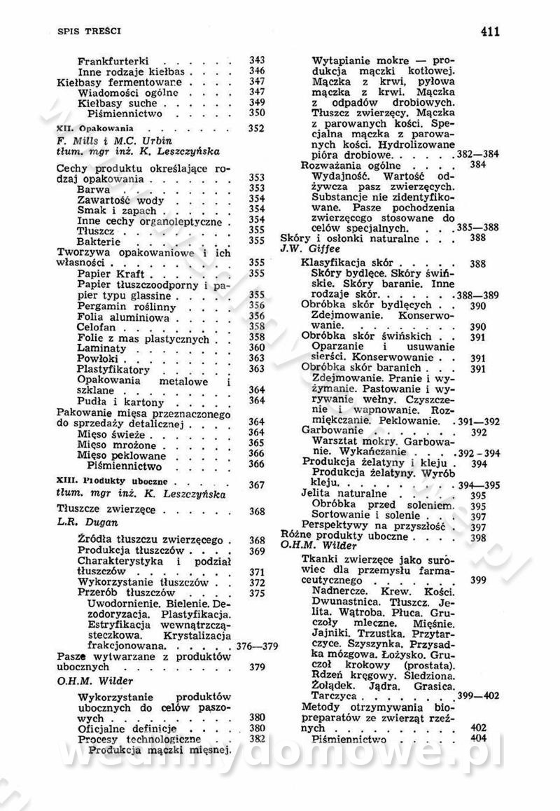 SPIS TREŚCI CZĘŚĆ I TEORETYCZNE PODSTAWY RACJONALNEGO ŻYWIENIA ZBIOROWEGO inż. Krystyna Wolf I. WSKAZÓWKI DO REALIZACJI NORM ŻYWIENIA WYRAŻONYCH W CAŁODZIENNYCH RACJACH POKARMOWYCH II. SKŁADNIKI POKARMOWE I ICH ROLA W ŻYWIENIU Zawartość składników pokarmowych w produktach Rola pożywienia Składniki pokarmowe Wzajemne zależności między składnikami pokarmowymi III. NORMY WYŻYWIENIA Normy zapotrzebowania na składniki pokarmowe Podział produktów Podział produktów na 2 grupy Podział produktów na 9 grup Podział produktów na 12 grup Całodzienne racje pokarmowe Zamiana produktów IV. WYTYCZNE PLANOWANIA ZESTAWU CAŁODZIENNYCH POSIŁKÓW Zasady podziału całodziennych racji pokarmowych na poszczególne posiłki Śniadanie Obiad Kolacja Wytyczne układania jadłospisów Kontrola prawidłowości planowania jadłospisów V. PROCESY TECHNOLOGICZNE, ICH CEL, PRZEBIEG I WPŁYW NA WARTOŚĆ ODŻYWCZĄ POTRAW Cel procesu technologicznego Obróbka wstępna i termiczna Ogólne wskazówki technologiczne Wykończanie potraw VI. WSKAZÓWKI PRAKTYCZNE DOTYCZĄCE KORZYSTANIA Z RECEPTUR CZĘŚĆ II RECEPTURY I. ZUPY inż. Jadwiga Celczyńska Podstawowe zasady sporządzania Sporządzanie wywarów Podział zup Przygotowanie głównych składników zup Wykończanie zup Rodzaje zup Zupy czyste Zupy zabielane Zupy zasmażane Zupy rozklejane Zupy mleczne Zupy owocowe Zupy z wkładką pełnowartościowego białka — samodzielne dania obiadowe lub kolacyjne Zupy czyste (normatyw surowcowy na 10 porcji) Zakwas burakowy na barszcz Zakwas na żur Barszcz burakowy czysty Barszcz czerwony czysty z zagęszczonego soku buraczanego Barszcz burakowy jarski Bulion jarski Rosół z wołowiny Zupa grzybowa czysta Zupa pomidorowa czysta Zupy rozklejane (normatyw surowcowy na 10 porcji) Krupnik na podrobach Krupnik zabielany Krupnik ze słoniną Krupnik z ryżu z jarzynami Zupa grochowa z pęczakiem Zupa grochowa z ziemniakami Zupa rumfordzka Zupa ziemniaczana z fasolą Zalewajka Zalewajka z kwaśnym mlekiem Żur z kiełbasą i boczkiem Żur na podrobach zabielany Zupy zasmażane (normatyw surowcowy na 10 porcji) Kapuśniak z kwaszonej kapusty z papryką Kapuśniak mazurski z kwaszonej kapusty Kapuśniak ze słodkiej kapusty Kapuśniak ze słodkiej kapusty z jabłkami Kapuśniak z czerwonej kapusty Zacierka z ziemniakami Zupa cebulowa Zupa z dyni i pomidorów Zupa fasolowa z makaronem Zupa fasolowa z ziemniakami Zupa z flaków wołowych Zupa „garbure” Zupa grzybowa Zupa jarzynowa z papryką Zupa jarzynowa z fasolą Zupa jarzynowa (jesienna) Zupa jarzynowa z makaronem i serem Zupa z kaszy manny zasmażana Zupa neapolitańska Zupa pomidorowa zasmażana Zupa z porów Zupa z selerów Zupa ziemniaczana zasmażana Zupa ziemniaczana z pomidorami Zupy mleczne (normatyw surowcowy na 10 porcji) Kukurydzanka na mleku Manna na mleku Ryż na mleku Makaron na mleku Płatki owsiane na mleku Zupa z dyni na mleku z tartym ciastem Zupa „nic” Zupa mleczna z lanym ciastem Zupa ze zsiadłego mleka Zupy zabielane (normatyw surowcowy na 10 porcji) Barszcz czerwony zabielany Barszcz czerwony zabielany z suszu Barszcz ukraiński Barszcz czeski Barszcz z botwiną Barszcz jarski z botwiną Chłodnik z botwiną Chłodnik z botwiną na mleku Kapuśniak ze słodkiej kapusty zabielany Kapuśniak na głowiźnie Zupa z brukselki zabielana Zupa cytrynowa Zupa z fasolki szparagowej Zupa grzybowa zabielana Zupa kalafiorowa Zupa koperkowa Zupa ogórkowa Zupa pomidorowa Zupa rybna Zupa szczawiowa Zupa pieczarkowa Zupa ze szpinaku Zupa z młodych jarzyn zabielana Zupa jarzynowa zabielana z mrożonek Zupa ziemniaczana „Paysanne” Pejzanka z puree ziemniaczanym Zupa z młodych ziemniaków Zupa ziemniaczana z porami Zupa z zielonego groszku Zupy owocowe (normatyw surowcowy na 10 porcji) Chłodnik z czarnych jagód Chłodnik truskawkowy Zupa z czarnych jagód Zupa jabłkowa Zupa jabłkowa zabielana Zupa z jabłek i śliwek Zupa ze śliwek Zupa z owoców mieszanych Zupa owocowa z suszu jabłkowego i marmolady Zupa owocowa czysta Zupa z powideł śliwkowych Zupa rabarbarowa Zupa z suszonych śliwek Zupa truskawkowa Zupa z truskawek i rabarbaru Zupy z wkładką mięsną (normatyw surowcowy na 10 porcji) Barszcz małorosyjski na rosole z mięsem Barszcz z ziemniakami i serdelkami Grochówka z mięsem i ziemniakami Kapuśniak z kwaszonej kapusty z kiełbasą Kapuśniak ze słodkiej kapusty z pomidorami i mięsem Krupnik z ryżu na mięsie Krupnik na mięsie Pejzanka na żeberkach Zupa z fasolki szparagowej na mięsie Zupa fasolowa z mięsem i makaronem Zupa jarzynowa z mięsem Gulaszowa polewka Zupa koperkowa na mięsie Zupa ogórkowa z ziemniakami na mięsie Zupa pomidorowa z makaronem i mięsem Zupa z porów z ziemniakami i wątróbką Zupa wiosenna z jajami Zupa ziemniaczana z mięsem Żur z kiełbasą i ziemniakami II. POTRAWY MIĘSNE inż. Krystyna Wolf Podstawowe zasady sporządzania Zachowanie wartości odżywczej dań mięsnych Cechy prawidłowo przyrządzonego mięsa Przechowywanie Rozmrażanie mięsa Rozbiór tuszy zwierząt rzeźnych Obróbka wstępna Obróbka termiczna Potrawy z baraniny (normatyw surowcowy na 10 porcji) Potrawka z baraniny Kotlet barani mielony Kotlet barani mielony z ryżem Baranina w warzywach Ragout baranie Baranina duszona Potrawy z cielęciny (normatyw surowcowy na 10 porcji) Potrawka cielęca Pulpety cielęce Kotlet cielęcy mielony Klopsiki cielęce do sosów Sznycel cielęcy (mielony) Filet cielęcy (do sosów i dodatków) Zrazy cielęce bite (do sosów) Zrazy cielęce nadziewane słoniną Sznycel cielęcy Zrazy cielęce po polsku (faszerowane) Paprykarz cielęcy Pieczeń cielęca duszona Pieczeń cielęca Mostek cielęcy po wiedeńsku Mostek cielęcy faszerowany Rolada cielęca faszerowana Potrawy z wieprzowiny (normatyw surowcowy na 10 porcji) Mięso wieprzowe gotowane Peklówka wieprzowa gotowana Filet wieprzowy saute Kotlet wieprzowy mielony Zraz wieprzowy (klopsik) mielony do sosów Kotlet miel