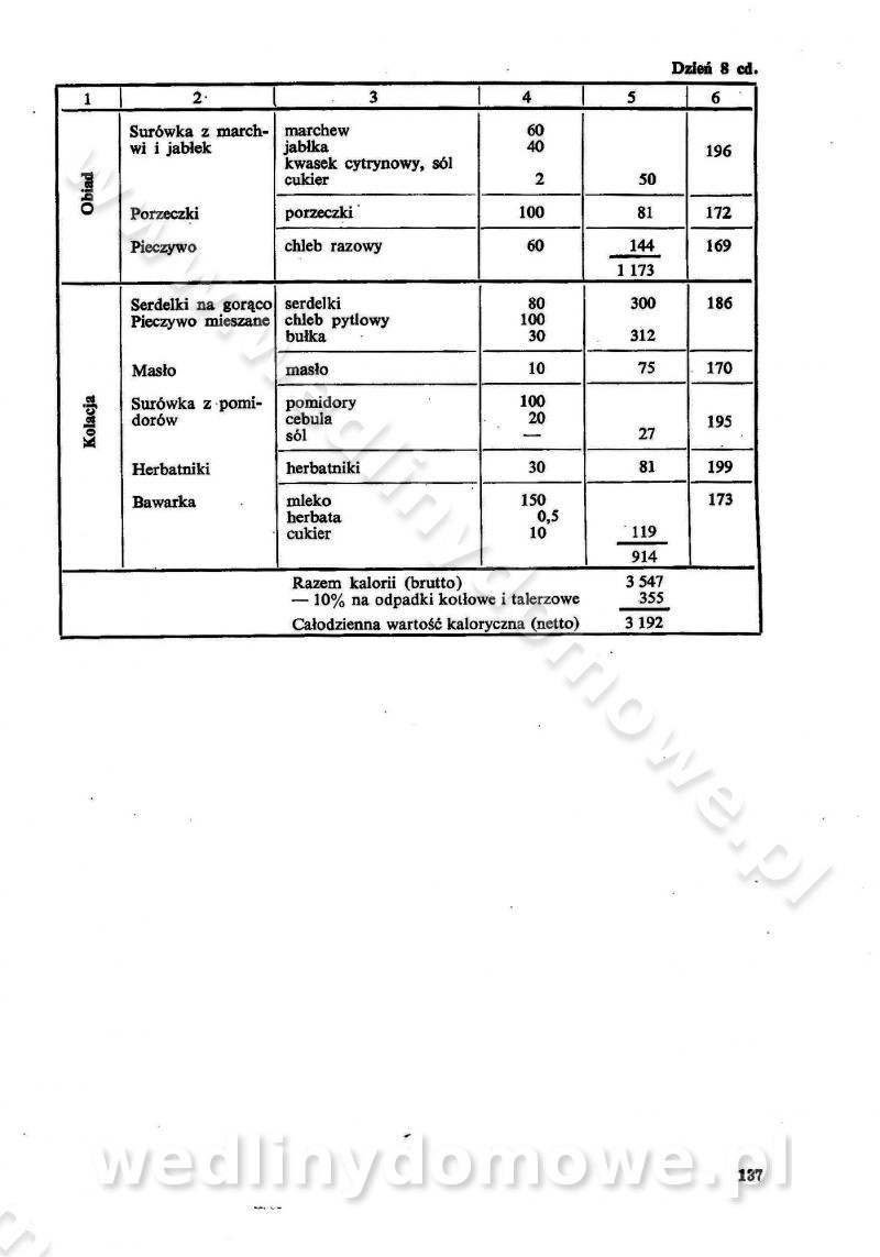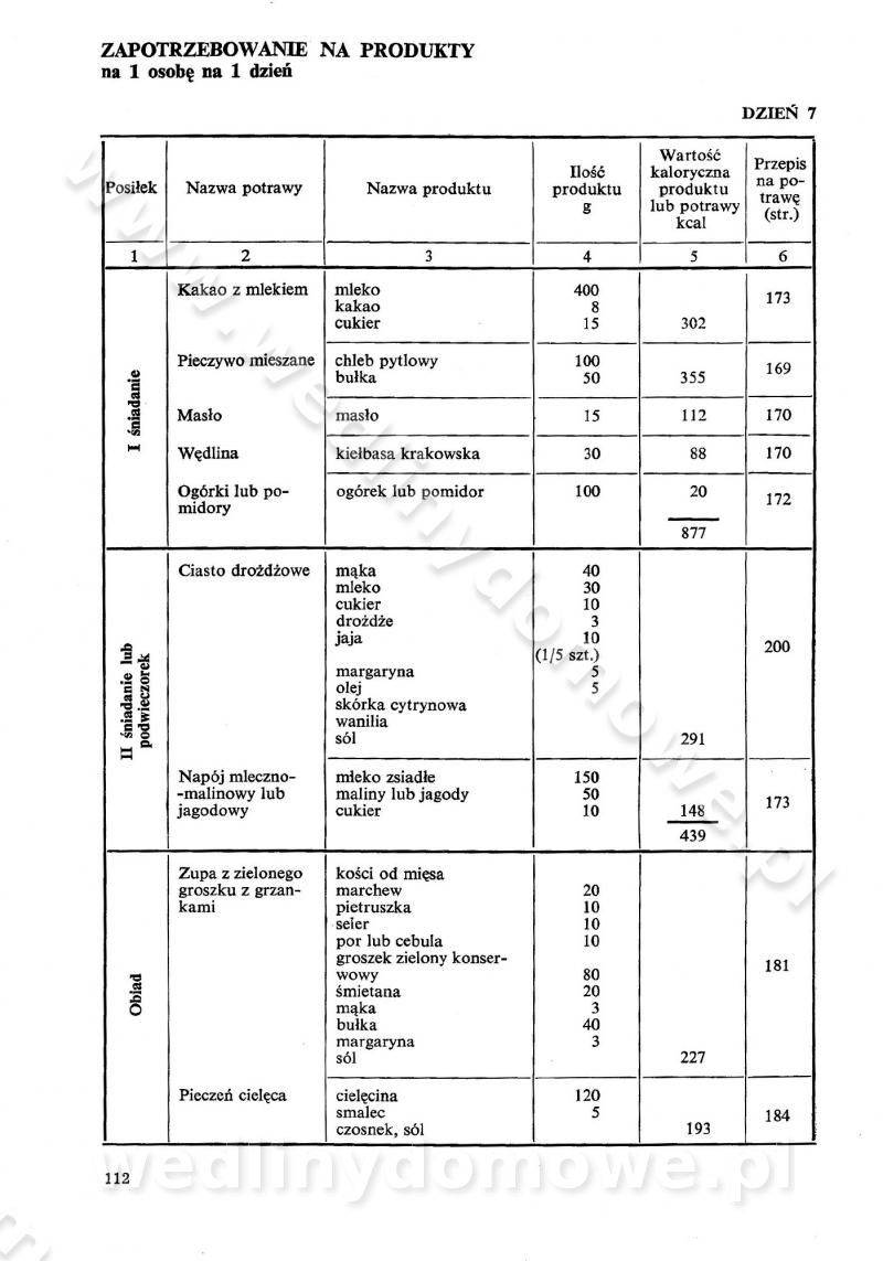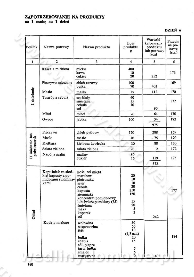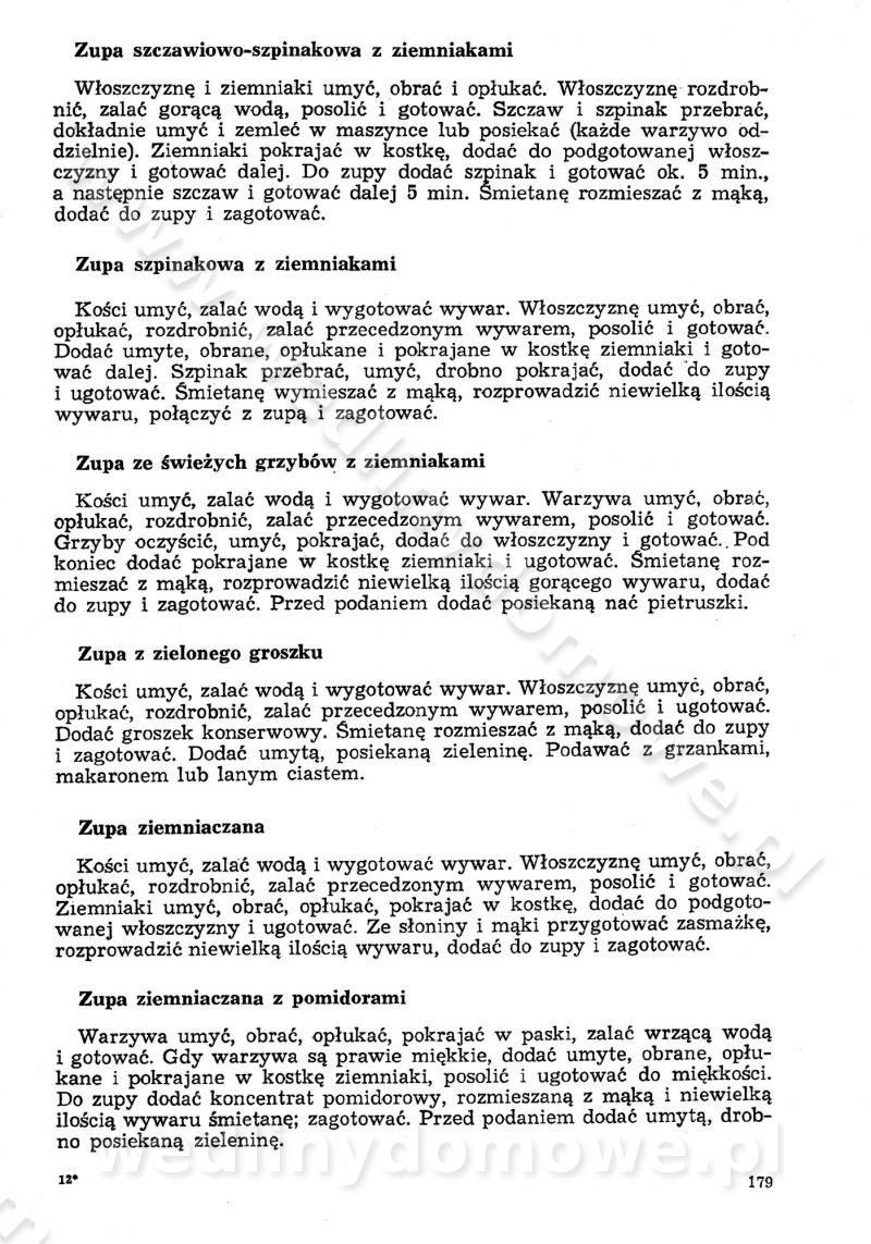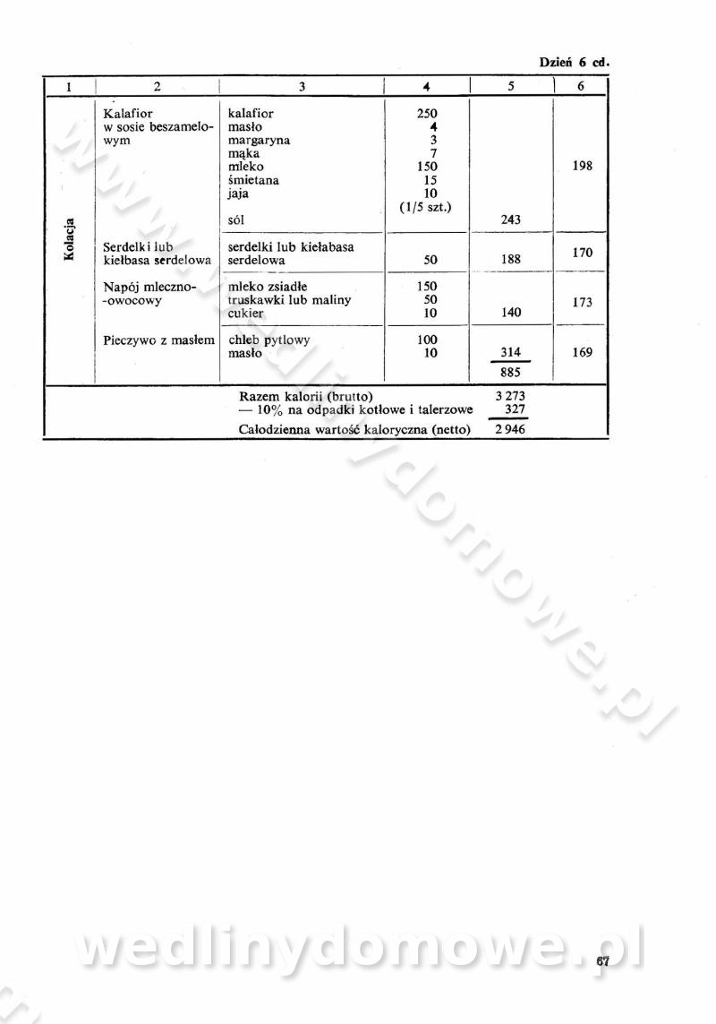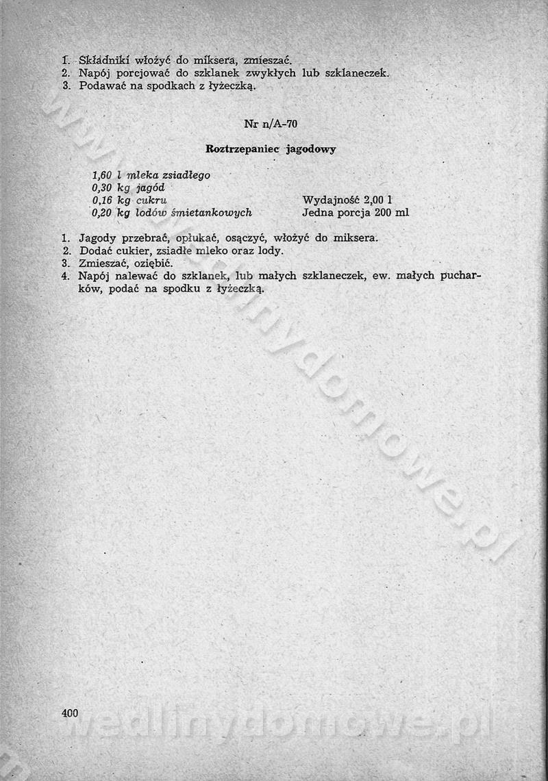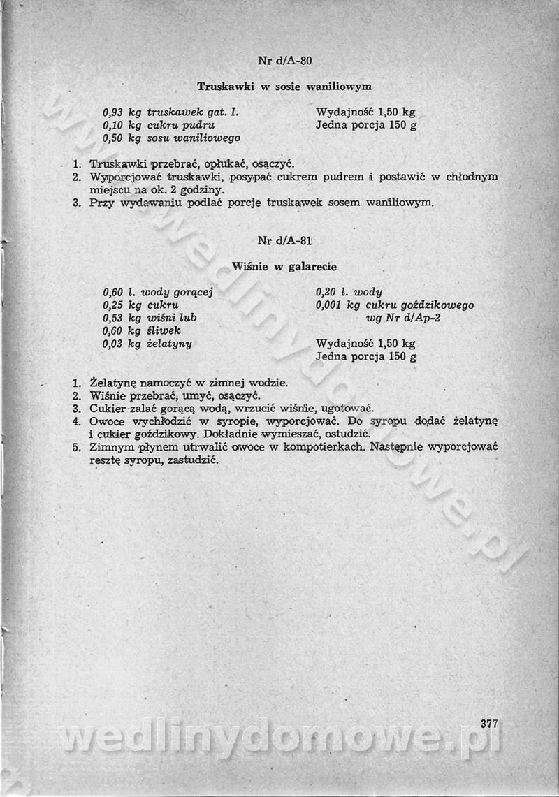 SPIS TREŚCI CZĘŚĆ I TEORETYCZNE PODSTAWY RACJONALNEGO ŻYWIENIA ZBIOROWEGO inż. Krystyna Wolf I. WSKAZÓWKI DO REALIZACJI NORM ŻYWIENIA WYRAŻONYCH W CAŁODZIENNYCH RACJACH POKARMOWYCH II. SKŁADNIKI POKARMOWE I ICH ROLA W ŻYWIENIU Zawartość składników pokarmowych w produktach Rola pożywienia Składniki pokarmowe Wzajemne zależności między składnikami pokarmowymi III. NORMY WYŻYWIENIA Normy zapotrzebowania na składniki pokarmowe Podział produktów Podział produktów na 2 grupy Podział produktów na 9 grup Podział produktów na 12 grup Całodzienne racje pokarmowe Zamiana produktów IV. WYTYCZNE PLANOWANIA ZESTAWU CAŁODZIENNYCH POSIŁKÓW Zasady podziału całodziennych racji pokarmowych na poszczególne posiłki Śniadanie Obiad Kolacja Wytyczne układania jadłospisów Kontrola prawidłowości planowania jadłospisów V. PROCESY TECHNOLOGICZNE, ICH CEL, PRZEBIEG I WPŁYW NA WARTOŚĆ ODŻYWCZĄ POTRAW Cel procesu technologicznego Obróbka wstępna i termiczna Ogólne wskazówki technologiczne Wykończanie potraw VI. WSKAZÓWKI PRAKTYCZNE DOTYCZĄCE KORZYSTANIA Z RECEPTUR CZĘŚĆ II RECEPTURY I. ZUPY inż. Jadwiga Celczyńska Podstawowe zasady sporządzania Sporządzanie wywarów Podział zup Przygotowanie głównych składników zup Wykończanie zup Rodzaje zup Zupy czyste Zupy zabielane Zupy zasmażane Zupy rozklejane Zupy mleczne Zupy owocowe Zupy z wkładką pełnowartościowego białka — samodzielne dania obiadowe lub kolacyjne Zupy czyste (normatyw surowcowy na 10 porcji) Zakwas burakowy na barszcz Zakwas na żur Barszcz burakowy czysty Barszcz czerwony czysty z zagęszczonego soku buraczanego Barszcz burakowy jarski Bulion jarski Rosół z wołowiny Zupa grzybowa czysta Zupa pomidorowa czysta Zupy rozklejane (normatyw surowcowy na 10 porcji) Krupnik na podrobach Krupnik zabielany Krupnik ze słoniną Krupnik z ryżu z jarzynami Zupa grochowa z pęczakiem Zupa grochowa z ziemniakami Zupa rumfordzka Zupa ziemniaczana z fasolą Zalewajka Zalewajka z kwaśnym mlekiem Żur z kiełbasą i boczkiem Żur na podrobach zabielany Zupy zasmażane (normatyw surowcowy na 10 porcji) Kapuśniak z kwaszonej kapusty z papryką Kapuśniak mazurski z kwaszonej kapusty Kapuśniak ze słodkiej kapusty Kapuśniak ze słodkiej kapusty z jabłkami Kapuśniak z czerwonej kapusty Zacierka z ziemniakami Zupa cebulowa Zupa z dyni i pomidorów Zupa fasolowa z makaronem Zupa fasolowa z ziemniakami Zupa z flaków wołowych Zupa „garbure” Zupa grzybowa Zupa jarzynowa z papryką Zupa jarzynowa z fasolą Zupa jarzynowa (jesienna) Zupa jarzynowa z makaronem i serem Zupa z kaszy manny zasmażana Zupa neapolitańska Zupa pomidorowa zasmażana Zupa z porów Zupa z selerów Zupa ziemniaczana zasmażana Zupa ziemniaczana z pomidorami Zupy mleczne (normatyw surowcowy na 10 porcji) Kukurydzanka na mleku Manna na mleku Ryż na mleku Makaron na mleku Płatki owsiane na mleku Zupa z dyni na mleku z tartym ciastem Zupa „nic” Zupa mleczna z lanym ciastem Zupa ze zsiadłego mleka Zupy zabielane (normatyw surowcowy na 10 porcji) Barszcz czerwony zabielany Barszcz czerwony zabielany z suszu Barszcz ukraiński Barszcz czeski Barszcz z botwiną Barszcz jarski z botwiną Chłodnik z botwiną Chłodnik z botwiną na mleku Kapuśniak ze słodkiej kapusty zabielany Kapuśniak na głowiźnie Zupa z brukselki zabielana Zupa cytrynowa Zupa z fasolki szparagowej Zupa grzybowa zabielana Zupa kalafiorowa Zupa koperkowa Zupa ogórkowa Zupa pomidorowa Zupa rybna Zupa szczawiowa Zupa pieczarkowa Zupa ze szpinaku Zupa z młodych jarzyn zabielana Zupa jarzynowa zabielana z mrożonek Zupa ziemniaczana „Paysanne” Pejzanka z puree ziemniaczanym Zupa z młodych ziemniaków Zupa ziemniaczana z porami Zupa z zielonego groszku Zupy owocowe (normatyw surowcowy na 10 porcji) Chłodnik z czarnych jagód Chłodnik truskawkowy Zupa z czarnych jagód Zupa jabłkowa Zupa jabłkowa zabielana Zupa z jabłek i śliwek Zupa ze śliwek Zupa z owoców mieszanych Zupa owocowa z suszu jabłkowego i marmolady Zupa owocowa czysta Zupa z powideł śliwkowych Zupa rabarbarowa Zupa z suszonych śliwek Zupa truskawkowa Zupa z truskawek i rabarbaru Zupy z wkładką mięsną (normatyw surowcowy na 10 porcji) Barszcz małorosyjski na rosole z mięsem Barszcz z ziemniakami i serdelkami Grochówka z mięsem i ziemniakami Kapuśniak z kwaszonej kapusty z kiełbasą Kapuśniak ze słodkiej kapusty z pomidorami i mięsem Krupnik z ryżu na mięsie Krupnik na mięsie Pejzanka na żeberkach Zupa z fasolki szparagowej na mięsie Zupa fasolowa z mięsem i makaronem Zupa jarzynowa z mięsem Gulaszowa polewka Zupa koperkowa na mięsie Zupa ogórkowa z ziemniakami na mięsie Zupa pomidorowa z makaronem i mięsem Zupa z porów z ziemniakami i wątróbką Zupa wiosenna z jajami Zupa ziemniaczana z mięsem Żur z kiełbasą i ziemniakami II. POTRAWY MIĘSNE inż. Krystyna Wolf Podstawowe zasady sporządzania Zachowanie wartości odżywczej dań mięsnych Cechy prawidłowo przyrządzonego mięsa Przechowywanie Rozmrażanie mięsa Rozbiór tuszy zwierząt rzeźnych Obróbka wstępna Obróbka termiczna Potrawy z baraniny (normatyw surowcowy na 10 porcji) Potrawka z baraniny Kotlet barani mielony Kotlet barani mielony z ryżem Baranina w warzywach Ragout baranie Baranina duszona Potrawy z cielęciny (normatyw surowcowy na 10 porcji) Potrawka cielęca Pulpety cielęce Kotlet cielęcy mielony Klopsiki cielęce do sosów Sznycel cielęcy (mielony) Filet cielęcy (do sosów i dodatków) Zrazy cielęce bite (do sosów) Zrazy cielęce nadziewane słoniną Sznycel cielęcy Zrazy cielęce po polsku (faszerowane) Paprykarz cielęcy Pieczeń cielęca duszona Pieczeń cielęca Mostek cielęcy po wiedeńsku Mostek cielęcy faszerowany Rolada cielęca faszerowana Potrawy z wieprzowiny (normatyw surowcowy na 10 porcji) Mięso wieprzowe gotowane Peklówka wieprzowa gotowana Filet wieprzowy saute Kotlet wieprzowy mielony Zraz wieprzowy (klopsik) mielony do sosów Kotlet miel