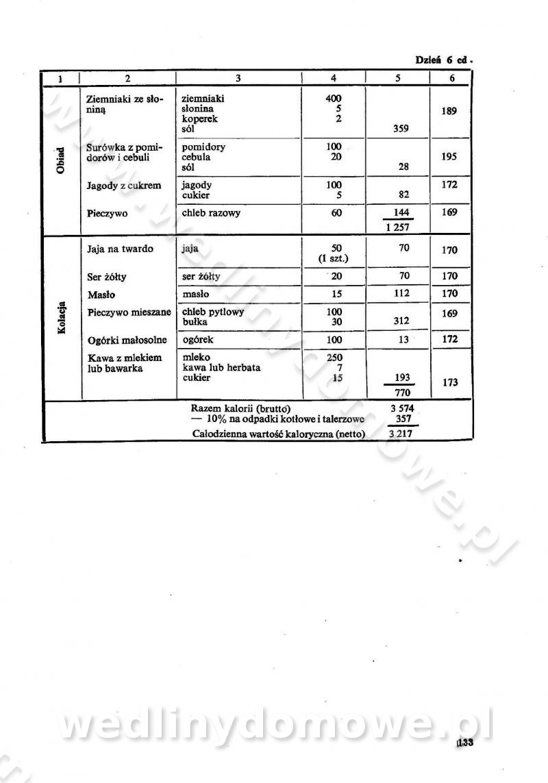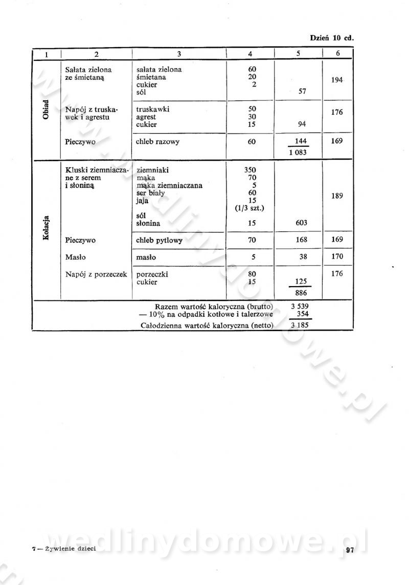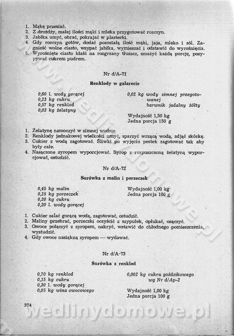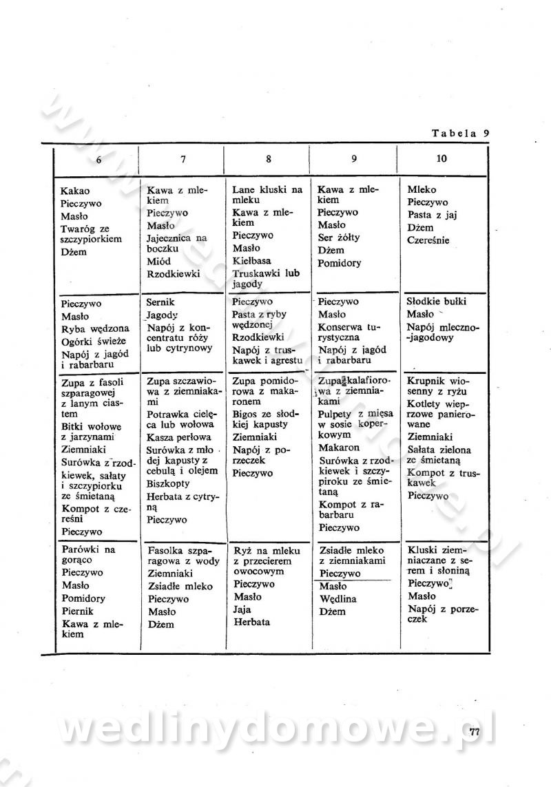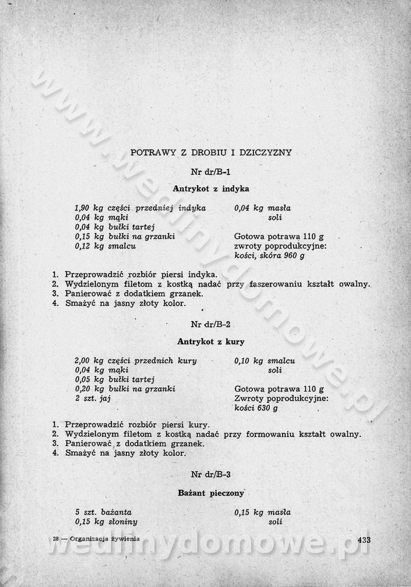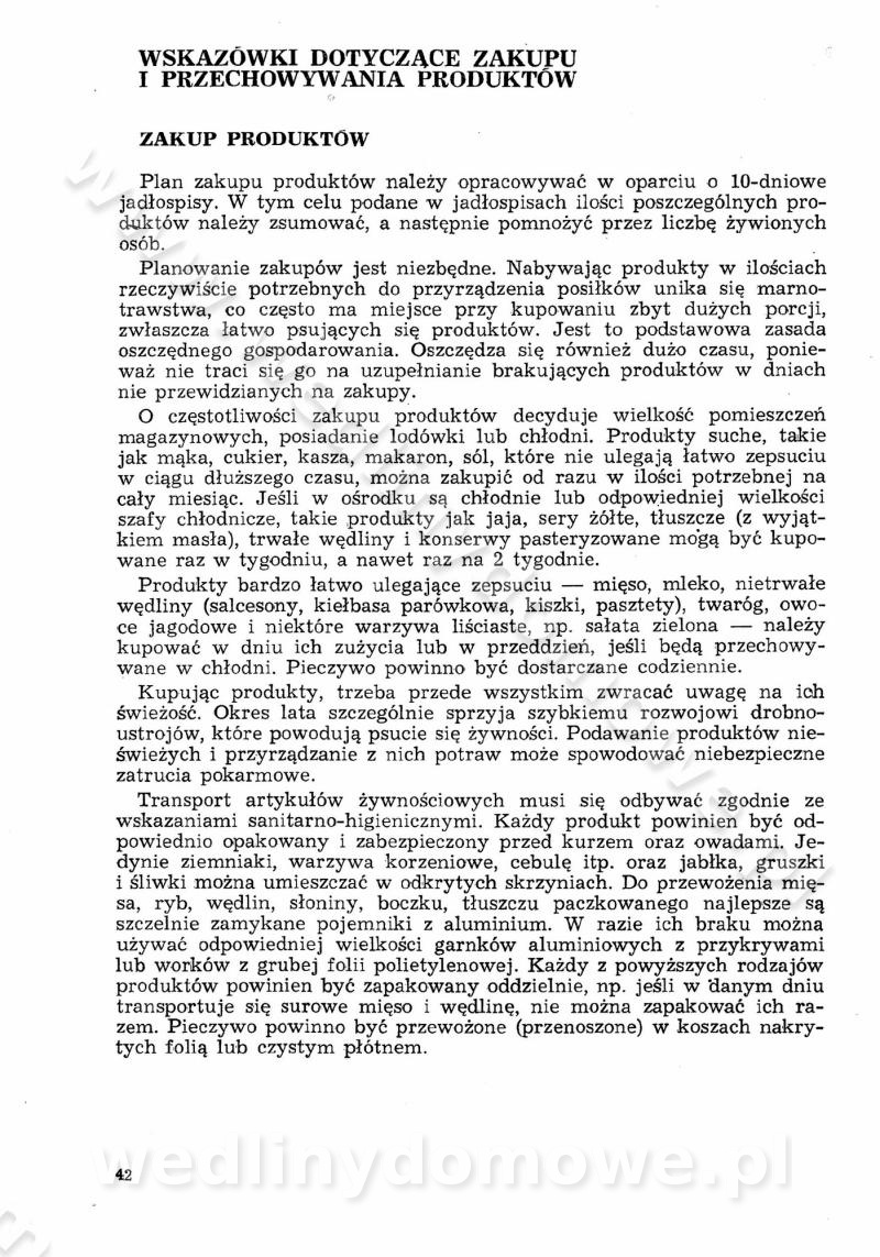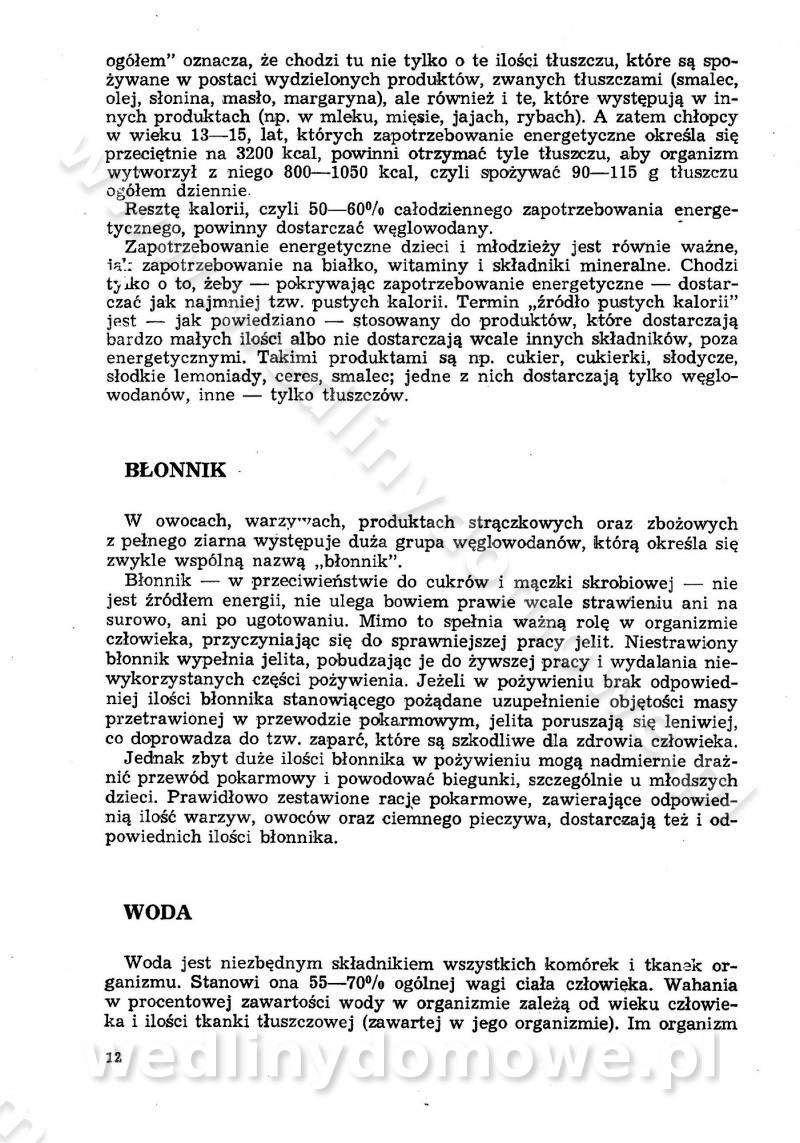 SPIS TREŚCI CZĘŚĆ I TEORETYCZNE PODSTAWY RACJONALNEGO ŻYWIENIA ZBIOROWEGO inż. Krystyna Wolf I. WSKAZÓWKI DO REALIZACJI NORM ŻYWIENIA WYRAŻONYCH W CAŁODZIENNYCH RACJACH POKARMOWYCH II. SKŁADNIKI POKARMOWE I ICH ROLA W ŻYWIENIU Zawartość składników pokarmowych w produktach Rola pożywienia Składniki pokarmowe Wzajemne zależności między składnikami pokarmowymi III. NORMY WYŻYWIENIA Normy zapotrzebowania na składniki pokarmowe Podział produktów Podział produktów na 2 grupy Podział produktów na 9 grup Podział produktów na 12 grup Całodzienne racje pokarmowe Zamiana produktów IV. WYTYCZNE PLANOWANIA ZESTAWU CAŁODZIENNYCH POSIŁKÓW Zasady podziału całodziennych racji pokarmowych na poszczególne posiłki Śniadanie Obiad Kolacja Wytyczne układania jadłospisów Kontrola prawidłowości planowania jadłospisów V. PROCESY TECHNOLOGICZNE, ICH CEL, PRZEBIEG I WPŁYW NA WARTOŚĆ ODŻYWCZĄ POTRAW Cel procesu technologicznego Obróbka wstępna i termiczna Ogólne wskazówki technologiczne Wykończanie potraw VI. WSKAZÓWKI PRAKTYCZNE DOTYCZĄCE KORZYSTANIA Z RECEPTUR CZĘŚĆ II RECEPTURY I. ZUPY inż. Jadwiga Celczyńska Podstawowe zasady sporządzania Sporządzanie wywarów Podział zup Przygotowanie głównych składników zup Wykończanie zup Rodzaje zup Zupy czyste Zupy zabielane Zupy zasmażane Zupy rozklejane Zupy mleczne Zupy owocowe Zupy z wkładką pełnowartościowego białka — samodzielne dania obiadowe lub kolacyjne Zupy czyste (normatyw surowcowy na 10 porcji) Zakwas burakowy na barszcz Zakwas na żur Barszcz burakowy czysty Barszcz czerwony czysty z zagęszczonego soku buraczanego Barszcz burakowy jarski Bulion jarski Rosół z wołowiny Zupa grzybowa czysta Zupa pomidorowa czysta Zupy rozklejane (normatyw surowcowy na 10 porcji) Krupnik na podrobach Krupnik zabielany Krupnik ze słoniną Krupnik z ryżu z jarzynami Zupa grochowa z pęczakiem Zupa grochowa z ziemniakami Zupa rumfordzka Zupa ziemniaczana z fasolą Zalewajka Zalewajka z kwaśnym mlekiem Żur z kiełbasą i boczkiem Żur na podrobach zabielany Zupy zasmażane (normatyw surowcowy na 10 porcji) Kapuśniak z kwaszonej kapusty z papryką Kapuśniak mazurski z kwaszonej kapusty Kapuśniak ze słodkiej kapusty Kapuśniak ze słodkiej kapusty z jabłkami Kapuśniak z czerwonej kapusty Zacierka z ziemniakami Zupa cebulowa Zupa z dyni i pomidorów Zupa fasolowa z makaronem Zupa fasolowa z ziemniakami Zupa z flaków wołowych Zupa „garbure” Zupa grzybowa Zupa jarzynowa z papryką Zupa jarzynowa z fasolą Zupa jarzynowa (jesienna) Zupa jarzynowa z makaronem i serem Zupa z kaszy manny zasmażana Zupa neapolitańska Zupa pomidorowa zasmażana Zupa z porów Zupa z selerów Zupa ziemniaczana zasmażana Zupa ziemniaczana z pomidorami Zupy mleczne (normatyw surowcowy na 10 porcji) Kukurydzanka na mleku Manna na mleku Ryż na mleku Makaron na mleku Płatki owsiane na mleku Zupa z dyni na mleku z tartym ciastem Zupa „nic” Zupa mleczna z lanym ciastem Zupa ze zsiadłego mleka Zupy zabielane (normatyw surowcowy na 10 porcji) Barszcz czerwony zabielany Barszcz czerwony zabielany z suszu Barszcz ukraiński Barszcz czeski Barszcz z botwiną Barszcz jarski z botwiną Chłodnik z botwiną Chłodnik z botwiną na mleku Kapuśniak ze słodkiej kapusty zabielany Kapuśniak na głowiźnie Zupa z brukselki zabielana Zupa cytrynowa Zupa z fasolki szparagowej Zupa grzybowa zabielana Zupa kalafiorowa Zupa koperkowa Zupa ogórkowa Zupa pomidorowa Zupa rybna Zupa szczawiowa Zupa pieczarkowa Zupa ze szpinaku Zupa z młodych jarzyn zabielana Zupa jarzynowa zabielana z mrożonek Zupa ziemniaczana „Paysanne” Pejzanka z puree ziemniaczanym Zupa z młodych ziemniaków Zupa ziemniaczana z porami Zupa z zielonego groszku Zupy owocowe (normatyw surowcowy na 10 porcji) Chłodnik z czarnych jagód Chłodnik truskawkowy Zupa z czarnych jagód Zupa jabłkowa Zupa jabłkowa zabielana Zupa z jabłek i śliwek Zupa ze śliwek Zupa z owoców mieszanych Zupa owocowa z suszu jabłkowego i marmolady Zupa owocowa czysta Zupa z powideł śliwkowych Zupa rabarbarowa Zupa z suszonych śliwek Zupa truskawkowa Zupa z truskawek i rabarbaru Zupy z wkładką mięsną (normatyw surowcowy na 10 porcji) Barszcz małorosyjski na rosole z mięsem Barszcz z ziemniakami i serdelkami Grochówka z mięsem i ziemniakami Kapuśniak z kwaszonej kapusty z kiełbasą Kapuśniak ze słodkiej kapusty z pomidorami i mięsem Krupnik z ryżu na mięsie Krupnik na mięsie Pejzanka na żeberkach Zupa z fasolki szparagowej na mięsie Zupa fasolowa z mięsem i makaronem Zupa jarzynowa z mięsem Gulaszowa polewka Zupa koperkowa na mięsie Zupa ogórkowa z ziemniakami na mięsie Zupa pomidorowa z makaronem i mięsem Zupa z porów z ziemniakami i wątróbką Zupa wiosenna z jajami Zupa ziemniaczana z mięsem Żur z kiełbasą i ziemniakami II. POTRAWY MIĘSNE inż. Krystyna Wolf Podstawowe zasady sporządzania Zachowanie wartości odżywczej dań mięsnych Cechy prawidłowo przyrządzonego mięsa Przechowywanie Rozmrażanie mięsa Rozbiór tuszy zwierząt rzeźnych Obróbka wstępna Obróbka termiczna Potrawy z baraniny (normatyw surowcowy na 10 porcji) Potrawka z baraniny Kotlet barani mielony Kotlet barani mielony z ryżem Baranina w warzywach Ragout baranie Baranina duszona Potrawy z cielęciny (normatyw surowcowy na 10 porcji) Potrawka cielęca Pulpety cielęce Kotlet cielęcy mielony Klopsiki cielęce do sosów Sznycel cielęcy (mielony) Filet cielęcy (do sosów i dodatków) Zrazy cielęce bite (do sosów) Zrazy cielęce nadziewane słoniną Sznycel cielęcy Zrazy cielęce po polsku (faszerowane) Paprykarz cielęcy Pieczeń cielęca duszona Pieczeń cielęca Mostek cielęcy po wiedeńsku Mostek cielęcy faszerowany Rolada cielęca faszerowana Potrawy z wieprzowiny (normatyw surowcowy na 10 porcji) Mięso wieprzowe gotowane Peklówka wieprzowa gotowana Filet wieprzowy saute Kotlet wieprzowy mielony Zraz wieprzowy (klopsik) mielony do sosów Kotlet miel