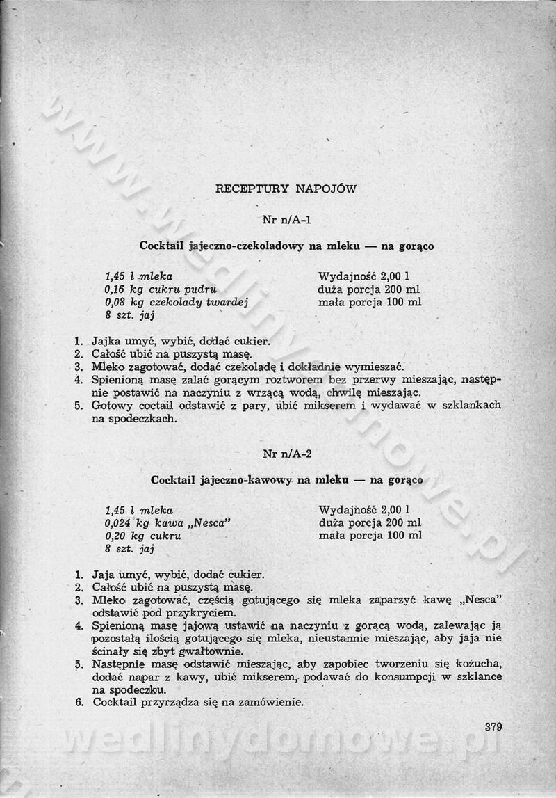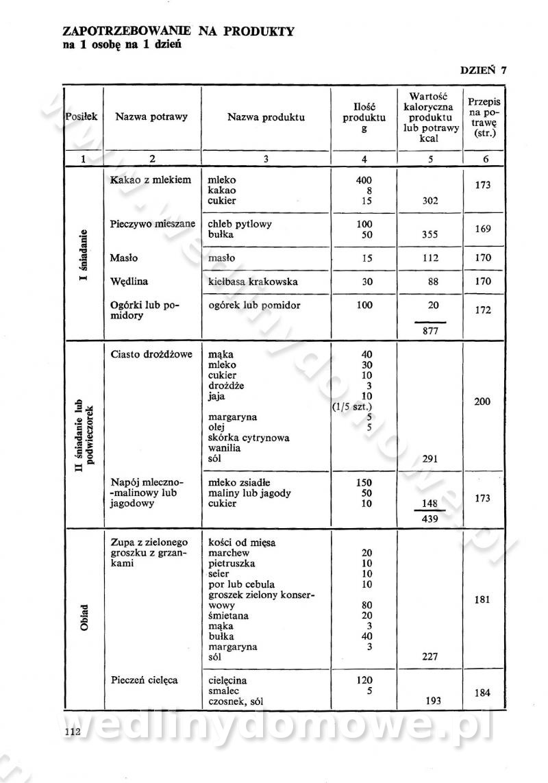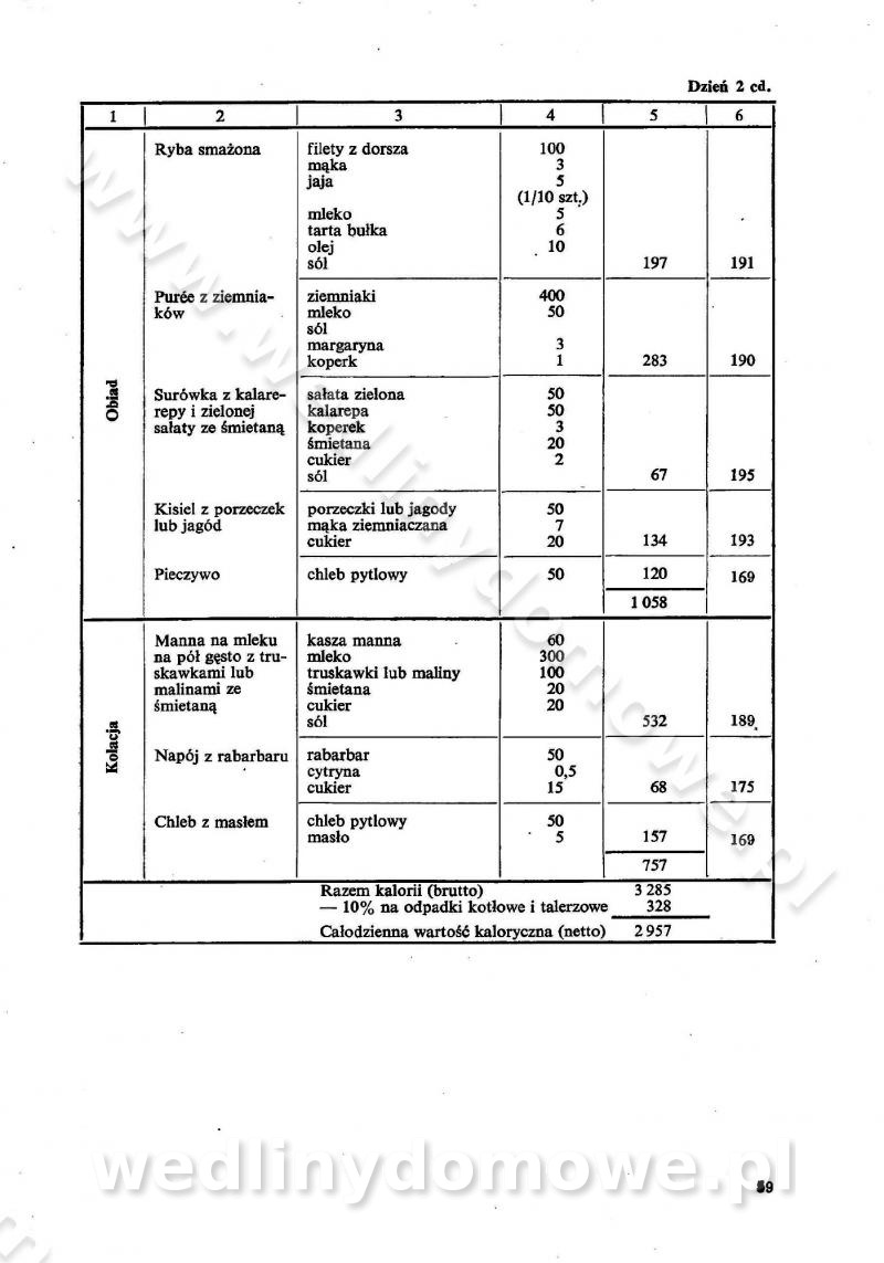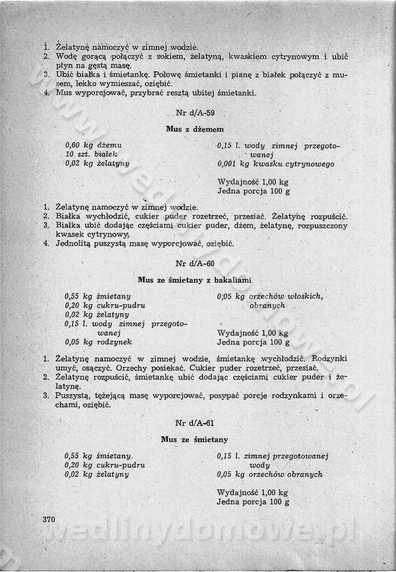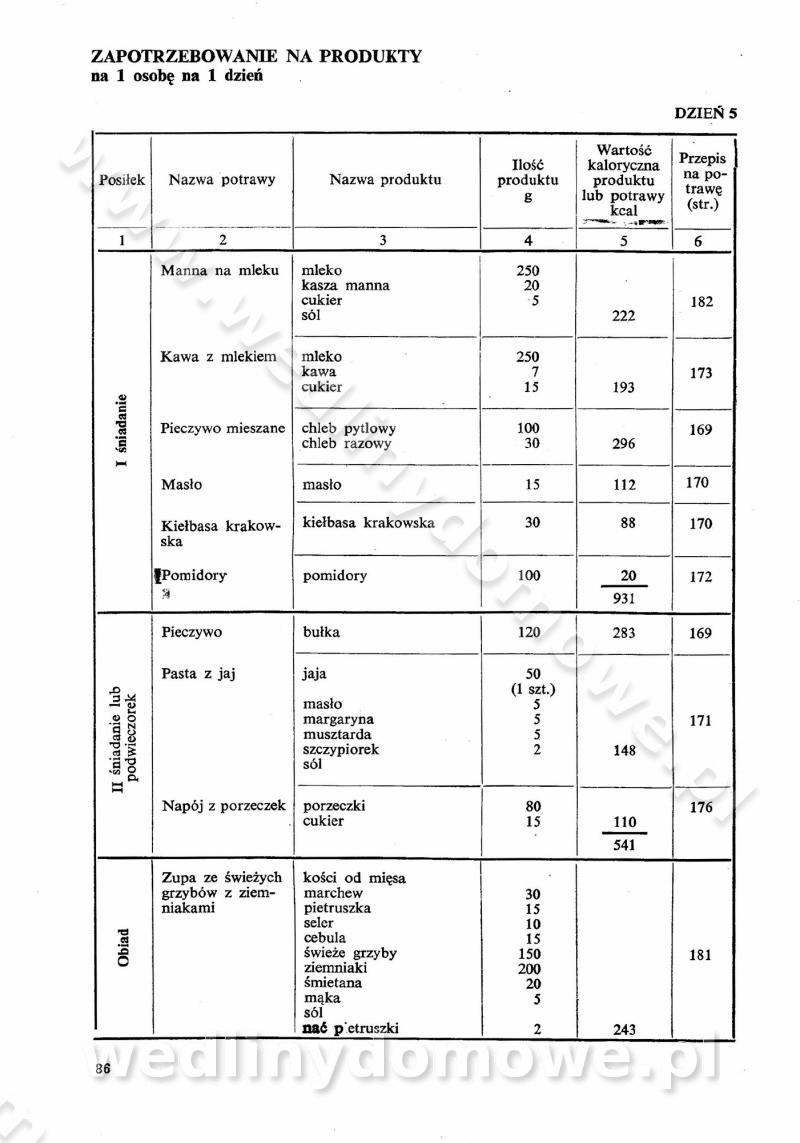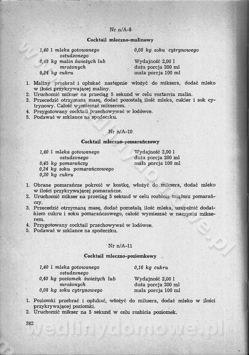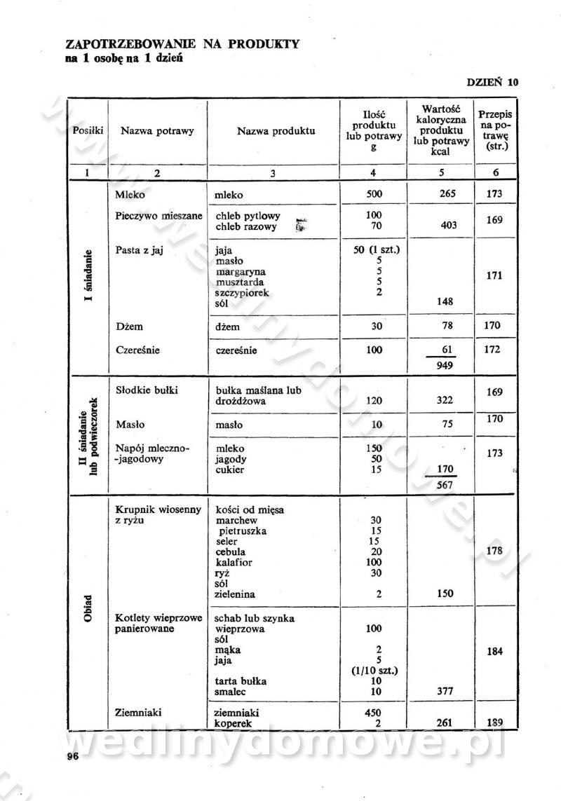 SPIS TREŚCI CZĘŚĆ I TEORETYCZNE PODSTAWY RACJONALNEGO ŻYWIENIA ZBIOROWEGO inż. Krystyna Wolf I. WSKAZÓWKI DO REALIZACJI NORM ŻYWIENIA WYRAŻONYCH W CAŁODZIENNYCH RACJACH POKARMOWYCH II. SKŁADNIKI POKARMOWE I ICH ROLA W ŻYWIENIU Zawartość składników pokarmowych w produktach Rola pożywienia Składniki pokarmowe Wzajemne zależności między składnikami pokarmowymi III. NORMY WYŻYWIENIA Normy zapotrzebowania na składniki pokarmowe Podział produktów Podział produktów na 2 grupy Podział produktów na 9 grup Podział produktów na 12 grup Całodzienne racje pokarmowe Zamiana produktów IV. WYTYCZNE PLANOWANIA ZESTAWU CAŁODZIENNYCH POSIŁKÓW Zasady podziału całodziennych racji pokarmowych na poszczególne posiłki Śniadanie Obiad Kolacja Wytyczne układania jadłospisów Kontrola prawidłowości planowania jadłospisów V. PROCESY TECHNOLOGICZNE, ICH CEL, PRZEBIEG I WPŁYW NA WARTOŚĆ ODŻYWCZĄ POTRAW Cel procesu technologicznego Obróbka wstępna i termiczna Ogólne wskazówki technologiczne Wykończanie potraw VI. WSKAZÓWKI PRAKTYCZNE DOTYCZĄCE KORZYSTANIA Z RECEPTUR CZĘŚĆ II RECEPTURY I. ZUPY inż. Jadwiga Celczyńska Podstawowe zasady sporządzania Sporządzanie wywarów Podział zup Przygotowanie głównych składników zup Wykończanie zup Rodzaje zup Zupy czyste Zupy zabielane Zupy zasmażane Zupy rozklejane Zupy mleczne Zupy owocowe Zupy z wkładką pełnowartościowego białka — samodzielne dania obiadowe lub kolacyjne Zupy czyste (normatyw surowcowy na 10 porcji) Zakwas burakowy na barszcz Zakwas na żur Barszcz burakowy czysty Barszcz czerwony czysty z zagęszczonego soku buraczanego Barszcz burakowy jarski Bulion jarski Rosół z wołowiny Zupa grzybowa czysta Zupa pomidorowa czysta Zupy rozklejane (normatyw surowcowy na 10 porcji) Krupnik na podrobach Krupnik zabielany Krupnik ze słoniną Krupnik z ryżu z jarzynami Zupa grochowa z pęczakiem Zupa grochowa z ziemniakami Zupa rumfordzka Zupa ziemniaczana z fasolą Zalewajka Zalewajka z kwaśnym mlekiem Żur z kiełbasą i boczkiem Żur na podrobach zabielany Zupy zasmażane (normatyw surowcowy na 10 porcji) Kapuśniak z kwaszonej kapusty z papryką Kapuśniak mazurski z kwaszonej kapusty Kapuśniak ze słodkiej kapusty Kapuśniak ze słodkiej kapusty z jabłkami Kapuśniak z czerwonej kapusty Zacierka z ziemniakami Zupa cebulowa Zupa z dyni i pomidorów Zupa fasolowa z makaronem Zupa fasolowa z ziemniakami Zupa z flaków wołowych Zupa „garbure” Zupa grzybowa Zupa jarzynowa z papryką Zupa jarzynowa z fasolą Zupa jarzynowa (jesienna) Zupa jarzynowa z makaronem i serem Zupa z kaszy manny zasmażana Zupa neapolitańska Zupa pomidorowa zasmażana Zupa z porów Zupa z selerów Zupa ziemniaczana zasmażana Zupa ziemniaczana z pomidorami Zupy mleczne (normatyw surowcowy na 10 porcji) Kukurydzanka na mleku Manna na mleku Ryż na mleku Makaron na mleku Płatki owsiane na mleku Zupa z dyni na mleku z tartym ciastem Zupa „nic” Zupa mleczna z lanym ciastem Zupa ze zsiadłego mleka Zupy zabielane (normatyw surowcowy na 10 porcji) Barszcz czerwony zabielany Barszcz czerwony zabielany z suszu Barszcz ukraiński Barszcz czeski Barszcz z botwiną Barszcz jarski z botwiną Chłodnik z botwiną Chłodnik z botwiną na mleku Kapuśniak ze słodkiej kapusty zabielany Kapuśniak na głowiźnie Zupa z brukselki zabielana Zupa cytrynowa Zupa z fasolki szparagowej Zupa grzybowa zabielana Zupa kalafiorowa Zupa koperkowa Zupa ogórkowa Zupa pomidorowa Zupa rybna Zupa szczawiowa Zupa pieczarkowa Zupa ze szpinaku Zupa z młodych jarzyn zabielana Zupa jarzynowa zabielana z mrożonek Zupa ziemniaczana „Paysanne” Pejzanka z puree ziemniaczanym Zupa z młodych ziemniaków Zupa ziemniaczana z porami Zupa z zielonego groszku Zupy owocowe (normatyw surowcowy na 10 porcji) Chłodnik z czarnych jagód Chłodnik truskawkowy Zupa z czarnych jagód Zupa jabłkowa Zupa jabłkowa zabielana Zupa z jabłek i śliwek Zupa ze śliwek Zupa z owoców mieszanych Zupa owocowa z suszu jabłkowego i marmolady Zupa owocowa czysta Zupa z powideł śliwkowych Zupa rabarbarowa Zupa z suszonych śliwek Zupa truskawkowa Zupa z truskawek i rabarbaru Zupy z wkładką mięsną (normatyw surowcowy na 10 porcji) Barszcz małorosyjski na rosole z mięsem Barszcz z ziemniakami i serdelkami Grochówka z mięsem i ziemniakami Kapuśniak z kwaszonej kapusty z kiełbasą Kapuśniak ze słodkiej kapusty z pomidorami i mięsem Krupnik z ryżu na mięsie Krupnik na mięsie Pejzanka na żeberkach Zupa z fasolki szparagowej na mięsie Zupa fasolowa z mięsem i makaronem Zupa jarzynowa z mięsem Gulaszowa polewka Zupa koperkowa na mięsie Zupa ogórkowa z ziemniakami na mięsie Zupa pomidorowa z makaronem i mięsem Zupa z porów z ziemniakami i wątróbką Zupa wiosenna z jajami Zupa ziemniaczana z mięsem Żur z kiełbasą i ziemniakami II. POTRAWY MIĘSNE inż. Krystyna Wolf Podstawowe zasady sporządzania Zachowanie wartości odżywczej dań mięsnych Cechy prawidłowo przyrządzonego mięsa Przechowywanie Rozmrażanie mięsa Rozbiór tuszy zwierząt rzeźnych Obróbka wstępna Obróbka termiczna Potrawy z baraniny (normatyw surowcowy na 10 porcji) Potrawka z baraniny Kotlet barani mielony Kotlet barani mielony z ryżem Baranina w warzywach Ragout baranie Baranina duszona Potrawy z cielęciny (normatyw surowcowy na 10 porcji) Potrawka cielęca Pulpety cielęce Kotlet cielęcy mielony Klopsiki cielęce do sosów Sznycel cielęcy (mielony) Filet cielęcy (do sosów i dodatków) Zrazy cielęce bite (do sosów) Zrazy cielęce nadziewane słoniną Sznycel cielęcy Zrazy cielęce po polsku (faszerowane) Paprykarz cielęcy Pieczeń cielęca duszona Pieczeń cielęca Mostek cielęcy po wiedeńsku Mostek cielęcy faszerowany Rolada cielęca faszerowana Potrawy z wieprzowiny (normatyw surowcowy na 10 porcji) Mięso wieprzowe gotowane Peklówka wieprzowa gotowana Filet wieprzowy saute Kotlet wieprzowy mielony Zraz wieprzowy (klopsik) mielony do sosów Kotlet miel