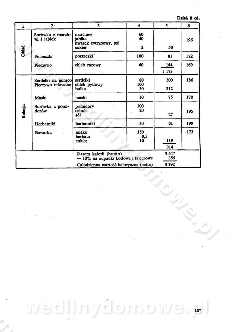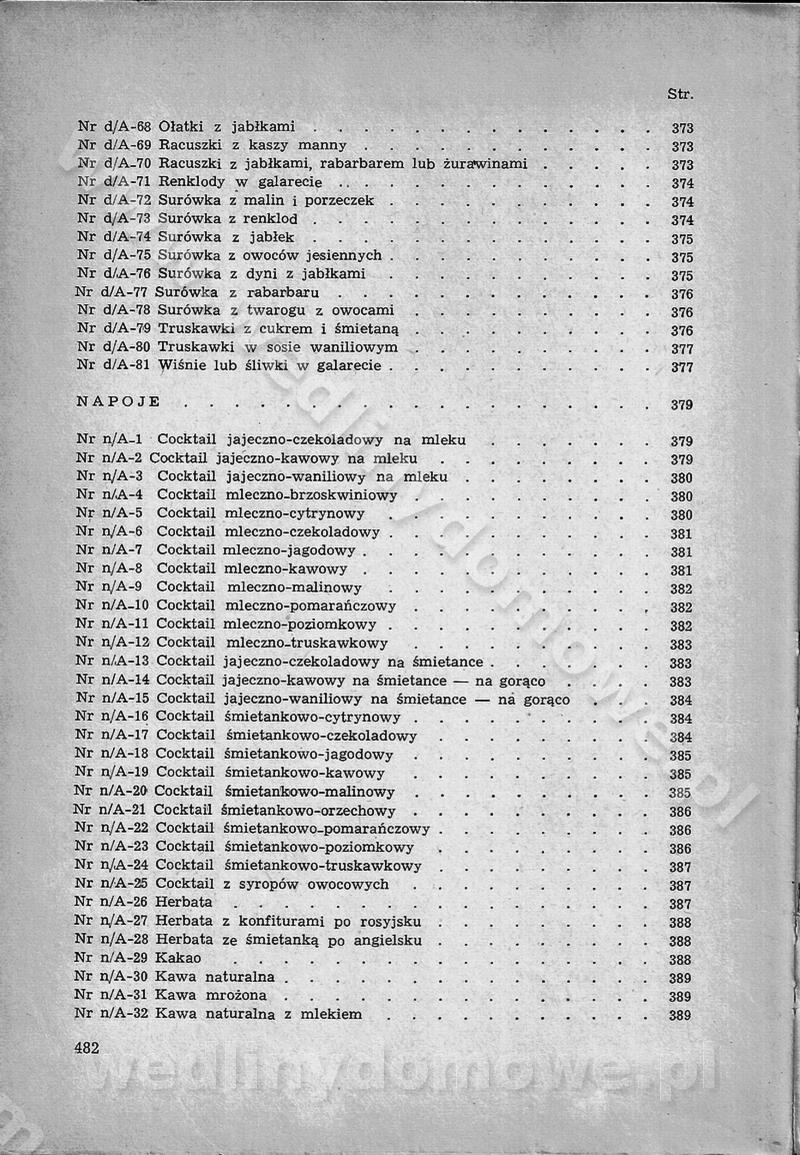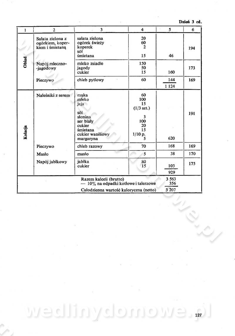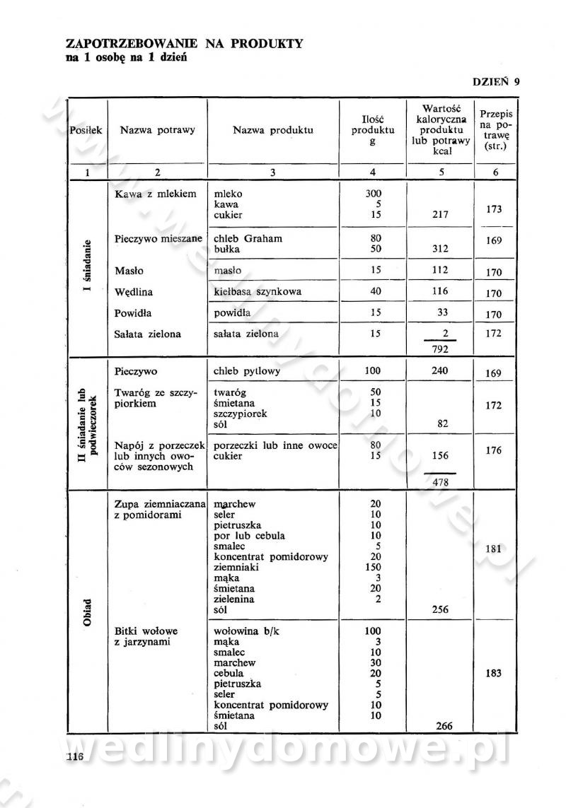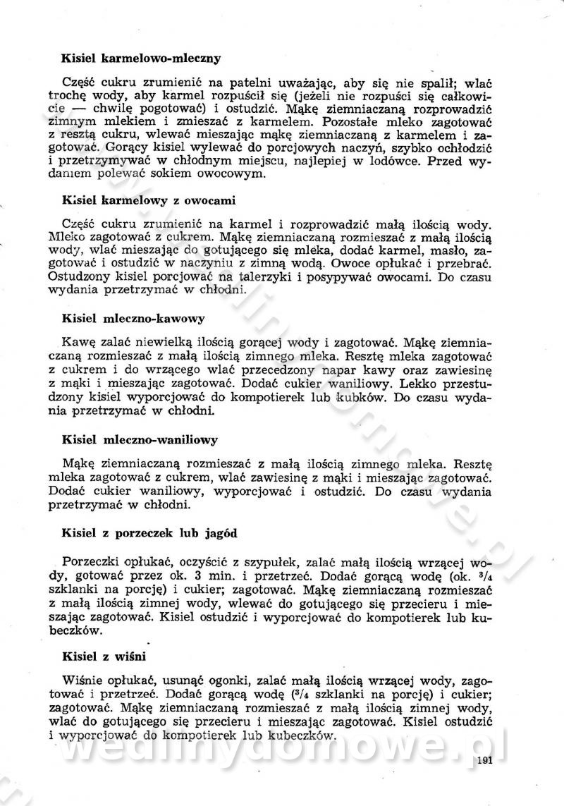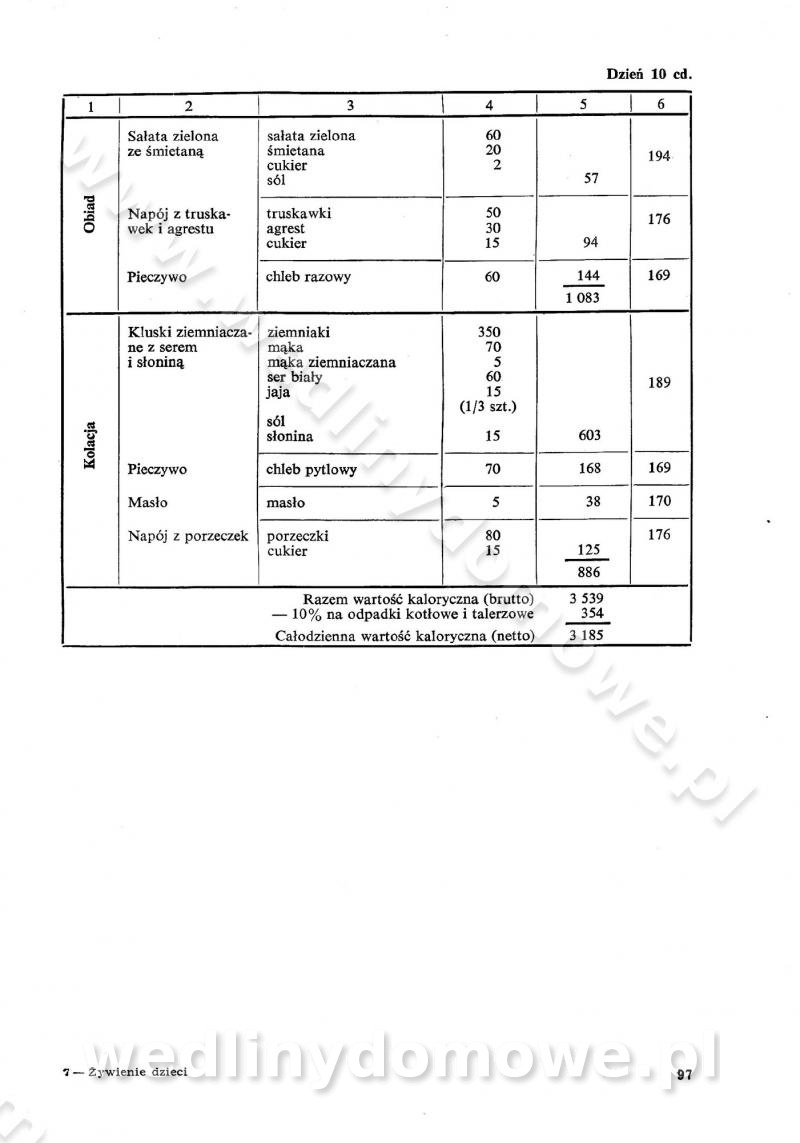 SPIS TREŚCI CZĘŚĆ I TEORETYCZNE PODSTAWY RACJONALNEGO ŻYWIENIA ZBIOROWEGO inż. Krystyna Wolf I. WSKAZÓWKI DO REALIZACJI NORM ŻYWIENIA WYRAŻONYCH W CAŁODZIENNYCH RACJACH POKARMOWYCH II. SKŁADNIKI POKARMOWE I ICH ROLA W ŻYWIENIU Zawartość składników pokarmowych w produktach Rola pożywienia Składniki pokarmowe Wzajemne zależności między składnikami pokarmowymi III. NORMY WYŻYWIENIA Normy zapotrzebowania na składniki pokarmowe Podział produktów Podział produktów na 2 grupy Podział produktów na 9 grup Podział produktów na 12 grup Całodzienne racje pokarmowe Zamiana produktów IV. WYTYCZNE PLANOWANIA ZESTAWU CAŁODZIENNYCH POSIŁKÓW Zasady podziału całodziennych racji pokarmowych na poszczególne posiłki Śniadanie Obiad Kolacja Wytyczne układania jadłospisów Kontrola prawidłowości planowania jadłospisów V. PROCESY TECHNOLOGICZNE, ICH CEL, PRZEBIEG I WPŁYW NA WARTOŚĆ ODŻYWCZĄ POTRAW Cel procesu technologicznego Obróbka wstępna i termiczna Ogólne wskazówki technologiczne Wykończanie potraw VI. WSKAZÓWKI PRAKTYCZNE DOTYCZĄCE KORZYSTANIA Z RECEPTUR CZĘŚĆ II RECEPTURY I. ZUPY inż. Jadwiga Celczyńska Podstawowe zasady sporządzania Sporządzanie wywarów Podział zup Przygotowanie głównych składników zup Wykończanie zup Rodzaje zup Zupy czyste Zupy zabielane Zupy zasmażane Zupy rozklejane Zupy mleczne Zupy owocowe Zupy z wkładką pełnowartościowego białka — samodzielne dania obiadowe lub kolacyjne Zupy czyste (normatyw surowcowy na 10 porcji) Zakwas burakowy na barszcz Zakwas na żur Barszcz burakowy czysty Barszcz czerwony czysty z zagęszczonego soku buraczanego Barszcz burakowy jarski Bulion jarski Rosół z wołowiny Zupa grzybowa czysta Zupa pomidorowa czysta Zupy rozklejane (normatyw surowcowy na 10 porcji) Krupnik na podrobach Krupnik zabielany Krupnik ze słoniną Krupnik z ryżu z jarzynami Zupa grochowa z pęczakiem Zupa grochowa z ziemniakami Zupa rumfordzka Zupa ziemniaczana z fasolą Zalewajka Zalewajka z kwaśnym mlekiem Żur z kiełbasą i boczkiem Żur na podrobach zabielany Zupy zasmażane (normatyw surowcowy na 10 porcji) Kapuśniak z kwaszonej kapusty z papryką Kapuśniak mazurski z kwaszonej kapusty Kapuśniak ze słodkiej kapusty Kapuśniak ze słodkiej kapusty z jabłkami Kapuśniak z czerwonej kapusty Zacierka z ziemniakami Zupa cebulowa Zupa z dyni i pomidorów Zupa fasolowa z makaronem Zupa fasolowa z ziemniakami Zupa z flaków wołowych Zupa „garbure” Zupa grzybowa Zupa jarzynowa z papryką Zupa jarzynowa z fasolą Zupa jarzynowa (jesienna) Zupa jarzynowa z makaronem i serem Zupa z kaszy manny zasmażana Zupa neapolitańska Zupa pomidorowa zasmażana Zupa z porów Zupa z selerów Zupa ziemniaczana zasmażana Zupa ziemniaczana z pomidorami Zupy mleczne (normatyw surowcowy na 10 porcji) Kukurydzanka na mleku Manna na mleku Ryż na mleku Makaron na mleku Płatki owsiane na mleku Zupa z dyni na mleku z tartym ciastem Zupa „nic” Zupa mleczna z lanym ciastem Zupa ze zsiadłego mleka Zupy zabielane (normatyw surowcowy na 10 porcji) Barszcz czerwony zabielany Barszcz czerwony zabielany z suszu Barszcz ukraiński Barszcz czeski Barszcz z botwiną Barszcz jarski z botwiną Chłodnik z botwiną Chłodnik z botwiną na mleku Kapuśniak ze słodkiej kapusty zabielany Kapuśniak na głowiźnie Zupa z brukselki zabielana Zupa cytrynowa Zupa z fasolki szparagowej Zupa grzybowa zabielana Zupa kalafiorowa Zupa koperkowa Zupa ogórkowa Zupa pomidorowa Zupa rybna Zupa szczawiowa Zupa pieczarkowa Zupa ze szpinaku Zupa z młodych jarzyn zabielana Zupa jarzynowa zabielana z mrożonek Zupa ziemniaczana „Paysanne” Pejzanka z puree ziemniaczanym Zupa z młodych ziemniaków Zupa ziemniaczana z porami Zupa z zielonego groszku Zupy owocowe (normatyw surowcowy na 10 porcji) Chłodnik z czarnych jagód Chłodnik truskawkowy Zupa z czarnych jagód Zupa jabłkowa Zupa jabłkowa zabielana Zupa z jabłek i śliwek Zupa ze śliwek Zupa z owoców mieszanych Zupa owocowa z suszu jabłkowego i marmolady Zupa owocowa czysta Zupa z powideł śliwkowych Zupa rabarbarowa Zupa z suszonych śliwek Zupa truskawkowa Zupa z truskawek i rabarbaru Zupy z wkładką mięsną (normatyw surowcowy na 10 porcji) Barszcz małorosyjski na rosole z mięsem Barszcz z ziemniakami i serdelkami Grochówka z mięsem i ziemniakami Kapuśniak z kwaszonej kapusty z kiełbasą Kapuśniak ze słodkiej kapusty z pomidorami i mięsem Krupnik z ryżu na mięsie Krupnik na mięsie Pejzanka na żeberkach Zupa z fasolki szparagowej na mięsie Zupa fasolowa z mięsem i makaronem Zupa jarzynowa z mięsem Gulaszowa polewka Zupa koperkowa na mięsie Zupa ogórkowa z ziemniakami na mięsie Zupa pomidorowa z makaronem i mięsem Zupa z porów z ziemniakami i wątróbką Zupa wiosenna z jajami Zupa ziemniaczana z mięsem Żur z kiełbasą i ziemniakami II. POTRAWY MIĘSNE inż. Krystyna Wolf Podstawowe zasady sporządzania Zachowanie wartości odżywczej dań mięsnych Cechy prawidłowo przyrządzonego mięsa Przechowywanie Rozmrażanie mięsa Rozbiór tuszy zwierząt rzeźnych Obróbka wstępna Obróbka termiczna Potrawy z baraniny (normatyw surowcowy na 10 porcji) Potrawka z baraniny Kotlet barani mielony Kotlet barani mielony z ryżem Baranina w warzywach Ragout baranie Baranina duszona Potrawy z cielęciny (normatyw surowcowy na 10 porcji) Potrawka cielęca Pulpety cielęce Kotlet cielęcy mielony Klopsiki cielęce do sosów Sznycel cielęcy (mielony) Filet cielęcy (do sosów i dodatków) Zrazy cielęce bite (do sosów) Zrazy cielęce nadziewane słoniną Sznycel cielęcy Zrazy cielęce po polsku (faszerowane) Paprykarz cielęcy Pieczeń cielęca duszona Pieczeń cielęca Mostek cielęcy po wiedeńsku Mostek cielęcy faszerowany Rolada cielęca faszerowana Potrawy z wieprzowiny (normatyw surowcowy na 10 porcji) Mięso wieprzowe gotowane Peklówka wieprzowa gotowana Filet wieprzowy saute Kotlet wieprzowy mielony Zraz wieprzowy (klopsik) mielony do sosów Kotlet miel