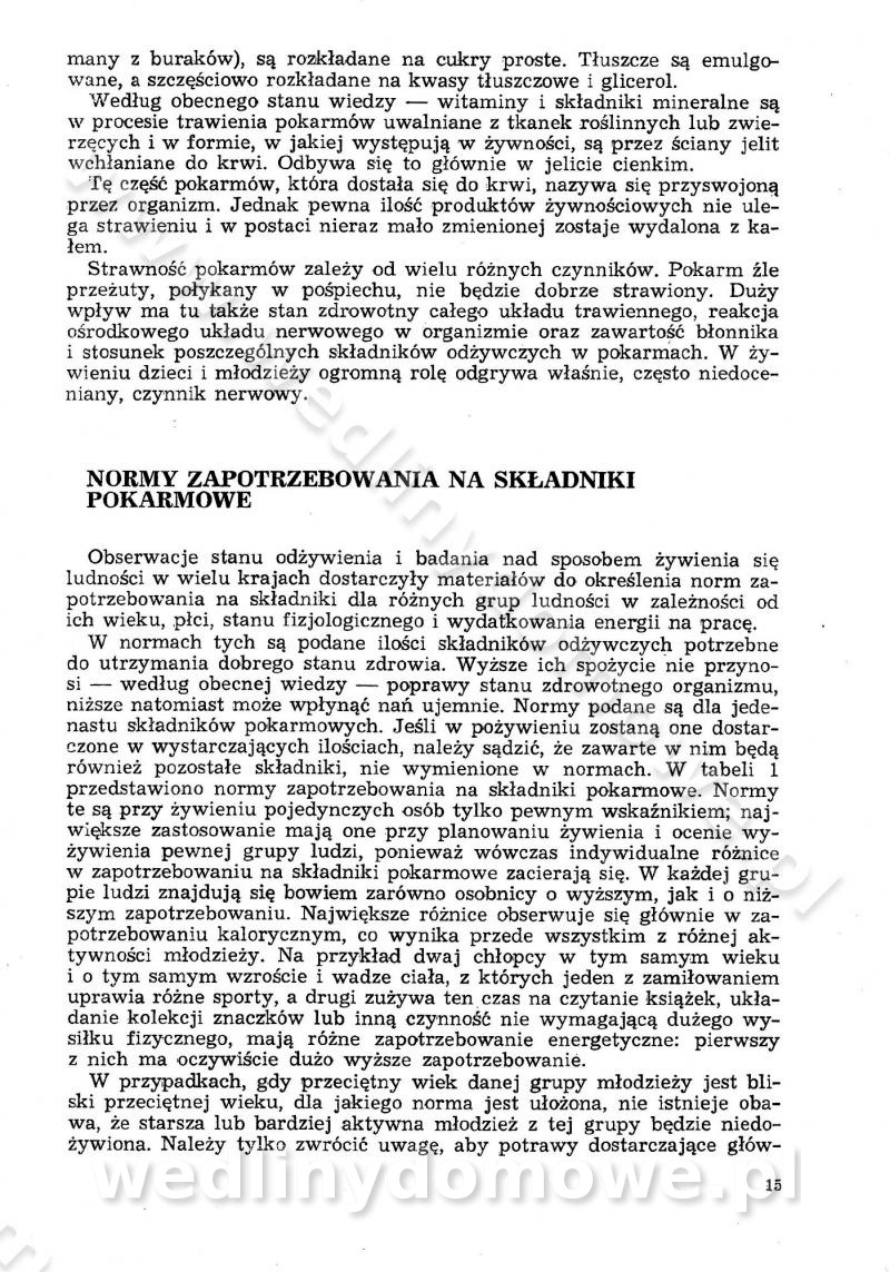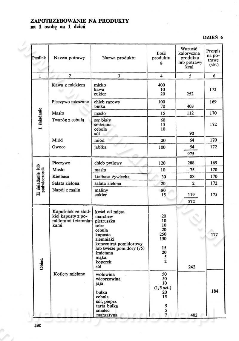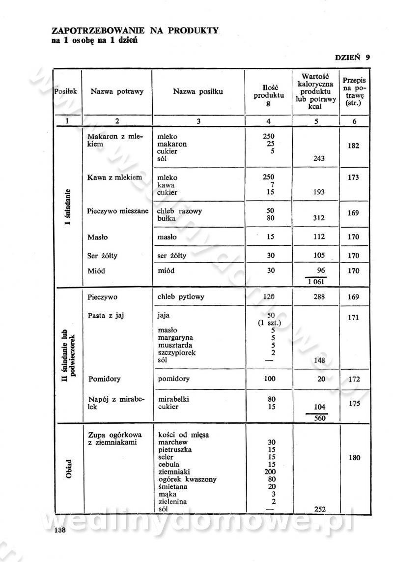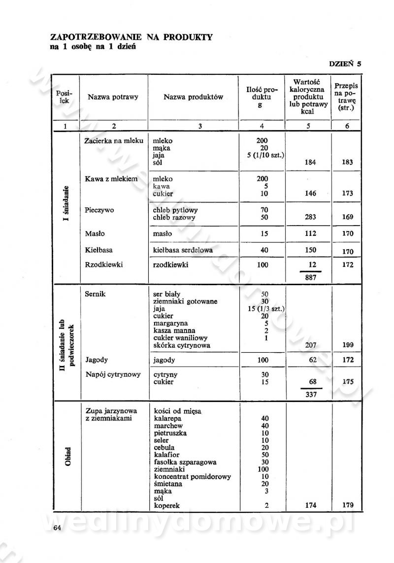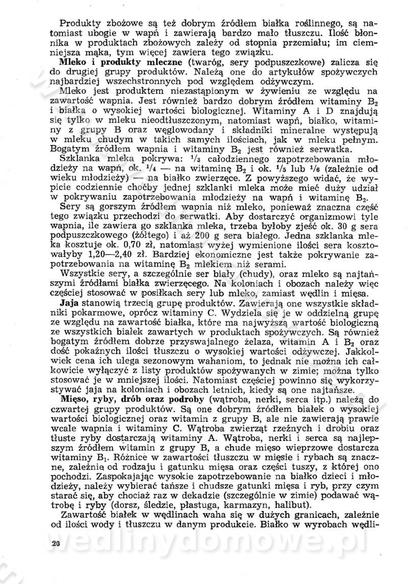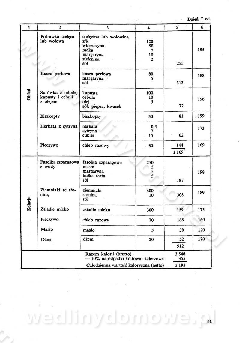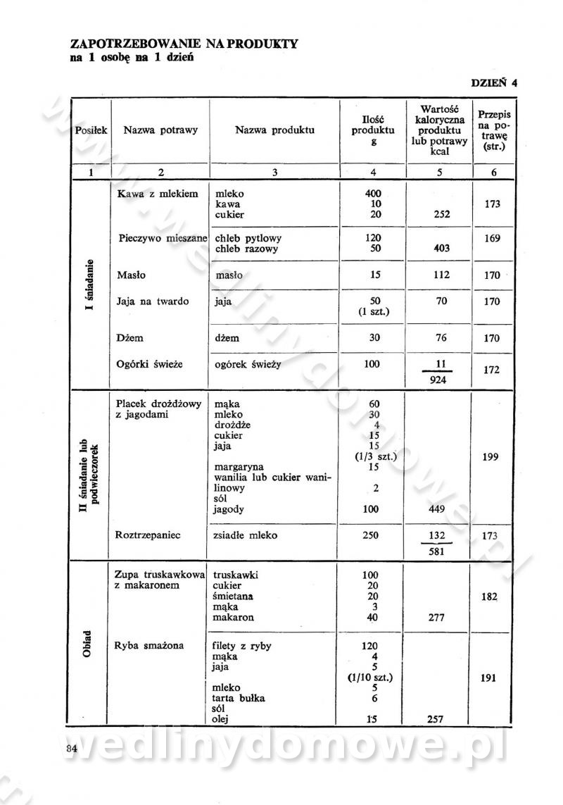 SPIS TREŚCI CZĘŚĆ I TEORETYCZNE PODSTAWY RACJONALNEGO ŻYWIENIA ZBIOROWEGO inż. Krystyna Wolf I. WSKAZÓWKI DO REALIZACJI NORM ŻYWIENIA WYRAŻONYCH W CAŁODZIENNYCH RACJACH POKARMOWYCH II. SKŁADNIKI POKARMOWE I ICH ROLA W ŻYWIENIU Zawartość składników pokarmowych w produktach Rola pożywienia Składniki pokarmowe Wzajemne zależności między składnikami pokarmowymi III. NORMY WYŻYWIENIA Normy zapotrzebowania na składniki pokarmowe Podział produktów Podział produktów na 2 grupy Podział produktów na 9 grup Podział produktów na 12 grup Całodzienne racje pokarmowe Zamiana produktów IV. WYTYCZNE PLANOWANIA ZESTAWU CAŁODZIENNYCH POSIŁKÓW Zasady podziału całodziennych racji pokarmowych na poszczególne posiłki Śniadanie Obiad Kolacja Wytyczne układania jadłospisów Kontrola prawidłowości planowania jadłospisów V. PROCESY TECHNOLOGICZNE, ICH CEL, PRZEBIEG I WPŁYW NA WARTOŚĆ ODŻYWCZĄ POTRAW Cel procesu technologicznego Obróbka wstępna i termiczna Ogólne wskazówki technologiczne Wykończanie potraw VI. WSKAZÓWKI PRAKTYCZNE DOTYCZĄCE KORZYSTANIA Z RECEPTUR CZĘŚĆ II RECEPTURY I. ZUPY inż. Jadwiga Celczyńska Podstawowe zasady sporządzania Sporządzanie wywarów Podział zup Przygotowanie głównych składników zup Wykończanie zup Rodzaje zup Zupy czyste Zupy zabielane Zupy zasmażane Zupy rozklejane Zupy mleczne Zupy owocowe Zupy z wkładką pełnowartościowego białka — samodzielne dania obiadowe lub kolacyjne Zupy czyste (normatyw surowcowy na 10 porcji) Zakwas burakowy na barszcz Zakwas na żur Barszcz burakowy czysty Barszcz czerwony czysty z zagęszczonego soku buraczanego Barszcz burakowy jarski Bulion jarski Rosół z wołowiny Zupa grzybowa czysta Zupa pomidorowa czysta Zupy rozklejane (normatyw surowcowy na 10 porcji) Krupnik na podrobach Krupnik zabielany Krupnik ze słoniną Krupnik z ryżu z jarzynami Zupa grochowa z pęczakiem Zupa grochowa z ziemniakami Zupa rumfordzka Zupa ziemniaczana z fasolą Zalewajka Zalewajka z kwaśnym mlekiem Żur z kiełbasą i boczkiem Żur na podrobach zabielany Zupy zasmażane (normatyw surowcowy na 10 porcji) Kapuśniak z kwaszonej kapusty z papryką Kapuśniak mazurski z kwaszonej kapusty Kapuśniak ze słodkiej kapusty Kapuśniak ze słodkiej kapusty z jabłkami Kapuśniak z czerwonej kapusty Zacierka z ziemniakami Zupa cebulowa Zupa z dyni i pomidorów Zupa fasolowa z makaronem Zupa fasolowa z ziemniakami Zupa z flaków wołowych Zupa „garbure” Zupa grzybowa Zupa jarzynowa z papryką Zupa jarzynowa z fasolą Zupa jarzynowa (jesienna) Zupa jarzynowa z makaronem i serem Zupa z kaszy manny zasmażana Zupa neapolitańska Zupa pomidorowa zasmażana Zupa z porów Zupa z selerów Zupa ziemniaczana zasmażana Zupa ziemniaczana z pomidorami Zupy mleczne (normatyw surowcowy na 10 porcji) Kukurydzanka na mleku Manna na mleku Ryż na mleku Makaron na mleku Płatki owsiane na mleku Zupa z dyni na mleku z tartym ciastem Zupa „nic” Zupa mleczna z lanym ciastem Zupa ze zsiadłego mleka Zupy zabielane (normatyw surowcowy na 10 porcji) Barszcz czerwony zabielany Barszcz czerwony zabielany z suszu Barszcz ukraiński Barszcz czeski Barszcz z botwiną Barszcz jarski z botwiną Chłodnik z botwiną Chłodnik z botwiną na mleku Kapuśniak ze słodkiej kapusty zabielany Kapuśniak na głowiźnie Zupa z brukselki zabielana Zupa cytrynowa Zupa z fasolki szparagowej Zupa grzybowa zabielana Zupa kalafiorowa Zupa koperkowa Zupa ogórkowa Zupa pomidorowa Zupa rybna Zupa szczawiowa Zupa pieczarkowa Zupa ze szpinaku Zupa z młodych jarzyn zabielana Zupa jarzynowa zabielana z mrożonek Zupa ziemniaczana „Paysanne” Pejzanka z puree ziemniaczanym Zupa z młodych ziemniaków Zupa ziemniaczana z porami Zupa z zielonego groszku Zupy owocowe (normatyw surowcowy na 10 porcji) Chłodnik z czarnych jagód Chłodnik truskawkowy Zupa z czarnych jagód Zupa jabłkowa Zupa jabłkowa zabielana Zupa z jabłek i śliwek Zupa ze śliwek Zupa z owoców mieszanych Zupa owocowa z suszu jabłkowego i marmolady Zupa owocowa czysta Zupa z powideł śliwkowych Zupa rabarbarowa Zupa z suszonych śliwek Zupa truskawkowa Zupa z truskawek i rabarbaru Zupy z wkładką mięsną (normatyw surowcowy na 10 porcji) Barszcz małorosyjski na rosole z mięsem Barszcz z ziemniakami i serdelkami Grochówka z mięsem i ziemniakami Kapuśniak z kwaszonej kapusty z kiełbasą Kapuśniak ze słodkiej kapusty z pomidorami i mięsem Krupnik z ryżu na mięsie Krupnik na mięsie Pejzanka na żeberkach Zupa z fasolki szparagowej na mięsie Zupa fasolowa z mięsem i makaronem Zupa jarzynowa z mięsem Gulaszowa polewka Zupa koperkowa na mięsie Zupa ogórkowa z ziemniakami na mięsie Zupa pomidorowa z makaronem i mięsem Zupa z porów z ziemniakami i wątróbką Zupa wiosenna z jajami Zupa ziemniaczana z mięsem Żur z kiełbasą i ziemniakami II. POTRAWY MIĘSNE inż. Krystyna Wolf Podstawowe zasady sporządzania Zachowanie wartości odżywczej dań mięsnych Cechy prawidłowo przyrządzonego mięsa Przechowywanie Rozmrażanie mięsa Rozbiór tuszy zwierząt rzeźnych Obróbka wstępna Obróbka termiczna Potrawy z baraniny (normatyw surowcowy na 10 porcji) Potrawka z baraniny Kotlet barani mielony Kotlet barani mielony z ryżem Baranina w warzywach Ragout baranie Baranina duszona Potrawy z cielęciny (normatyw surowcowy na 10 porcji) Potrawka cielęca Pulpety cielęce Kotlet cielęcy mielony Klopsiki cielęce do sosów Sznycel cielęcy (mielony) Filet cielęcy (do sosów i dodatków) Zrazy cielęce bite (do sosów) Zrazy cielęce nadziewane słoniną Sznycel cielęcy Zrazy cielęce po polsku (faszerowane) Paprykarz cielęcy Pieczeń cielęca duszona Pieczeń cielęca Mostek cielęcy po wiedeńsku Mostek cielęcy faszerowany Rolada cielęca faszerowana Potrawy z wieprzowiny (normatyw surowcowy na 10 porcji) Mięso wieprzowe gotowane Peklówka wieprzowa gotowana Filet wieprzowy saute Kotlet wieprzowy mielony Zraz wieprzowy (klopsik) mielony do sosów Kotlet miel