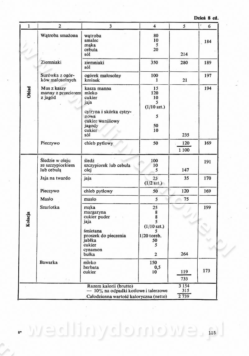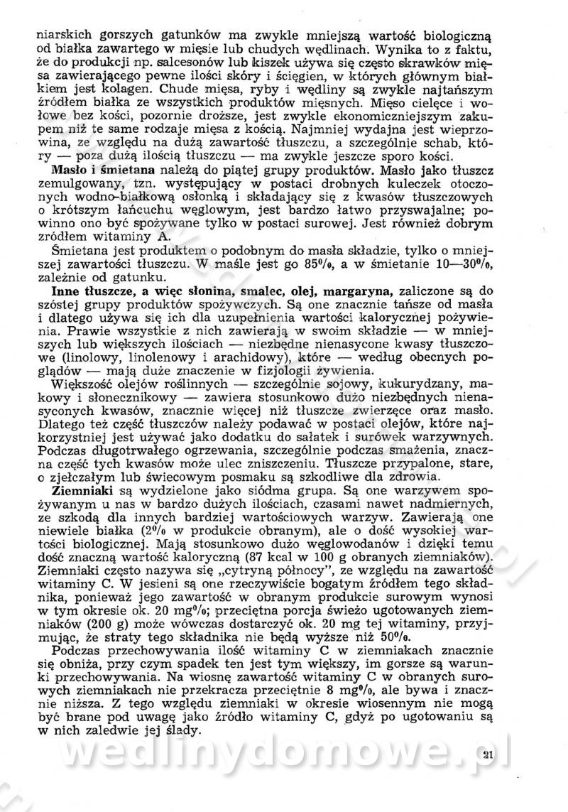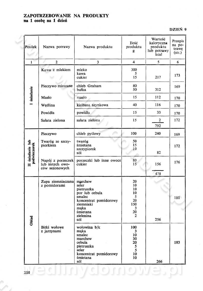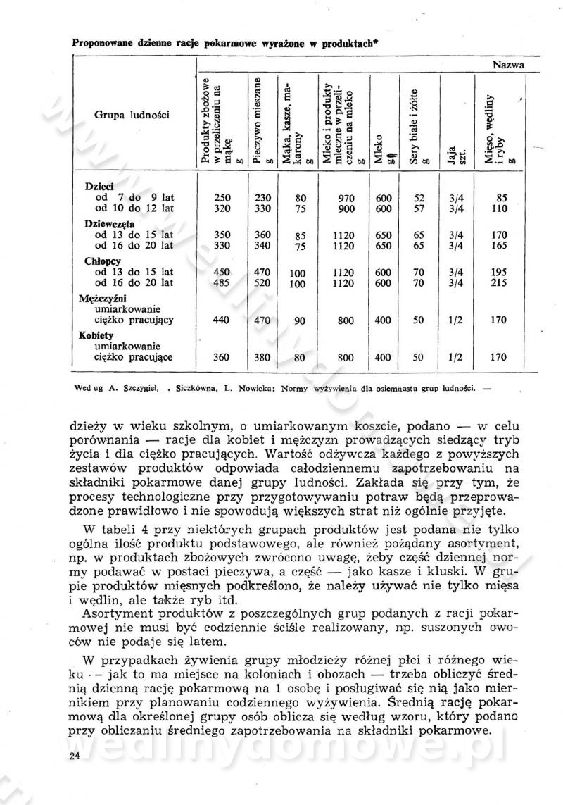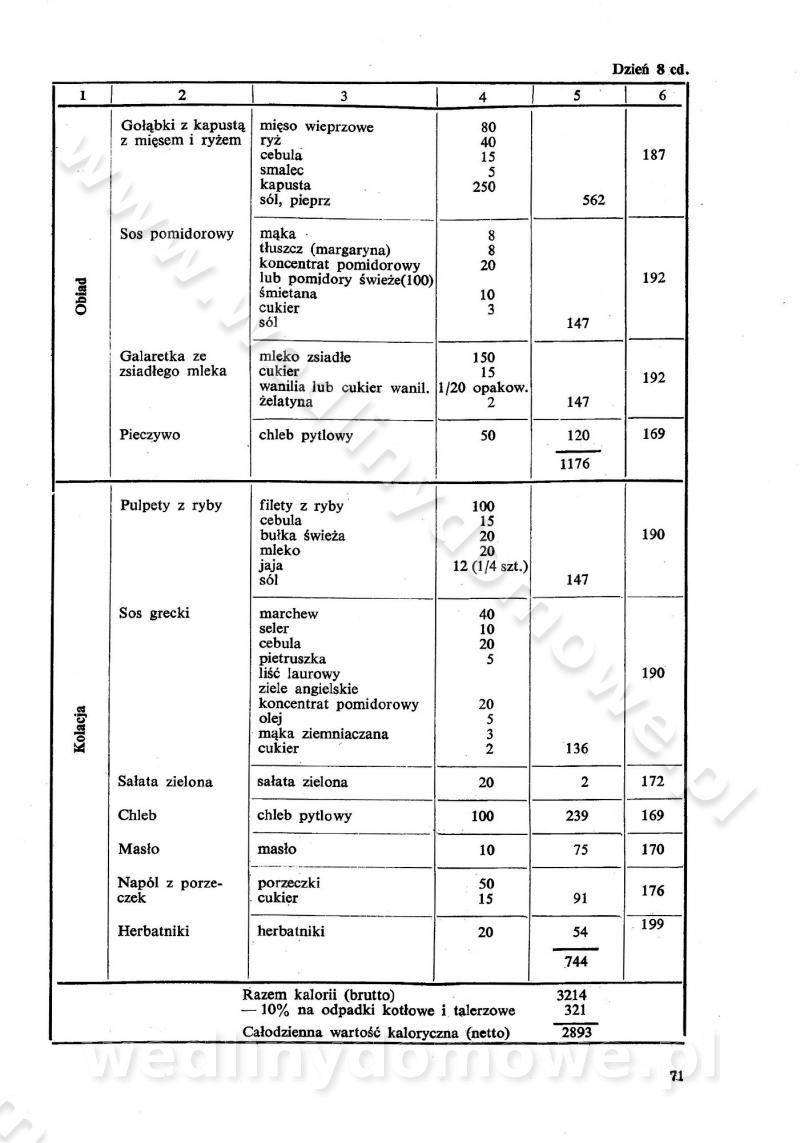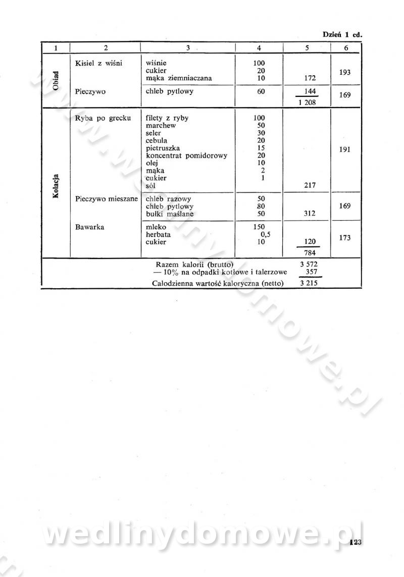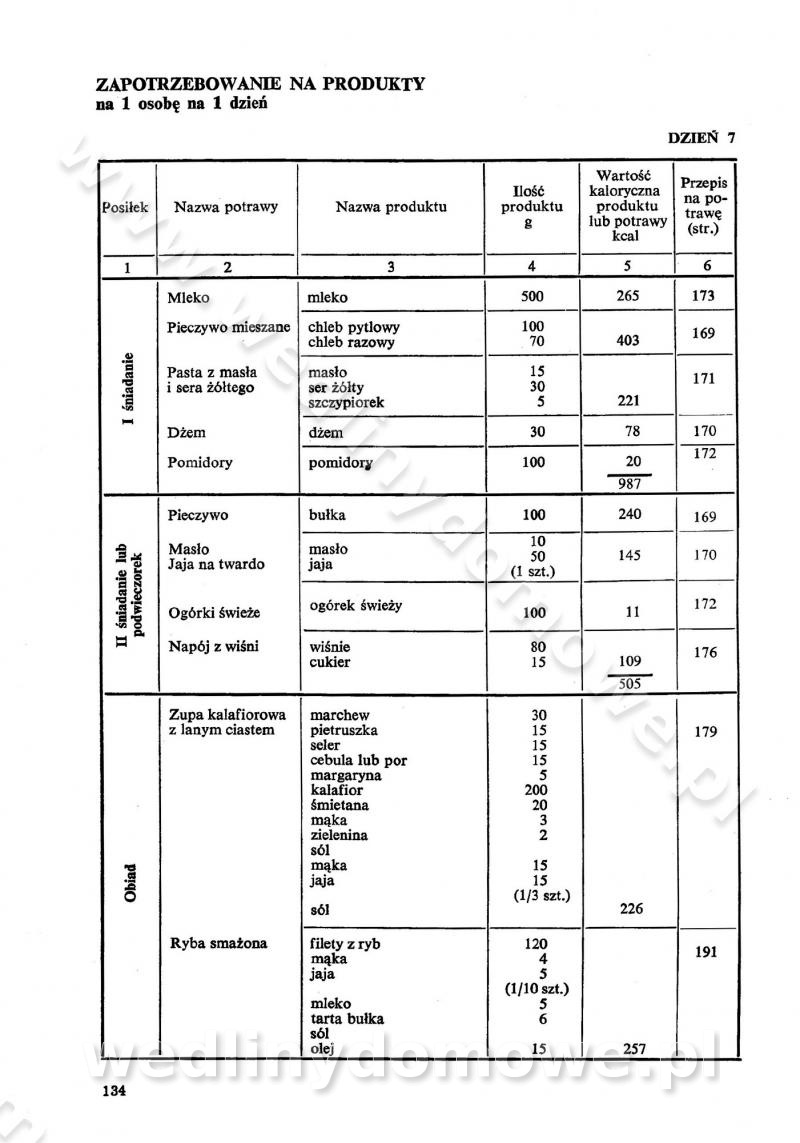 SPIS TREŚCI CZĘŚĆ I TEORETYCZNE PODSTAWY RACJONALNEGO ŻYWIENIA ZBIOROWEGO inż. Krystyna Wolf I. WSKAZÓWKI DO REALIZACJI NORM ŻYWIENIA WYRAŻONYCH W CAŁODZIENNYCH RACJACH POKARMOWYCH II. SKŁADNIKI POKARMOWE I ICH ROLA W ŻYWIENIU Zawartość składników pokarmowych w produktach Rola pożywienia Składniki pokarmowe Wzajemne zależności między składnikami pokarmowymi III. NORMY WYŻYWIENIA Normy zapotrzebowania na składniki pokarmowe Podział produktów Podział produktów na 2 grupy Podział produktów na 9 grup Podział produktów na 12 grup Całodzienne racje pokarmowe Zamiana produktów IV. WYTYCZNE PLANOWANIA ZESTAWU CAŁODZIENNYCH POSIŁKÓW Zasady podziału całodziennych racji pokarmowych na poszczególne posiłki Śniadanie Obiad Kolacja Wytyczne układania jadłospisów Kontrola prawidłowości planowania jadłospisów V. PROCESY TECHNOLOGICZNE, ICH CEL, PRZEBIEG I WPŁYW NA WARTOŚĆ ODŻYWCZĄ POTRAW Cel procesu technologicznego Obróbka wstępna i termiczna Ogólne wskazówki technologiczne Wykończanie potraw VI. WSKAZÓWKI PRAKTYCZNE DOTYCZĄCE KORZYSTANIA Z RECEPTUR CZĘŚĆ II RECEPTURY I. ZUPY inż. Jadwiga Celczyńska Podstawowe zasady sporządzania Sporządzanie wywarów Podział zup Przygotowanie głównych składników zup Wykończanie zup Rodzaje zup Zupy czyste Zupy zabielane Zupy zasmażane Zupy rozklejane Zupy mleczne Zupy owocowe Zupy z wkładką pełnowartościowego białka — samodzielne dania obiadowe lub kolacyjne Zupy czyste (normatyw surowcowy na 10 porcji) Zakwas burakowy na barszcz Zakwas na żur Barszcz burakowy czysty Barszcz czerwony czysty z zagęszczonego soku buraczanego Barszcz burakowy jarski Bulion jarski Rosół z wołowiny Zupa grzybowa czysta Zupa pomidorowa czysta Zupy rozklejane (normatyw surowcowy na 10 porcji) Krupnik na podrobach Krupnik zabielany Krupnik ze słoniną Krupnik z ryżu z jarzynami Zupa grochowa z pęczakiem Zupa grochowa z ziemniakami Zupa rumfordzka Zupa ziemniaczana z fasolą Zalewajka Zalewajka z kwaśnym mlekiem Żur z kiełbasą i boczkiem Żur na podrobach zabielany Zupy zasmażane (normatyw surowcowy na 10 porcji) Kapuśniak z kwaszonej kapusty z papryką Kapuśniak mazurski z kwaszonej kapusty Kapuśniak ze słodkiej kapusty Kapuśniak ze słodkiej kapusty z jabłkami Kapuśniak z czerwonej kapusty Zacierka z ziemniakami Zupa cebulowa Zupa z dyni i pomidorów Zupa fasolowa z makaronem Zupa fasolowa z ziemniakami Zupa z flaków wołowych Zupa „garbure” Zupa grzybowa Zupa jarzynowa z papryką Zupa jarzynowa z fasolą Zupa jarzynowa (jesienna) Zupa jarzynowa z makaronem i serem Zupa z kaszy manny zasmażana Zupa neapolitańska Zupa pomidorowa zasmażana Zupa z porów Zupa z selerów Zupa ziemniaczana zasmażana Zupa ziemniaczana z pomidorami Zupy mleczne (normatyw surowcowy na 10 porcji) Kukurydzanka na mleku Manna na mleku Ryż na mleku Makaron na mleku Płatki owsiane na mleku Zupa z dyni na mleku z tartym ciastem Zupa „nic” Zupa mleczna z lanym ciastem Zupa ze zsiadłego mleka Zupy zabielane (normatyw surowcowy na 10 porcji) Barszcz czerwony zabielany Barszcz czerwony zabielany z suszu Barszcz ukraiński Barszcz czeski Barszcz z botwiną Barszcz jarski z botwiną Chłodnik z botwiną Chłodnik z botwiną na mleku Kapuśniak ze słodkiej kapusty zabielany Kapuśniak na głowiźnie Zupa z brukselki zabielana Zupa cytrynowa Zupa z fasolki szparagowej Zupa grzybowa zabielana Zupa kalafiorowa Zupa koperkowa Zupa ogórkowa Zupa pomidorowa Zupa rybna Zupa szczawiowa Zupa pieczarkowa Zupa ze szpinaku Zupa z młodych jarzyn zabielana Zupa jarzynowa zabielana z mrożonek Zupa ziemniaczana „Paysanne” Pejzanka z puree ziemniaczanym Zupa z młodych ziemniaków Zupa ziemniaczana z porami Zupa z zielonego groszku Zupy owocowe (normatyw surowcowy na 10 porcji) Chłodnik z czarnych jagód Chłodnik truskawkowy Zupa z czarnych jagód Zupa jabłkowa Zupa jabłkowa zabielana Zupa z jabłek i śliwek Zupa ze śliwek Zupa z owoców mieszanych Zupa owocowa z suszu jabłkowego i marmolady Zupa owocowa czysta Zupa z powideł śliwkowych Zupa rabarbarowa Zupa z suszonych śliwek Zupa truskawkowa Zupa z truskawek i rabarbaru Zupy z wkładką mięsną (normatyw surowcowy na 10 porcji) Barszcz małorosyjski na rosole z mięsem Barszcz z ziemniakami i serdelkami Grochówka z mięsem i ziemniakami Kapuśniak z kwaszonej kapusty z kiełbasą Kapuśniak ze słodkiej kapusty z pomidorami i mięsem Krupnik z ryżu na mięsie Krupnik na mięsie Pejzanka na żeberkach Zupa z fasolki szparagowej na mięsie Zupa fasolowa z mięsem i makaronem Zupa jarzynowa z mięsem Gulaszowa polewka Zupa koperkowa na mięsie Zupa ogórkowa z ziemniakami na mięsie Zupa pomidorowa z makaronem i mięsem Zupa z porów z ziemniakami i wątróbką Zupa wiosenna z jajami Zupa ziemniaczana z mięsem Żur z kiełbasą i ziemniakami II. POTRAWY MIĘSNE inż. Krystyna Wolf Podstawowe zasady sporządzania Zachowanie wartości odżywczej dań mięsnych Cechy prawidłowo przyrządzonego mięsa Przechowywanie Rozmrażanie mięsa Rozbiór tuszy zwierząt rzeźnych Obróbka wstępna Obróbka termiczna Potrawy z baraniny (normatyw surowcowy na 10 porcji) Potrawka z baraniny Kotlet barani mielony Kotlet barani mielony z ryżem Baranina w warzywach Ragout baranie Baranina duszona Potrawy z cielęciny (normatyw surowcowy na 10 porcji) Potrawka cielęca Pulpety cielęce Kotlet cielęcy mielony Klopsiki cielęce do sosów Sznycel cielęcy (mielony) Filet cielęcy (do sosów i dodatków) Zrazy cielęce bite (do sosów) Zrazy cielęce nadziewane słoniną Sznycel cielęcy Zrazy cielęce po polsku (faszerowane) Paprykarz cielęcy Pieczeń cielęca duszona Pieczeń cielęca Mostek cielęcy po wiedeńsku Mostek cielęcy faszerowany Rolada cielęca faszerowana Potrawy z wieprzowiny (normatyw surowcowy na 10 porcji) Mięso wieprzowe gotowane Peklówka wieprzowa gotowana Filet wieprzowy saute Kotlet wieprzowy mielony Zraz wieprzowy (klopsik) mielony do sosów Kotlet miel