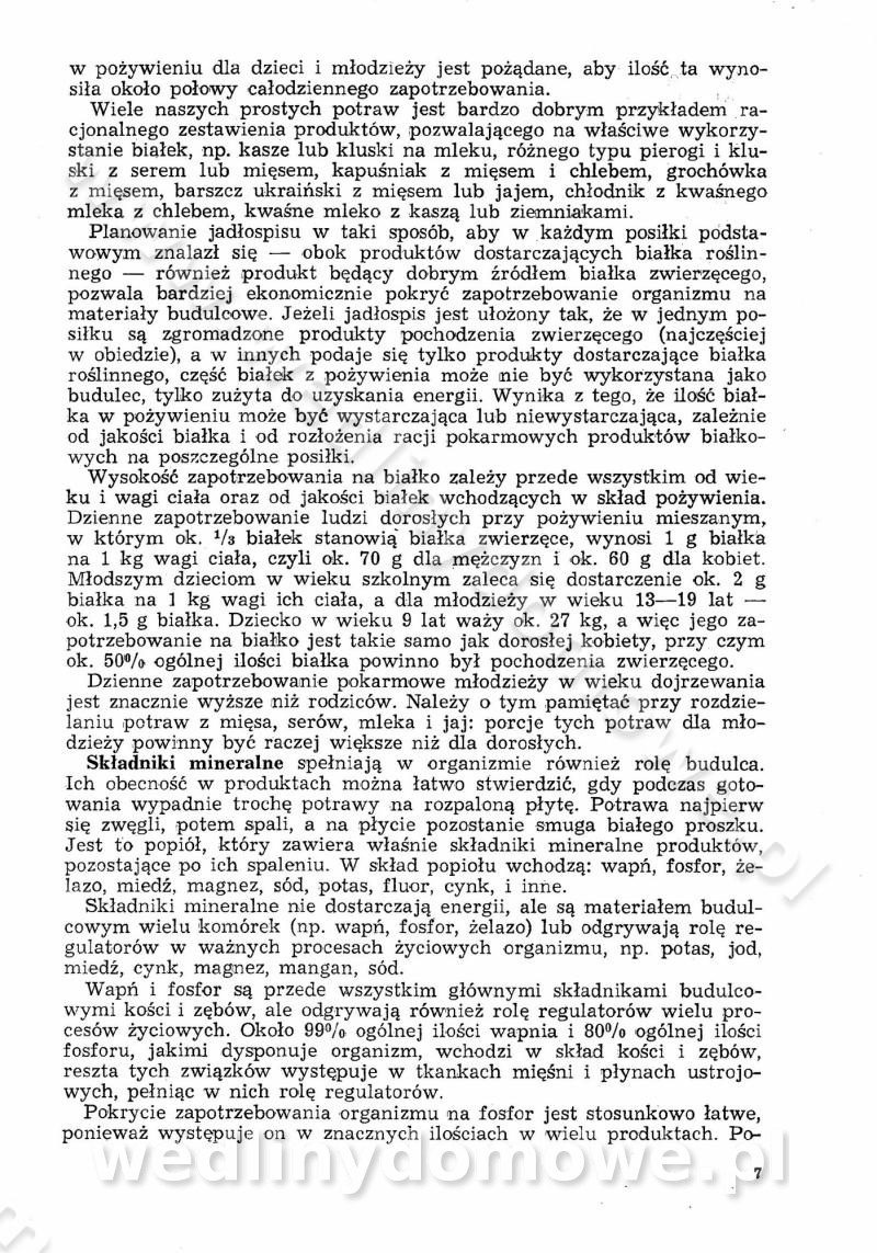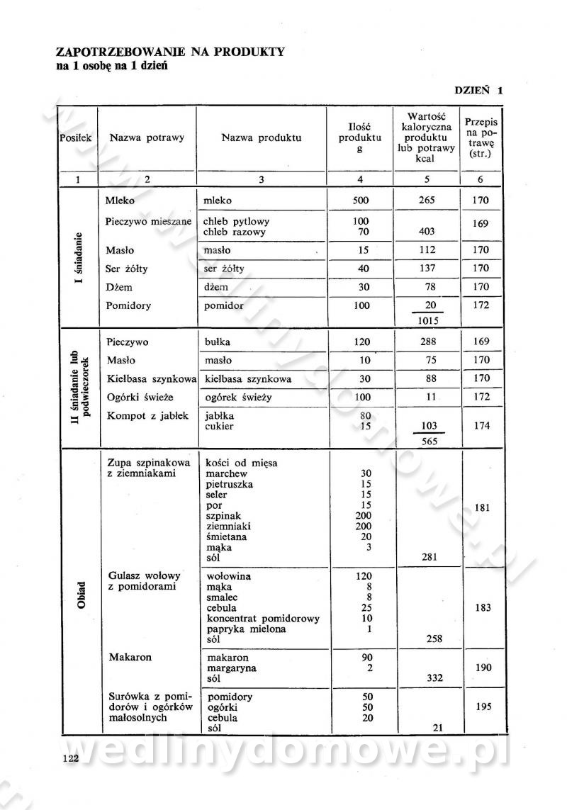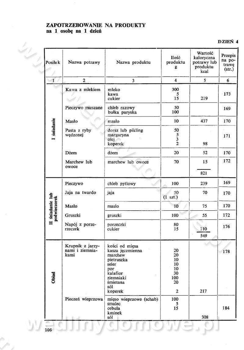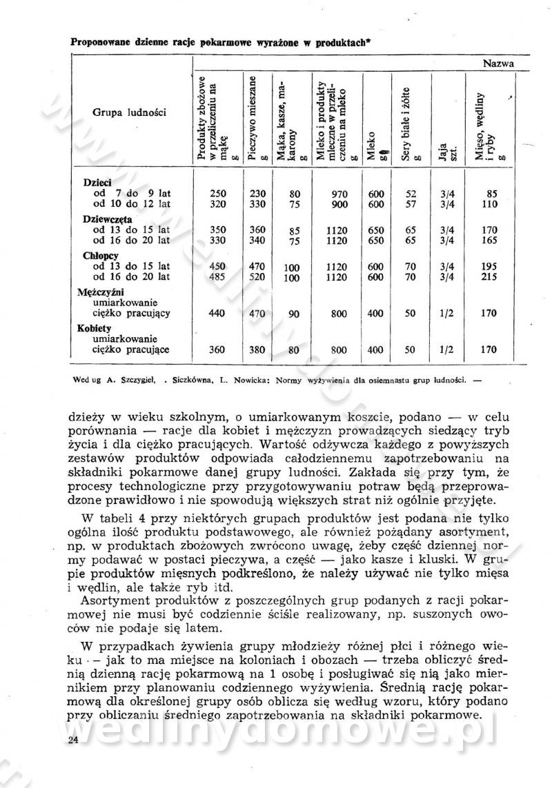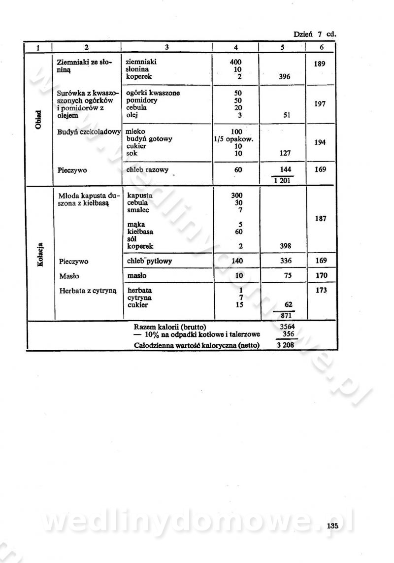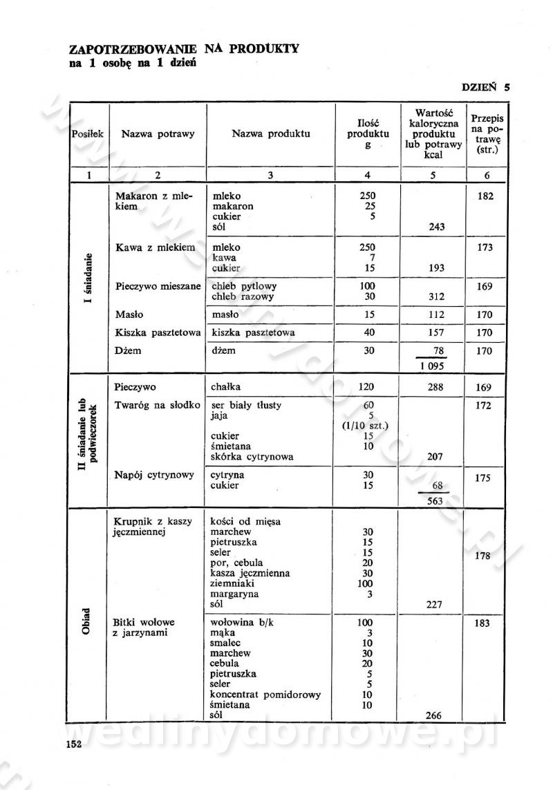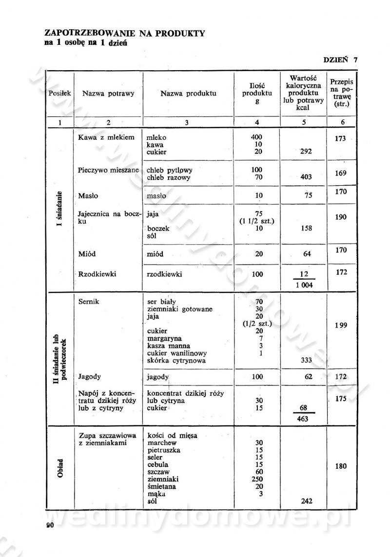 SPIS TREŚCI CZĘŚĆ I TEORETYCZNE PODSTAWY RACJONALNEGO ŻYWIENIA ZBIOROWEGO inż. Krystyna Wolf I. WSKAZÓWKI DO REALIZACJI NORM ŻYWIENIA WYRAŻONYCH W CAŁODZIENNYCH RACJACH POKARMOWYCH II. SKŁADNIKI POKARMOWE I ICH ROLA W ŻYWIENIU Zawartość składników pokarmowych w produktach Rola pożywienia Składniki pokarmowe Wzajemne zależności między składnikami pokarmowymi III. NORMY WYŻYWIENIA Normy zapotrzebowania na składniki pokarmowe Podział produktów Podział produktów na 2 grupy Podział produktów na 9 grup Podział produktów na 12 grup Całodzienne racje pokarmowe Zamiana produktów IV. WYTYCZNE PLANOWANIA ZESTAWU CAŁODZIENNYCH POSIŁKÓW Zasady podziału całodziennych racji pokarmowych na poszczególne posiłki Śniadanie Obiad Kolacja Wytyczne układania jadłospisów Kontrola prawidłowości planowania jadłospisów V. PROCESY TECHNOLOGICZNE, ICH CEL, PRZEBIEG I WPŁYW NA WARTOŚĆ ODŻYWCZĄ POTRAW Cel procesu technologicznego Obróbka wstępna i termiczna Ogólne wskazówki technologiczne Wykończanie potraw VI. WSKAZÓWKI PRAKTYCZNE DOTYCZĄCE KORZYSTANIA Z RECEPTUR CZĘŚĆ II RECEPTURY I. ZUPY inż. Jadwiga Celczyńska Podstawowe zasady sporządzania Sporządzanie wywarów Podział zup Przygotowanie głównych składników zup Wykończanie zup Rodzaje zup Zupy czyste Zupy zabielane Zupy zasmażane Zupy rozklejane Zupy mleczne Zupy owocowe Zupy z wkładką pełnowartościowego białka — samodzielne dania obiadowe lub kolacyjne Zupy czyste (normatyw surowcowy na 10 porcji) Zakwas burakowy na barszcz Zakwas na żur Barszcz burakowy czysty Barszcz czerwony czysty z zagęszczonego soku buraczanego Barszcz burakowy jarski Bulion jarski Rosół z wołowiny Zupa grzybowa czysta Zupa pomidorowa czysta Zupy rozklejane (normatyw surowcowy na 10 porcji) Krupnik na podrobach Krupnik zabielany Krupnik ze słoniną Krupnik z ryżu z jarzynami Zupa grochowa z pęczakiem Zupa grochowa z ziemniakami Zupa rumfordzka Zupa ziemniaczana z fasolą Zalewajka Zalewajka z kwaśnym mlekiem Żur z kiełbasą i boczkiem Żur na podrobach zabielany Zupy zasmażane (normatyw surowcowy na 10 porcji) Kapuśniak z kwaszonej kapusty z papryką Kapuśniak mazurski z kwaszonej kapusty Kapuśniak ze słodkiej kapusty Kapuśniak ze słodkiej kapusty z jabłkami Kapuśniak z czerwonej kapusty Zacierka z ziemniakami Zupa cebulowa Zupa z dyni i pomidorów Zupa fasolowa z makaronem Zupa fasolowa z ziemniakami Zupa z flaków wołowych Zupa „garbure” Zupa grzybowa Zupa jarzynowa z papryką Zupa jarzynowa z fasolą Zupa jarzynowa (jesienna) Zupa jarzynowa z makaronem i serem Zupa z kaszy manny zasmażana Zupa neapolitańska Zupa pomidorowa zasmażana Zupa z porów Zupa z selerów Zupa ziemniaczana zasmażana Zupa ziemniaczana z pomidorami Zupy mleczne (normatyw surowcowy na 10 porcji) Kukurydzanka na mleku Manna na mleku Ryż na mleku Makaron na mleku Płatki owsiane na mleku Zupa z dyni na mleku z tartym ciastem Zupa „nic” Zupa mleczna z lanym ciastem Zupa ze zsiadłego mleka Zupy zabielane (normatyw surowcowy na 10 porcji) Barszcz czerwony zabielany Barszcz czerwony zabielany z suszu Barszcz ukraiński Barszcz czeski Barszcz z botwiną Barszcz jarski z botwiną Chłodnik z botwiną Chłodnik z botwiną na mleku Kapuśniak ze słodkiej kapusty zabielany Kapuśniak na głowiźnie Zupa z brukselki zabielana Zupa cytrynowa Zupa z fasolki szparagowej Zupa grzybowa zabielana Zupa kalafiorowa Zupa koperkowa Zupa ogórkowa Zupa pomidorowa Zupa rybna Zupa szczawiowa Zupa pieczarkowa Zupa ze szpinaku Zupa z młodych jarzyn zabielana Zupa jarzynowa zabielana z mrożonek Zupa ziemniaczana „Paysanne” Pejzanka z puree ziemniaczanym Zupa z młodych ziemniaków Zupa ziemniaczana z porami Zupa z zielonego groszku Zupy owocowe (normatyw surowcowy na 10 porcji) Chłodnik z czarnych jagód Chłodnik truskawkowy Zupa z czarnych jagód Zupa jabłkowa Zupa jabłkowa zabielana Zupa z jabłek i śliwek Zupa ze śliwek Zupa z owoców mieszanych Zupa owocowa z suszu jabłkowego i marmolady Zupa owocowa czysta Zupa z powideł śliwkowych Zupa rabarbarowa Zupa z suszonych śliwek Zupa truskawkowa Zupa z truskawek i rabarbaru Zupy z wkładką mięsną (normatyw surowcowy na 10 porcji) Barszcz małorosyjski na rosole z mięsem Barszcz z ziemniakami i serdelkami Grochówka z mięsem i ziemniakami Kapuśniak z kwaszonej kapusty z kiełbasą Kapuśniak ze słodkiej kapusty z pomidorami i mięsem Krupnik z ryżu na mięsie Krupnik na mięsie Pejzanka na żeberkach Zupa z fasolki szparagowej na mięsie Zupa fasolowa z mięsem i makaronem Zupa jarzynowa z mięsem Gulaszowa polewka Zupa koperkowa na mięsie Zupa ogórkowa z ziemniakami na mięsie Zupa pomidorowa z makaronem i mięsem Zupa z porów z ziemniakami i wątróbką Zupa wiosenna z jajami Zupa ziemniaczana z mięsem Żur z kiełbasą i ziemniakami II. POTRAWY MIĘSNE inż. Krystyna Wolf Podstawowe zasady sporządzania Zachowanie wartości odżywczej dań mięsnych Cechy prawidłowo przyrządzonego mięsa Przechowywanie Rozmrażanie mięsa Rozbiór tuszy zwierząt rzeźnych Obróbka wstępna Obróbka termiczna Potrawy z baraniny (normatyw surowcowy na 10 porcji) Potrawka z baraniny Kotlet barani mielony Kotlet barani mielony z ryżem Baranina w warzywach Ragout baranie Baranina duszona Potrawy z cielęciny (normatyw surowcowy na 10 porcji) Potrawka cielęca Pulpety cielęce Kotlet cielęcy mielony Klopsiki cielęce do sosów Sznycel cielęcy (mielony) Filet cielęcy (do sosów i dodatków) Zrazy cielęce bite (do sosów) Zrazy cielęce nadziewane słoniną Sznycel cielęcy Zrazy cielęce po polsku (faszerowane) Paprykarz cielęcy Pieczeń cielęca duszona Pieczeń cielęca Mostek cielęcy po wiedeńsku Mostek cielęcy faszerowany Rolada cielęca faszerowana Potrawy z wieprzowiny (normatyw surowcowy na 10 porcji) Mięso wieprzowe gotowane Peklówka wieprzowa gotowana Filet wieprzowy saute Kotlet wieprzowy mielony Zraz wieprzowy (klopsik) mielony do sosów Kotlet miel