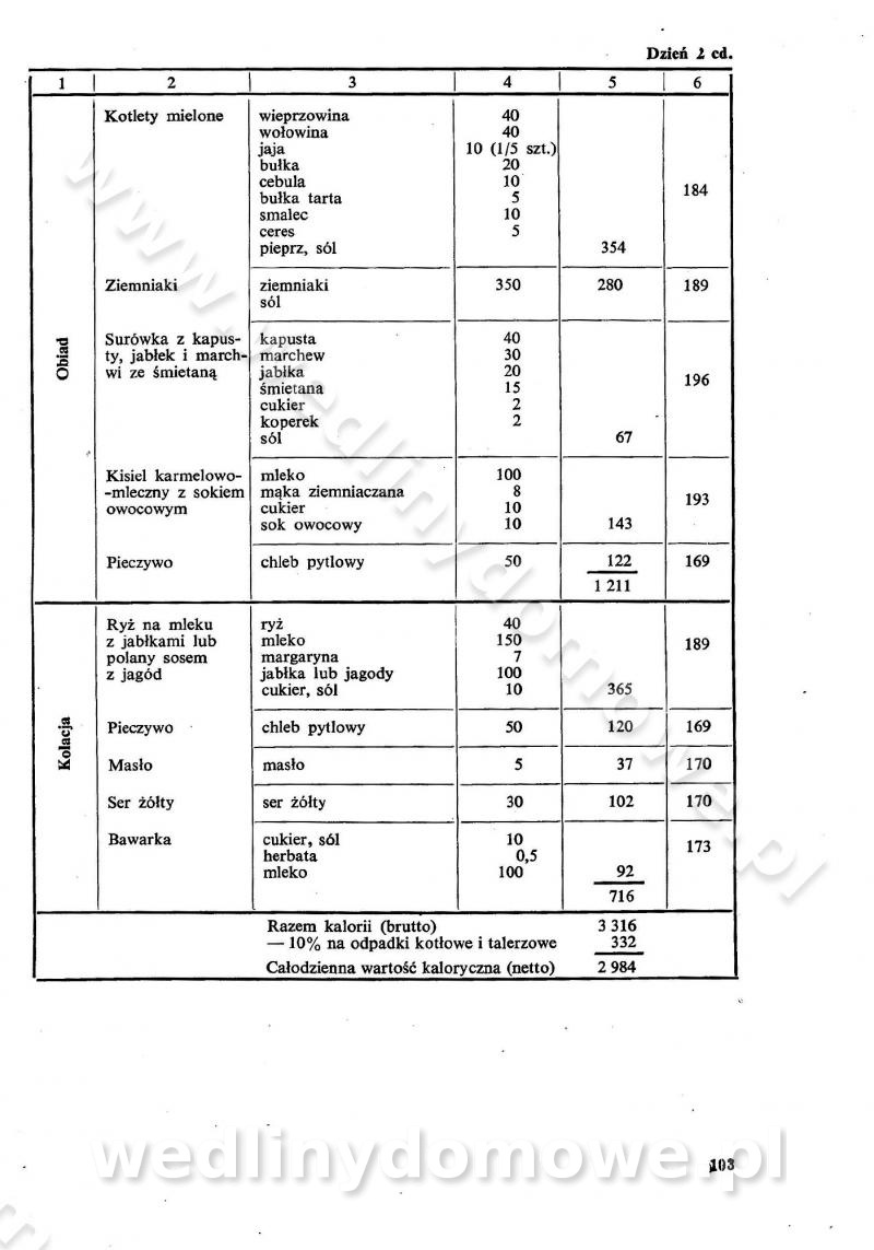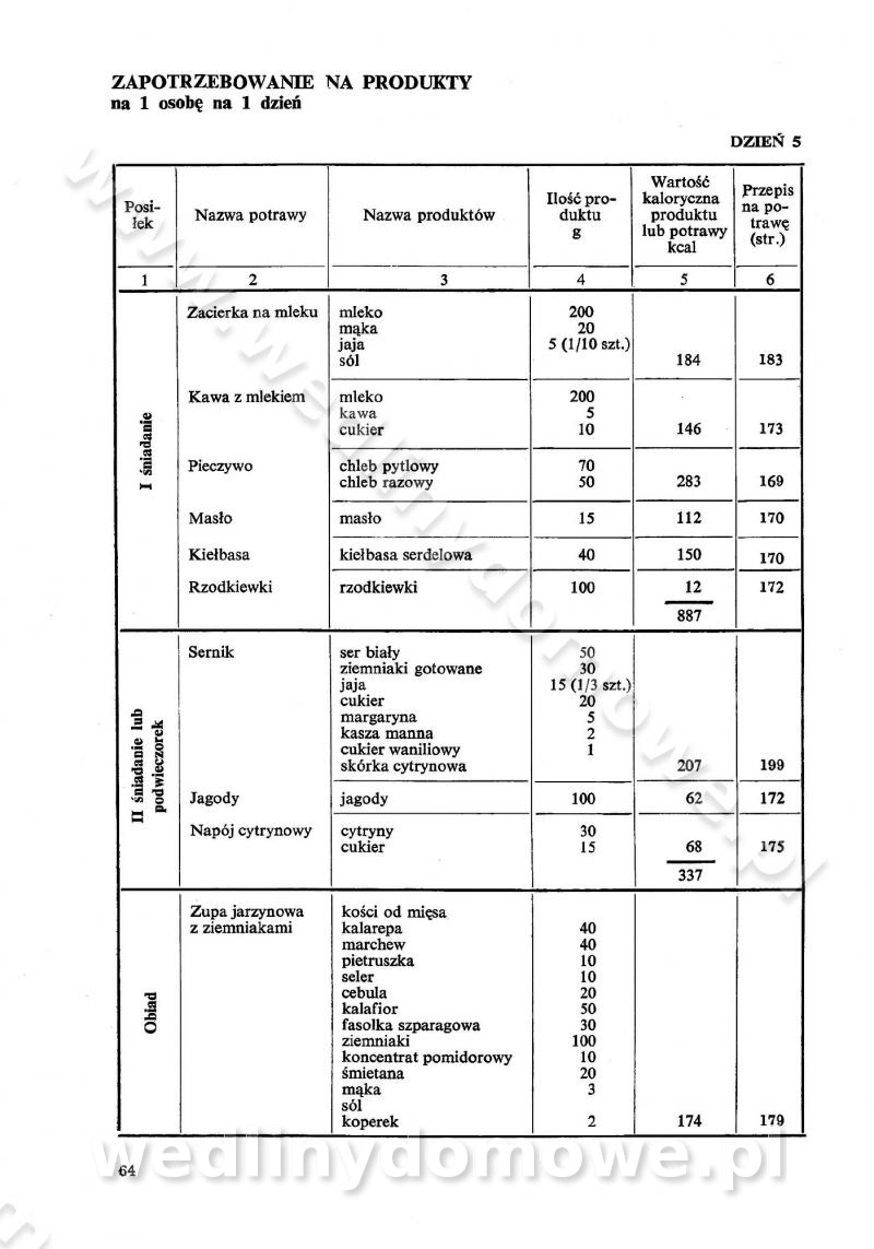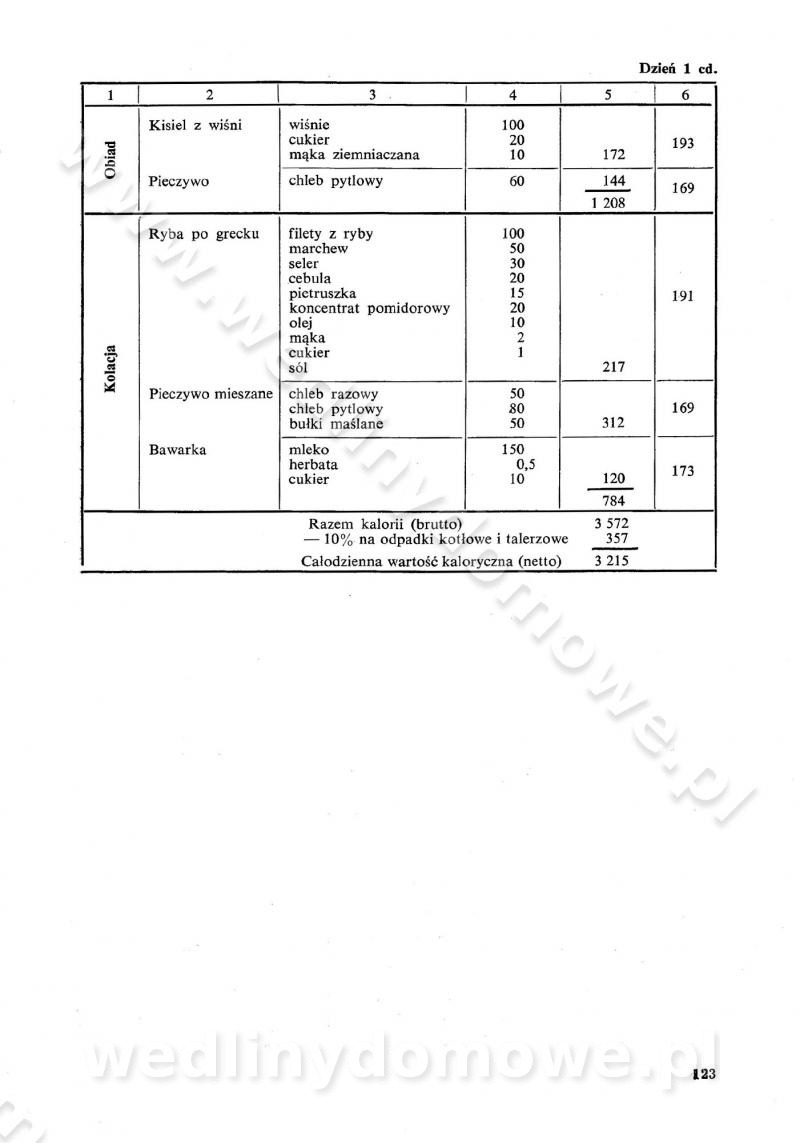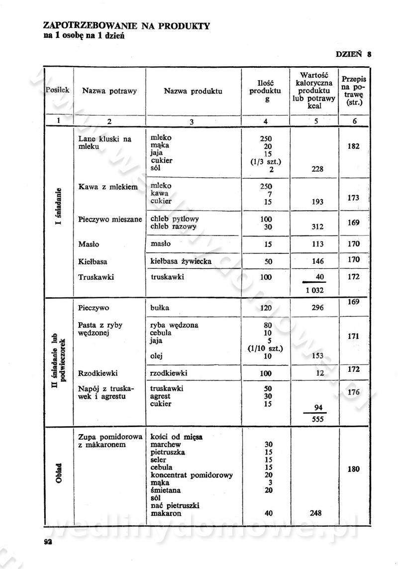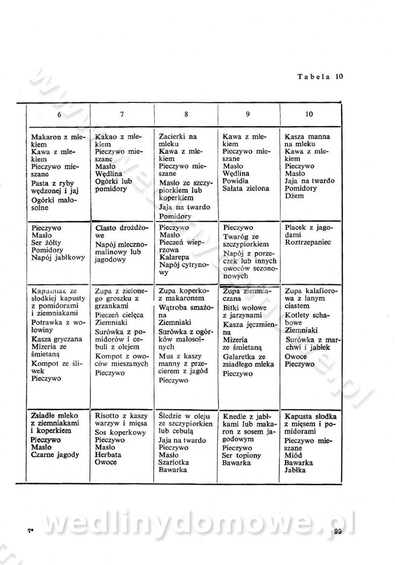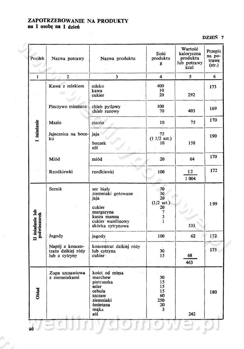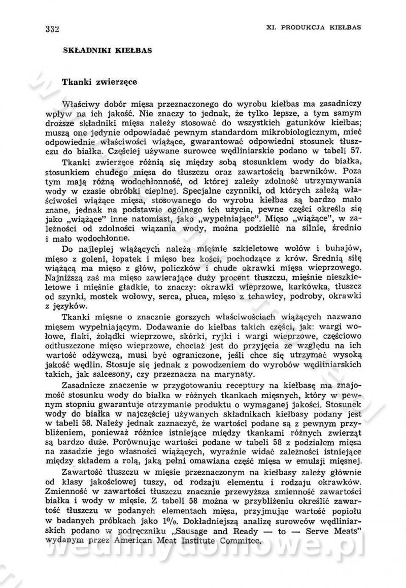 SPIS TREŚCI CZĘŚĆ I TEORETYCZNE PODSTAWY RACJONALNEGO ŻYWIENIA ZBIOROWEGO inż. Krystyna Wolf I. WSKAZÓWKI DO REALIZACJI NORM ŻYWIENIA WYRAŻONYCH W CAŁODZIENNYCH RACJACH POKARMOWYCH II. SKŁADNIKI POKARMOWE I ICH ROLA W ŻYWIENIU Zawartość składników pokarmowych w produktach Rola pożywienia Składniki pokarmowe Wzajemne zależności między składnikami pokarmowymi III. NORMY WYŻYWIENIA Normy zapotrzebowania na składniki pokarmowe Podział produktów Podział produktów na 2 grupy Podział produktów na 9 grup Podział produktów na 12 grup Całodzienne racje pokarmowe Zamiana produktów IV. WYTYCZNE PLANOWANIA ZESTAWU CAŁODZIENNYCH POSIŁKÓW Zasady podziału całodziennych racji pokarmowych na poszczególne posiłki Śniadanie Obiad Kolacja Wytyczne układania jadłospisów Kontrola prawidłowości planowania jadłospisów V. PROCESY TECHNOLOGICZNE, ICH CEL, PRZEBIEG I WPŁYW NA WARTOŚĆ ODŻYWCZĄ POTRAW Cel procesu technologicznego Obróbka wstępna i termiczna Ogólne wskazówki technologiczne Wykończanie potraw VI. WSKAZÓWKI PRAKTYCZNE DOTYCZĄCE KORZYSTANIA Z RECEPTUR CZĘŚĆ II RECEPTURY I. ZUPY inż. Jadwiga Celczyńska Podstawowe zasady sporządzania Sporządzanie wywarów Podział zup Przygotowanie głównych składników zup Wykończanie zup Rodzaje zup Zupy czyste Zupy zabielane Zupy zasmażane Zupy rozklejane Zupy mleczne Zupy owocowe Zupy z wkładką pełnowartościowego białka — samodzielne dania obiadowe lub kolacyjne Zupy czyste (normatyw surowcowy na 10 porcji) Zakwas burakowy na barszcz Zakwas na żur Barszcz burakowy czysty Barszcz czerwony czysty z zagęszczonego soku buraczanego Barszcz burakowy jarski Bulion jarski Rosół z wołowiny Zupa grzybowa czysta Zupa pomidorowa czysta Zupy rozklejane (normatyw surowcowy na 10 porcji) Krupnik na podrobach Krupnik zabielany Krupnik ze słoniną Krupnik z ryżu z jarzynami Zupa grochowa z pęczakiem Zupa grochowa z ziemniakami Zupa rumfordzka Zupa ziemniaczana z fasolą Zalewajka Zalewajka z kwaśnym mlekiem Żur z kiełbasą i boczkiem Żur na podrobach zabielany Zupy zasmażane (normatyw surowcowy na 10 porcji) Kapuśniak z kwaszonej kapusty z papryką Kapuśniak mazurski z kwaszonej kapusty Kapuśniak ze słodkiej kapusty Kapuśniak ze słodkiej kapusty z jabłkami Kapuśniak z czerwonej kapusty Zacierka z ziemniakami Zupa cebulowa Zupa z dyni i pomidorów Zupa fasolowa z makaronem Zupa fasolowa z ziemniakami Zupa z flaków wołowych Zupa „garbure” Zupa grzybowa Zupa jarzynowa z papryką Zupa jarzynowa z fasolą Zupa jarzynowa (jesienna) Zupa jarzynowa z makaronem i serem Zupa z kaszy manny zasmażana Zupa neapolitańska Zupa pomidorowa zasmażana Zupa z porów Zupa z selerów Zupa ziemniaczana zasmażana Zupa ziemniaczana z pomidorami Zupy mleczne (normatyw surowcowy na 10 porcji) Kukurydzanka na mleku Manna na mleku Ryż na mleku Makaron na mleku Płatki owsiane na mleku Zupa z dyni na mleku z tartym ciastem Zupa „nic” Zupa mleczna z lanym ciastem Zupa ze zsiadłego mleka Zupy zabielane (normatyw surowcowy na 10 porcji) Barszcz czerwony zabielany Barszcz czerwony zabielany z suszu Barszcz ukraiński Barszcz czeski Barszcz z botwiną Barszcz jarski z botwiną Chłodnik z botwiną Chłodnik z botwiną na mleku Kapuśniak ze słodkiej kapusty zabielany Kapuśniak na głowiźnie Zupa z brukselki zabielana Zupa cytrynowa Zupa z fasolki szparagowej Zupa grzybowa zabielana Zupa kalafiorowa Zupa koperkowa Zupa ogórkowa Zupa pomidorowa Zupa rybna Zupa szczawiowa Zupa pieczarkowa Zupa ze szpinaku Zupa z młodych jarzyn zabielana Zupa jarzynowa zabielana z mrożonek Zupa ziemniaczana „Paysanne” Pejzanka z puree ziemniaczanym Zupa z młodych ziemniaków Zupa ziemniaczana z porami Zupa z zielonego groszku Zupy owocowe (normatyw surowcowy na 10 porcji) Chłodnik z czarnych jagód Chłodnik truskawkowy Zupa z czarnych jagód Zupa jabłkowa Zupa jabłkowa zabielana Zupa z jabłek i śliwek Zupa ze śliwek Zupa z owoców mieszanych Zupa owocowa z suszu jabłkowego i marmolady Zupa owocowa czysta Zupa z powideł śliwkowych Zupa rabarbarowa Zupa z suszonych śliwek Zupa truskawkowa Zupa z truskawek i rabarbaru Zupy z wkładką mięsną (normatyw surowcowy na 10 porcji) Barszcz małorosyjski na rosole z mięsem Barszcz z ziemniakami i serdelkami Grochówka z mięsem i ziemniakami Kapuśniak z kwaszonej kapusty z kiełbasą Kapuśniak ze słodkiej kapusty z pomidorami i mięsem Krupnik z ryżu na mięsie Krupnik na mięsie Pejzanka na żeberkach Zupa z fasolki szparagowej na mięsie Zupa fasolowa z mięsem i makaronem Zupa jarzynowa z mięsem Gulaszowa polewka Zupa koperkowa na mięsie Zupa ogórkowa z ziemniakami na mięsie Zupa pomidorowa z makaronem i mięsem Zupa z porów z ziemniakami i wątróbką Zupa wiosenna z jajami Zupa ziemniaczana z mięsem Żur z kiełbasą i ziemniakami II. POTRAWY MIĘSNE inż. Krystyna Wolf Podstawowe zasady sporządzania Zachowanie wartości odżywczej dań mięsnych Cechy prawidłowo przyrządzonego mięsa Przechowywanie Rozmrażanie mięsa Rozbiór tuszy zwierząt rzeźnych Obróbka wstępna Obróbka termiczna Potrawy z baraniny (normatyw surowcowy na 10 porcji) Potrawka z baraniny Kotlet barani mielony Kotlet barani mielony z ryżem Baranina w warzywach Ragout baranie Baranina duszona Potrawy z cielęciny (normatyw surowcowy na 10 porcji) Potrawka cielęca Pulpety cielęce Kotlet cielęcy mielony Klopsiki cielęce do sosów Sznycel cielęcy (mielony) Filet cielęcy (do sosów i dodatków) Zrazy cielęce bite (do sosów) Zrazy cielęce nadziewane słoniną Sznycel cielęcy Zrazy cielęce po polsku (faszerowane) Paprykarz cielęcy Pieczeń cielęca duszona Pieczeń cielęca Mostek cielęcy po wiedeńsku Mostek cielęcy faszerowany Rolada cielęca faszerowana Potrawy z wieprzowiny (normatyw surowcowy na 10 porcji) Mięso wieprzowe gotowane Peklówka wieprzowa gotowana Filet wieprzowy saute Kotlet wieprzowy mielony Zraz wieprzowy (klopsik) mielony do sosów Kotlet miel