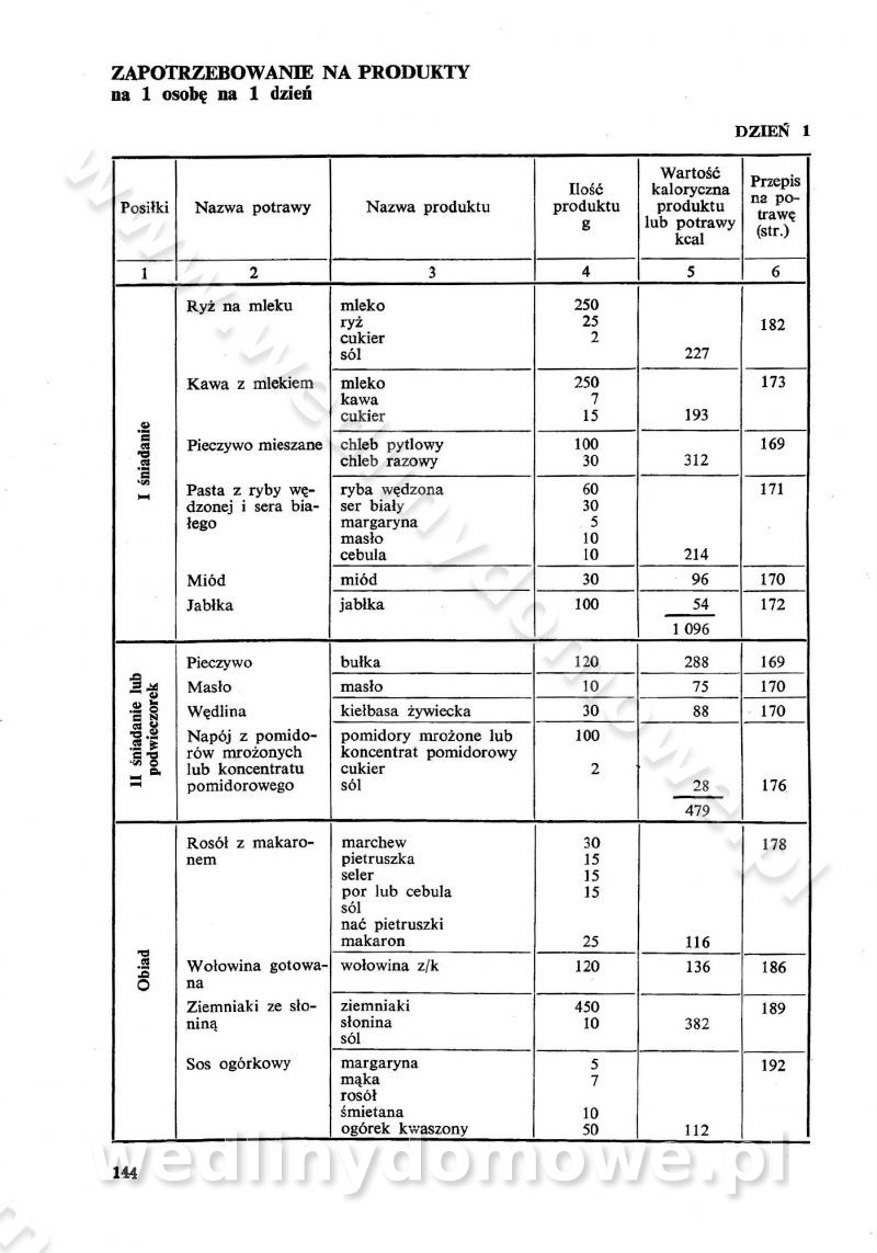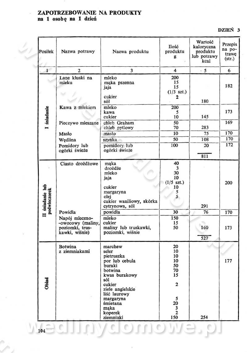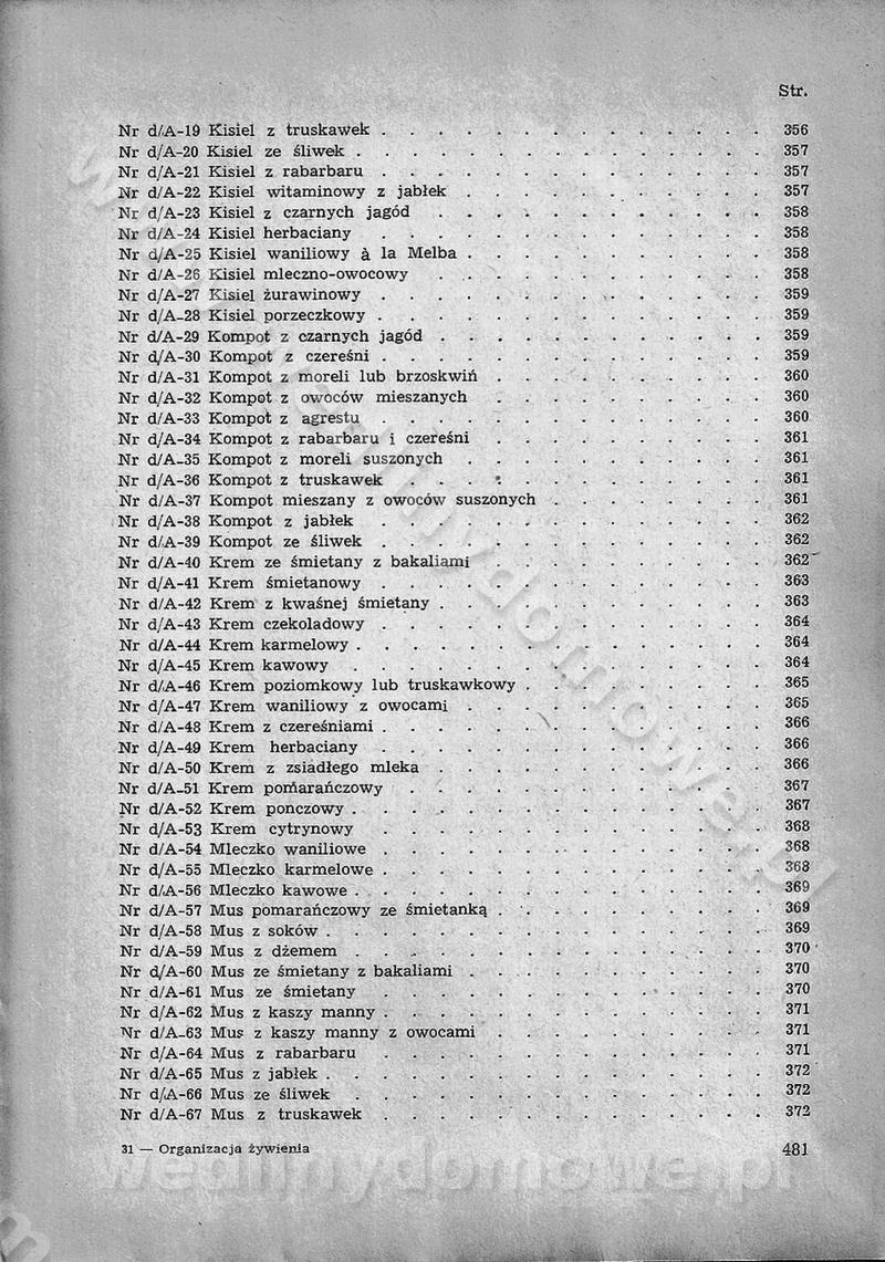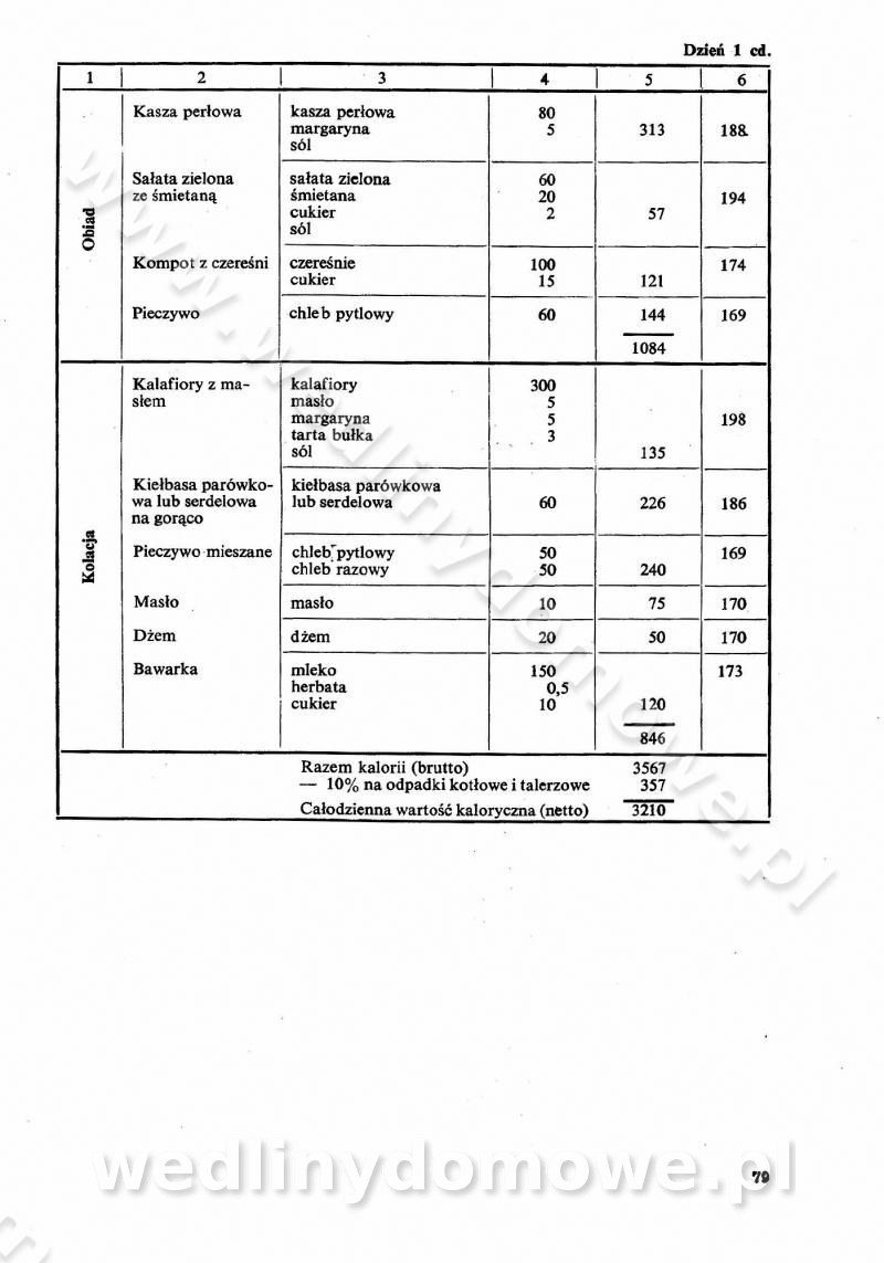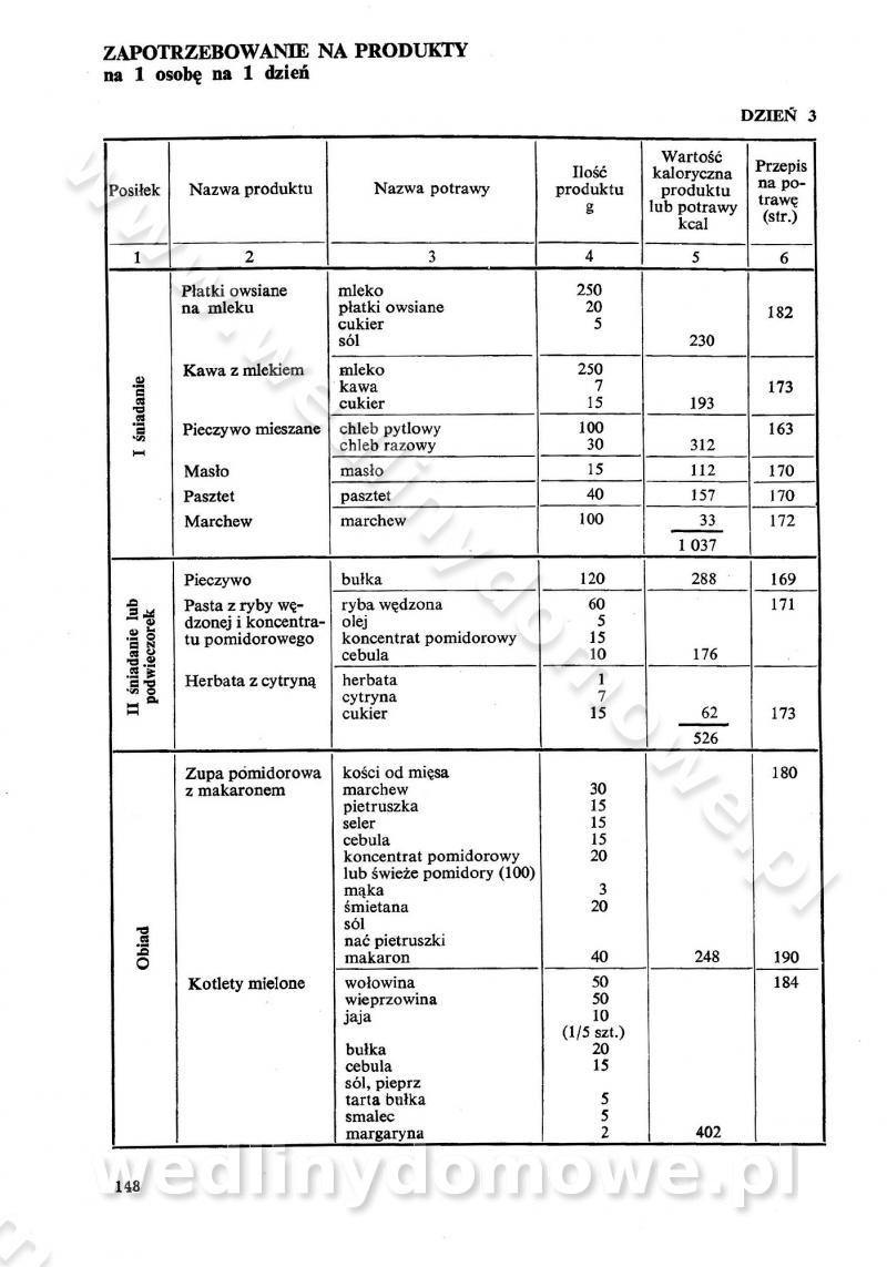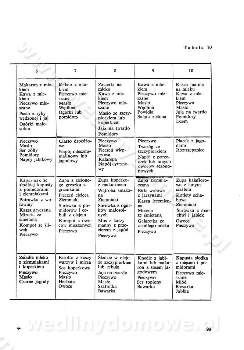 SPIS TREŚCI CZĘŚĆ I TEORETYCZNE PODSTAWY RACJONALNEGO ŻYWIENIA ZBIOROWEGO inż. Krystyna Wolf I. WSKAZÓWKI DO REALIZACJI NORM ŻYWIENIA WYRAŻONYCH W CAŁODZIENNYCH RACJACH POKARMOWYCH II. SKŁADNIKI POKARMOWE I ICH ROLA W ŻYWIENIU Zawartość składników pokarmowych w produktach Rola pożywienia Składniki pokarmowe Wzajemne zależności między składnikami pokarmowymi III. NORMY WYŻYWIENIA Normy zapotrzebowania na składniki pokarmowe Podział produktów Podział produktów na 2 grupy Podział produktów na 9 grup Podział produktów na 12 grup Całodzienne racje pokarmowe Zamiana produktów IV. WYTYCZNE PLANOWANIA ZESTAWU CAŁODZIENNYCH POSIŁKÓW Zasady podziału całodziennych racji pokarmowych na poszczególne posiłki Śniadanie Obiad Kolacja Wytyczne układania jadłospisów Kontrola prawidłowości planowania jadłospisów V. PROCESY TECHNOLOGICZNE, ICH CEL, PRZEBIEG I WPŁYW NA WARTOŚĆ ODŻYWCZĄ POTRAW Cel procesu technologicznego Obróbka wstępna i termiczna Ogólne wskazówki technologiczne Wykończanie potraw VI. WSKAZÓWKI PRAKTYCZNE DOTYCZĄCE KORZYSTANIA Z RECEPTUR CZĘŚĆ II RECEPTURY I. ZUPY inż. Jadwiga Celczyńska Podstawowe zasady sporządzania Sporządzanie wywarów Podział zup Przygotowanie głównych składników zup Wykończanie zup Rodzaje zup Zupy czyste Zupy zabielane Zupy zasmażane Zupy rozklejane Zupy mleczne Zupy owocowe Zupy z wkładką pełnowartościowego białka — samodzielne dania obiadowe lub kolacyjne Zupy czyste (normatyw surowcowy na 10 porcji) Zakwas burakowy na barszcz Zakwas na żur Barszcz burakowy czysty Barszcz czerwony czysty z zagęszczonego soku buraczanego Barszcz burakowy jarski Bulion jarski Rosół z wołowiny Zupa grzybowa czysta Zupa pomidorowa czysta Zupy rozklejane (normatyw surowcowy na 10 porcji) Krupnik na podrobach Krupnik zabielany Krupnik ze słoniną Krupnik z ryżu z jarzynami Zupa grochowa z pęczakiem Zupa grochowa z ziemniakami Zupa rumfordzka Zupa ziemniaczana z fasolą Zalewajka Zalewajka z kwaśnym mlekiem Żur z kiełbasą i boczkiem Żur na podrobach zabielany Zupy zasmażane (normatyw surowcowy na 10 porcji) Kapuśniak z kwaszonej kapusty z papryką Kapuśniak mazurski z kwaszonej kapusty Kapuśniak ze słodkiej kapusty Kapuśniak ze słodkiej kapusty z jabłkami Kapuśniak z czerwonej kapusty Zacierka z ziemniakami Zupa cebulowa Zupa z dyni i pomidorów Zupa fasolowa z makaronem Zupa fasolowa z ziemniakami Zupa z flaków wołowych Zupa „garbure” Zupa grzybowa Zupa jarzynowa z papryką Zupa jarzynowa z fasolą Zupa jarzynowa (jesienna) Zupa jarzynowa z makaronem i serem Zupa z kaszy manny zasmażana Zupa neapolitańska Zupa pomidorowa zasmażana Zupa z porów Zupa z selerów Zupa ziemniaczana zasmażana Zupa ziemniaczana z pomidorami Zupy mleczne (normatyw surowcowy na 10 porcji) Kukurydzanka na mleku Manna na mleku Ryż na mleku Makaron na mleku Płatki owsiane na mleku Zupa z dyni na mleku z tartym ciastem Zupa „nic” Zupa mleczna z lanym ciastem Zupa ze zsiadłego mleka Zupy zabielane (normatyw surowcowy na 10 porcji) Barszcz czerwony zabielany Barszcz czerwony zabielany z suszu Barszcz ukraiński Barszcz czeski Barszcz z botwiną Barszcz jarski z botwiną Chłodnik z botwiną Chłodnik z botwiną na mleku Kapuśniak ze słodkiej kapusty zabielany Kapuśniak na głowiźnie Zupa z brukselki zabielana Zupa cytrynowa Zupa z fasolki szparagowej Zupa grzybowa zabielana Zupa kalafiorowa Zupa koperkowa Zupa ogórkowa Zupa pomidorowa Zupa rybna Zupa szczawiowa Zupa pieczarkowa Zupa ze szpinaku Zupa z młodych jarzyn zabielana Zupa jarzynowa zabielana z mrożonek Zupa ziemniaczana „Paysanne” Pejzanka z puree ziemniaczanym Zupa z młodych ziemniaków Zupa ziemniaczana z porami Zupa z zielonego groszku Zupy owocowe (normatyw surowcowy na 10 porcji) Chłodnik z czarnych jagód Chłodnik truskawkowy Zupa z czarnych jagód Zupa jabłkowa Zupa jabłkowa zabielana Zupa z jabłek i śliwek Zupa ze śliwek Zupa z owoców mieszanych Zupa owocowa z suszu jabłkowego i marmolady Zupa owocowa czysta Zupa z powideł śliwkowych Zupa rabarbarowa Zupa z suszonych śliwek Zupa truskawkowa Zupa z truskawek i rabarbaru Zupy z wkładką mięsną (normatyw surowcowy na 10 porcji) Barszcz małorosyjski na rosole z mięsem Barszcz z ziemniakami i serdelkami Grochówka z mięsem i ziemniakami Kapuśniak z kwaszonej kapusty z kiełbasą Kapuśniak ze słodkiej kapusty z pomidorami i mięsem Krupnik z ryżu na mięsie Krupnik na mięsie Pejzanka na żeberkach Zupa z fasolki szparagowej na mięsie Zupa fasolowa z mięsem i makaronem Zupa jarzynowa z mięsem Gulaszowa polewka Zupa koperkowa na mięsie Zupa ogórkowa z ziemniakami na mięsie Zupa pomidorowa z makaronem i mięsem Zupa z porów z ziemniakami i wątróbką Zupa wiosenna z jajami Zupa ziemniaczana z mięsem Żur z kiełbasą i ziemniakami II. POTRAWY MIĘSNE inż. Krystyna Wolf Podstawowe zasady sporządzania Zachowanie wartości odżywczej dań mięsnych Cechy prawidłowo przyrządzonego mięsa Przechowywanie Rozmrażanie mięsa Rozbiór tuszy zwierząt rzeźnych Obróbka wstępna Obróbka termiczna Potrawy z baraniny (normatyw surowcowy na 10 porcji) Potrawka z baraniny Kotlet barani mielony Kotlet barani mielony z ryżem Baranina w warzywach Ragout baranie Baranina duszona Potrawy z cielęciny (normatyw surowcowy na 10 porcji) Potrawka cielęca Pulpety cielęce Kotlet cielęcy mielony Klopsiki cielęce do sosów Sznycel cielęcy (mielony) Filet cielęcy (do sosów i dodatków) Zrazy cielęce bite (do sosów) Zrazy cielęce nadziewane słoniną Sznycel cielęcy Zrazy cielęce po polsku (faszerowane) Paprykarz cielęcy Pieczeń cielęca duszona Pieczeń cielęca Mostek cielęcy po wiedeńsku Mostek cielęcy faszerowany Rolada cielęca faszerowana Potrawy z wieprzowiny (normatyw surowcowy na 10 porcji) Mięso wieprzowe gotowane Peklówka wieprzowa gotowana Filet wieprzowy saute Kotlet wieprzowy mielony Zraz wieprzowy (klopsik) mielony do sosów Kotlet miel