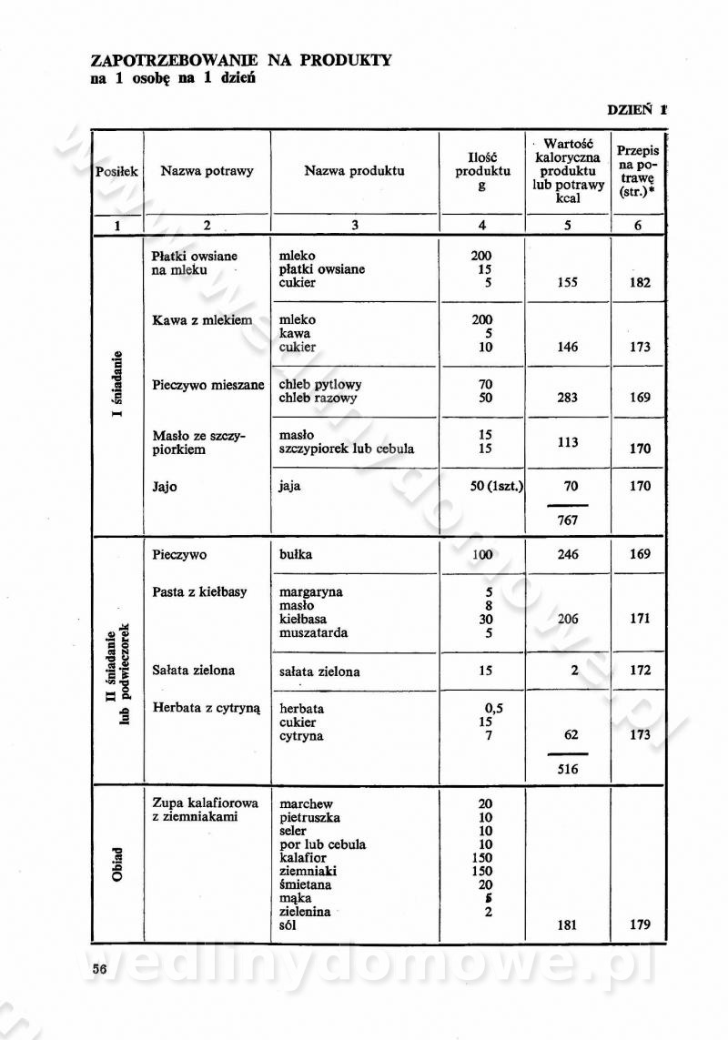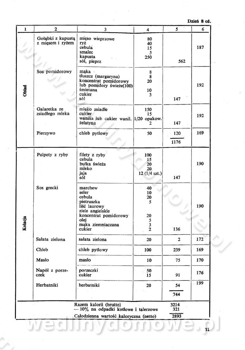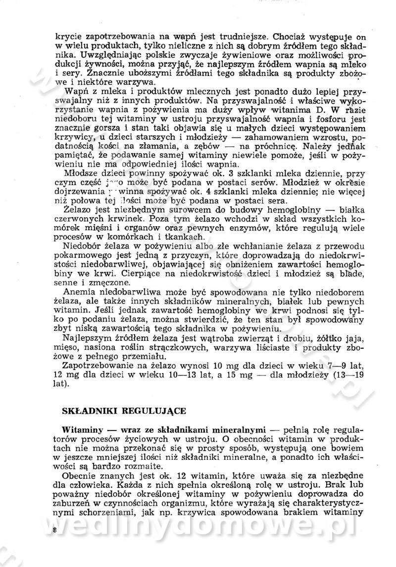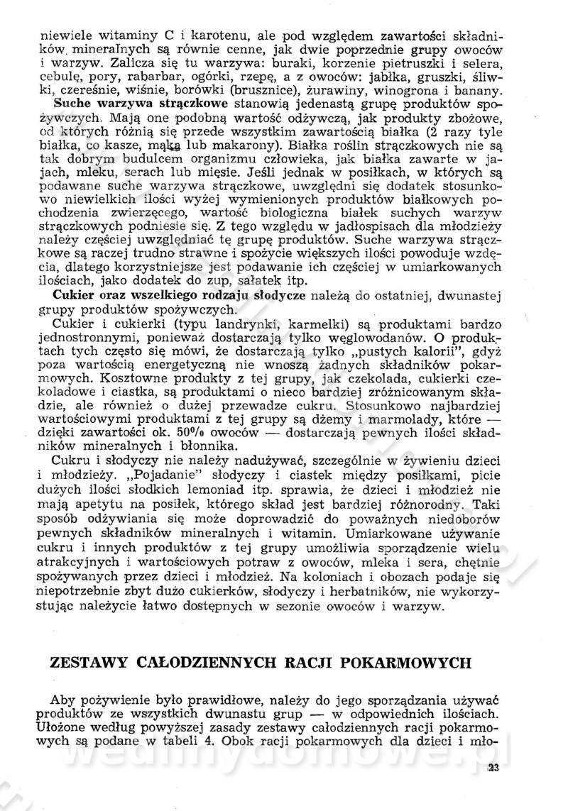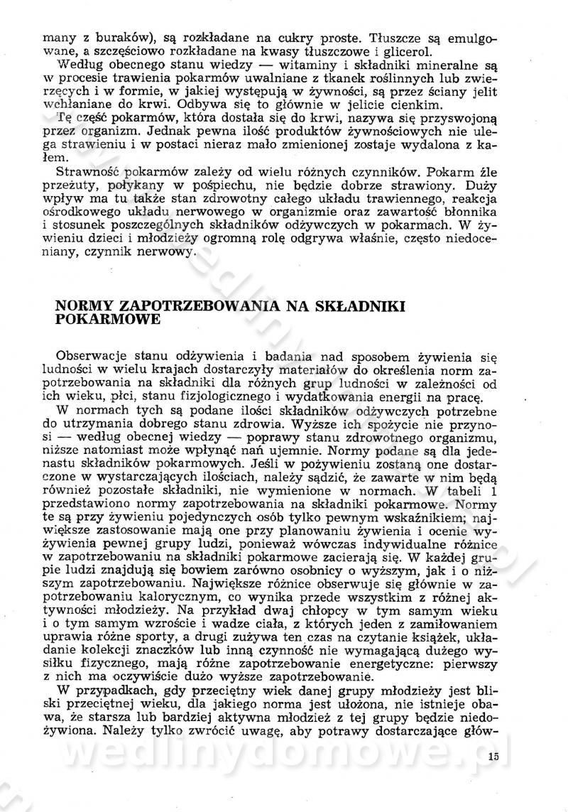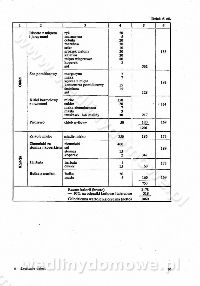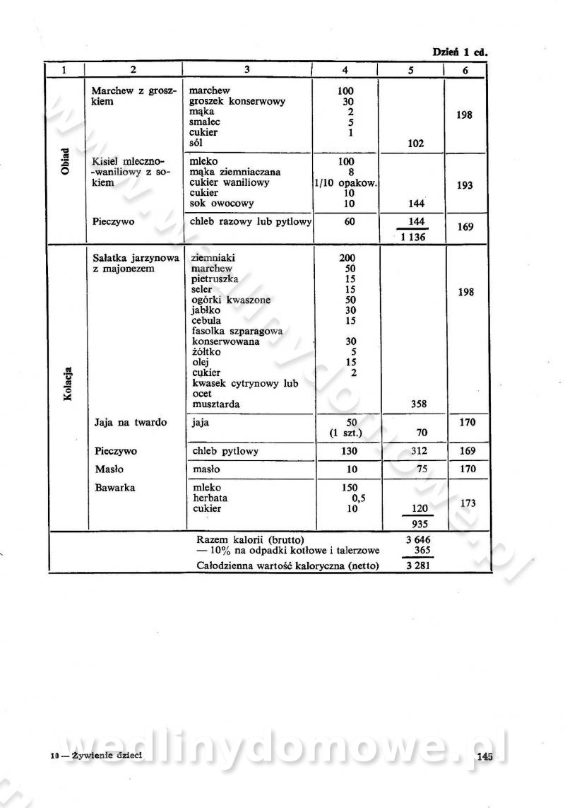 SPIS TREŚCI CZĘŚĆ I TEORETYCZNE PODSTAWY RACJONALNEGO ŻYWIENIA ZBIOROWEGO inż. Krystyna Wolf I. WSKAZÓWKI DO REALIZACJI NORM ŻYWIENIA WYRAŻONYCH W CAŁODZIENNYCH RACJACH POKARMOWYCH II. SKŁADNIKI POKARMOWE I ICH ROLA W ŻYWIENIU Zawartość składników pokarmowych w produktach Rola pożywienia Składniki pokarmowe Wzajemne zależności między składnikami pokarmowymi III. NORMY WYŻYWIENIA Normy zapotrzebowania na składniki pokarmowe Podział produktów Podział produktów na 2 grupy Podział produktów na 9 grup Podział produktów na 12 grup Całodzienne racje pokarmowe Zamiana produktów IV. WYTYCZNE PLANOWANIA ZESTAWU CAŁODZIENNYCH POSIŁKÓW Zasady podziału całodziennych racji pokarmowych na poszczególne posiłki Śniadanie Obiad Kolacja Wytyczne układania jadłospisów Kontrola prawidłowości planowania jadłospisów V. PROCESY TECHNOLOGICZNE, ICH CEL, PRZEBIEG I WPŁYW NA WARTOŚĆ ODŻYWCZĄ POTRAW Cel procesu technologicznego Obróbka wstępna i termiczna Ogólne wskazówki technologiczne Wykończanie potraw VI. WSKAZÓWKI PRAKTYCZNE DOTYCZĄCE KORZYSTANIA Z RECEPTUR CZĘŚĆ II RECEPTURY I. ZUPY inż. Jadwiga Celczyńska Podstawowe zasady sporządzania Sporządzanie wywarów Podział zup Przygotowanie głównych składników zup Wykończanie zup Rodzaje zup Zupy czyste Zupy zabielane Zupy zasmażane Zupy rozklejane Zupy mleczne Zupy owocowe Zupy z wkładką pełnowartościowego białka — samodzielne dania obiadowe lub kolacyjne Zupy czyste (normatyw surowcowy na 10 porcji) Zakwas burakowy na barszcz Zakwas na żur Barszcz burakowy czysty Barszcz czerwony czysty z zagęszczonego soku buraczanego Barszcz burakowy jarski Bulion jarski Rosół z wołowiny Zupa grzybowa czysta Zupa pomidorowa czysta Zupy rozklejane (normatyw surowcowy na 10 porcji) Krupnik na podrobach Krupnik zabielany Krupnik ze słoniną Krupnik z ryżu z jarzynami Zupa grochowa z pęczakiem Zupa grochowa z ziemniakami Zupa rumfordzka Zupa ziemniaczana z fasolą Zalewajka Zalewajka z kwaśnym mlekiem Żur z kiełbasą i boczkiem Żur na podrobach zabielany Zupy zasmażane (normatyw surowcowy na 10 porcji) Kapuśniak z kwaszonej kapusty z papryką Kapuśniak mazurski z kwaszonej kapusty Kapuśniak ze słodkiej kapusty Kapuśniak ze słodkiej kapusty z jabłkami Kapuśniak z czerwonej kapusty Zacierka z ziemniakami Zupa cebulowa Zupa z dyni i pomidorów Zupa fasolowa z makaronem Zupa fasolowa z ziemniakami Zupa z flaków wołowych Zupa „garbure” Zupa grzybowa Zupa jarzynowa z papryką Zupa jarzynowa z fasolą Zupa jarzynowa (jesienna) Zupa jarzynowa z makaronem i serem Zupa z kaszy manny zasmażana Zupa neapolitańska Zupa pomidorowa zasmażana Zupa z porów Zupa z selerów Zupa ziemniaczana zasmażana Zupa ziemniaczana z pomidorami Zupy mleczne (normatyw surowcowy na 10 porcji) Kukurydzanka na mleku Manna na mleku Ryż na mleku Makaron na mleku Płatki owsiane na mleku Zupa z dyni na mleku z tartym ciastem Zupa „nic” Zupa mleczna z lanym ciastem Zupa ze zsiadłego mleka Zupy zabielane (normatyw surowcowy na 10 porcji) Barszcz czerwony zabielany Barszcz czerwony zabielany z suszu Barszcz ukraiński Barszcz czeski Barszcz z botwiną Barszcz jarski z botwiną Chłodnik z botwiną Chłodnik z botwiną na mleku Kapuśniak ze słodkiej kapusty zabielany Kapuśniak na głowiźnie Zupa z brukselki zabielana Zupa cytrynowa Zupa z fasolki szparagowej Zupa grzybowa zabielana Zupa kalafiorowa Zupa koperkowa Zupa ogórkowa Zupa pomidorowa Zupa rybna Zupa szczawiowa Zupa pieczarkowa Zupa ze szpinaku Zupa z młodych jarzyn zabielana Zupa jarzynowa zabielana z mrożonek Zupa ziemniaczana „Paysanne” Pejzanka z puree ziemniaczanym Zupa z młodych ziemniaków Zupa ziemniaczana z porami Zupa z zielonego groszku Zupy owocowe (normatyw surowcowy na 10 porcji) Chłodnik z czarnych jagód Chłodnik truskawkowy Zupa z czarnych jagód Zupa jabłkowa Zupa jabłkowa zabielana Zupa z jabłek i śliwek Zupa ze śliwek Zupa z owoców mieszanych Zupa owocowa z suszu jabłkowego i marmolady Zupa owocowa czysta Zupa z powideł śliwkowych Zupa rabarbarowa Zupa z suszonych śliwek Zupa truskawkowa Zupa z truskawek i rabarbaru Zupy z wkładką mięsną (normatyw surowcowy na 10 porcji) Barszcz małorosyjski na rosole z mięsem Barszcz z ziemniakami i serdelkami Grochówka z mięsem i ziemniakami Kapuśniak z kwaszonej kapusty z kiełbasą Kapuśniak ze słodkiej kapusty z pomidorami i mięsem Krupnik z ryżu na mięsie Krupnik na mięsie Pejzanka na żeberkach Zupa z fasolki szparagowej na mięsie Zupa fasolowa z mięsem i makaronem Zupa jarzynowa z mięsem Gulaszowa polewka Zupa koperkowa na mięsie Zupa ogórkowa z ziemniakami na mięsie Zupa pomidorowa z makaronem i mięsem Zupa z porów z ziemniakami i wątróbką Zupa wiosenna z jajami Zupa ziemniaczana z mięsem Żur z kiełbasą i ziemniakami II. POTRAWY MIĘSNE inż. Krystyna Wolf Podstawowe zasady sporządzania Zachowanie wartości odżywczej dań mięsnych Cechy prawidłowo przyrządzonego mięsa Przechowywanie Rozmrażanie mięsa Rozbiór tuszy zwierząt rzeźnych Obróbka wstępna Obróbka termiczna Potrawy z baraniny (normatyw surowcowy na 10 porcji) Potrawka z baraniny Kotlet barani mielony Kotlet barani mielony z ryżem Baranina w warzywach Ragout baranie Baranina duszona Potrawy z cielęciny (normatyw surowcowy na 10 porcji) Potrawka cielęca Pulpety cielęce Kotlet cielęcy mielony Klopsiki cielęce do sosów Sznycel cielęcy (mielony) Filet cielęcy (do sosów i dodatków) Zrazy cielęce bite (do sosów) Zrazy cielęce nadziewane słoniną Sznycel cielęcy Zrazy cielęce po polsku (faszerowane) Paprykarz cielęcy Pieczeń cielęca duszona Pieczeń cielęca Mostek cielęcy po wiedeńsku Mostek cielęcy faszerowany Rolada cielęca faszerowana Potrawy z wieprzowiny (normatyw surowcowy na 10 porcji) Mięso wieprzowe gotowane Peklówka wieprzowa gotowana Filet wieprzowy saute Kotlet wieprzowy mielony Zraz wieprzowy (klopsik) mielony do sosów Kotlet miel