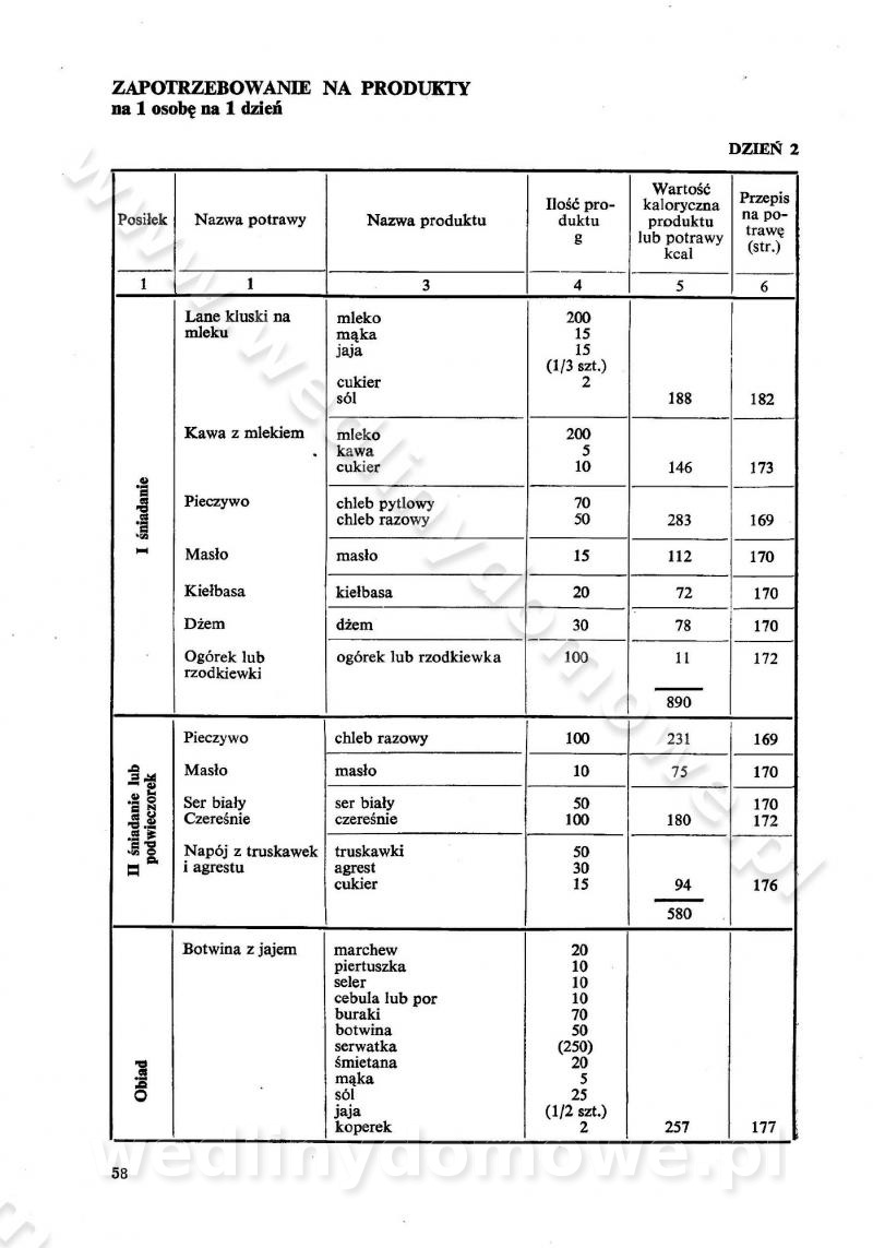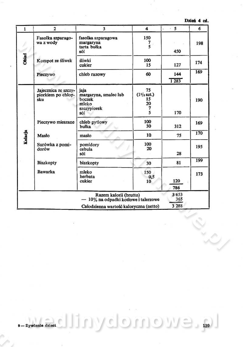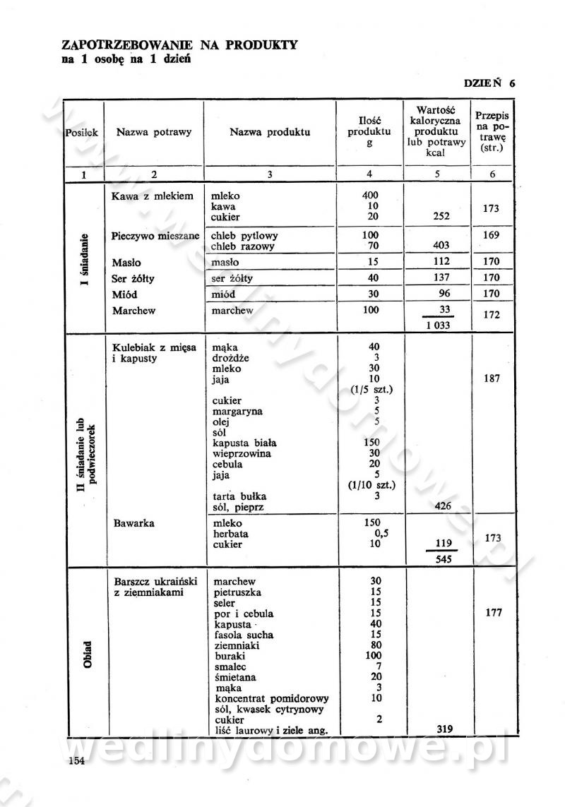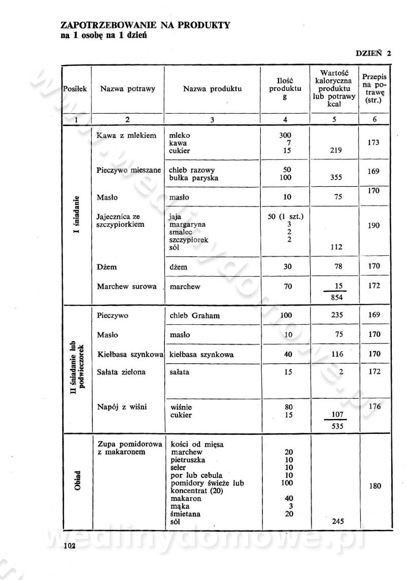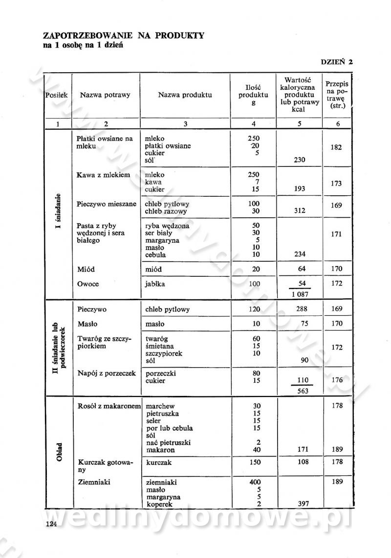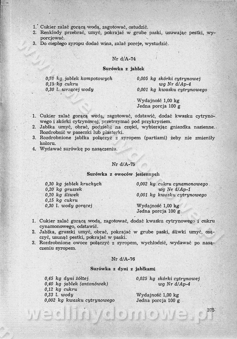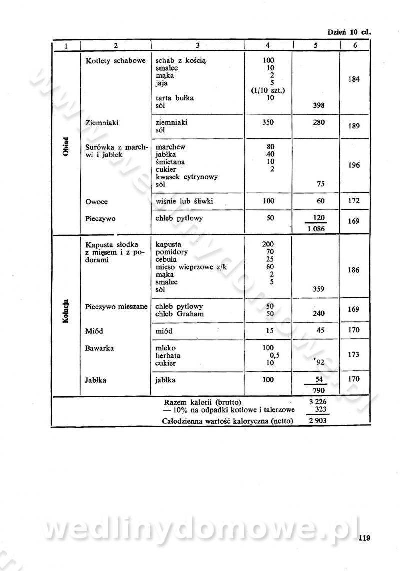 SPIS TREŚCI CZĘŚĆ I TEORETYCZNE PODSTAWY RACJONALNEGO ŻYWIENIA ZBIOROWEGO inż. Krystyna Wolf I. WSKAZÓWKI DO REALIZACJI NORM ŻYWIENIA WYRAŻONYCH W CAŁODZIENNYCH RACJACH POKARMOWYCH II. SKŁADNIKI POKARMOWE I ICH ROLA W ŻYWIENIU Zawartość składników pokarmowych w produktach Rola pożywienia Składniki pokarmowe Wzajemne zależności między składnikami pokarmowymi III. NORMY WYŻYWIENIA Normy zapotrzebowania na składniki pokarmowe Podział produktów Podział produktów na 2 grupy Podział produktów na 9 grup Podział produktów na 12 grup Całodzienne racje pokarmowe Zamiana produktów IV. WYTYCZNE PLANOWANIA ZESTAWU CAŁODZIENNYCH POSIŁKÓW Zasady podziału całodziennych racji pokarmowych na poszczególne posiłki Śniadanie Obiad Kolacja Wytyczne układania jadłospisów Kontrola prawidłowości planowania jadłospisów V. PROCESY TECHNOLOGICZNE, ICH CEL, PRZEBIEG I WPŁYW NA WARTOŚĆ ODŻYWCZĄ POTRAW Cel procesu technologicznego Obróbka wstępna i termiczna Ogólne wskazówki technologiczne Wykończanie potraw VI. WSKAZÓWKI PRAKTYCZNE DOTYCZĄCE KORZYSTANIA Z RECEPTUR CZĘŚĆ II RECEPTURY I. ZUPY inż. Jadwiga Celczyńska Podstawowe zasady sporządzania Sporządzanie wywarów Podział zup Przygotowanie głównych składników zup Wykończanie zup Rodzaje zup Zupy czyste Zupy zabielane Zupy zasmażane Zupy rozklejane Zupy mleczne Zupy owocowe Zupy z wkładką pełnowartościowego białka — samodzielne dania obiadowe lub kolacyjne Zupy czyste (normatyw surowcowy na 10 porcji) Zakwas burakowy na barszcz Zakwas na żur Barszcz burakowy czysty Barszcz czerwony czysty z zagęszczonego soku buraczanego Barszcz burakowy jarski Bulion jarski Rosół z wołowiny Zupa grzybowa czysta Zupa pomidorowa czysta Zupy rozklejane (normatyw surowcowy na 10 porcji) Krupnik na podrobach Krupnik zabielany Krupnik ze słoniną Krupnik z ryżu z jarzynami Zupa grochowa z pęczakiem Zupa grochowa z ziemniakami Zupa rumfordzka Zupa ziemniaczana z fasolą Zalewajka Zalewajka z kwaśnym mlekiem Żur z kiełbasą i boczkiem Żur na podrobach zabielany Zupy zasmażane (normatyw surowcowy na 10 porcji) Kapuśniak z kwaszonej kapusty z papryką Kapuśniak mazurski z kwaszonej kapusty Kapuśniak ze słodkiej kapusty Kapuśniak ze słodkiej kapusty z jabłkami Kapuśniak z czerwonej kapusty Zacierka z ziemniakami Zupa cebulowa Zupa z dyni i pomidorów Zupa fasolowa z makaronem Zupa fasolowa z ziemniakami Zupa z flaków wołowych Zupa „garbure” Zupa grzybowa Zupa jarzynowa z papryką Zupa jarzynowa z fasolą Zupa jarzynowa (jesienna) Zupa jarzynowa z makaronem i serem Zupa z kaszy manny zasmażana Zupa neapolitańska Zupa pomidorowa zasmażana Zupa z porów Zupa z selerów Zupa ziemniaczana zasmażana Zupa ziemniaczana z pomidorami Zupy mleczne (normatyw surowcowy na 10 porcji) Kukurydzanka na mleku Manna na mleku Ryż na mleku Makaron na mleku Płatki owsiane na mleku Zupa z dyni na mleku z tartym ciastem Zupa „nic” Zupa mleczna z lanym ciastem Zupa ze zsiadłego mleka Zupy zabielane (normatyw surowcowy na 10 porcji) Barszcz czerwony zabielany Barszcz czerwony zabielany z suszu Barszcz ukraiński Barszcz czeski Barszcz z botwiną Barszcz jarski z botwiną Chłodnik z botwiną Chłodnik z botwiną na mleku Kapuśniak ze słodkiej kapusty zabielany Kapuśniak na głowiźnie Zupa z brukselki zabielana Zupa cytrynowa Zupa z fasolki szparagowej Zupa grzybowa zabielana Zupa kalafiorowa Zupa koperkowa Zupa ogórkowa Zupa pomidorowa Zupa rybna Zupa szczawiowa Zupa pieczarkowa Zupa ze szpinaku Zupa z młodych jarzyn zabielana Zupa jarzynowa zabielana z mrożonek Zupa ziemniaczana „Paysanne” Pejzanka z puree ziemniaczanym Zupa z młodych ziemniaków Zupa ziemniaczana z porami Zupa z zielonego groszku Zupy owocowe (normatyw surowcowy na 10 porcji) Chłodnik z czarnych jagód Chłodnik truskawkowy Zupa z czarnych jagód Zupa jabłkowa Zupa jabłkowa zabielana Zupa z jabłek i śliwek Zupa ze śliwek Zupa z owoców mieszanych Zupa owocowa z suszu jabłkowego i marmolady Zupa owocowa czysta Zupa z powideł śliwkowych Zupa rabarbarowa Zupa z suszonych śliwek Zupa truskawkowa Zupa z truskawek i rabarbaru Zupy z wkładką mięsną (normatyw surowcowy na 10 porcji) Barszcz małorosyjski na rosole z mięsem Barszcz z ziemniakami i serdelkami Grochówka z mięsem i ziemniakami Kapuśniak z kwaszonej kapusty z kiełbasą Kapuśniak ze słodkiej kapusty z pomidorami i mięsem Krupnik z ryżu na mięsie Krupnik na mięsie Pejzanka na żeberkach Zupa z fasolki szparagowej na mięsie Zupa fasolowa z mięsem i makaronem Zupa jarzynowa z mięsem Gulaszowa polewka Zupa koperkowa na mięsie Zupa ogórkowa z ziemniakami na mięsie Zupa pomidorowa z makaronem i mięsem Zupa z porów z ziemniakami i wątróbką Zupa wiosenna z jajami Zupa ziemniaczana z mięsem Żur z kiełbasą i ziemniakami II. POTRAWY MIĘSNE inż. Krystyna Wolf Podstawowe zasady sporządzania Zachowanie wartości odżywczej dań mięsnych Cechy prawidłowo przyrządzonego mięsa Przechowywanie Rozmrażanie mięsa Rozbiór tuszy zwierząt rzeźnych Obróbka wstępna Obróbka termiczna Potrawy z baraniny (normatyw surowcowy na 10 porcji) Potrawka z baraniny Kotlet barani mielony Kotlet barani mielony z ryżem Baranina w warzywach Ragout baranie Baranina duszona Potrawy z cielęciny (normatyw surowcowy na 10 porcji) Potrawka cielęca Pulpety cielęce Kotlet cielęcy mielony Klopsiki cielęce do sosów Sznycel cielęcy (mielony) Filet cielęcy (do sosów i dodatków) Zrazy cielęce bite (do sosów) Zrazy cielęce nadziewane słoniną Sznycel cielęcy Zrazy cielęce po polsku (faszerowane) Paprykarz cielęcy Pieczeń cielęca duszona Pieczeń cielęca Mostek cielęcy po wiedeńsku Mostek cielęcy faszerowany Rolada cielęca faszerowana Potrawy z wieprzowiny (normatyw surowcowy na 10 porcji) Mięso wieprzowe gotowane Peklówka wieprzowa gotowana Filet wieprzowy saute Kotlet wieprzowy mielony Zraz wieprzowy (klopsik) mielony do sosów Kotlet miel